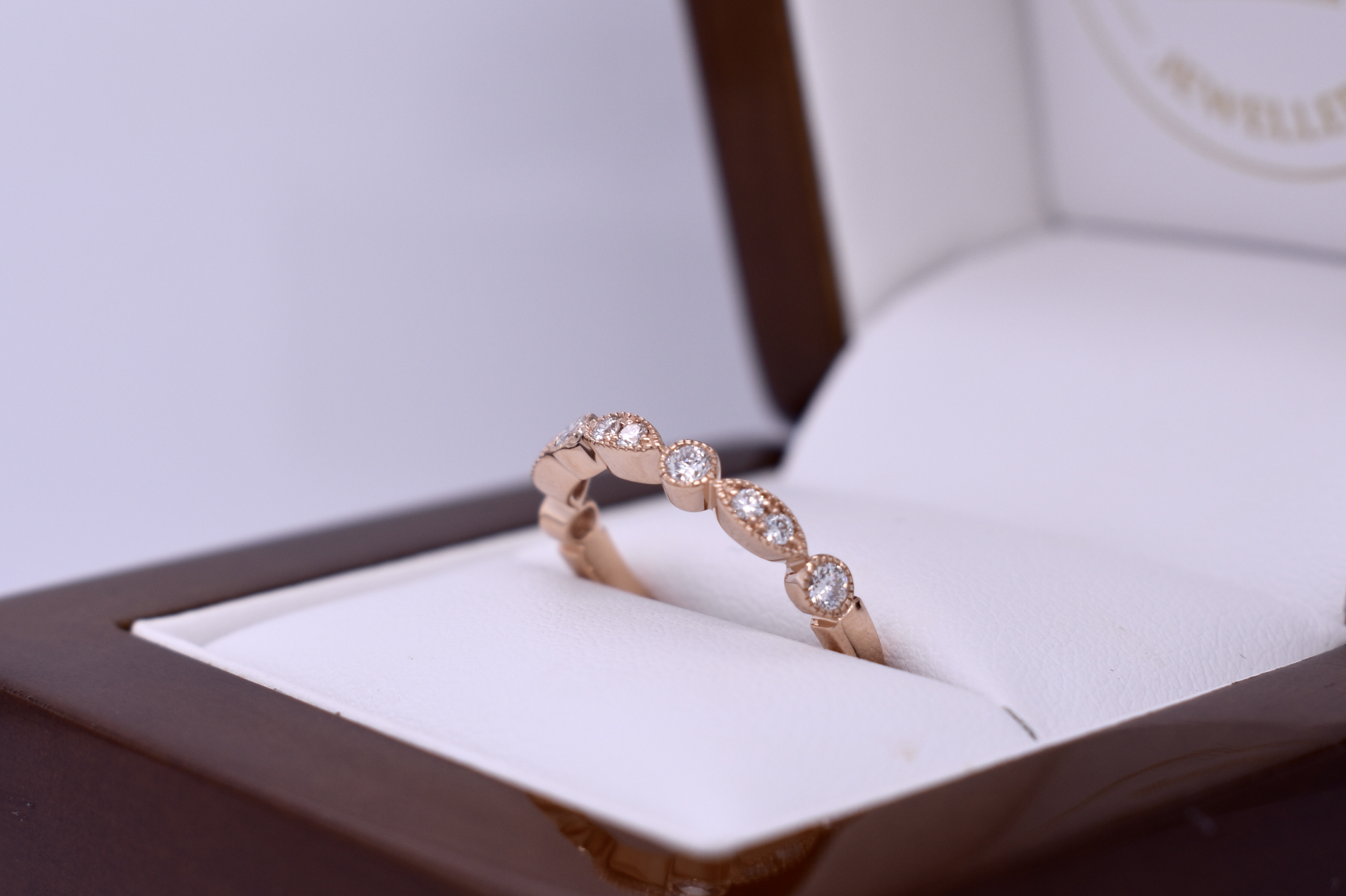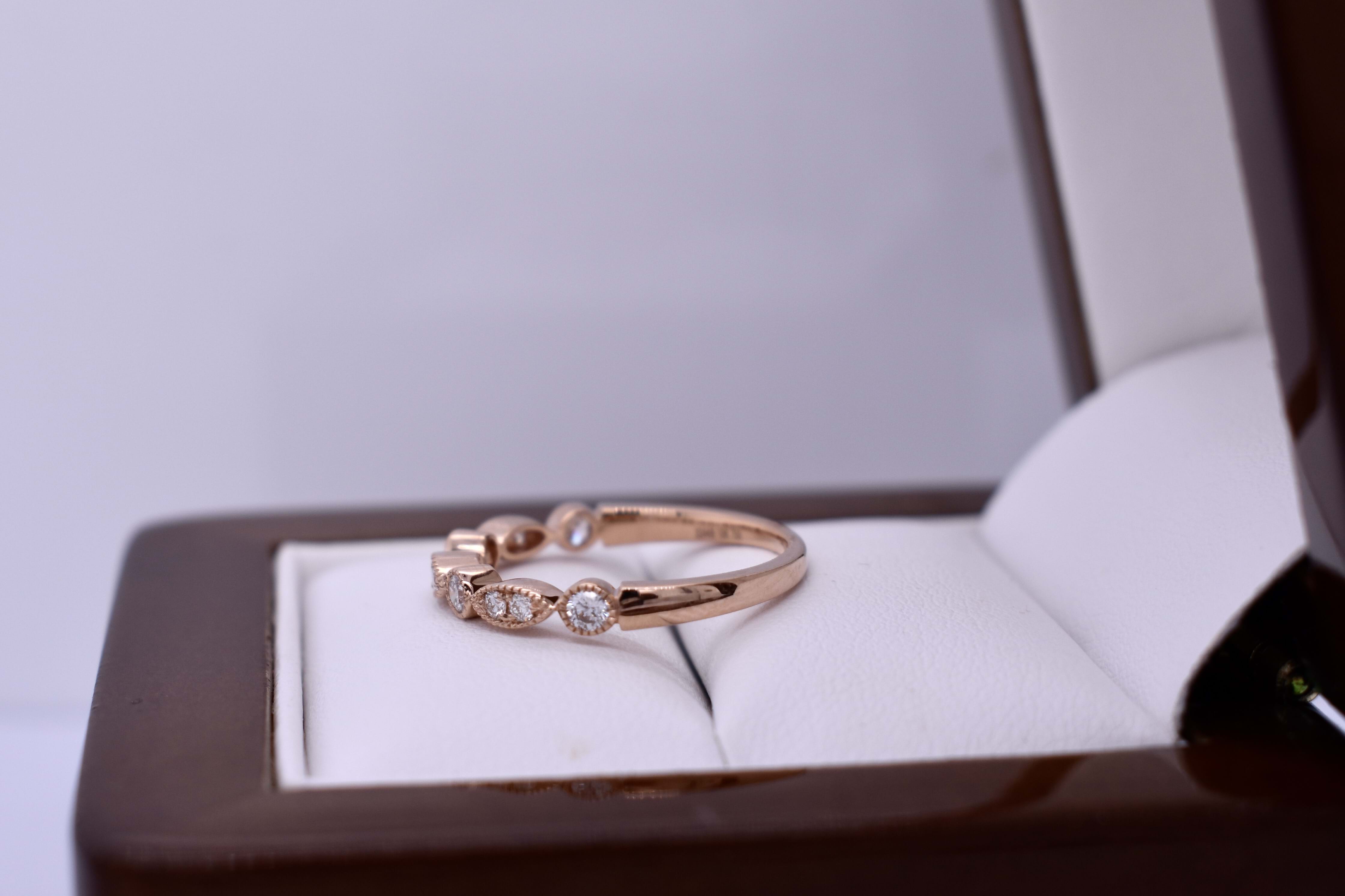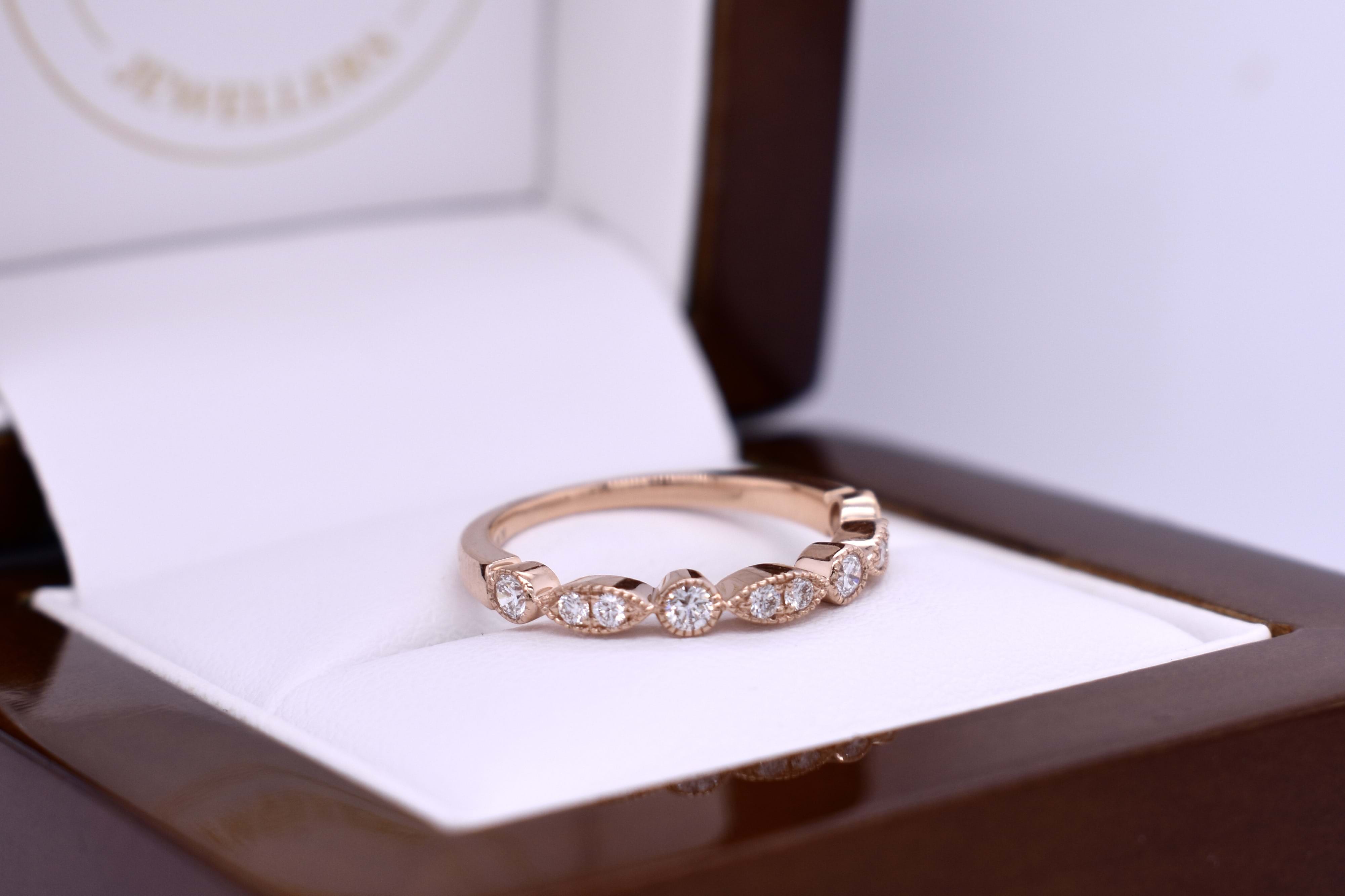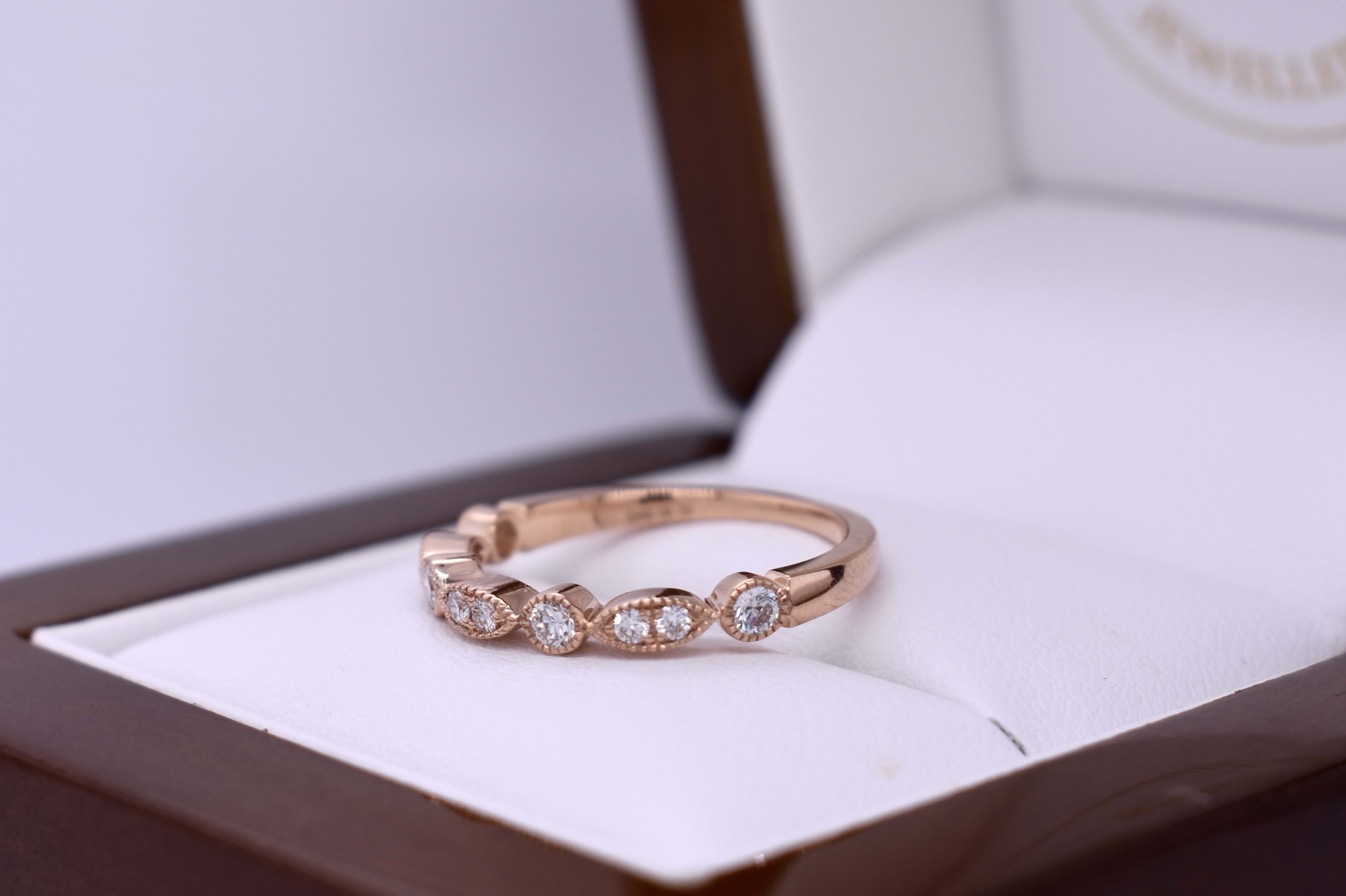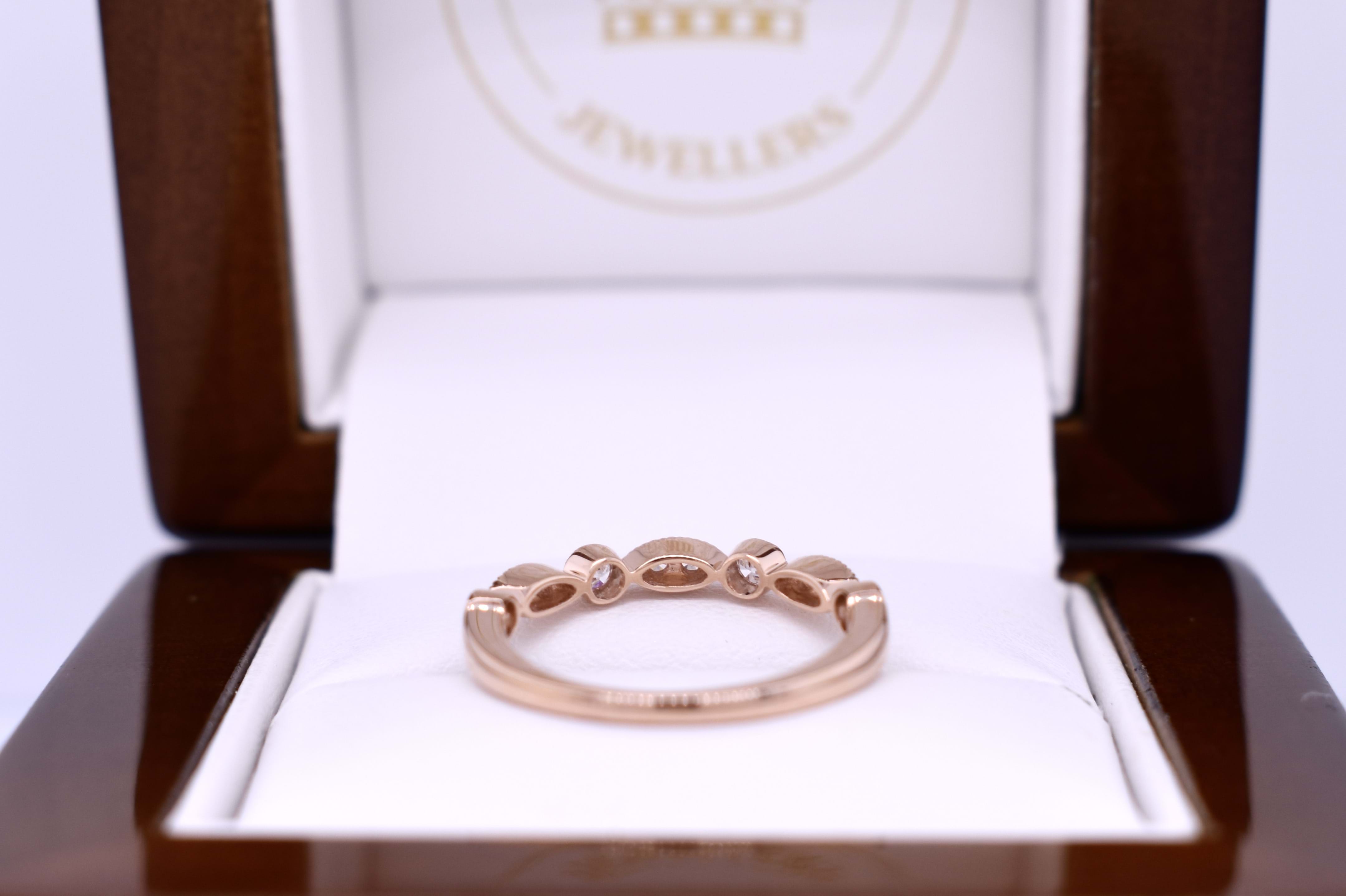 A pretty and feminine band crafted in 18ct rose gold, featuring shimmering round brilliant cut diamonds set into alternating round and marquise-shaped mill grain bezels for an Art Deco inspired look. The band is set with 10 diamonds totalling 0.26ct in FG VS–SI, and makes a stunning wedding, eternity or stacking ring. Finger size L. Independent valuation supplied.