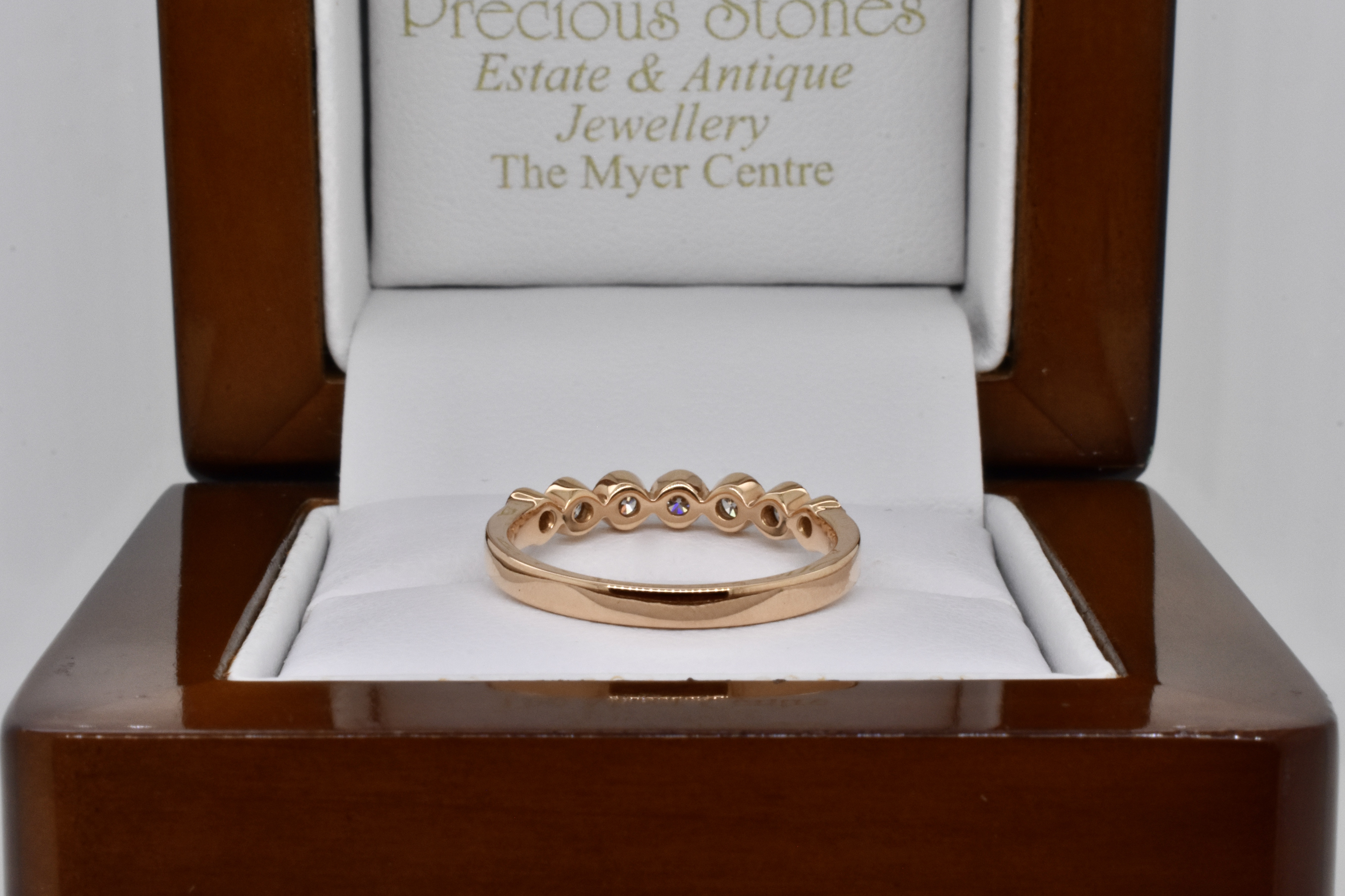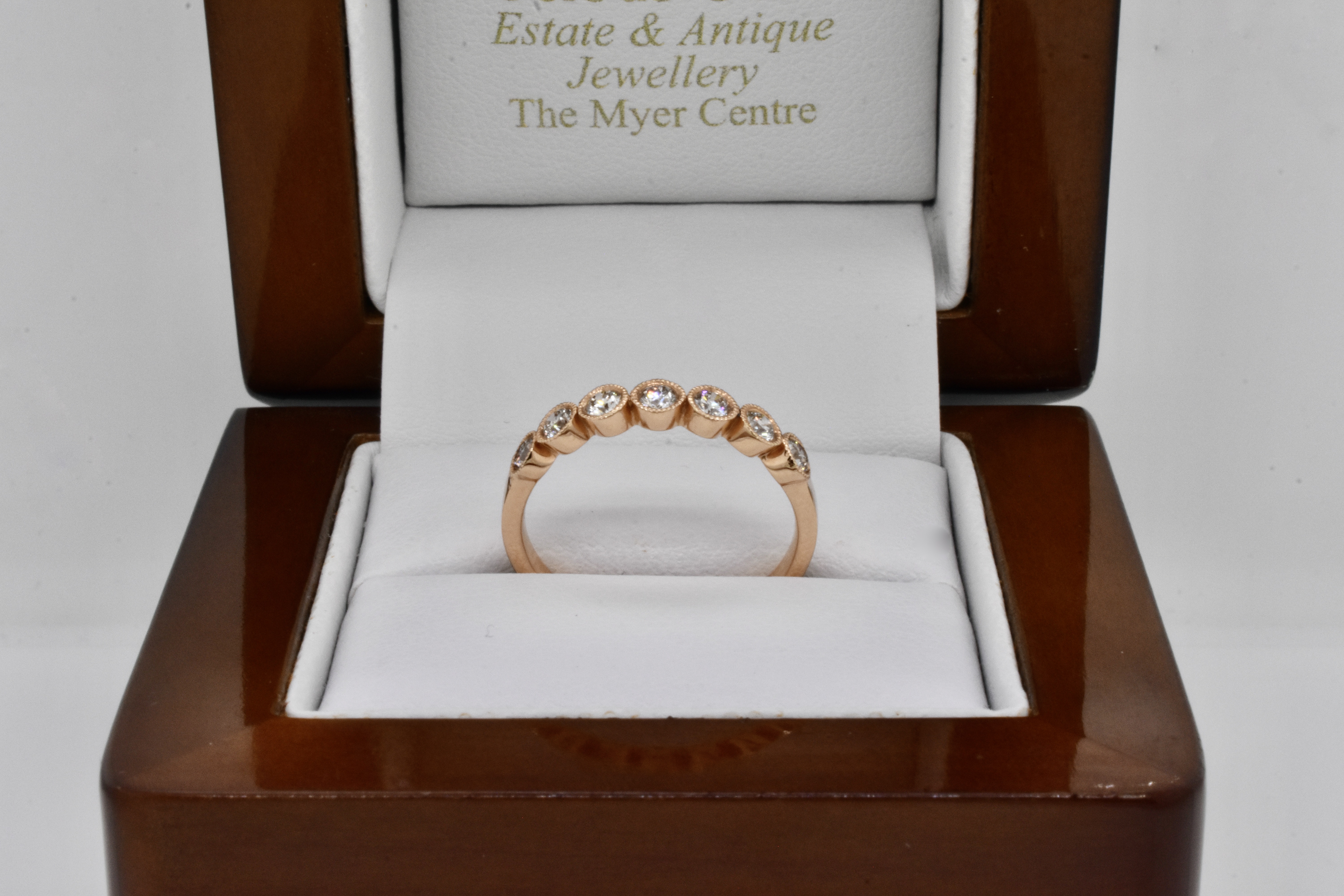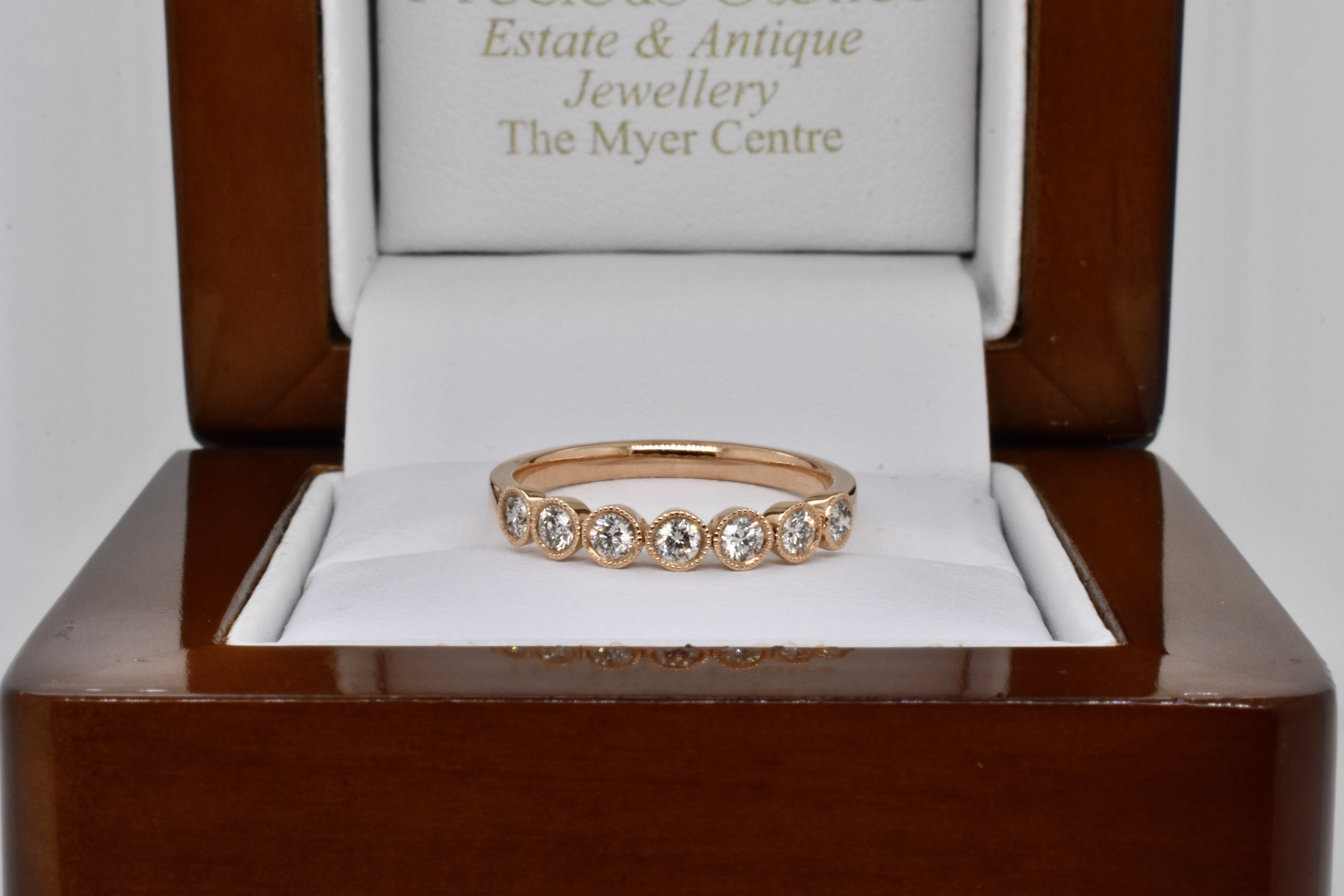 This stunning Art Deco inspired diamond band is ideal as a wedding, anniversary or stacking ring. The ring has been crafted in 18ct rose gold and features seven round brilliant cut diamonds totalling 0.36cts GH/SI set in individual millgrain bezels. Finger size M. Independent Valuation Supplied