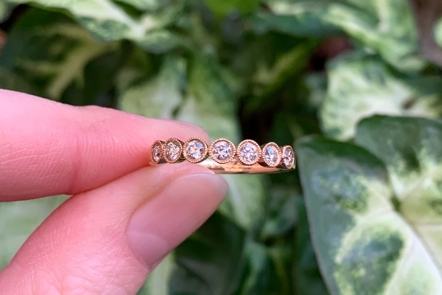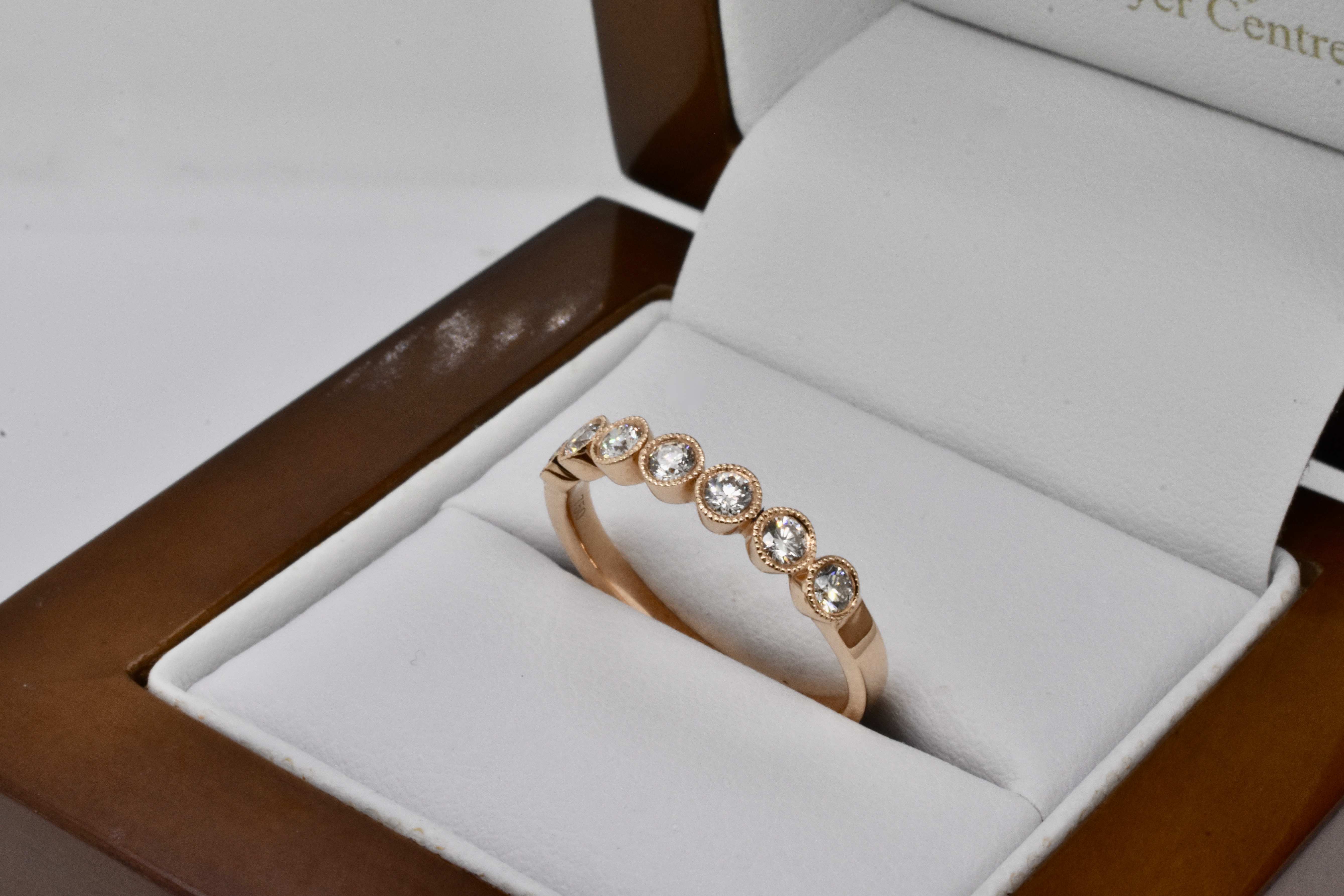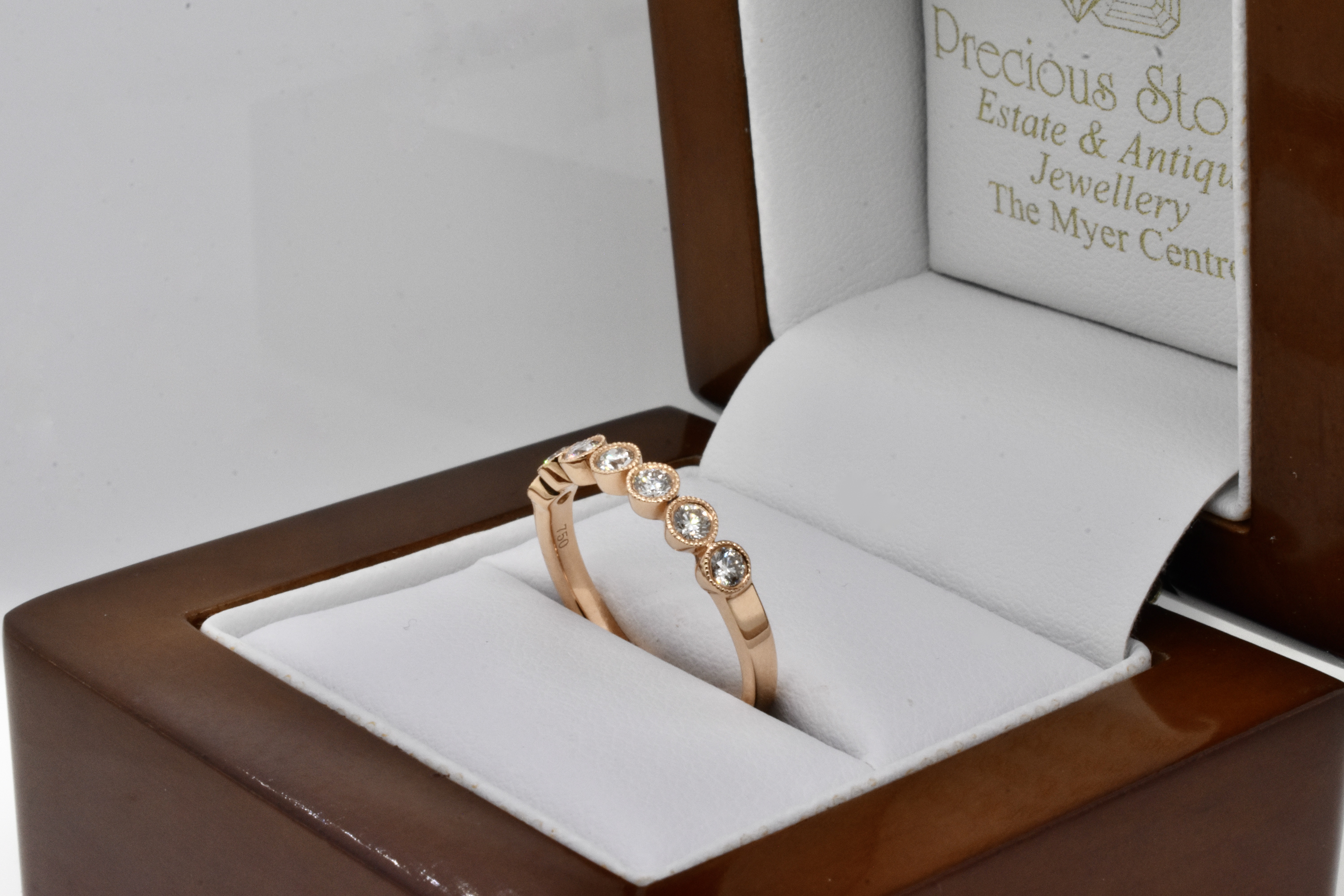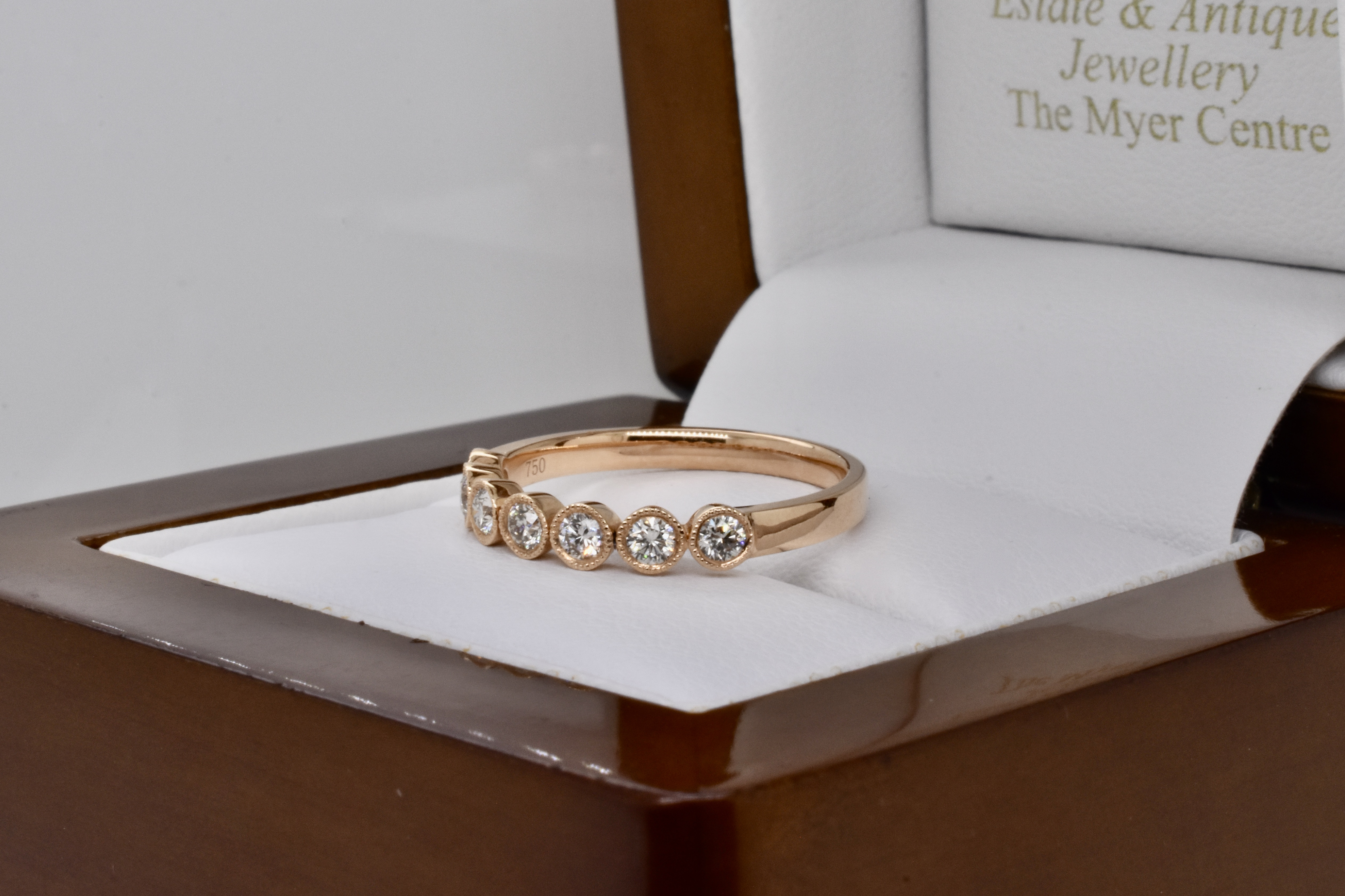 This stunning Art Deco inspired diamond band is ideal as a wedding, anniversary or stacking ring. The ring has been crafted in 18ct rose gold and features seven round brilliant cut diamonds totalling 0.36cts GH/SI set in individual millgrain bezels. Finger size M. Independent Valuation Supplied