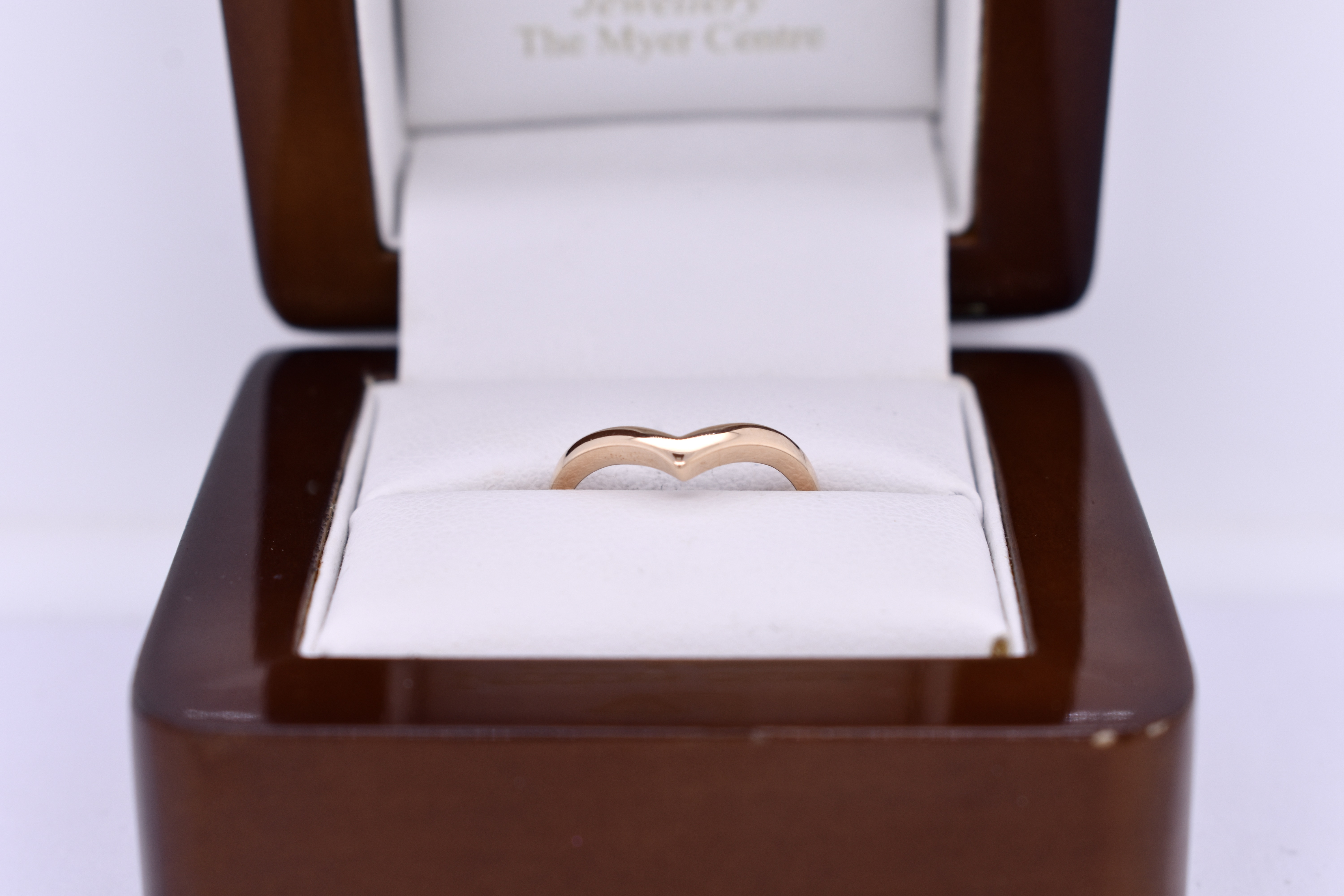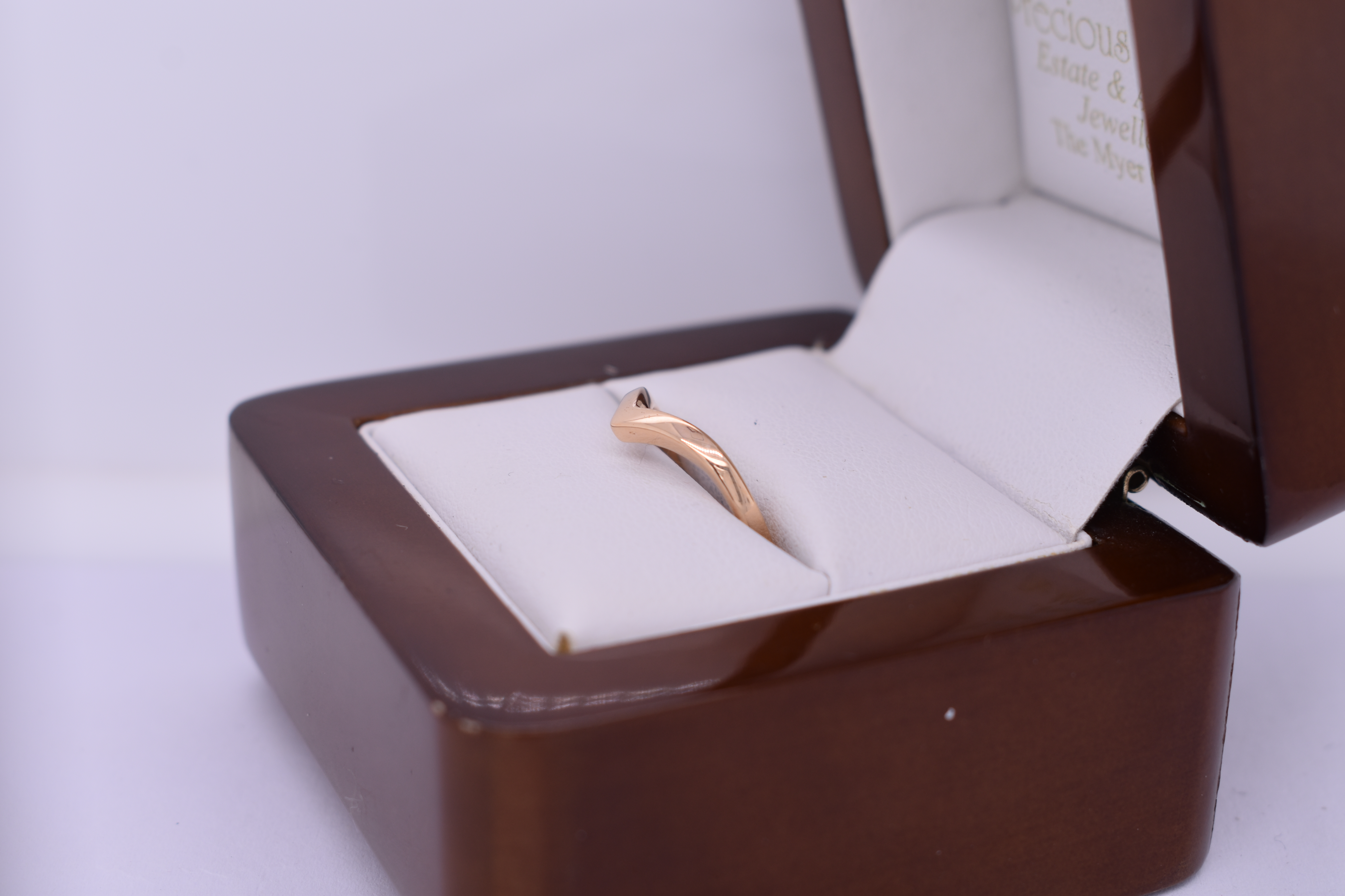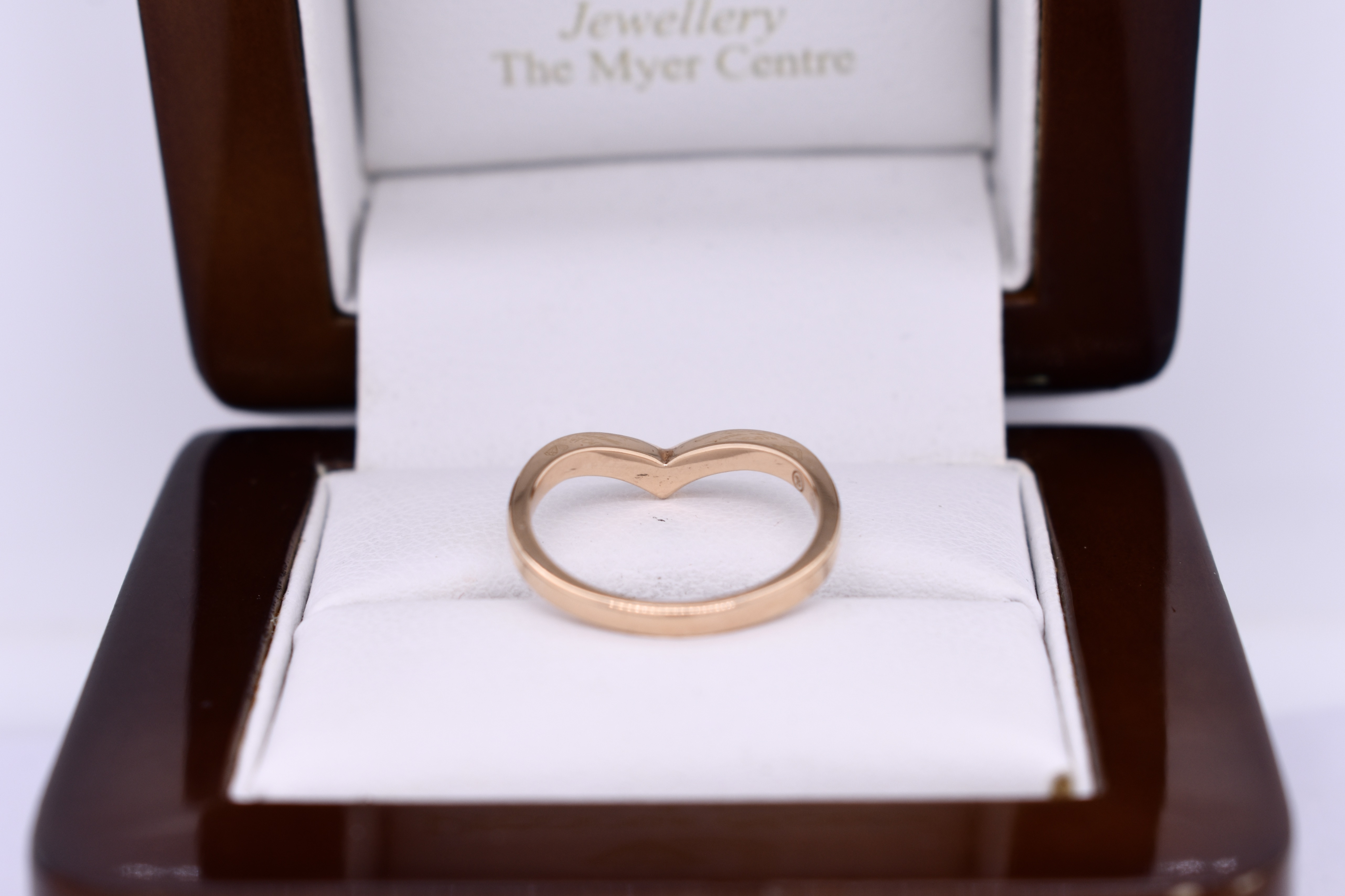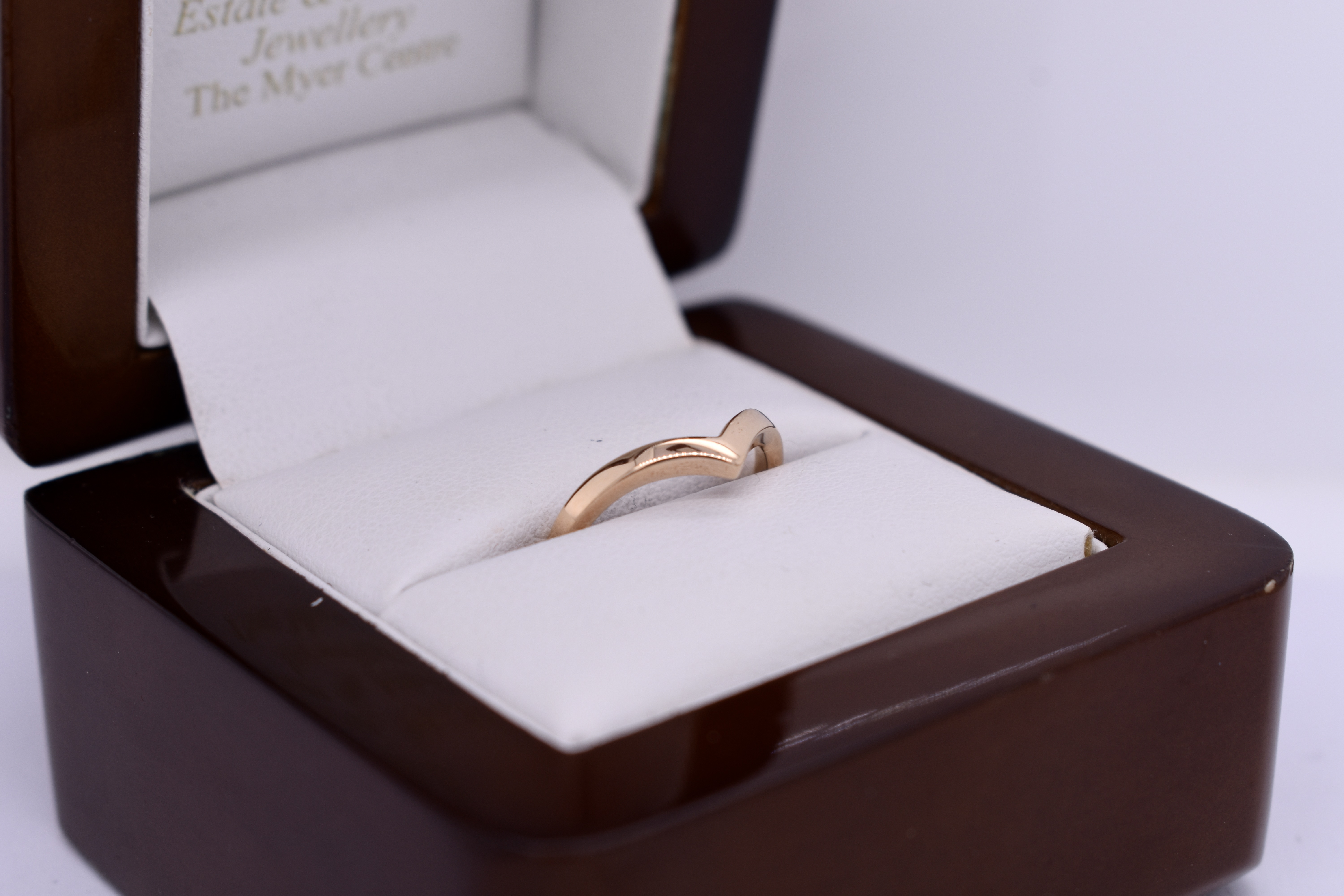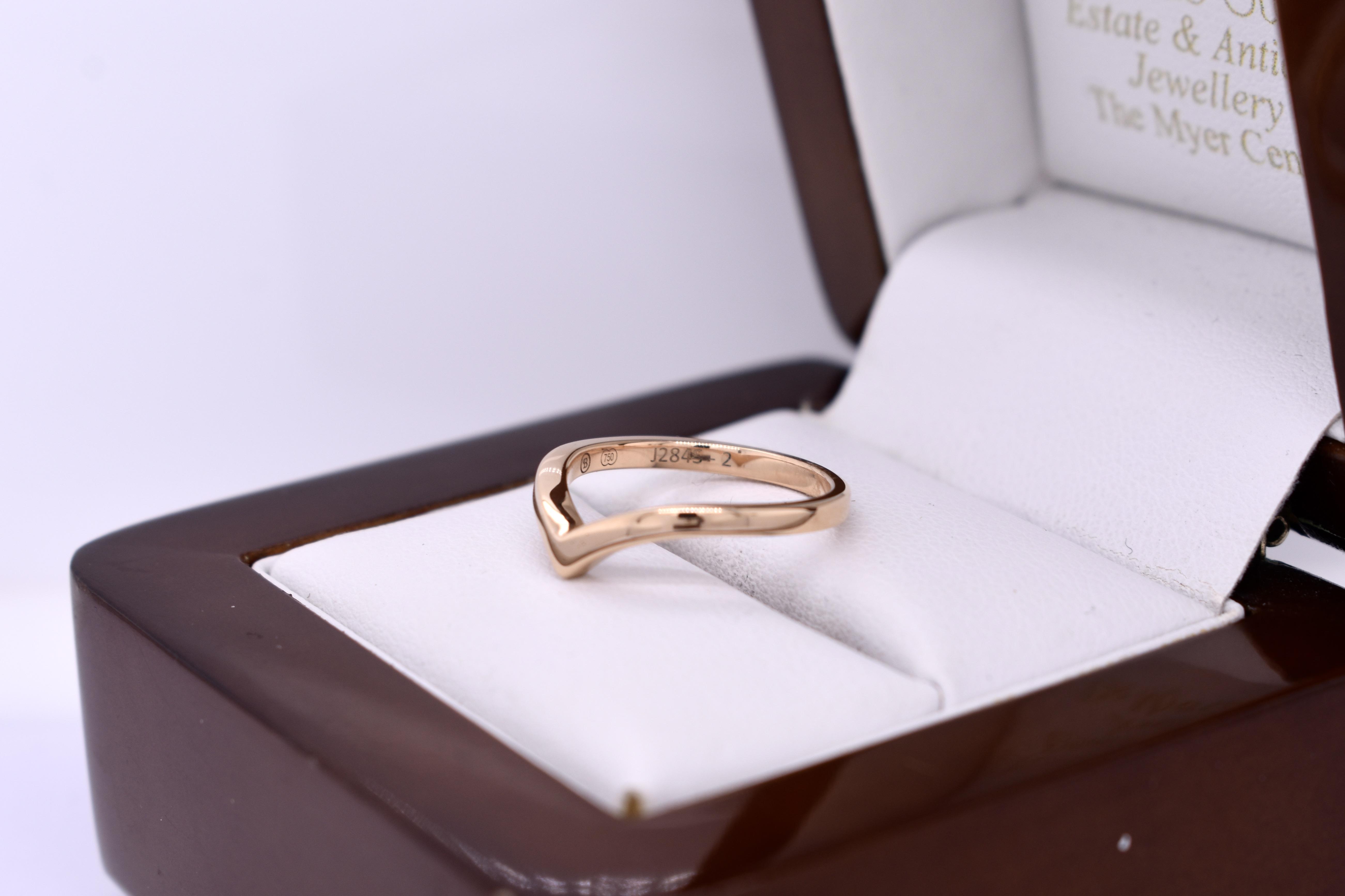 This simple band is made in 18ct yellow gold in a pointed curved shape, measuring 2.00mm wide. Finger size I.