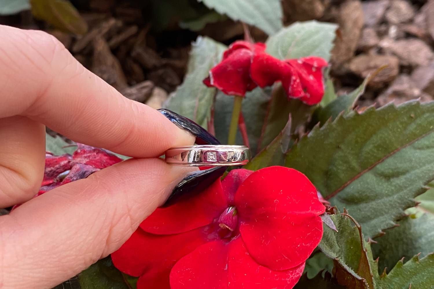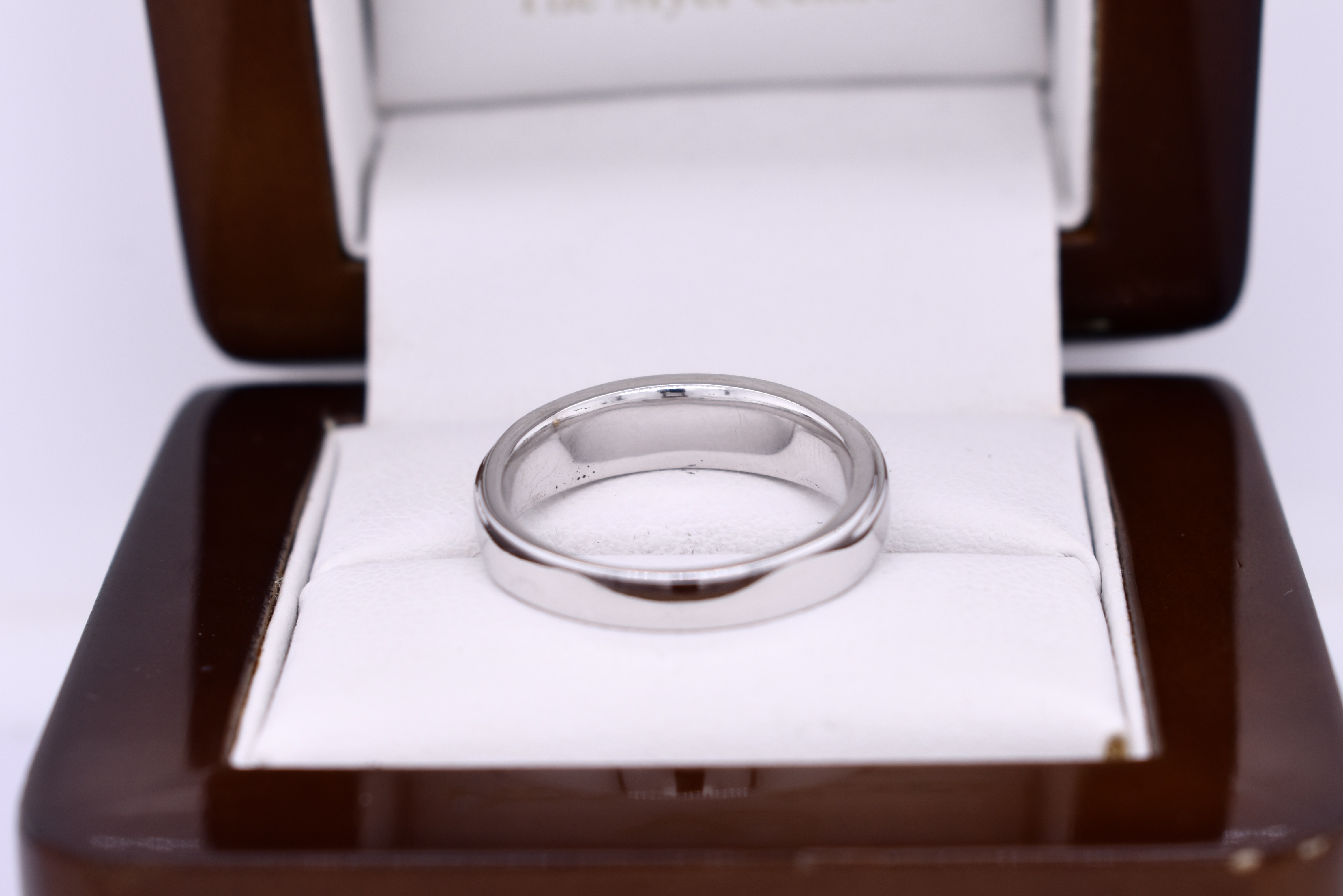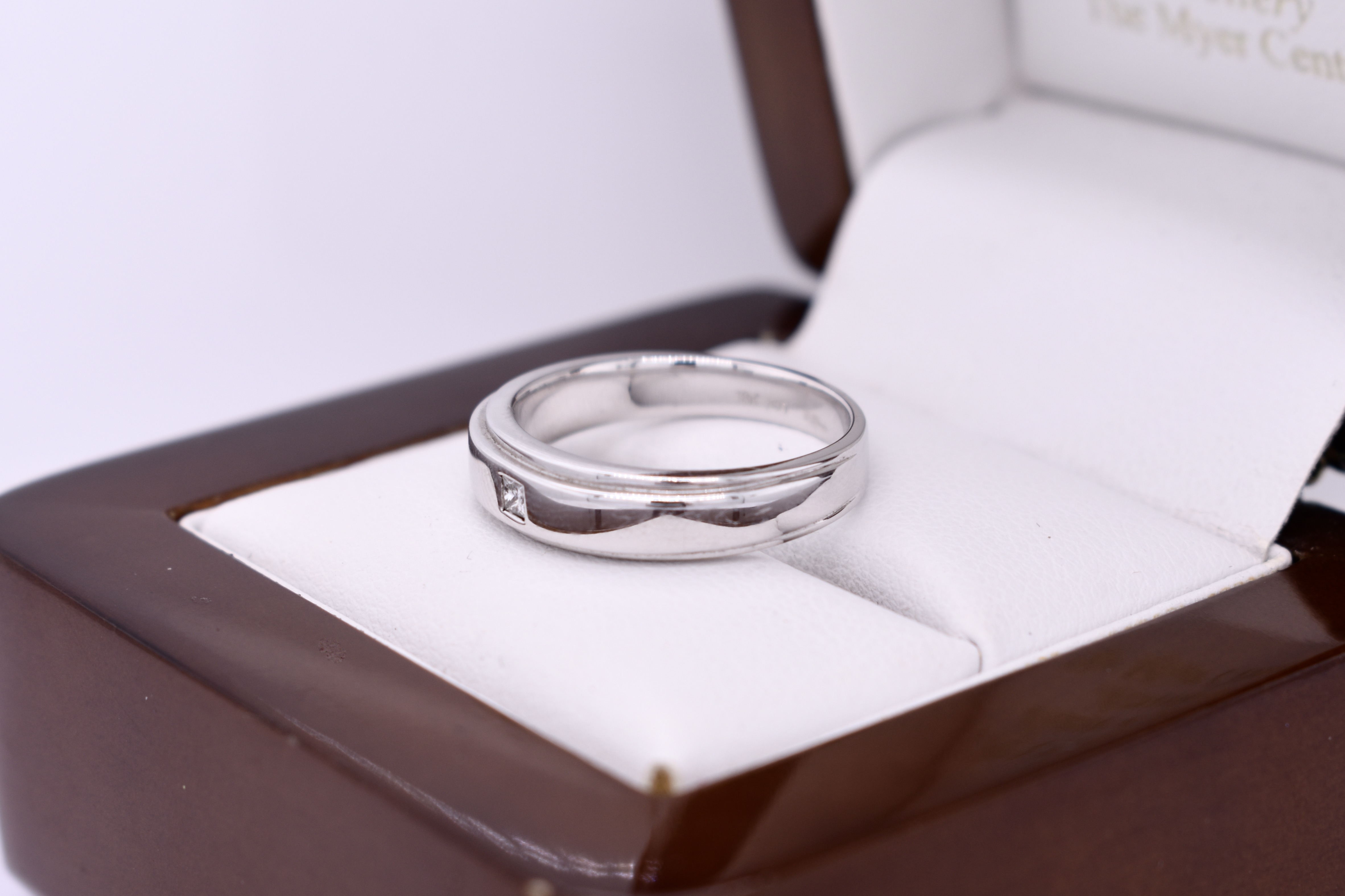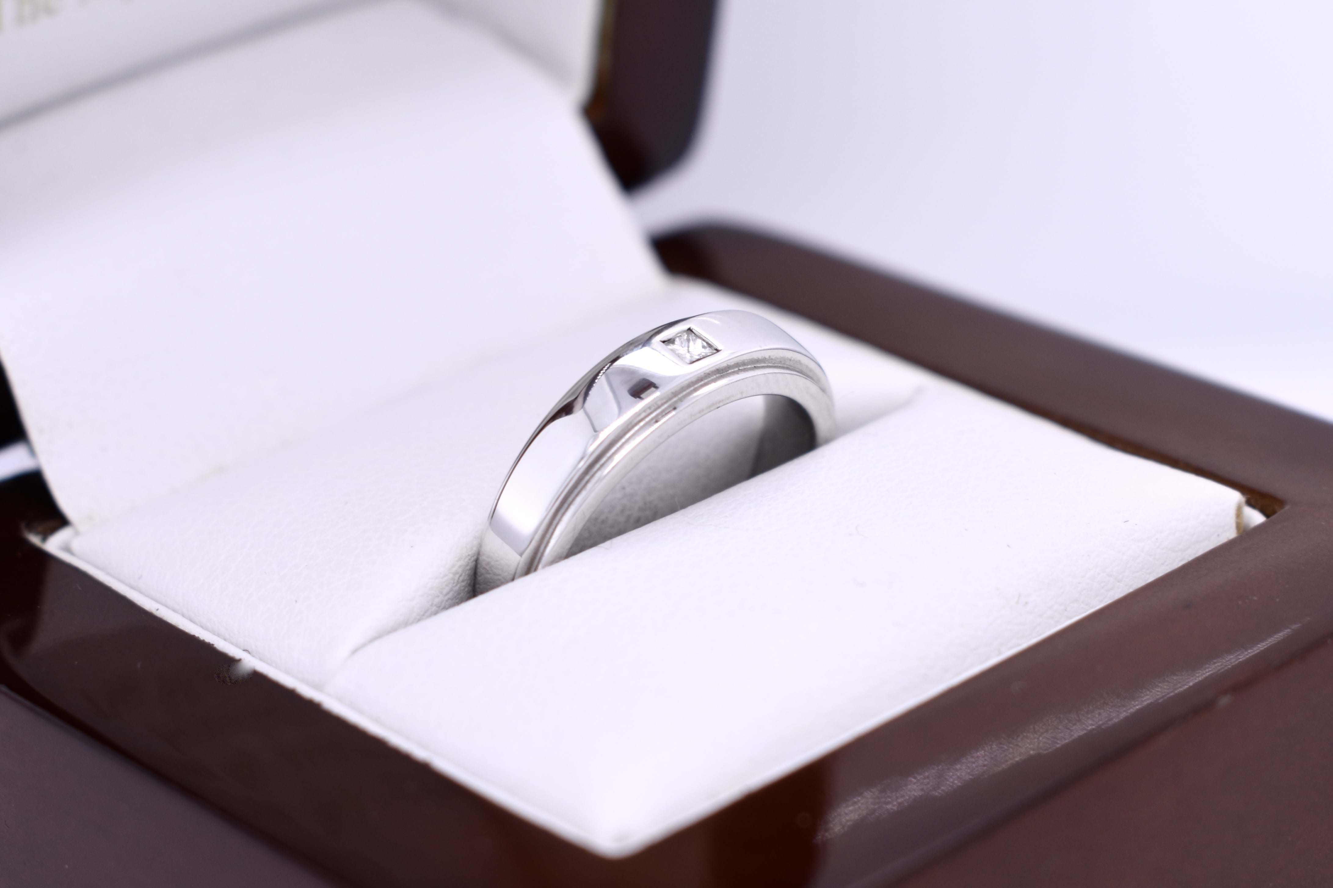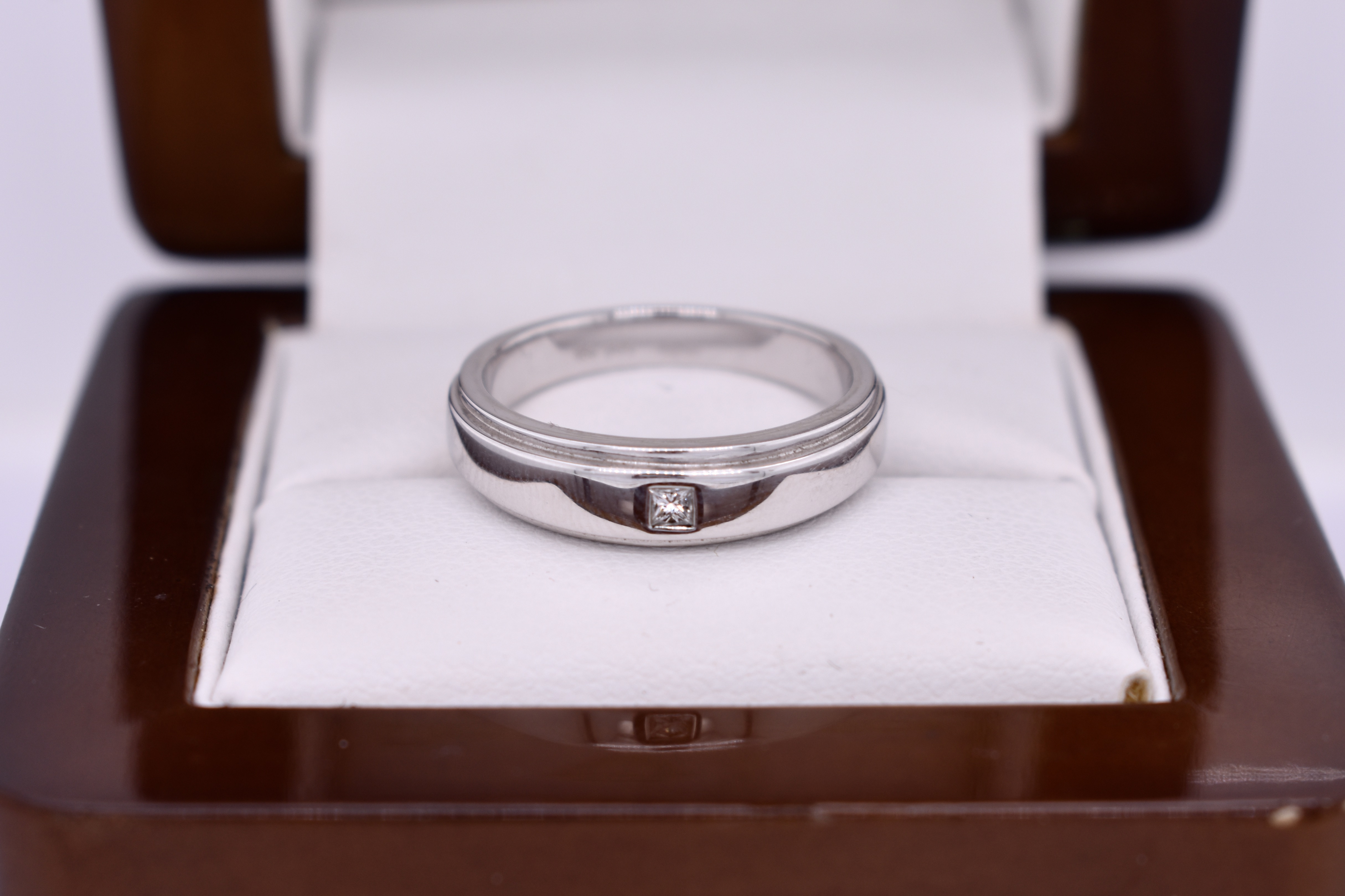 Crafted in 18ct white gold this grooved edge band is set with one princess cut 2mm diamond, presssure set in the centre. Diamond weight of 0.05ct H SI, completed on a flat tapering 3.18mm band. 4.14 grams. Finger size N. Independent Valuation Supplied