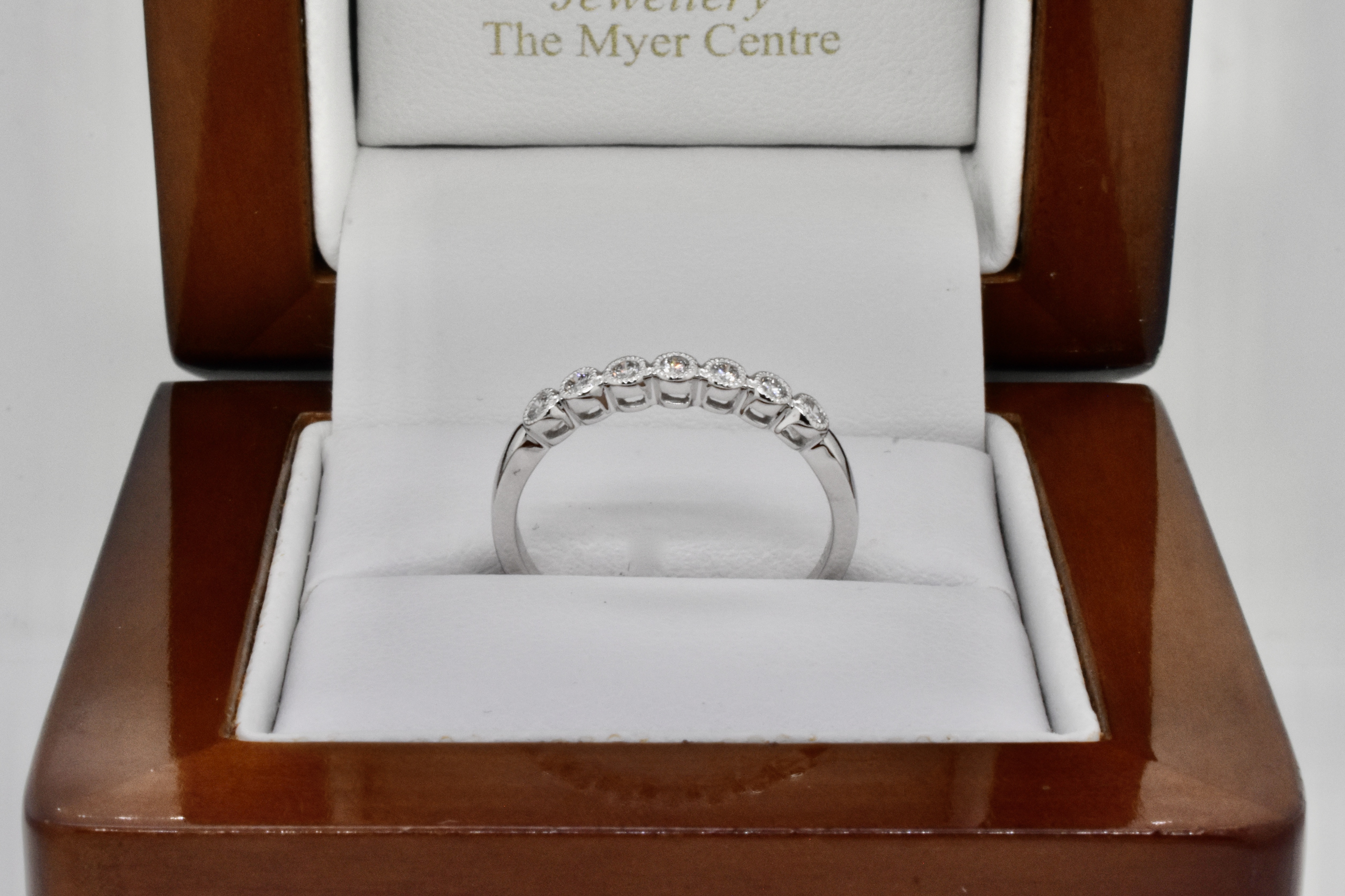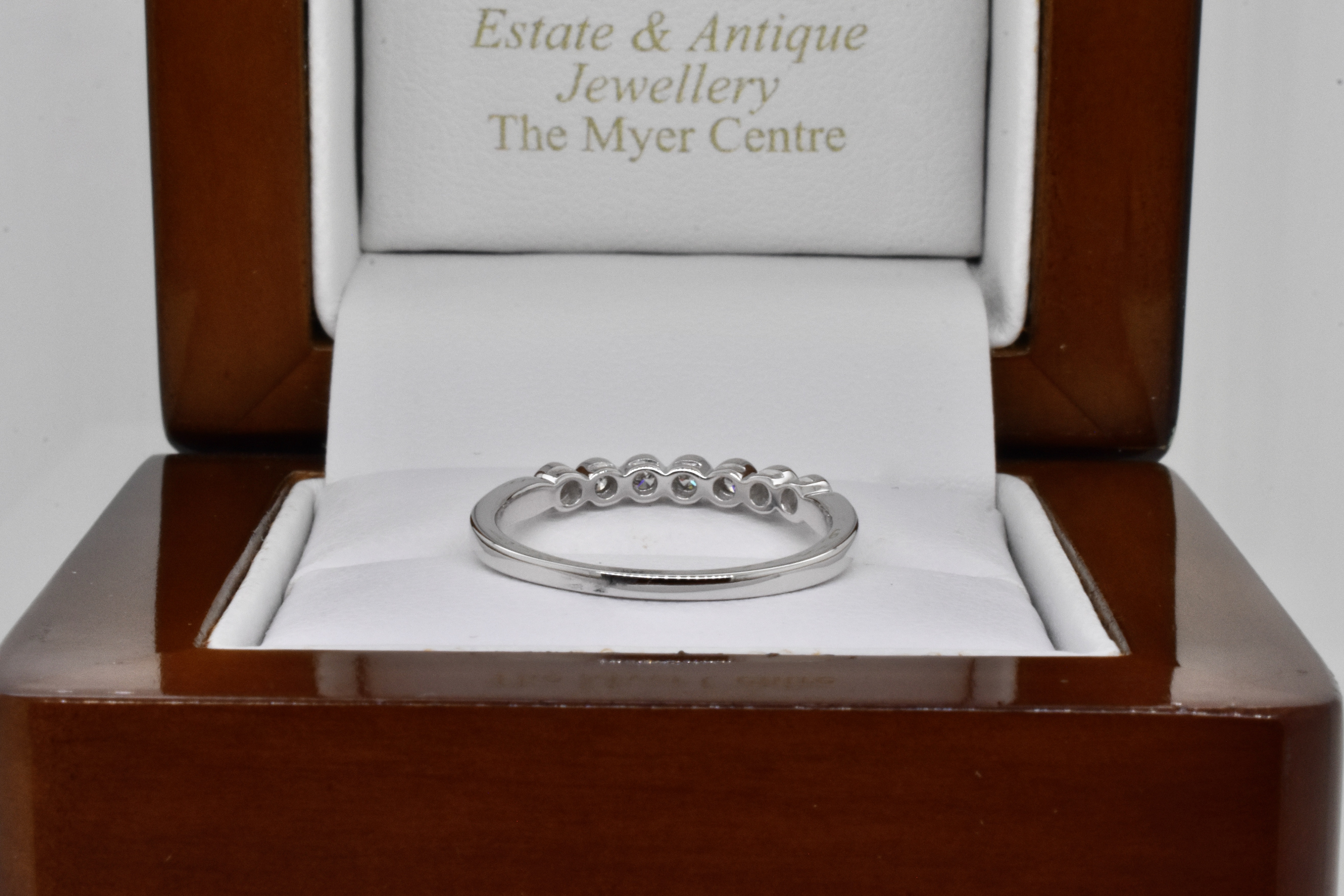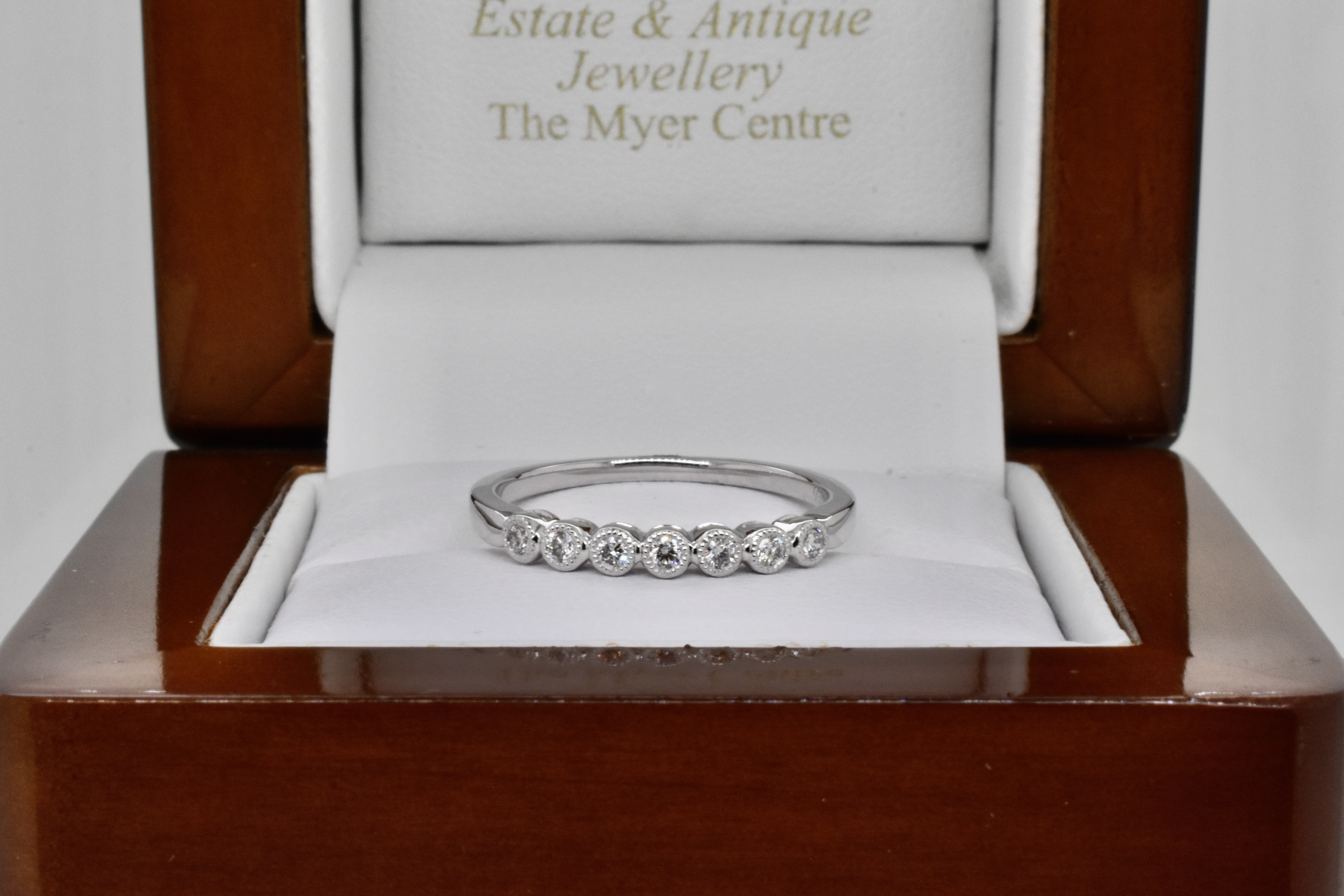 This stunning Art Deco inspired diamond band is ideal as a wedding, anniversary or stacking ring. The ring has been crafted in 18ct white gold and features seven round brilliant cut diamonds totalling 0.15cts F/VS-SI set in individual millgrain bezels. Finger size M+ Independent Valuation Supplied