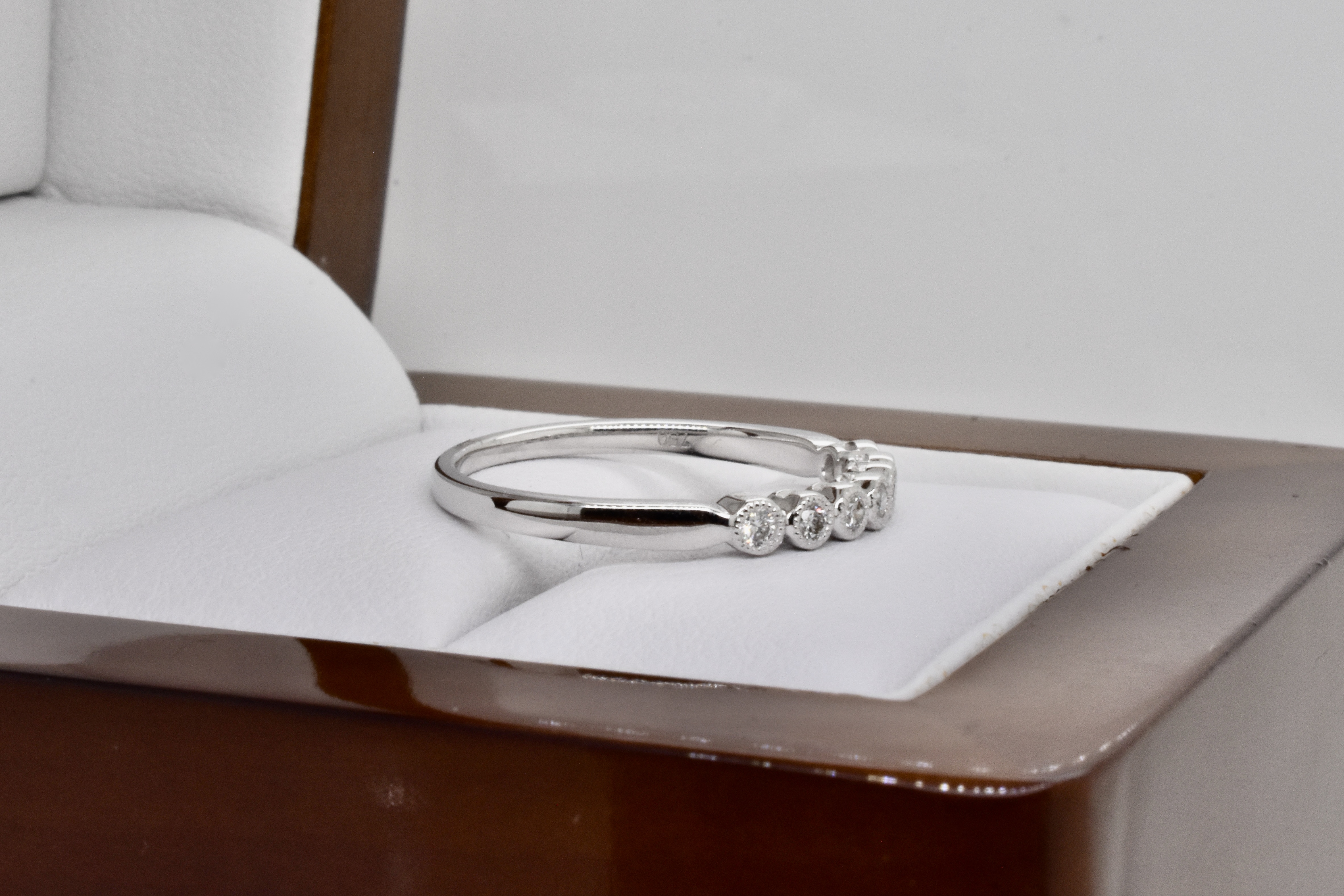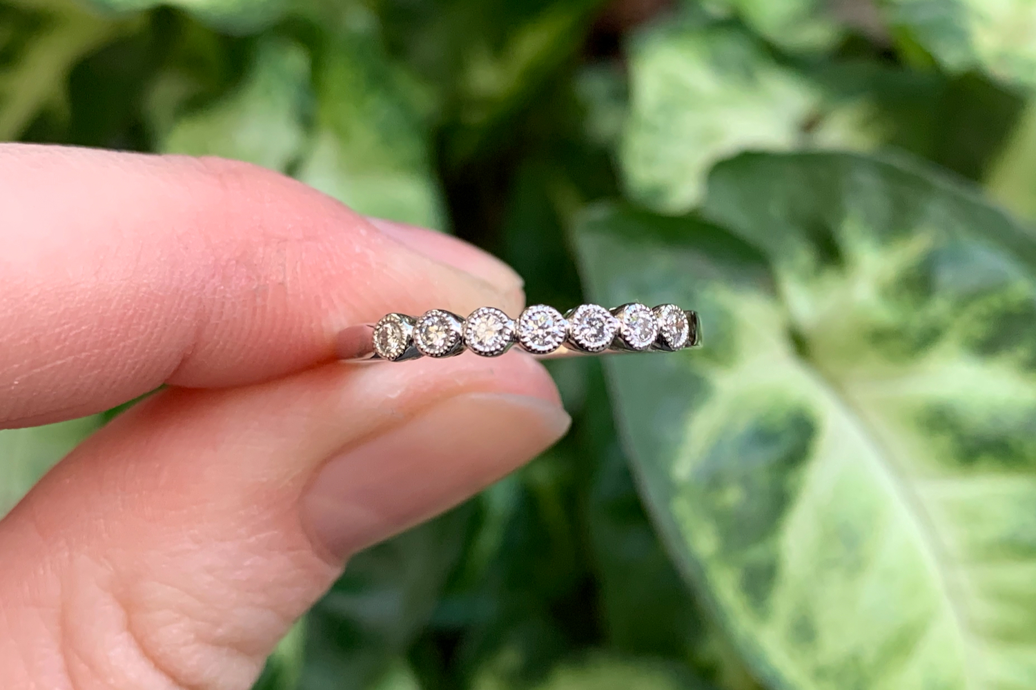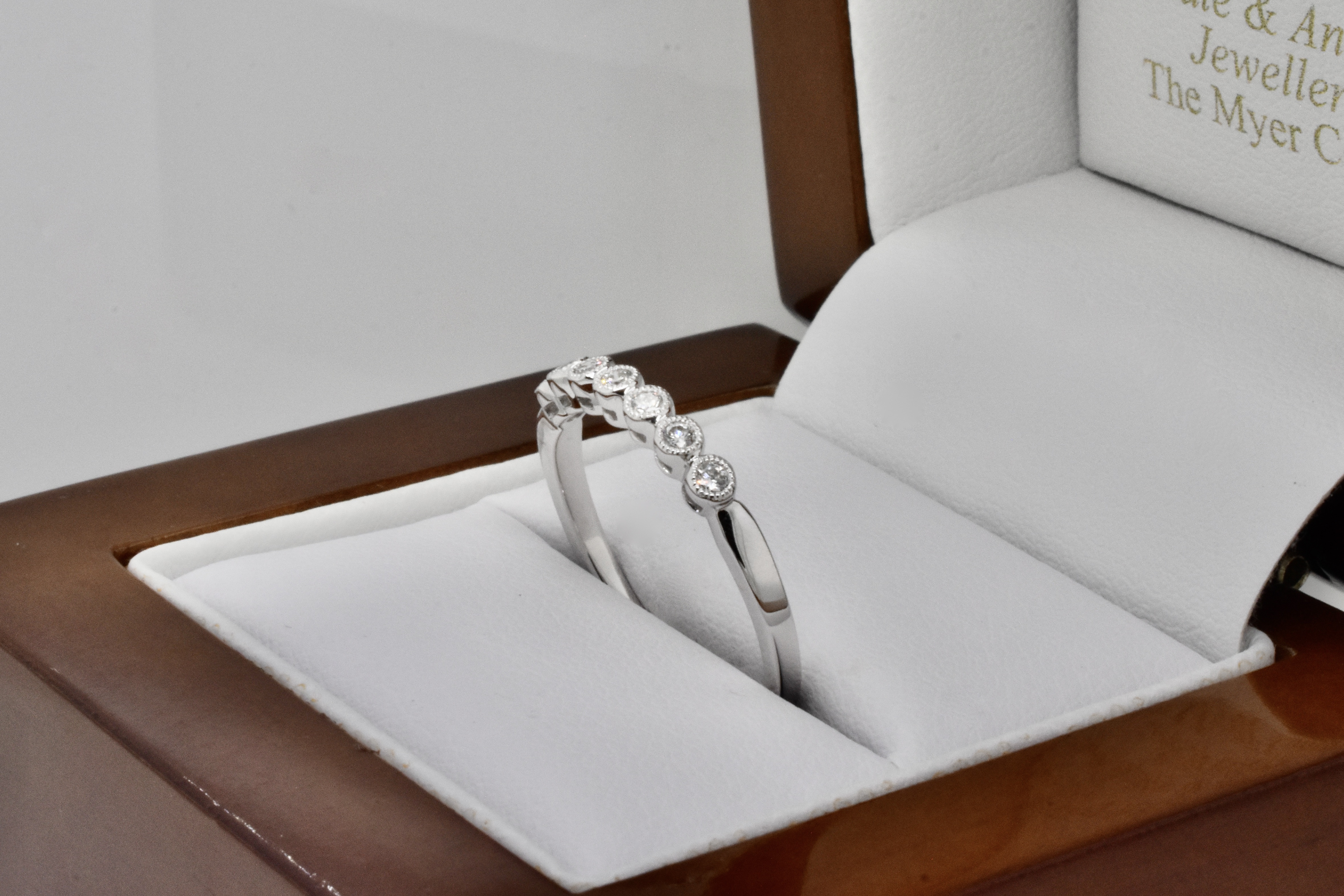 This stunning Art Deco inspired diamond band is ideal as a wedding, anniversary or stacking ring. The ring has been crafted in 18ct white gold and features seven round brilliant cut diamonds totalling 0.15cts F/VS-SI set in individual millgrain bezels. Finger size M+ Independent Valuation Supplied
