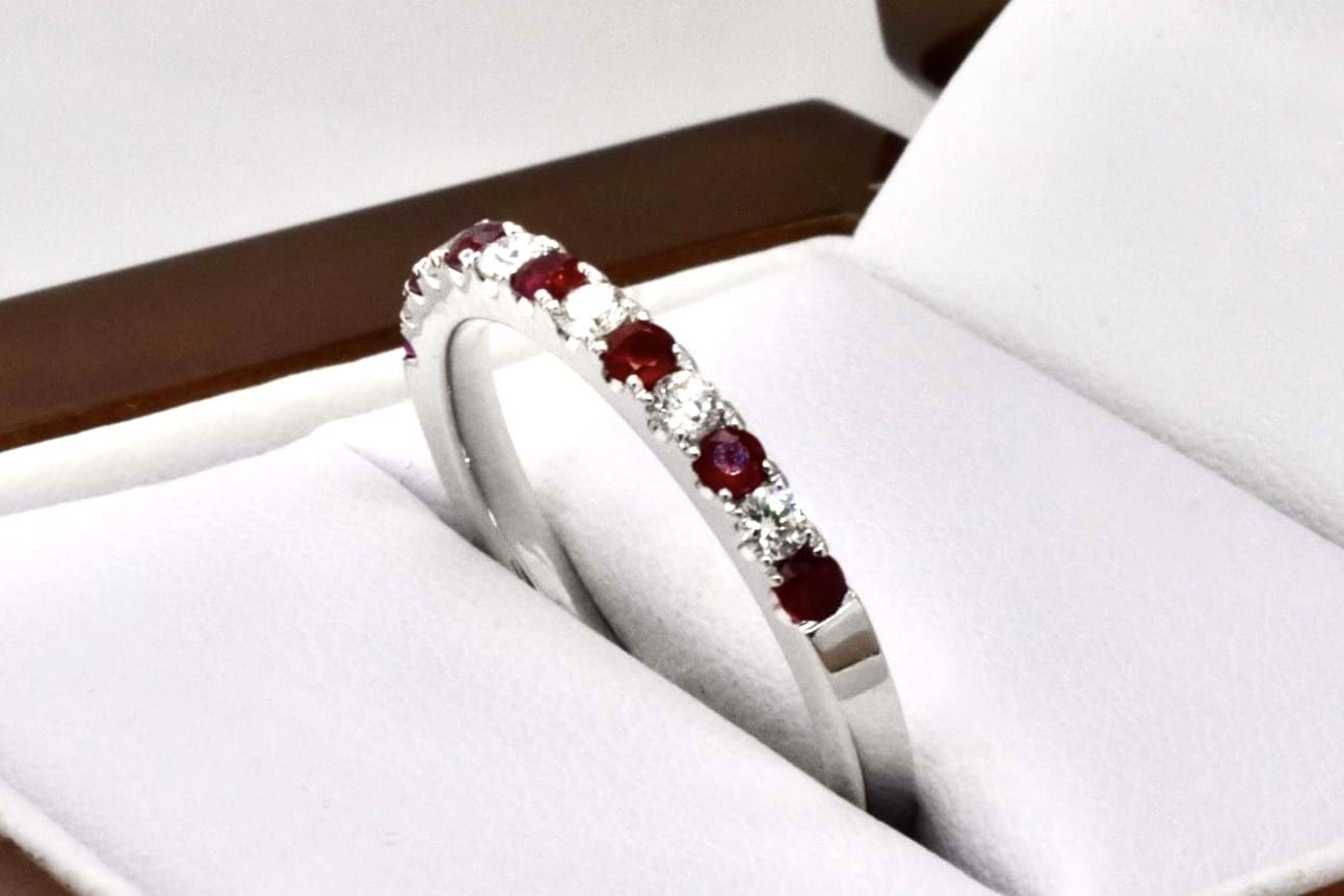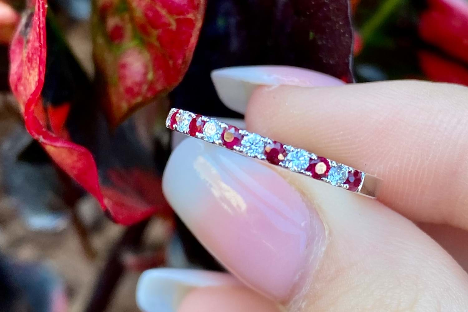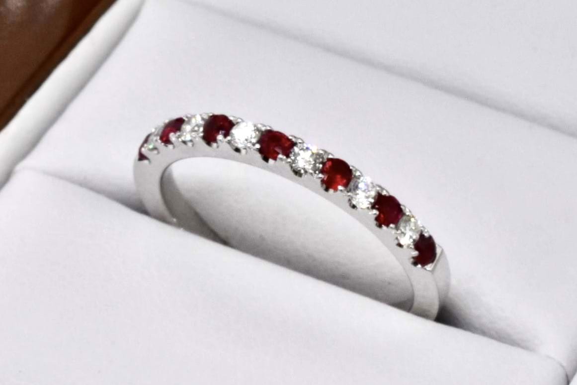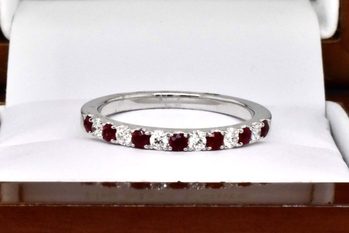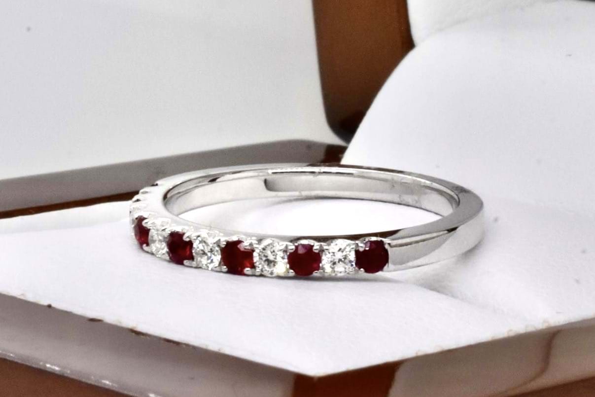 Contemporary and timeless ruby and diamond band, ideal as a wedding, anniversary or stacking ring. The ring has been crafted in 18ct white gold with seven, bright dark red, rubies equalling 0.29cts and six round brilliant cut diamonds totalling 0.18cts GVS shared four claw set. Finger size M+ Independent Valuation Supplied