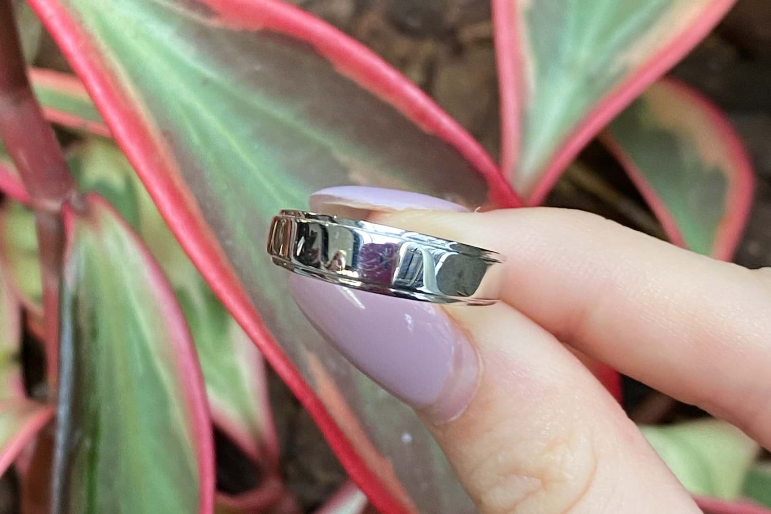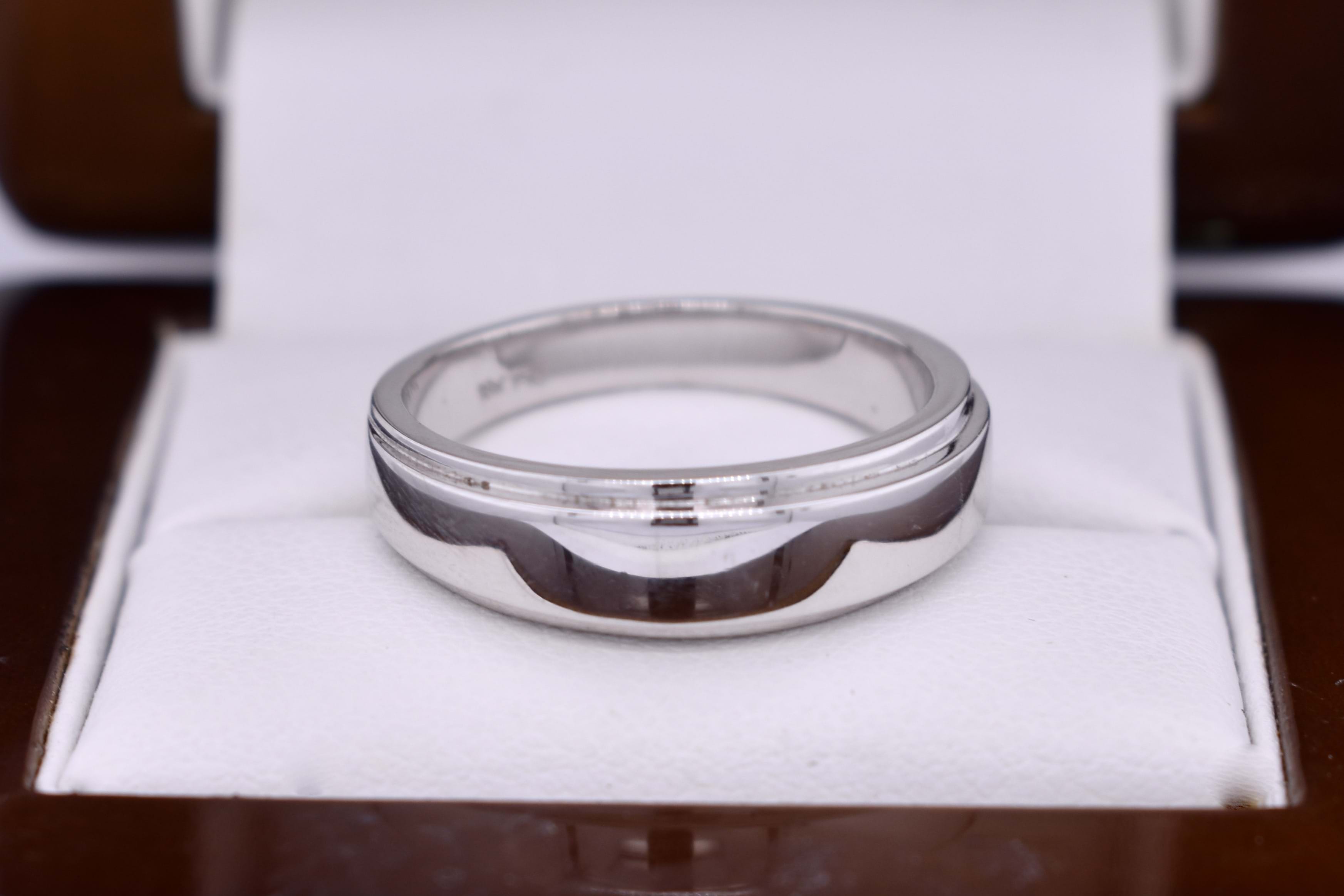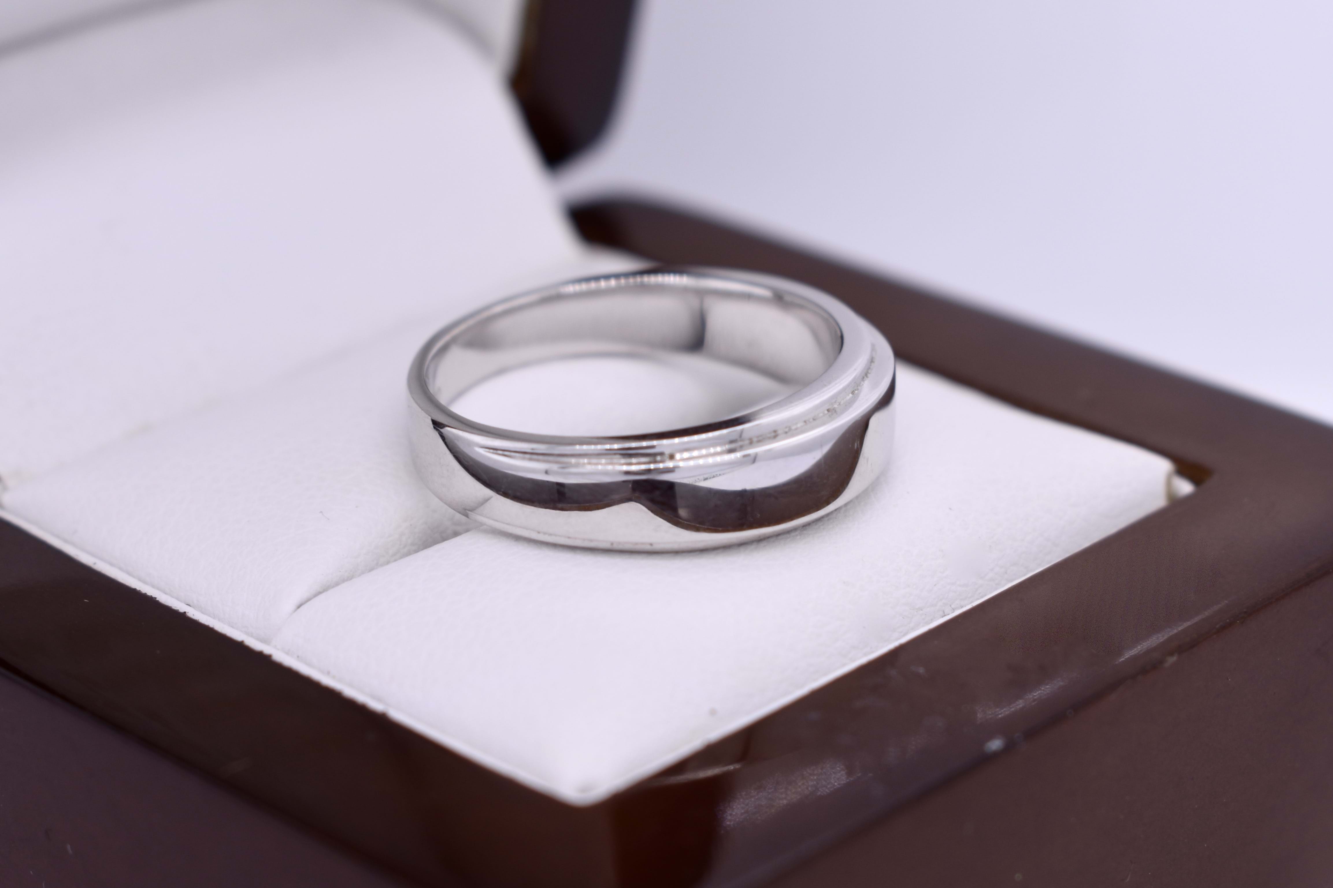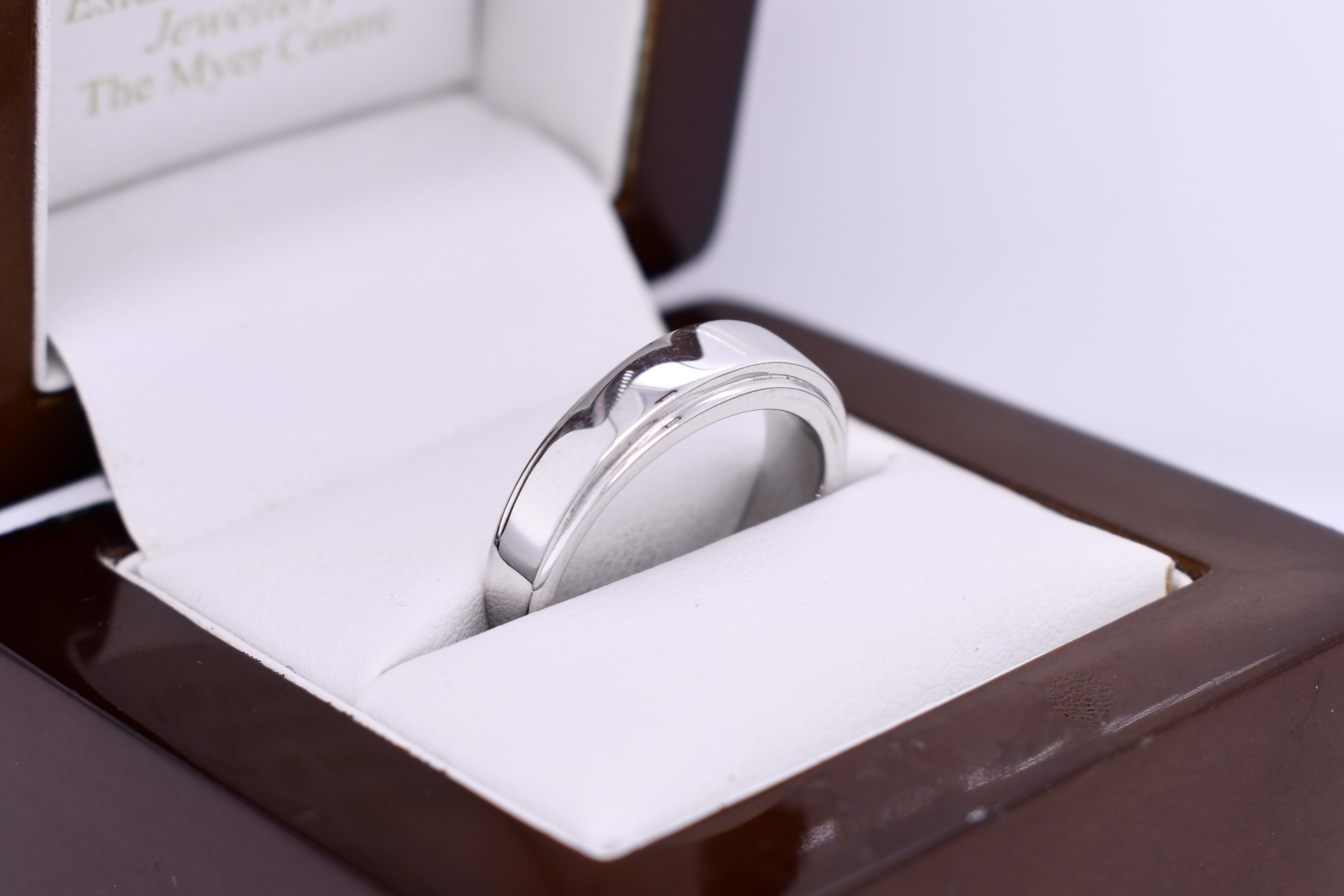 Crafted in 18ct white gold, this classic and timeless band has grooved edge detailing and features a tapering 3.52mm band. 6.05 grams.