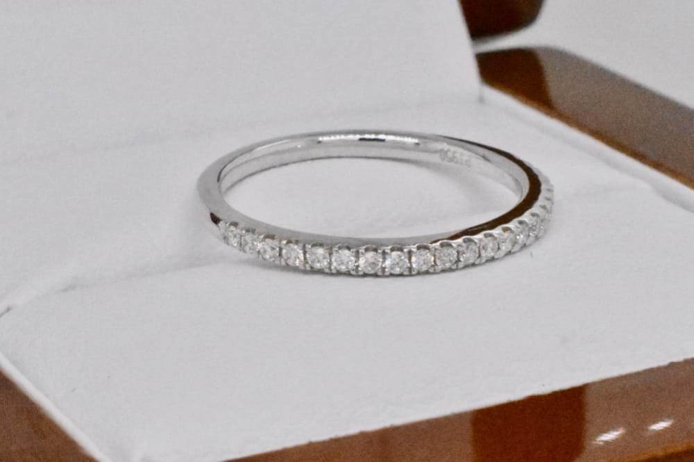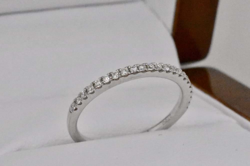 A platinum cut away claw style diamond band featuring 22 round brilliant cut diamonds totalling 0.17cts. Size K1/2. Independent Valuation Supplied