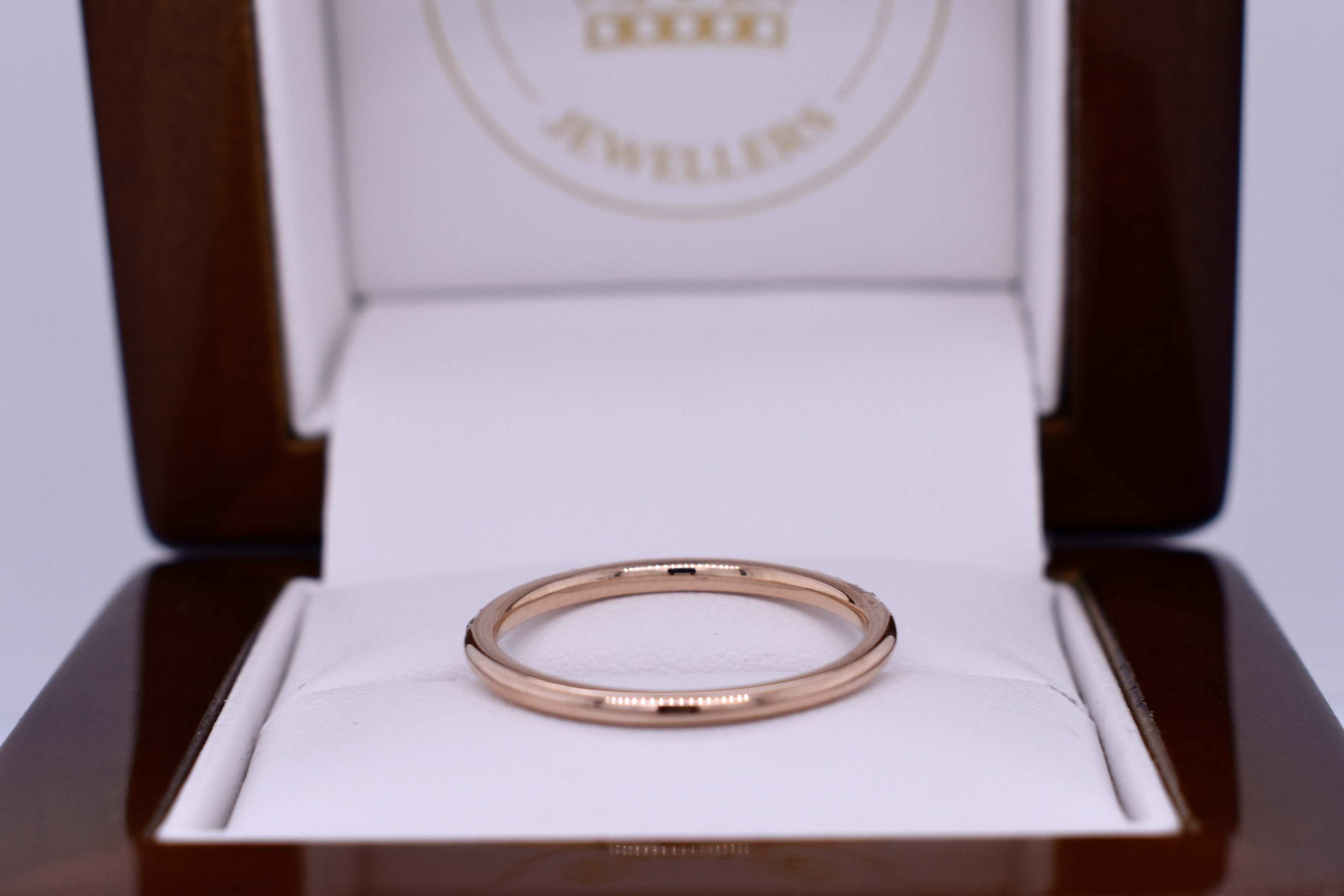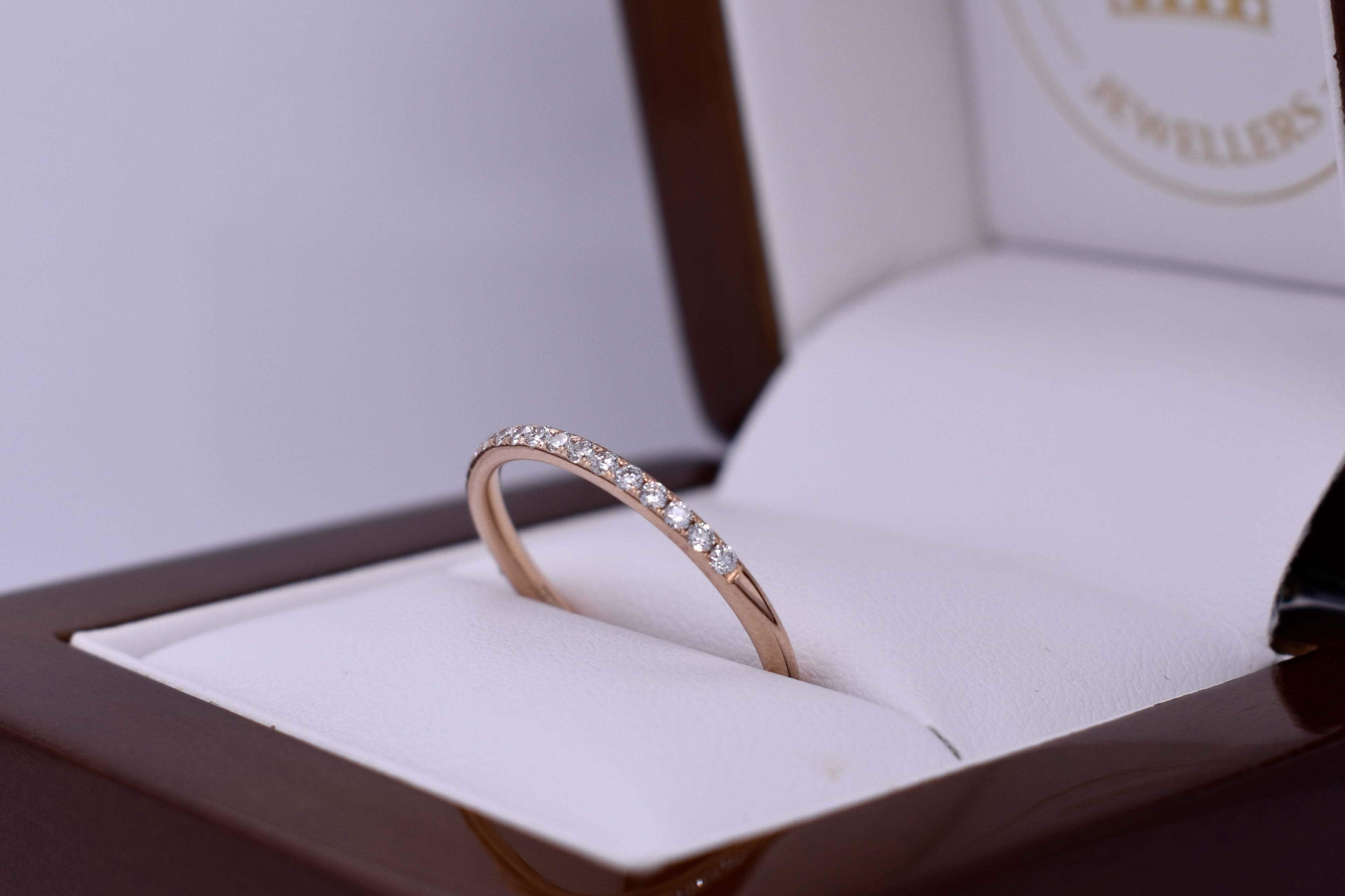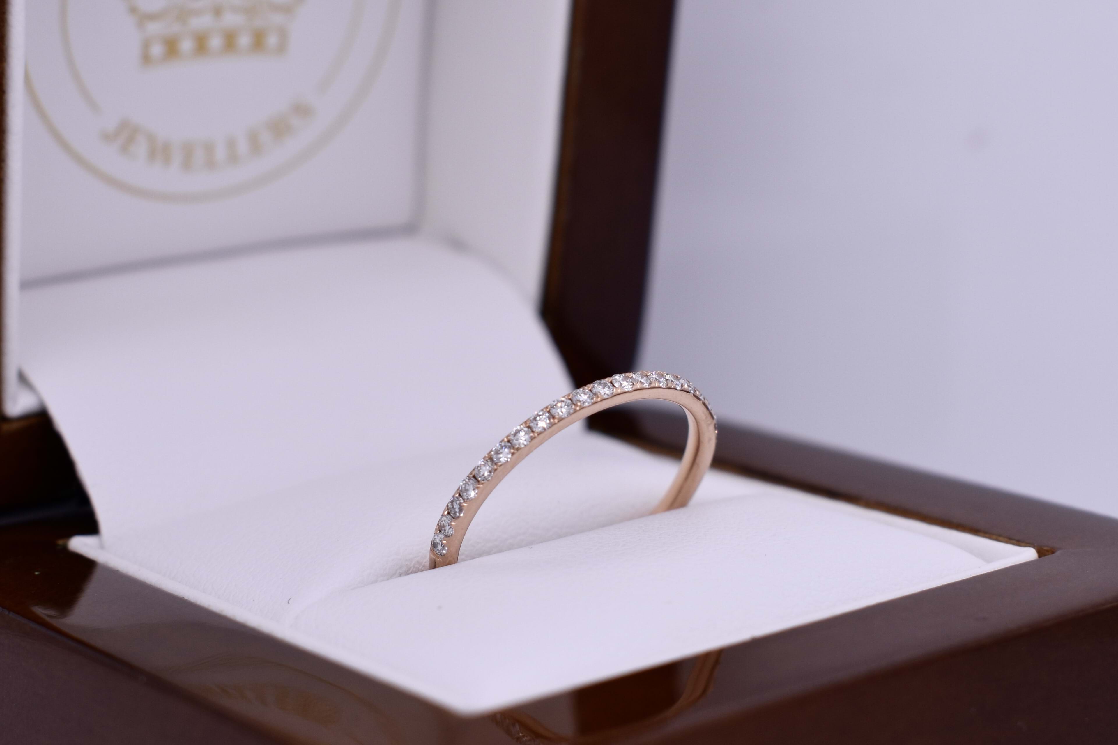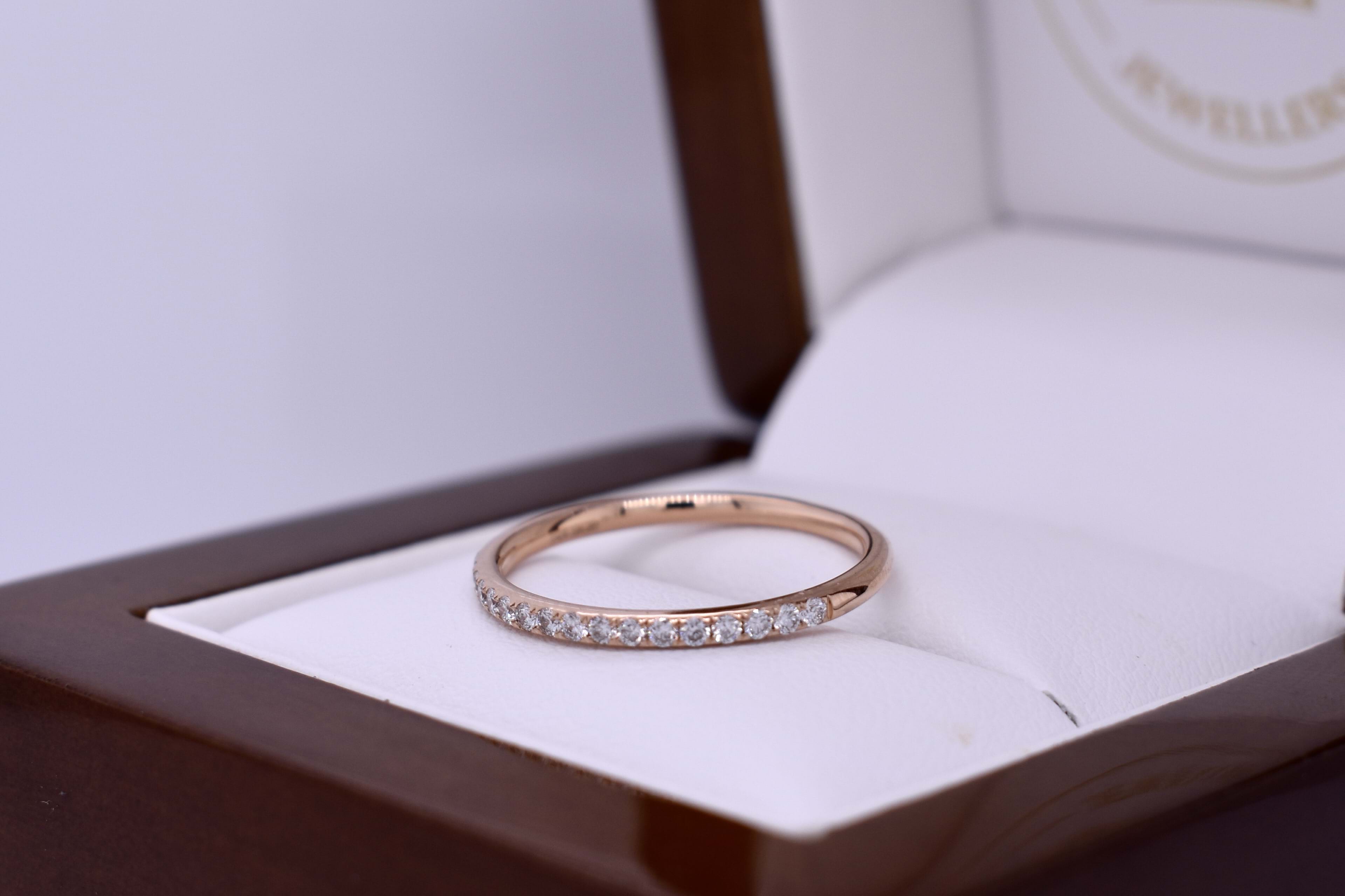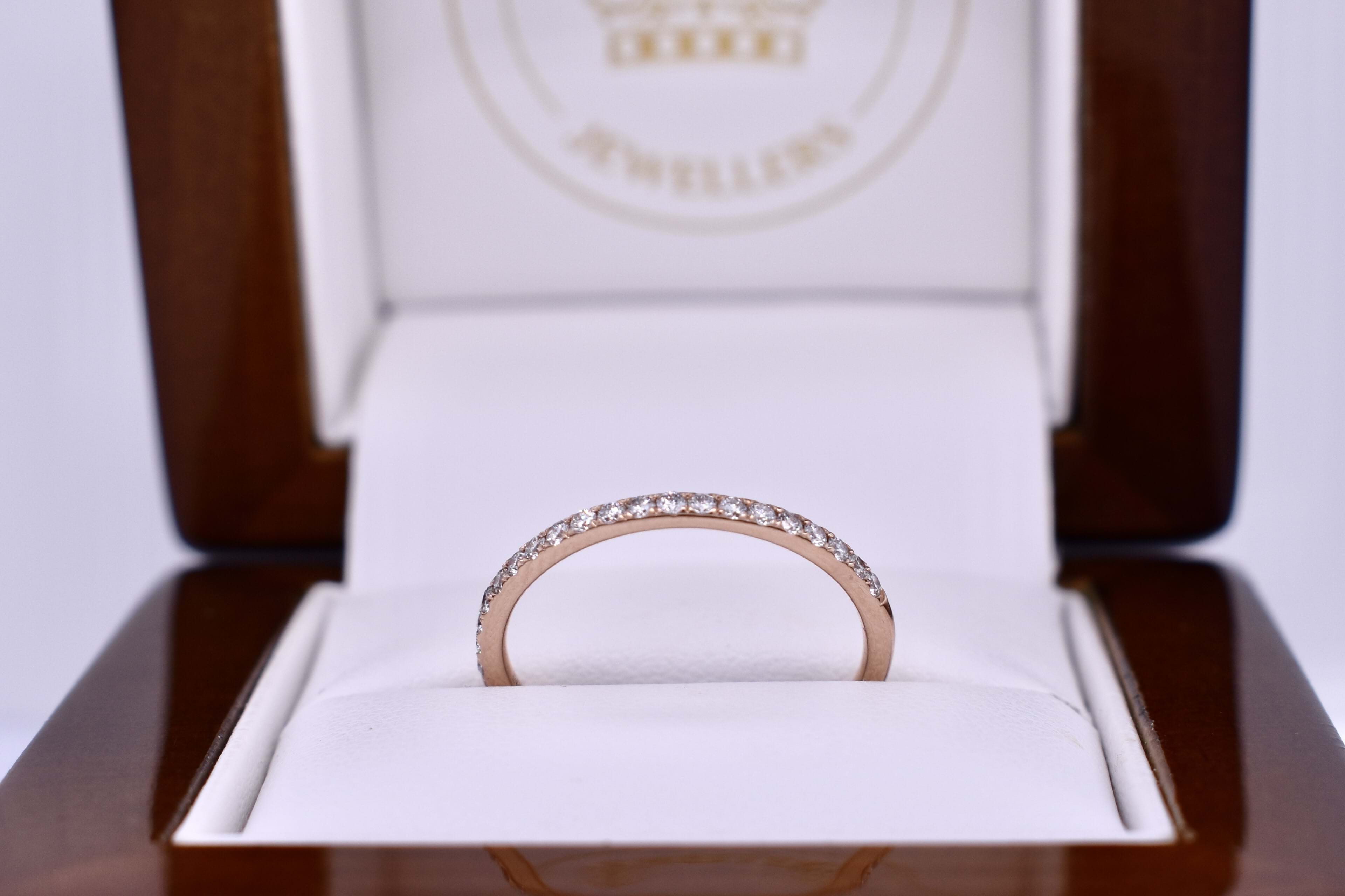 This is our signature 20 diamond wedding band, expertly crafted in 18ct rose gold with grain set diamonds in a cylindrical band profile designed to look fine and delicate but with practicality at the forefront of the design. Each band contains 20 round brilliant cut diamonds equalling 0.26cts FG/VS-SI. Finger Size N. Independent valuation supplied.
