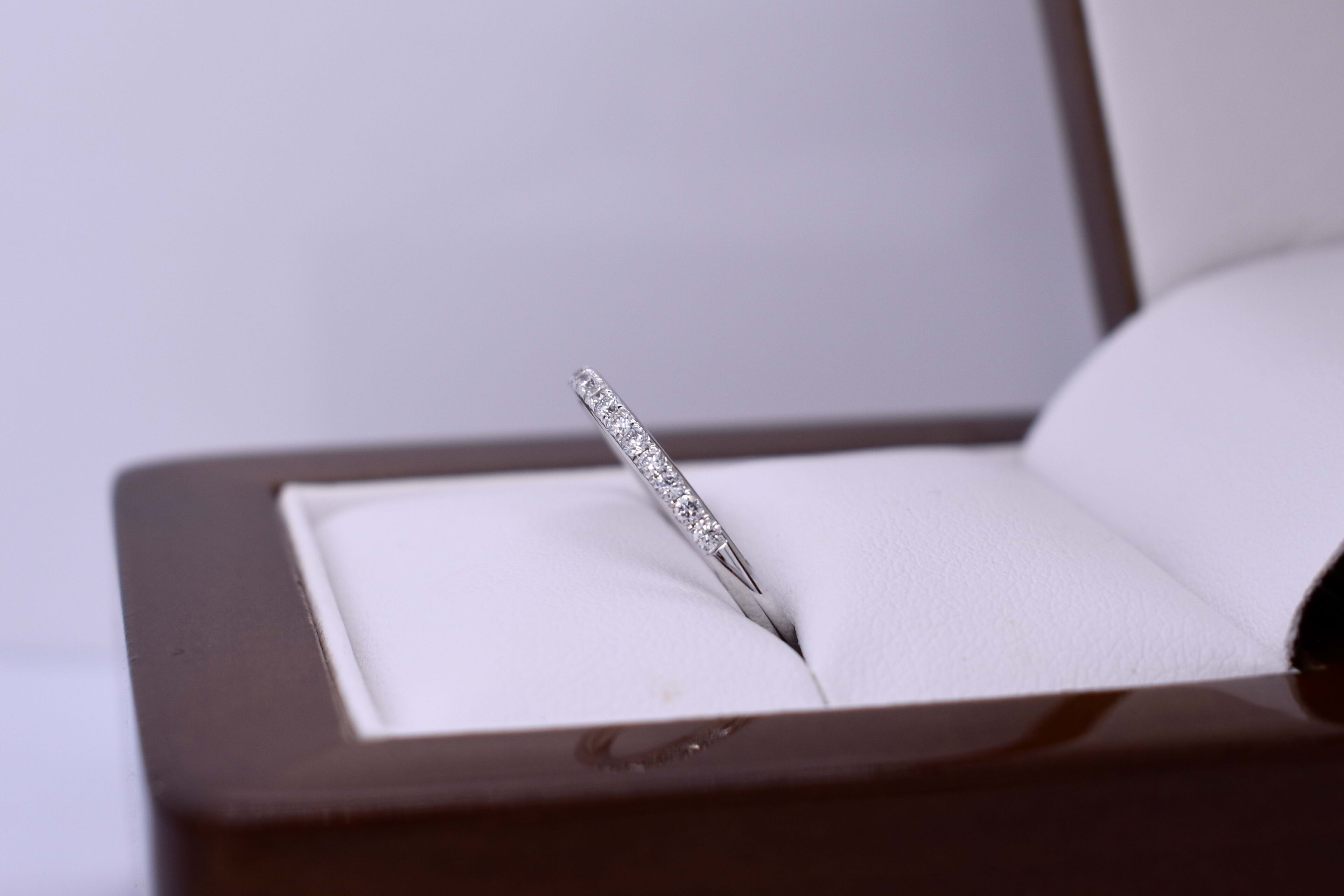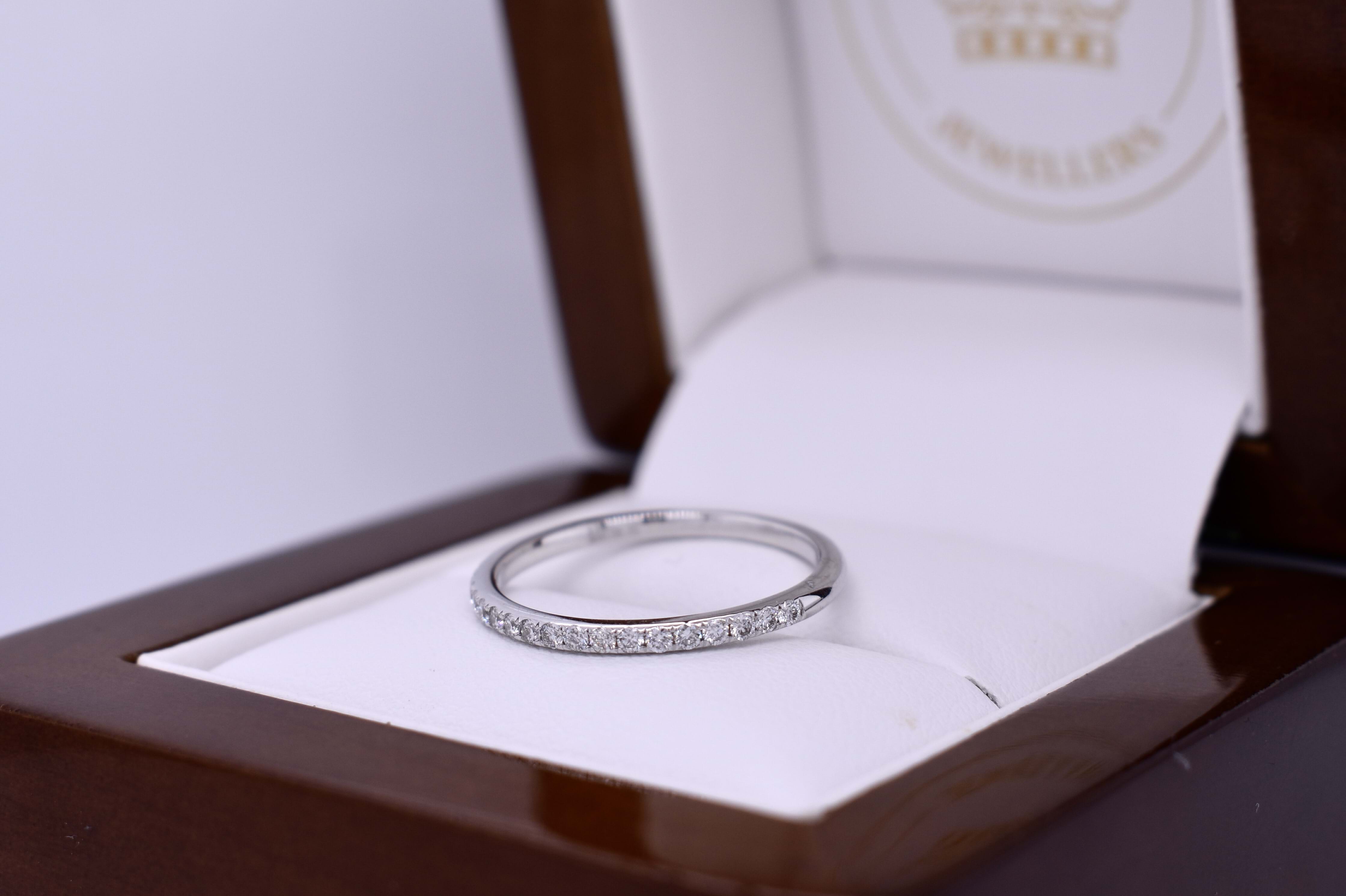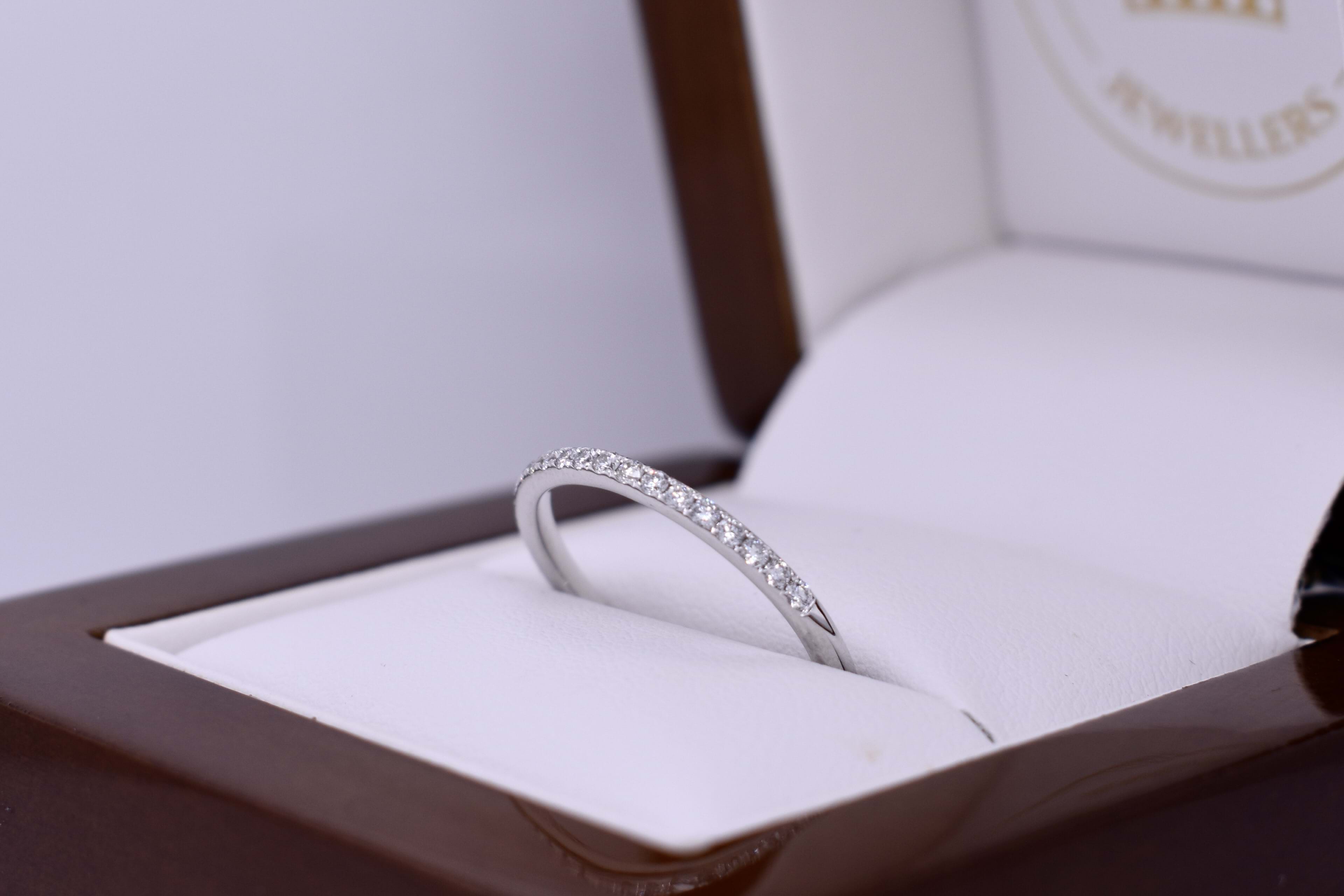 This is our signature 20 diamond wedding band, expertly crafted in 18ct white gold with grain set diamonds in a cylindrical band profile designed to look fine and delicate but with practicality at the forefront of the design. Each band contains 20 round brilliant cut diamonds equalling 0.26cts FG/VS-SI. Finger Size N. Independent valuation supplied.