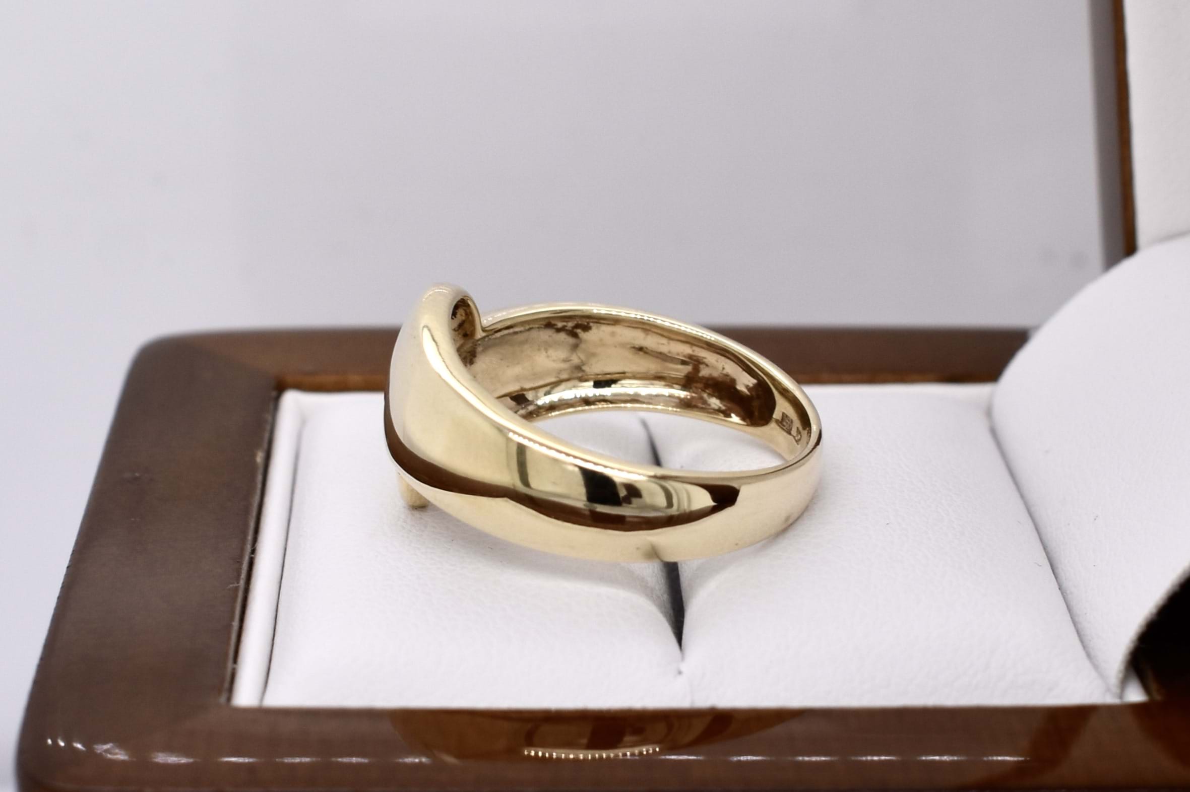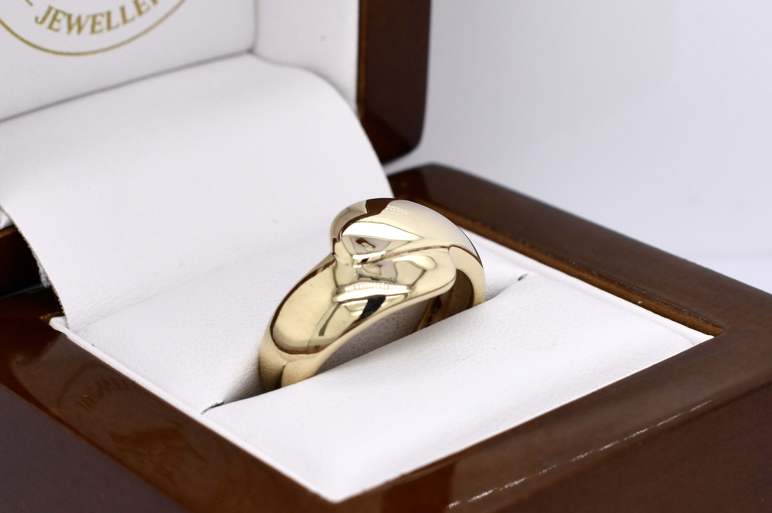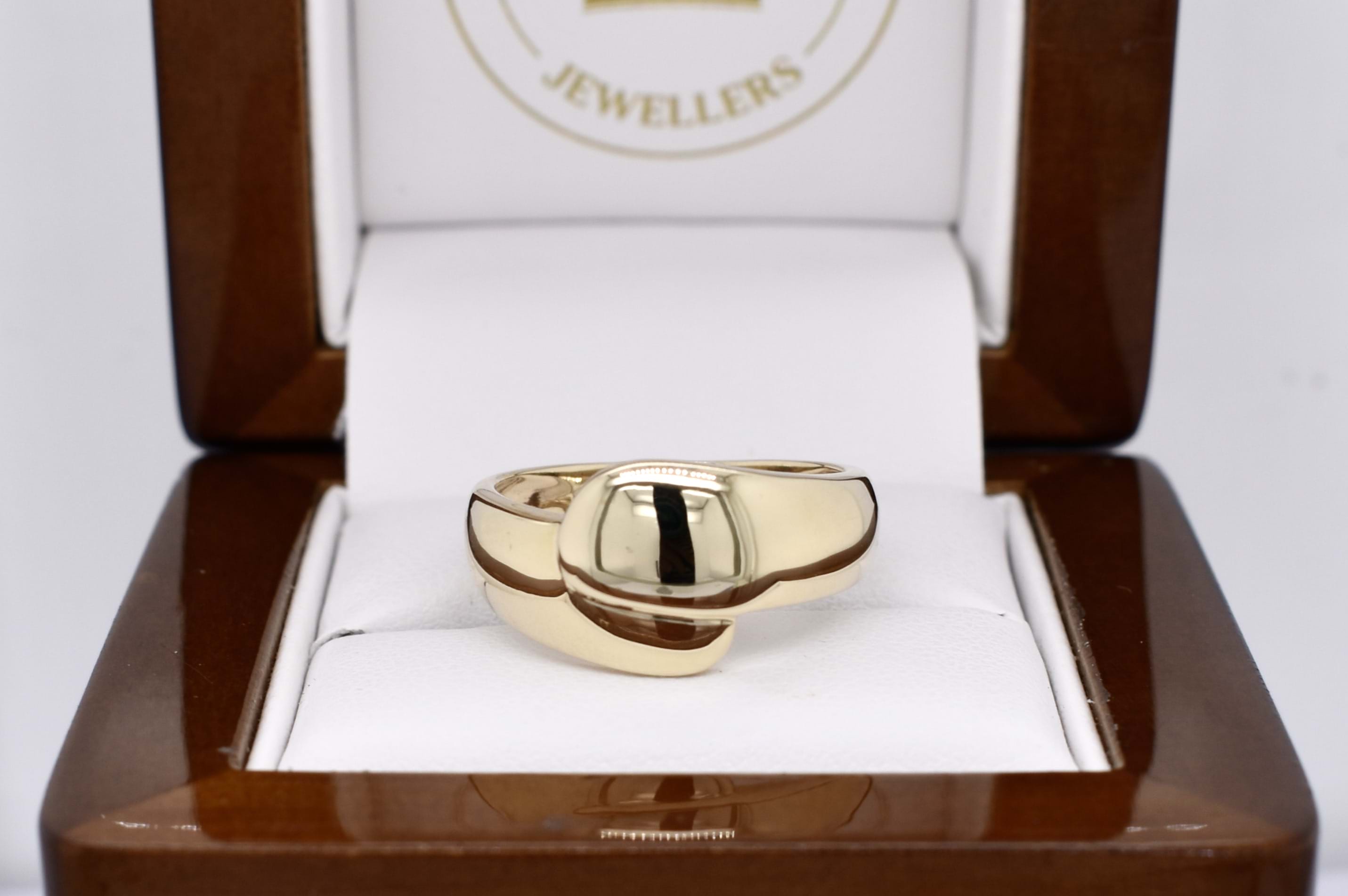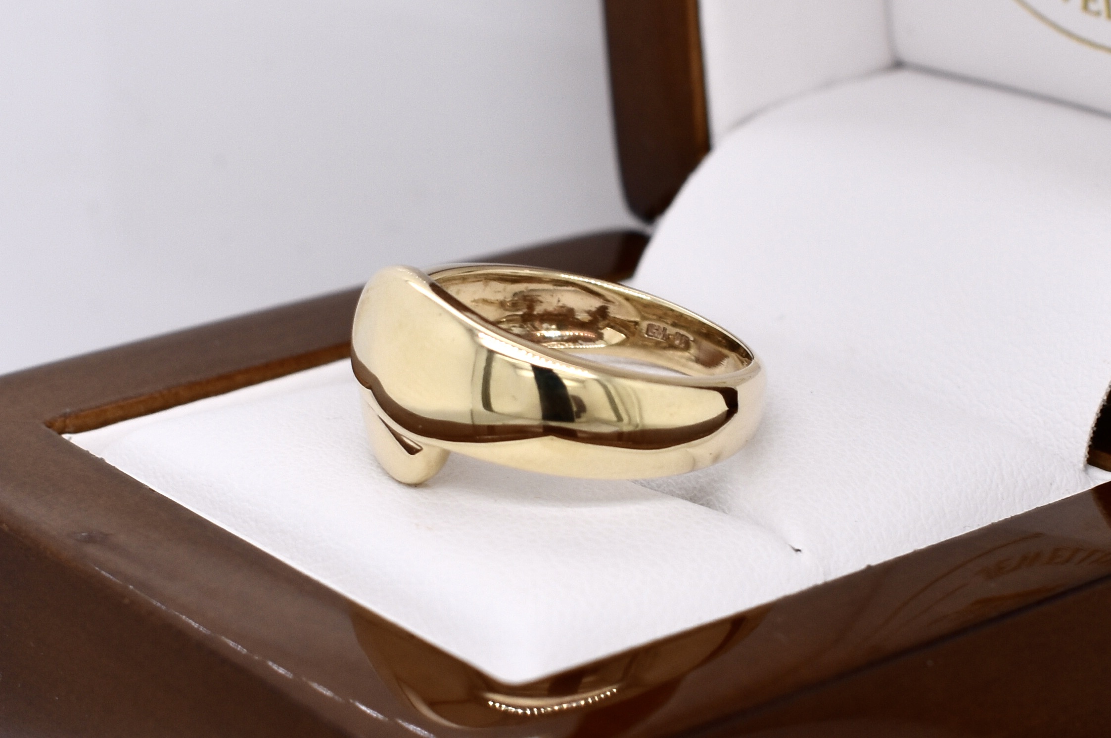 This lovely secondhand ring is crafted in 9ct yellow gold and features a wide crossover design ranging from 11.4-3.5mm wide. 4.31 grams. Finger size Q.
