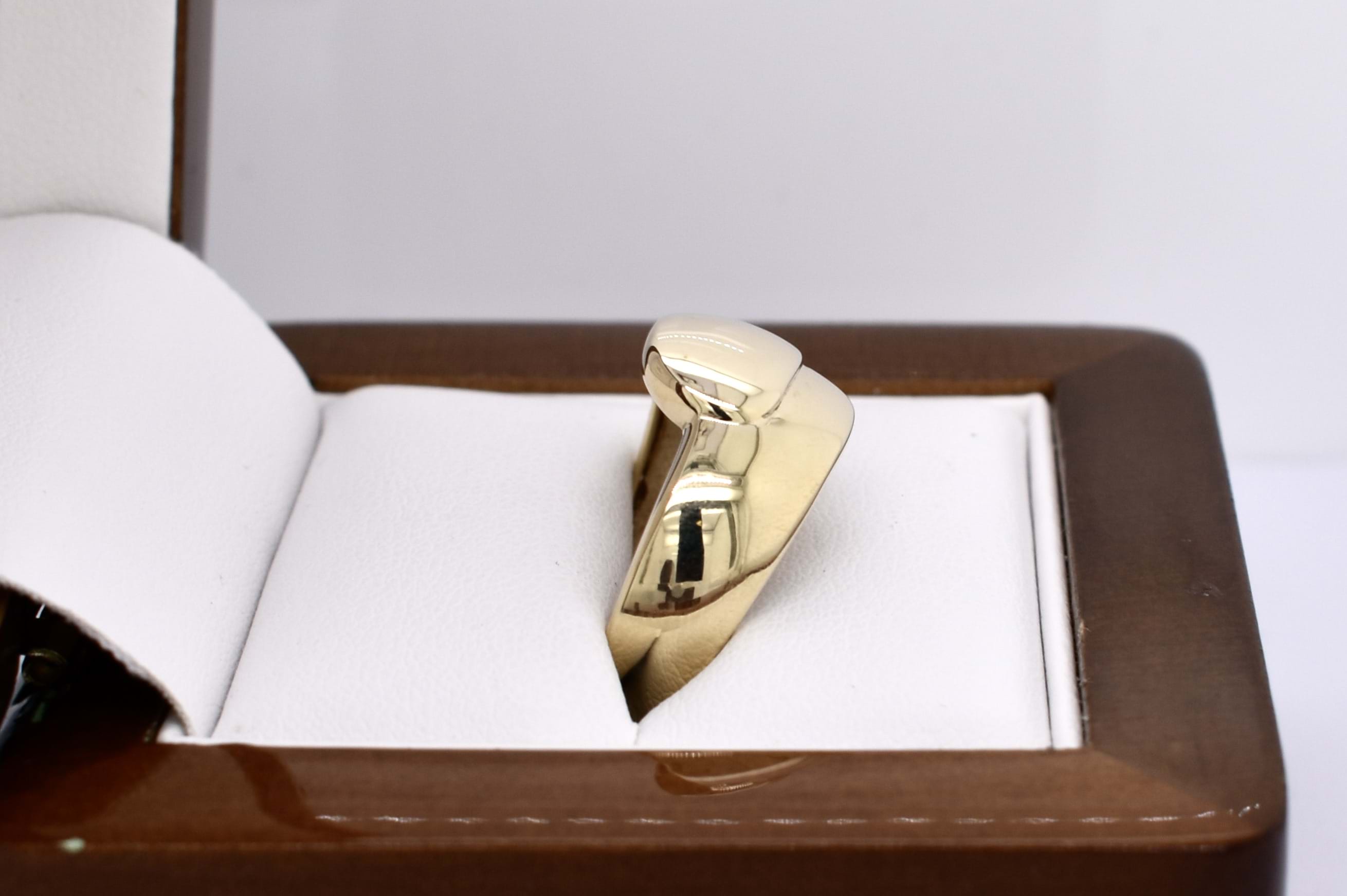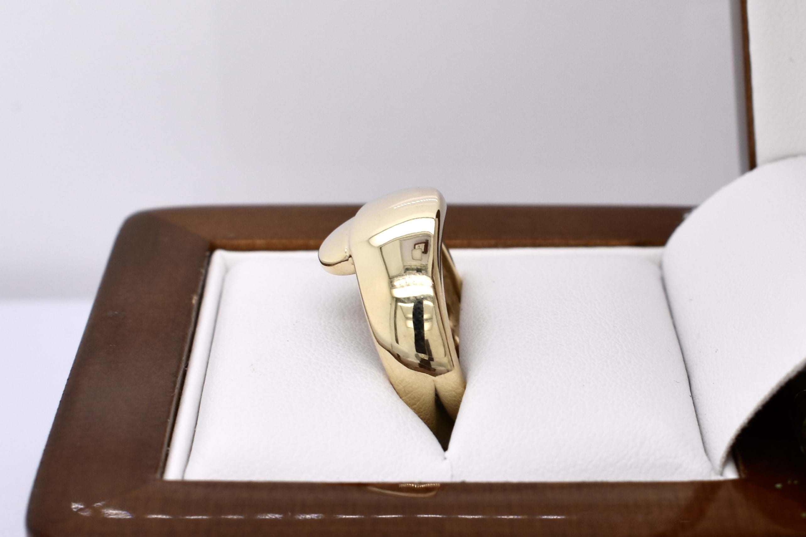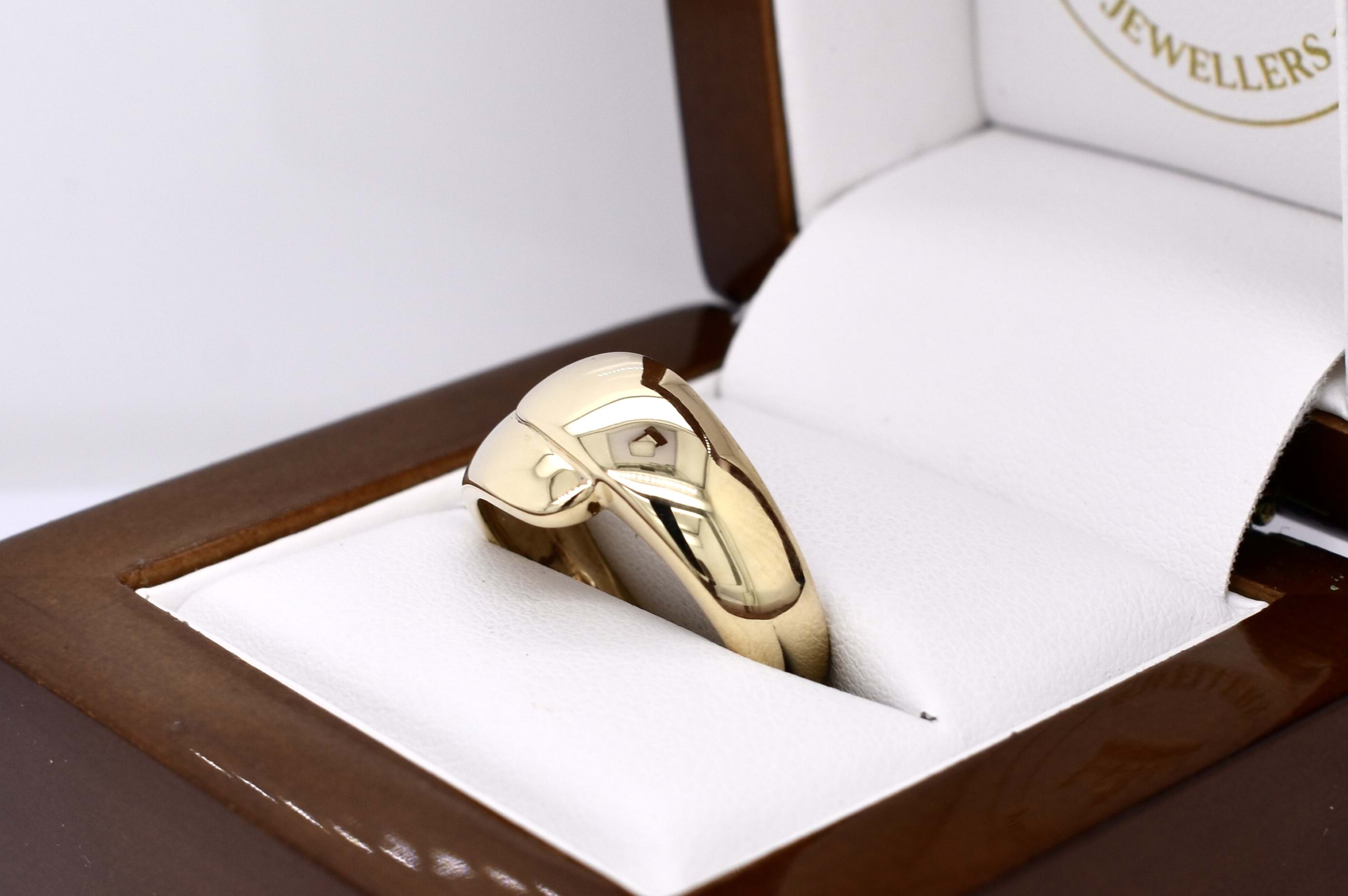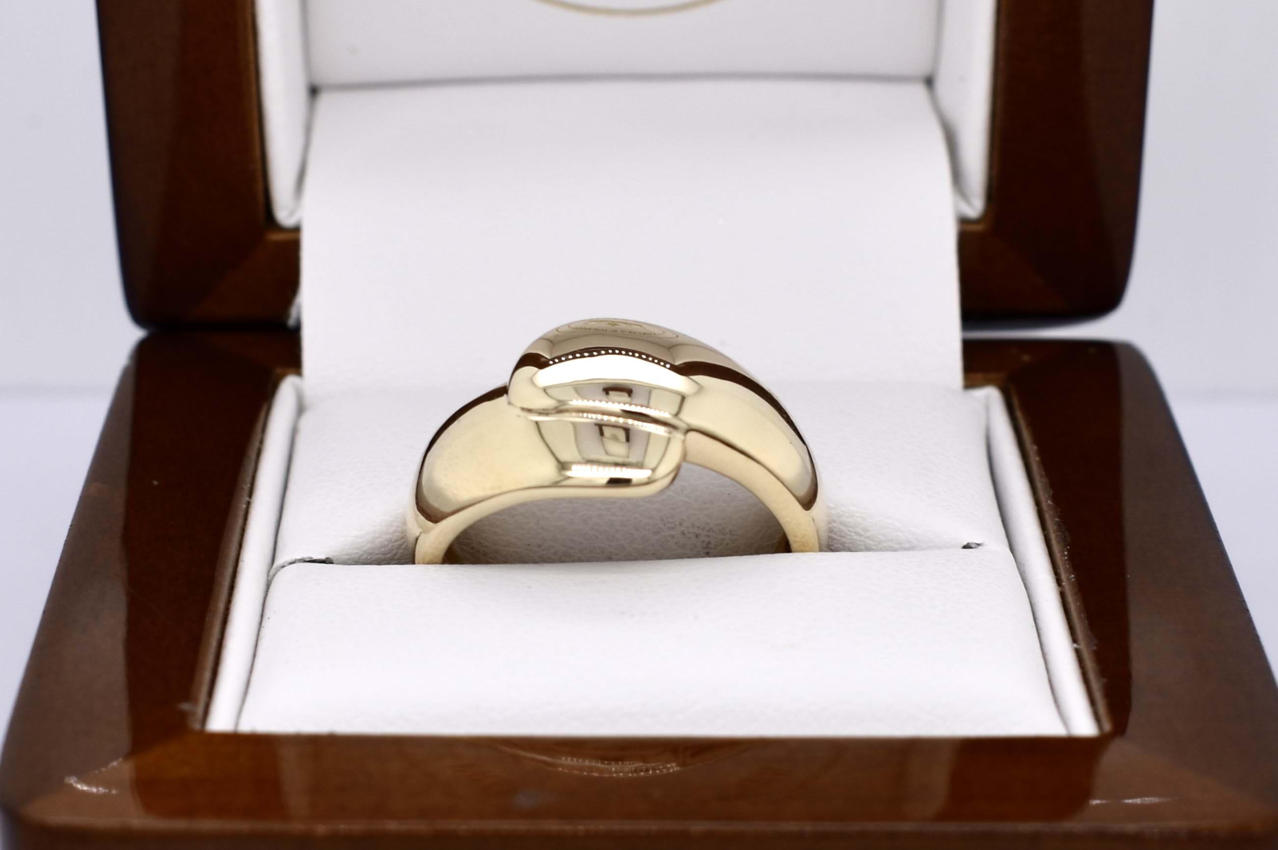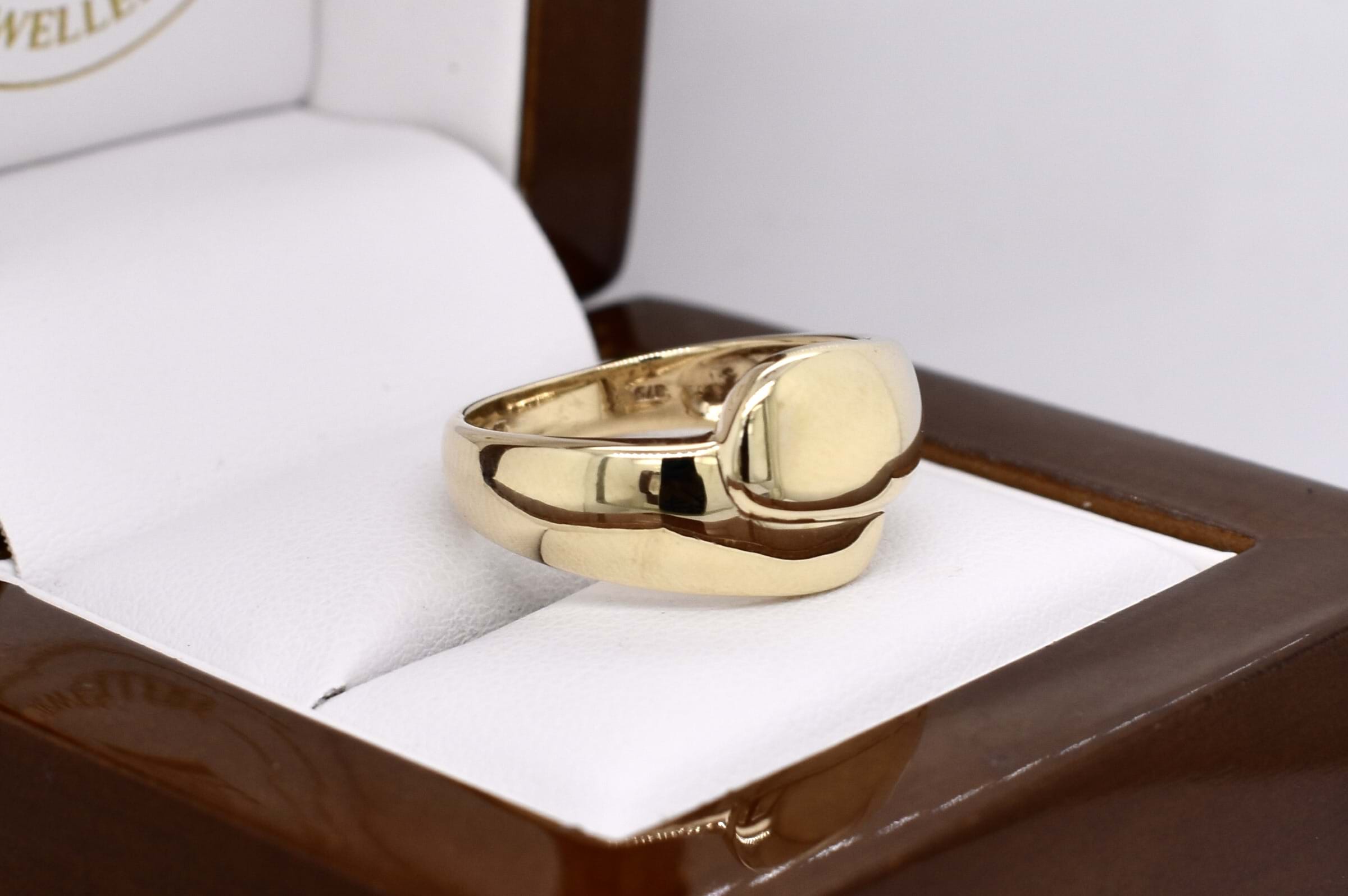 This lovely secondhand ring is crafted in 9ct yellow gold and features a wide crossover design ranging from 11.4-3.5mm wide. 4.31 grams. Finger size Q.