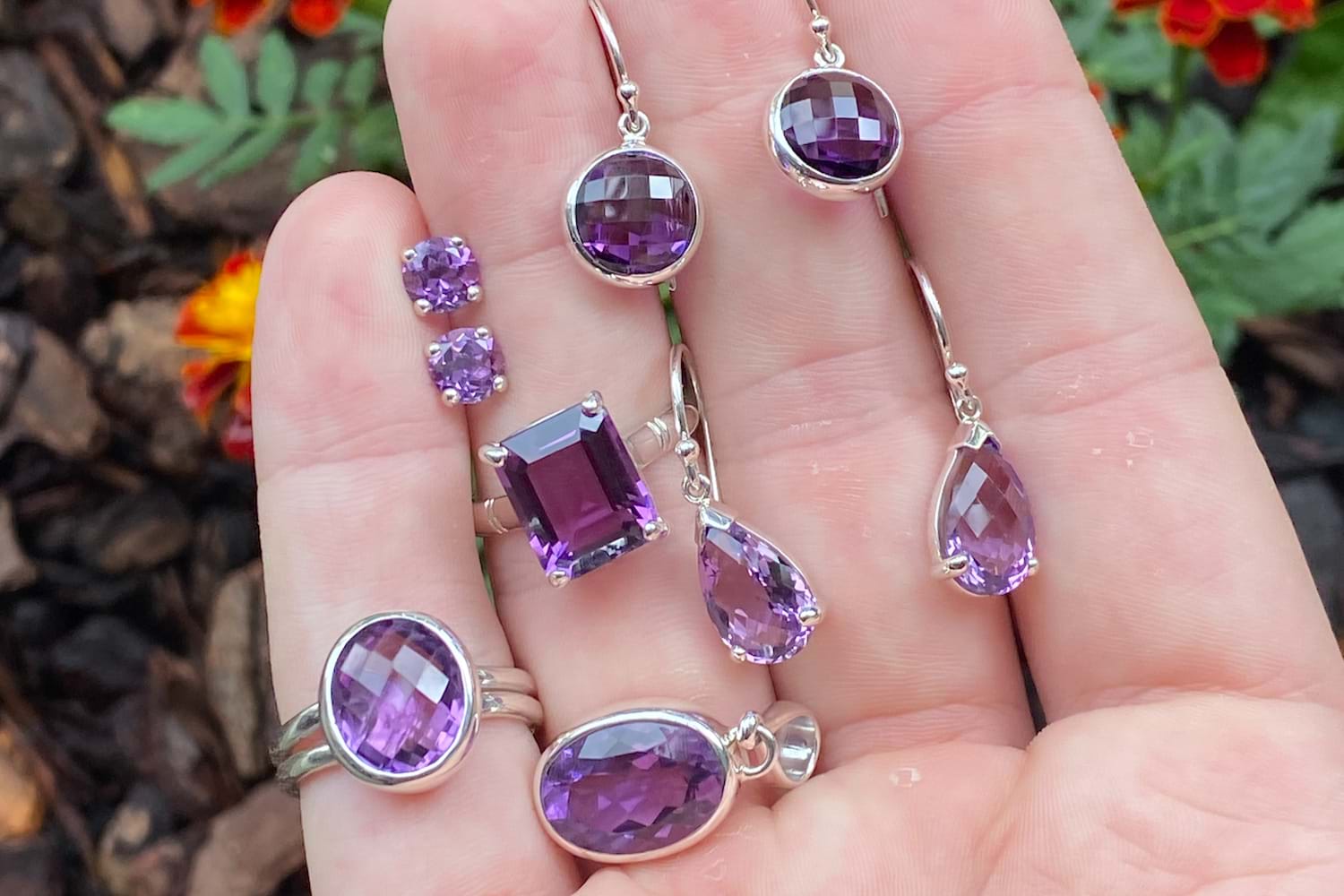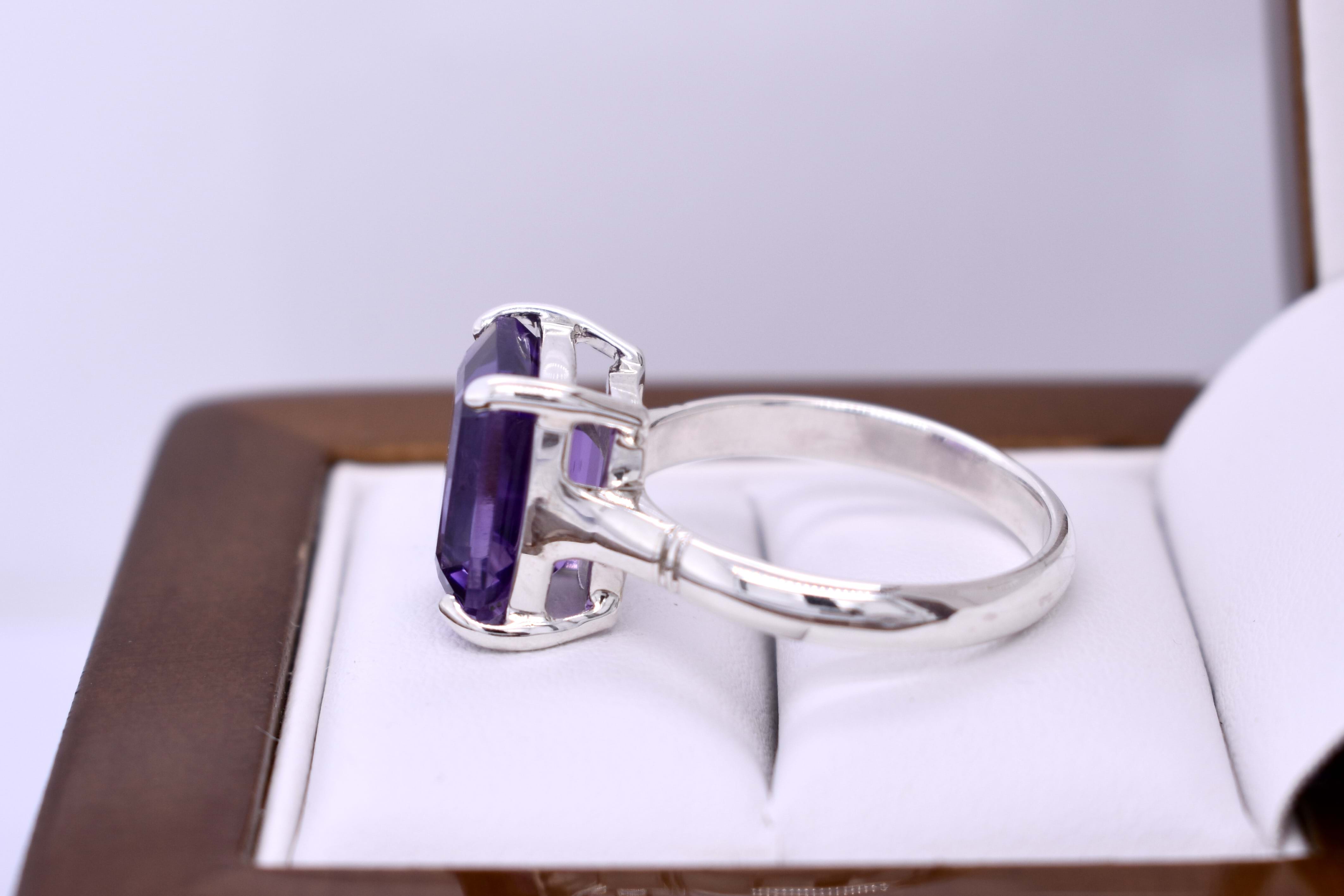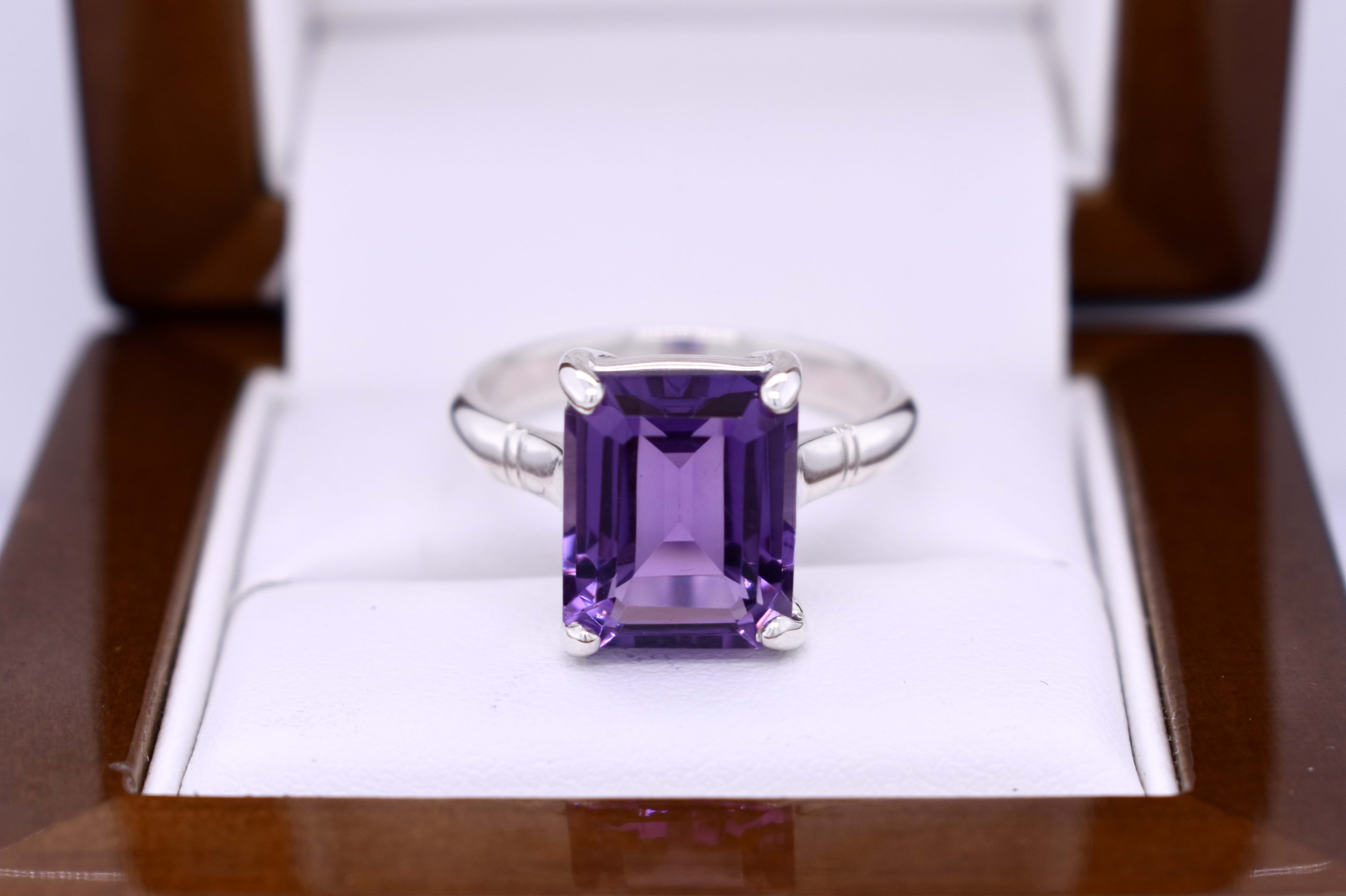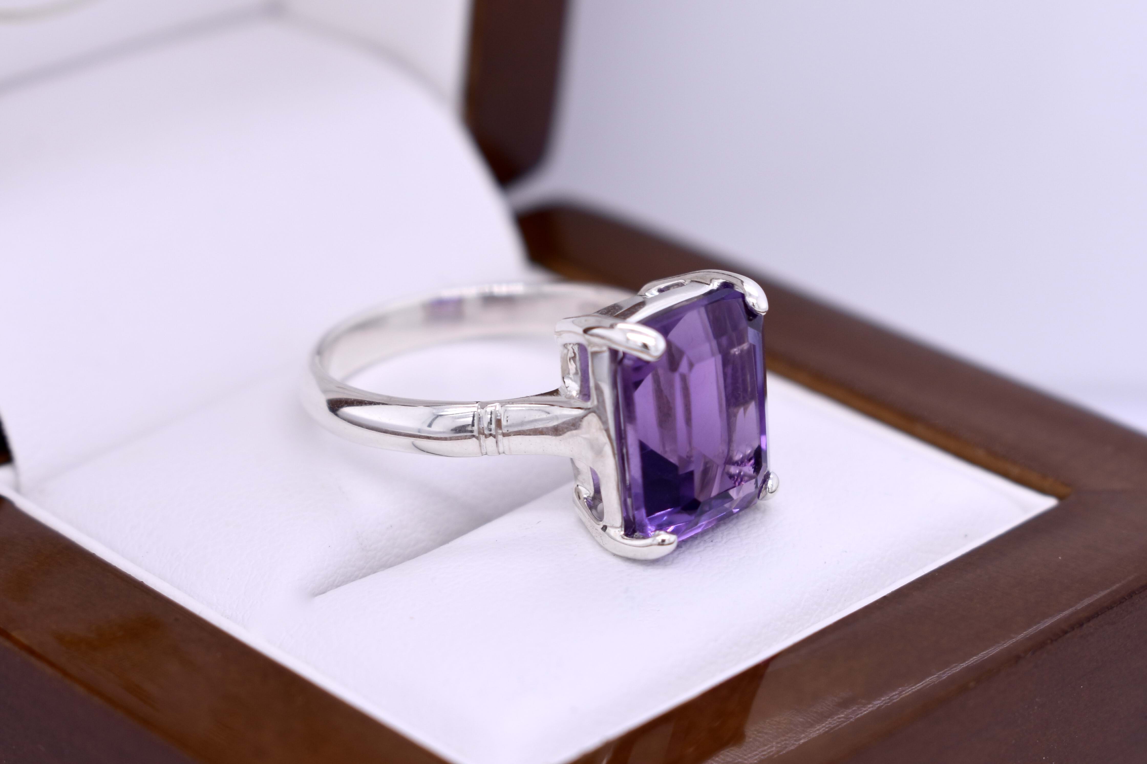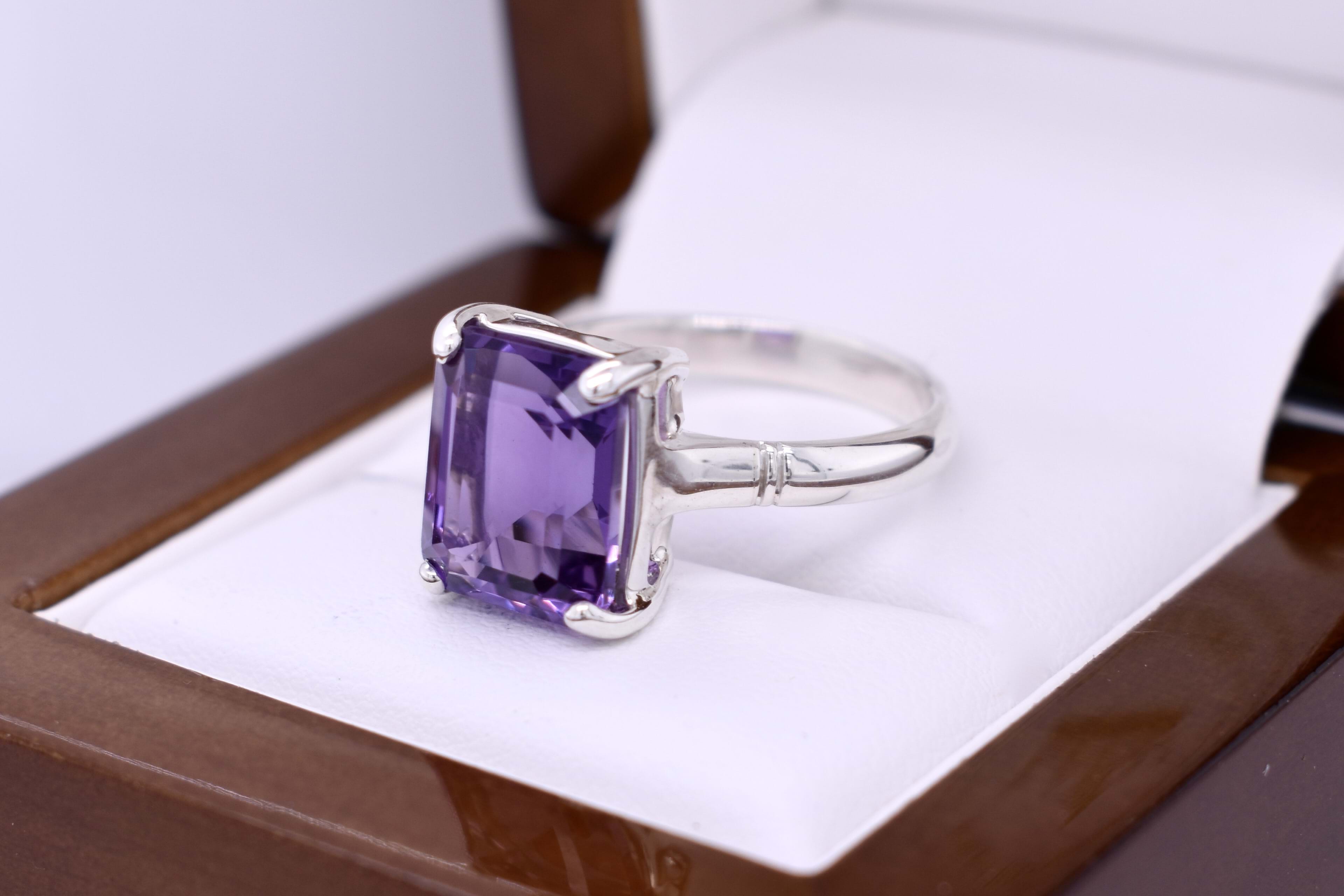 A pretty purple emerald cut amethyst ring, four claw set, in sterling silver. This handmade ring measures 12x9mm and is completed with a plain silver band. Finger size Q+.