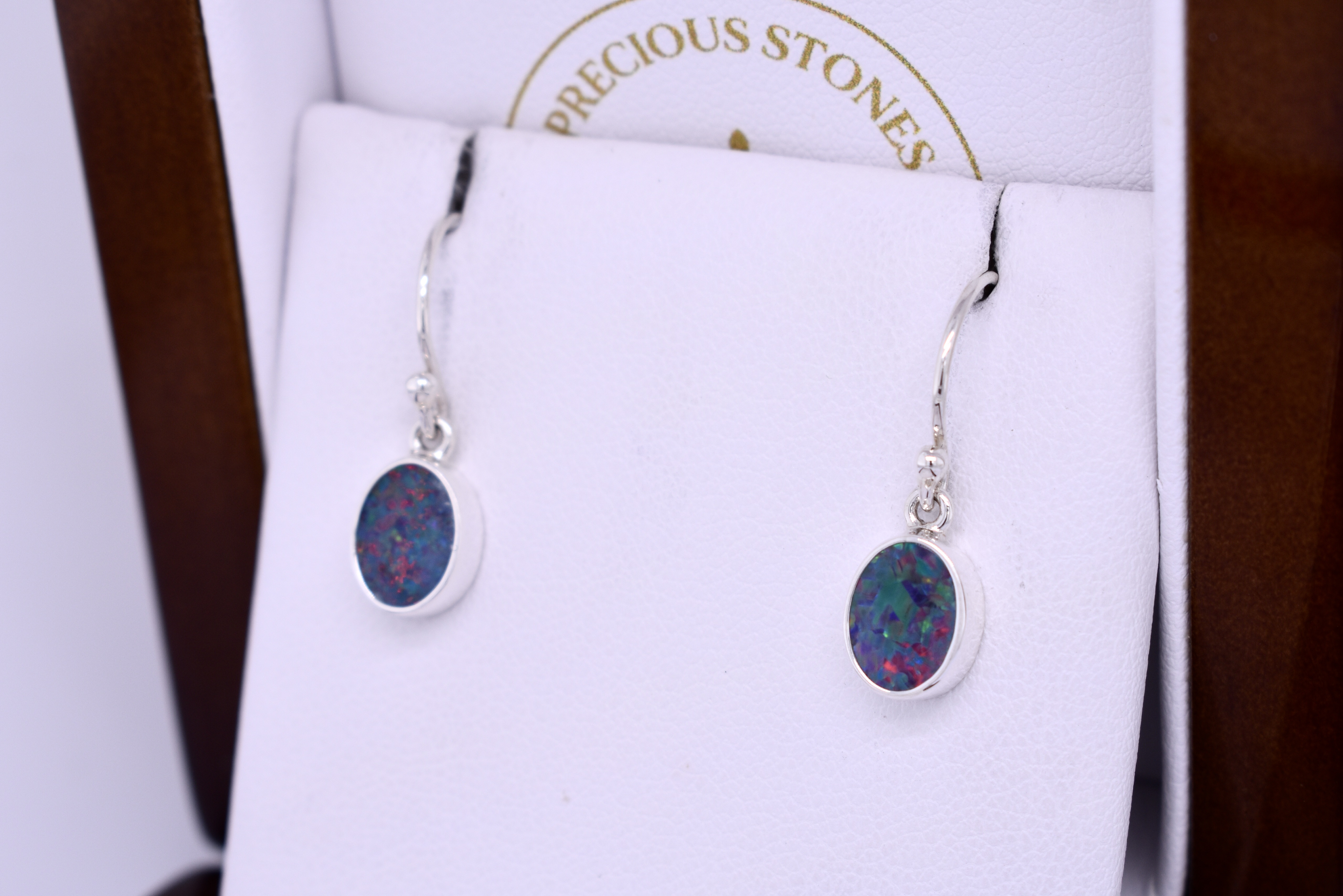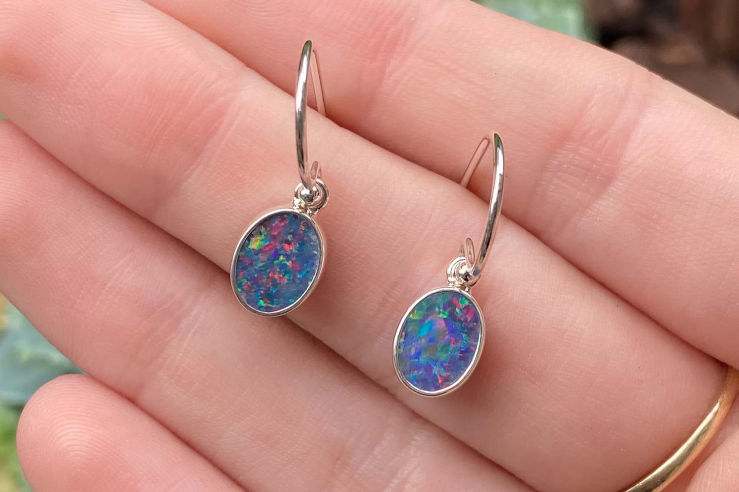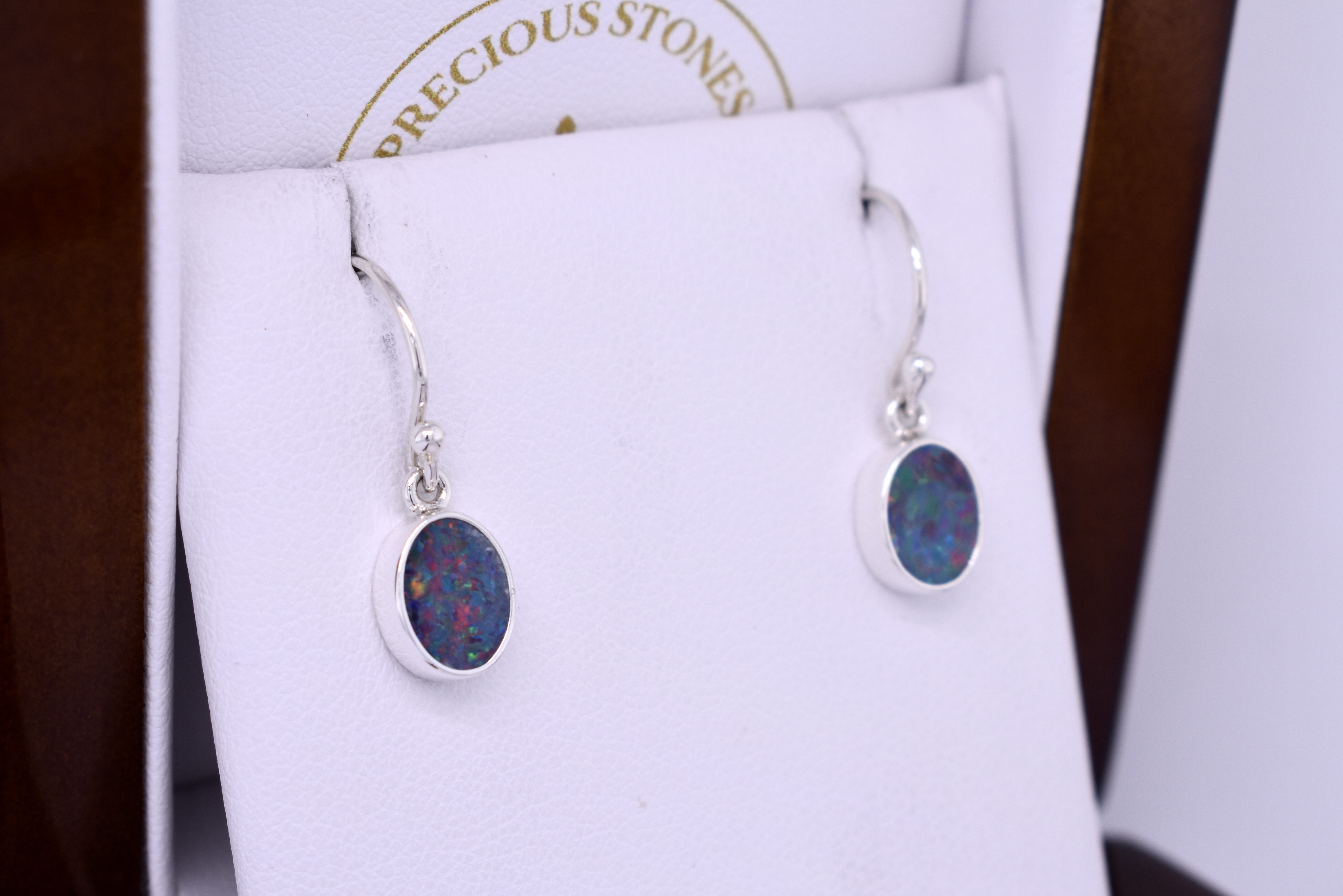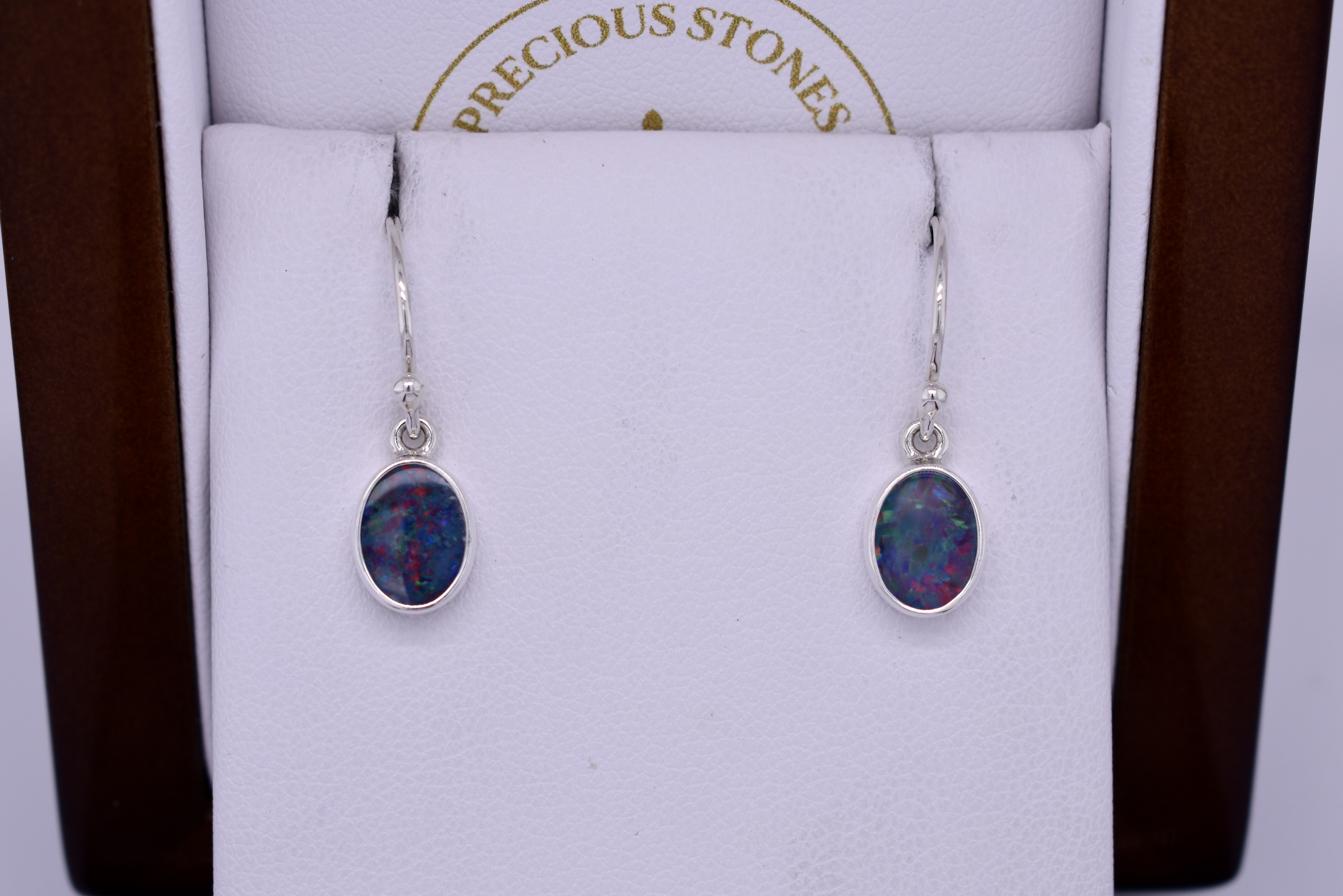 This classic and colourful pair of handmade oval drops, featuring approx. 9.0x7.2mm Coober Pedy opal doublets. The doublet consisting of Coober Pedy opal (on top) with a boulder opal backing. These opals are blue with pretty flashes of red and green throughout. They are bezel set in sterling silver with shepherd hook fittings.