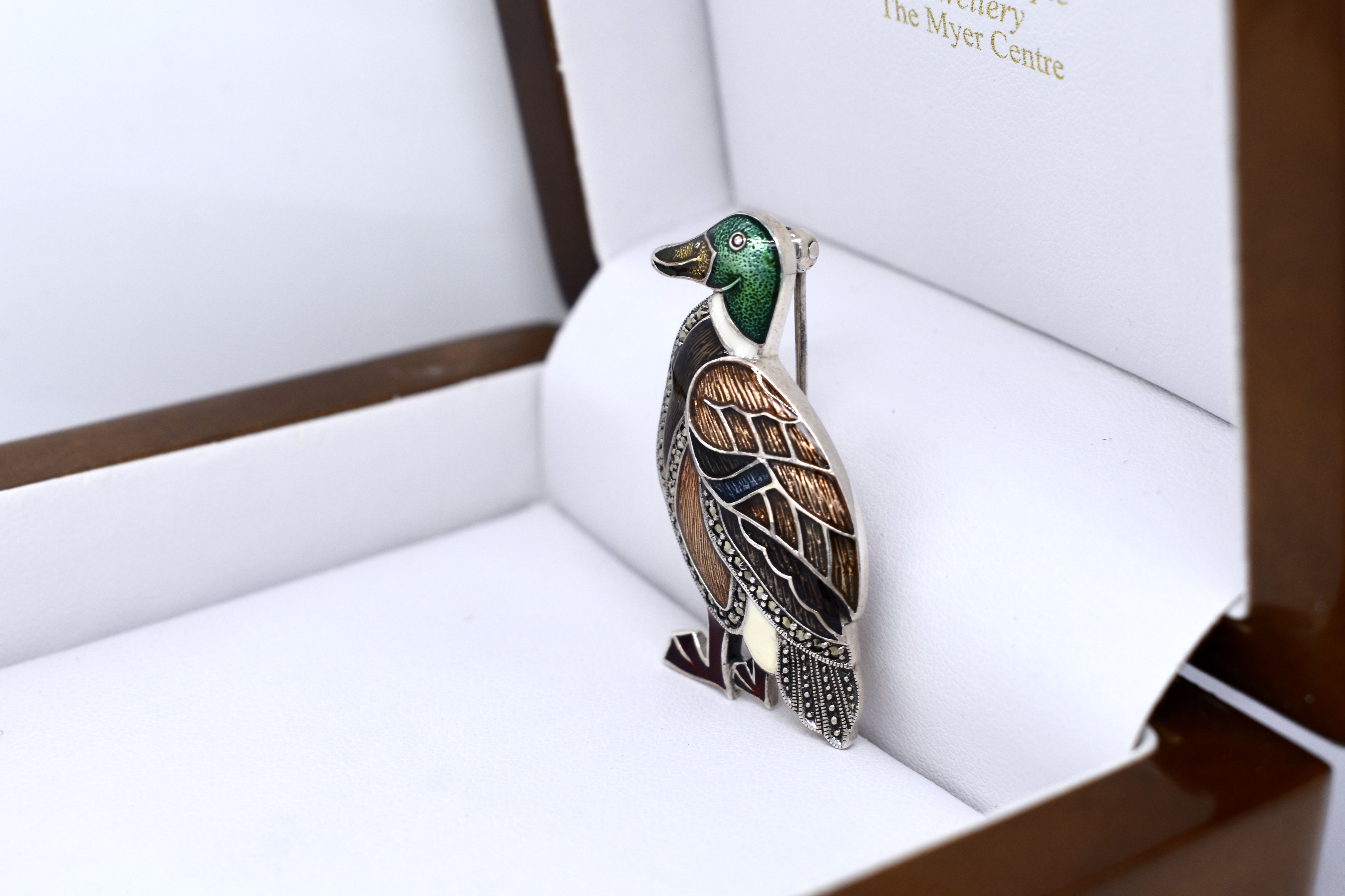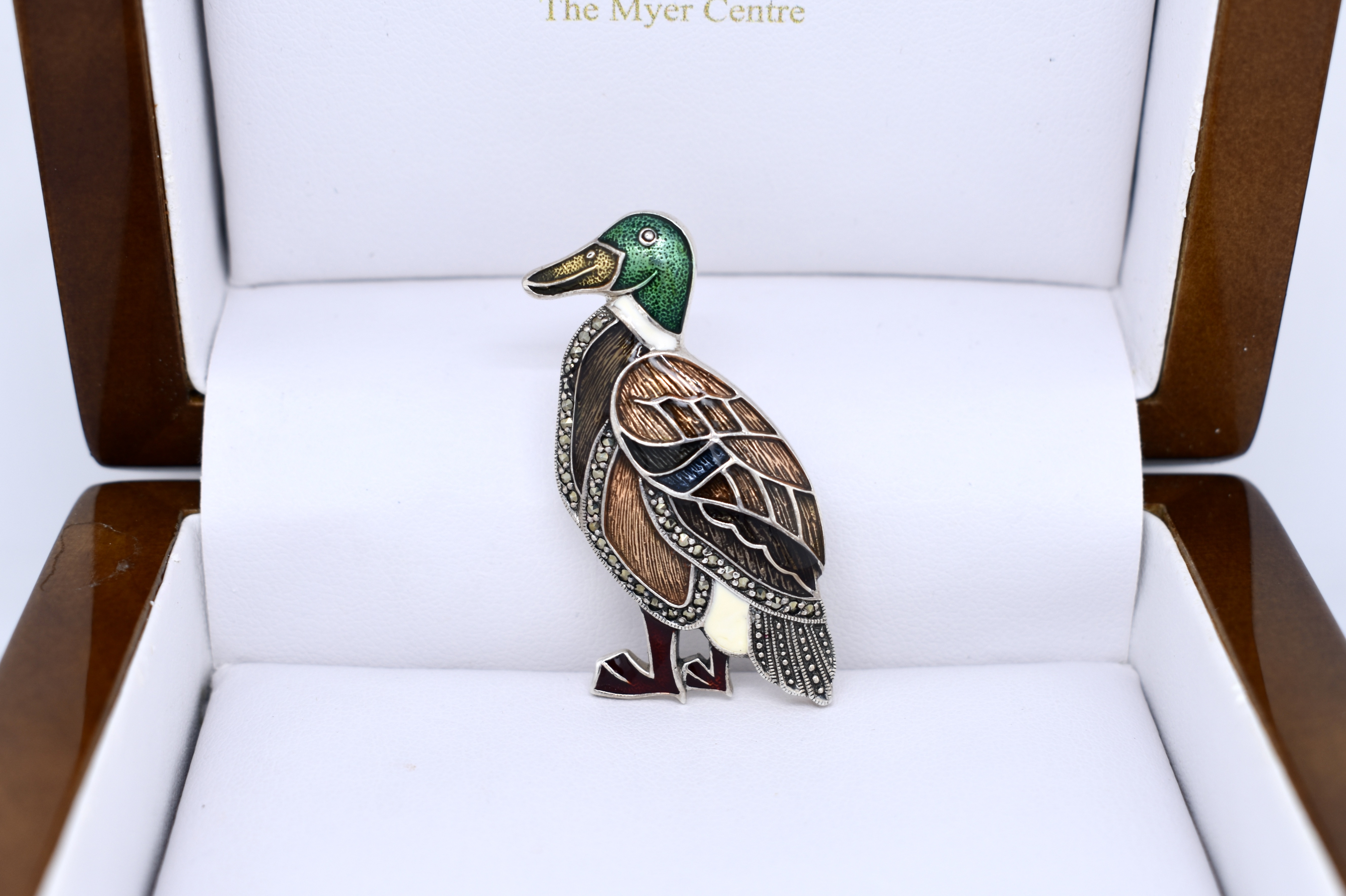 The cutest sterling silver duck shaped brooch, with coloured enamel detailing and marcasites.