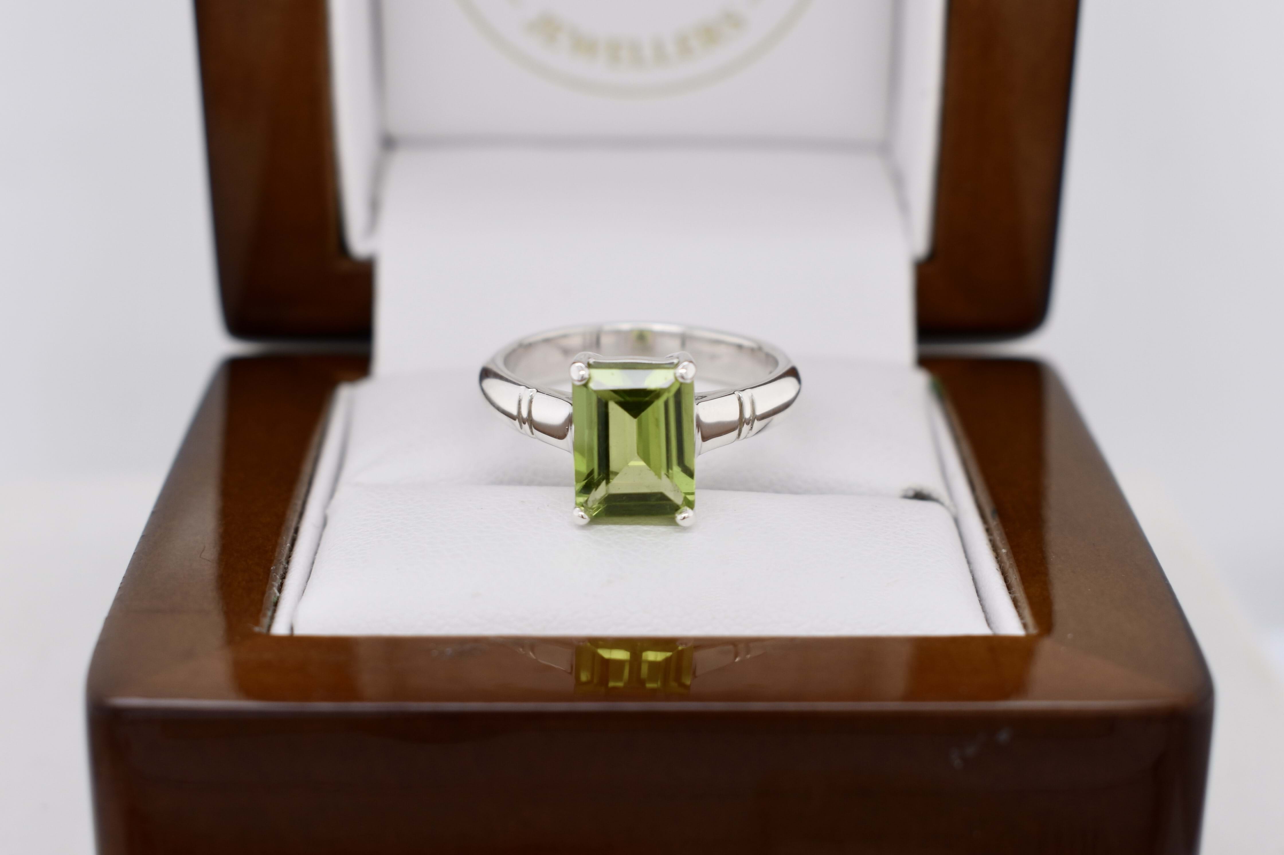 Gorgeous in green, this emerald cut peridot ring, four claw set, in sterling silver. This handmade ring measures 9x7mm and is completed with a grooved silver band. Finger size N+.