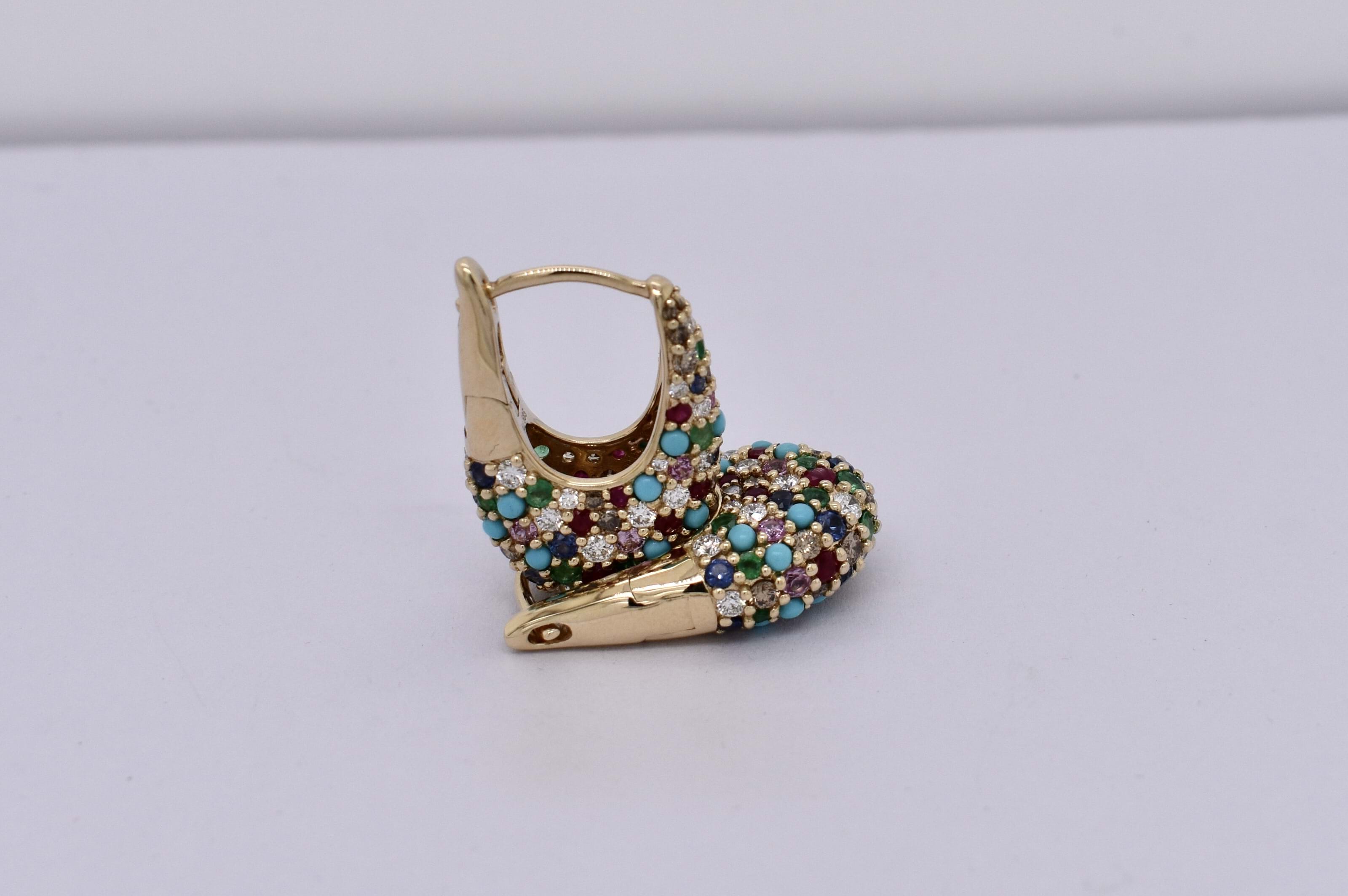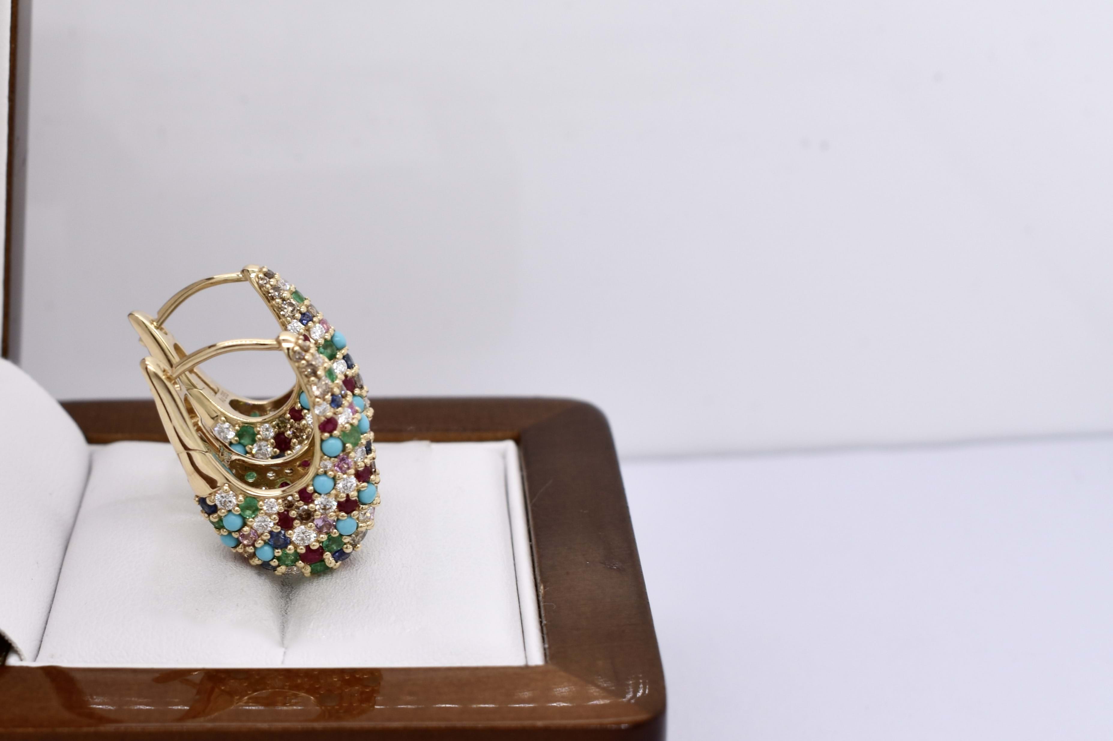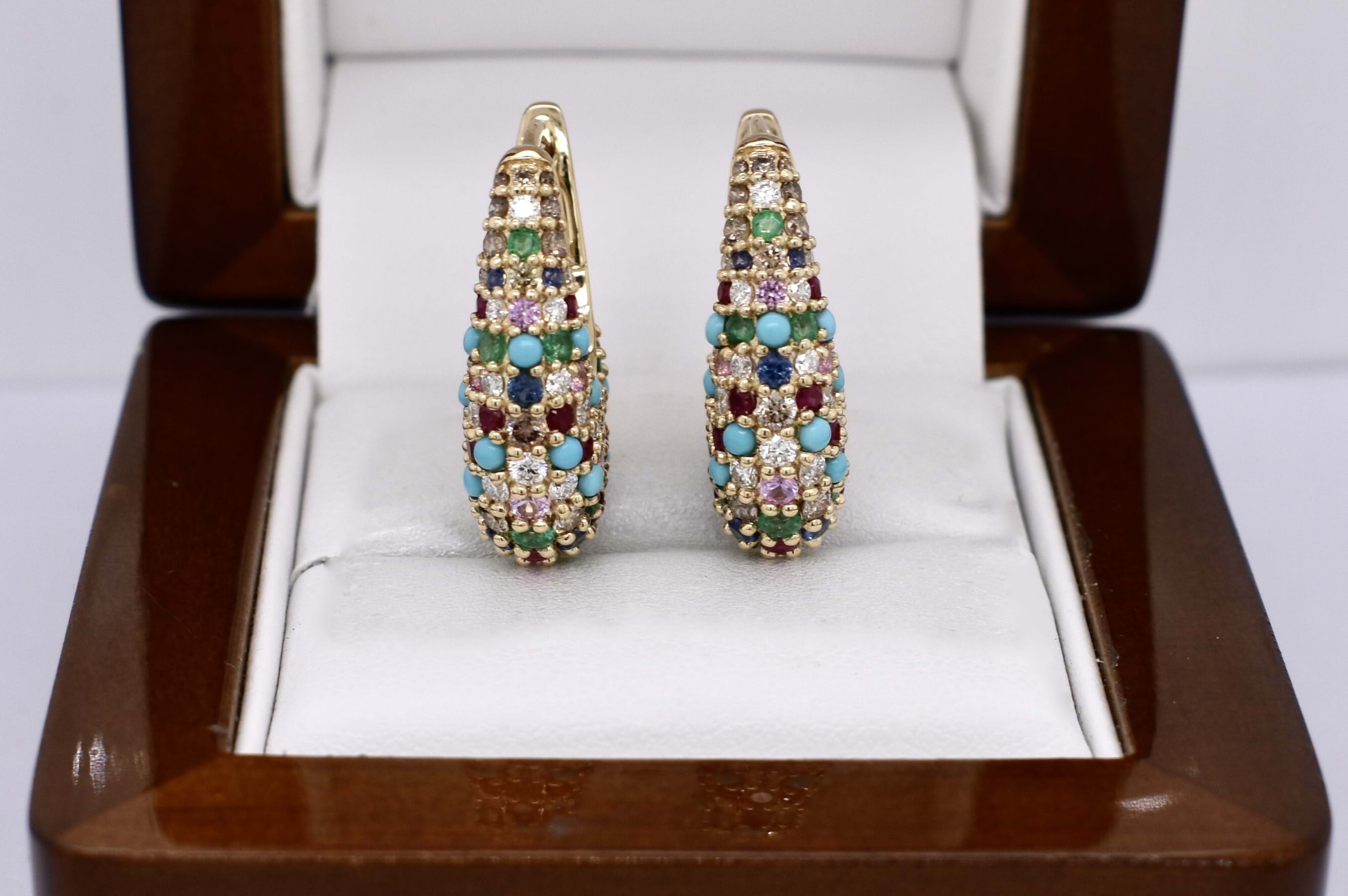 Fabulous and striking! These totally gorgeous earrings were custom made for our client in 14ct yellow gold and are a stylish tapered puff style huggie. The earrings are entirely pave set with a mixture of turquoise, pink (0.49ct) & blue (0.74ct) sapphires, white (1.02ct) - light brown (0.86ct)diamonds, emeralds (0.84ct) and rubies (0.79ct). Available to order in 14ct or 18ct yellow/white/rose gold. Independent Valuation Supplied.