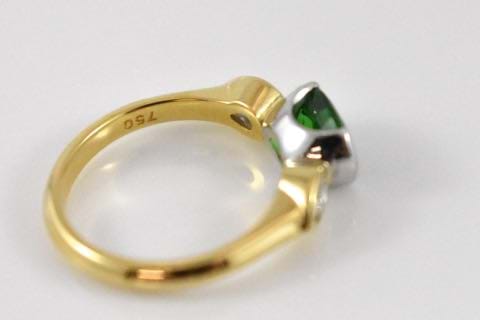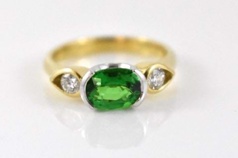 This stunning and vivid 1.07ct green Tsavorite garnet was hand sleected in store and semi-bezel set into 18ct white gold with a gorgeous open gallery to showcase the stones intense colour and brightness to its full potential. The garnet is flanked on each side by a 0.10ct round brilliant cut diamond in a pear shape bezel in an 18ct yellow gold shank, making this ring a surprisingly simple yet unusual design. Independent Valuation Supplied. If you are inspired by this archived design contact us today to discuss how we can create something incredible for you or your loved one