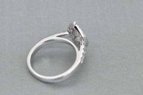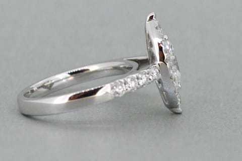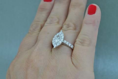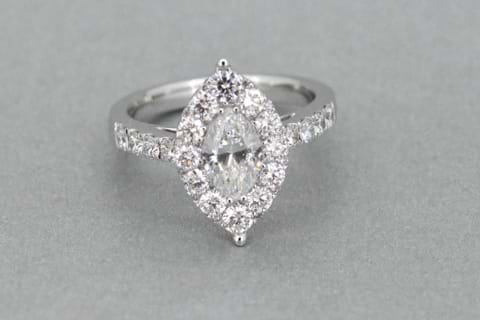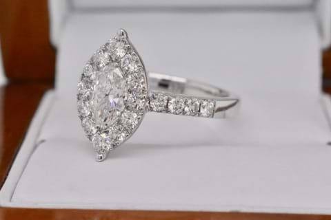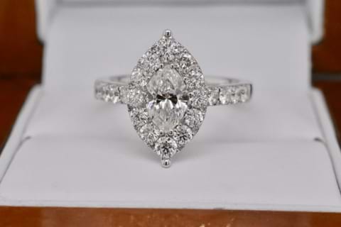 This stunning 1.01ct GIA certified E colour, VS2, marquise shape diamond has been set into a custom designed halo ring in 18ct white gold. It is surrounded by a halo of 36 scintilating round brilliant cut diamonds with a further six going down the shoulder. This intensely sparkly ring gives the illusion of a much larger single marquise diamond. The halo and shoulder diamonds in this piece are comprised of 44, high white, round brilliant cut diamonds totalling 1.12cts (FG/VS). The dream engagement ring for a girl who loves sparkle! Independent Valuation & GIA cert supplied