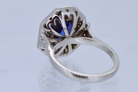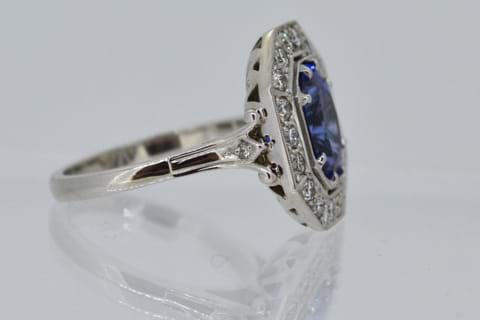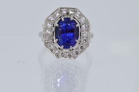 A beautiful 3.72ct Tanzanite chosen loose by its current owner and set into this bespoke, Art Deco inspired, 18ct white gold ring and complimented by 20 round brilliant cut diamonds grain set into an octagonal halo totalling 0.70cts. Independent Valuation Supplied. If you are inspired by this archived design contact us today to discuss how we can creat something incredible for you or your loved one.