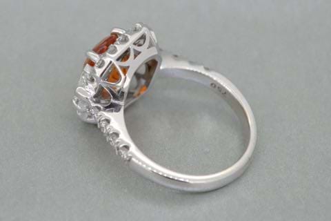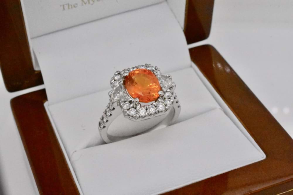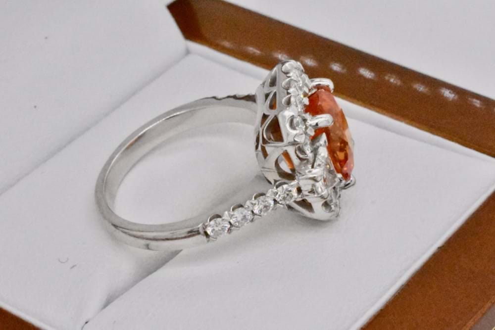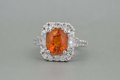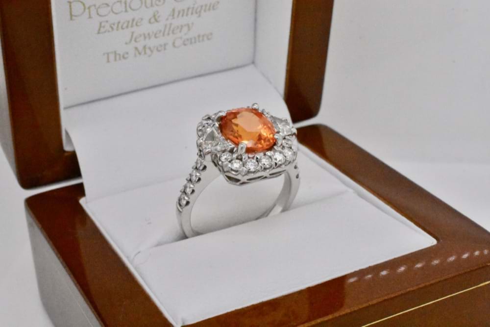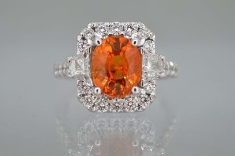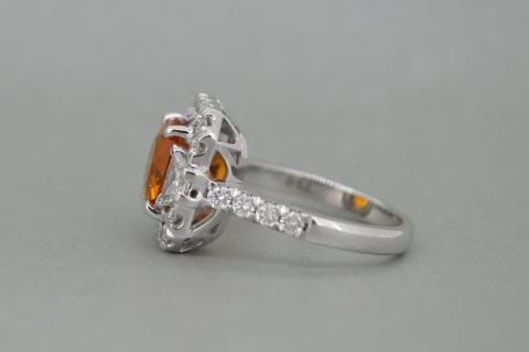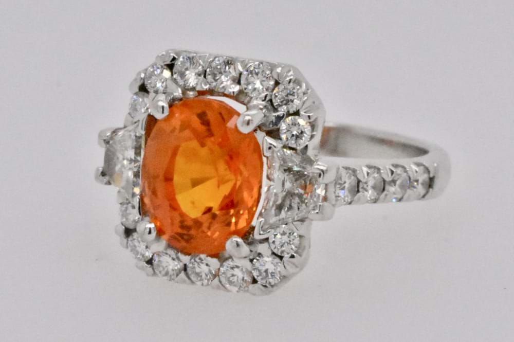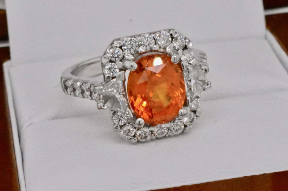 This exquisite, heated but untreated, 4.09ct Fanta orange Ceylon sapphire was hand selected in store and has been rightfully celebrated in a bespoke design ring. A rare and valuable find this spectacular stone has been four claw set into the centre of this gorgeous ring. Expertly crafted in our workshop in 18ct white gold, with a halo of 14, high pedigree white, round brilliant cut diamonds and two trapezoid diamonds flowing down to a shoulder of four more diamonds. With a total diamond content of 1.37cts and complete with an independent valuation and GSL certificate this piece is being enjoyed by its current owner.
