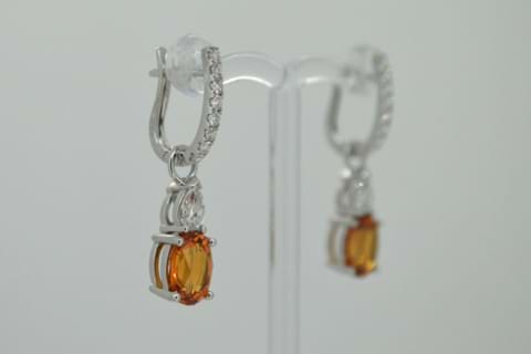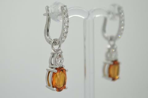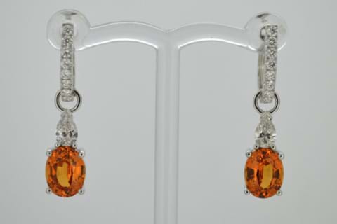 This pair of 18ct white gold earring enhancers were designed in store by our senior design consultant alongside their equally fabulous owner. Each earring enhancer features a vivid orange mandarin garnet suspended from the base of a glistening, high white, pearshape diamond and can be taken on and off diamond huggies. These spessartite garnets total 4.94cts and the diamonds 0.63cts. Independent Valuation Supplied.