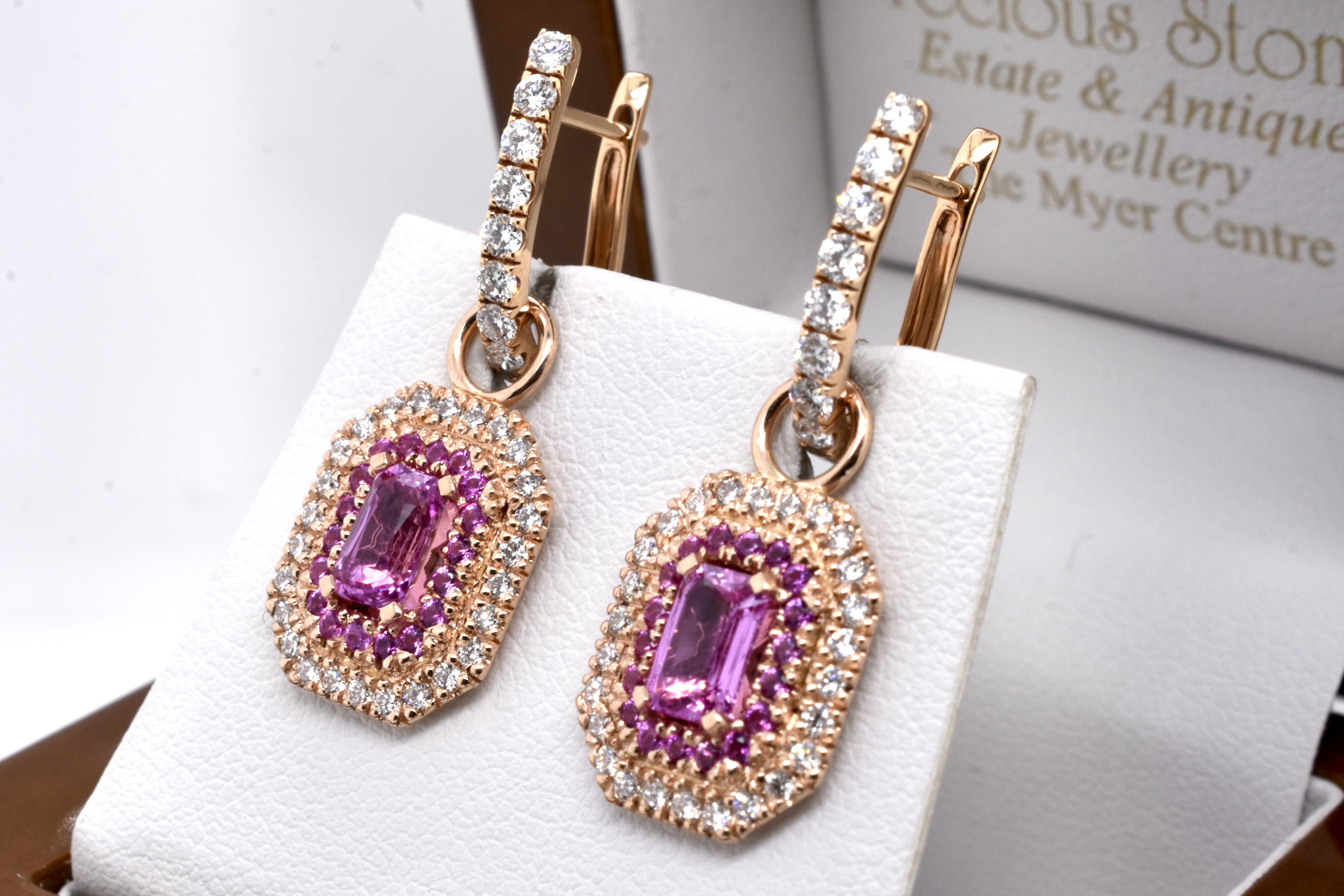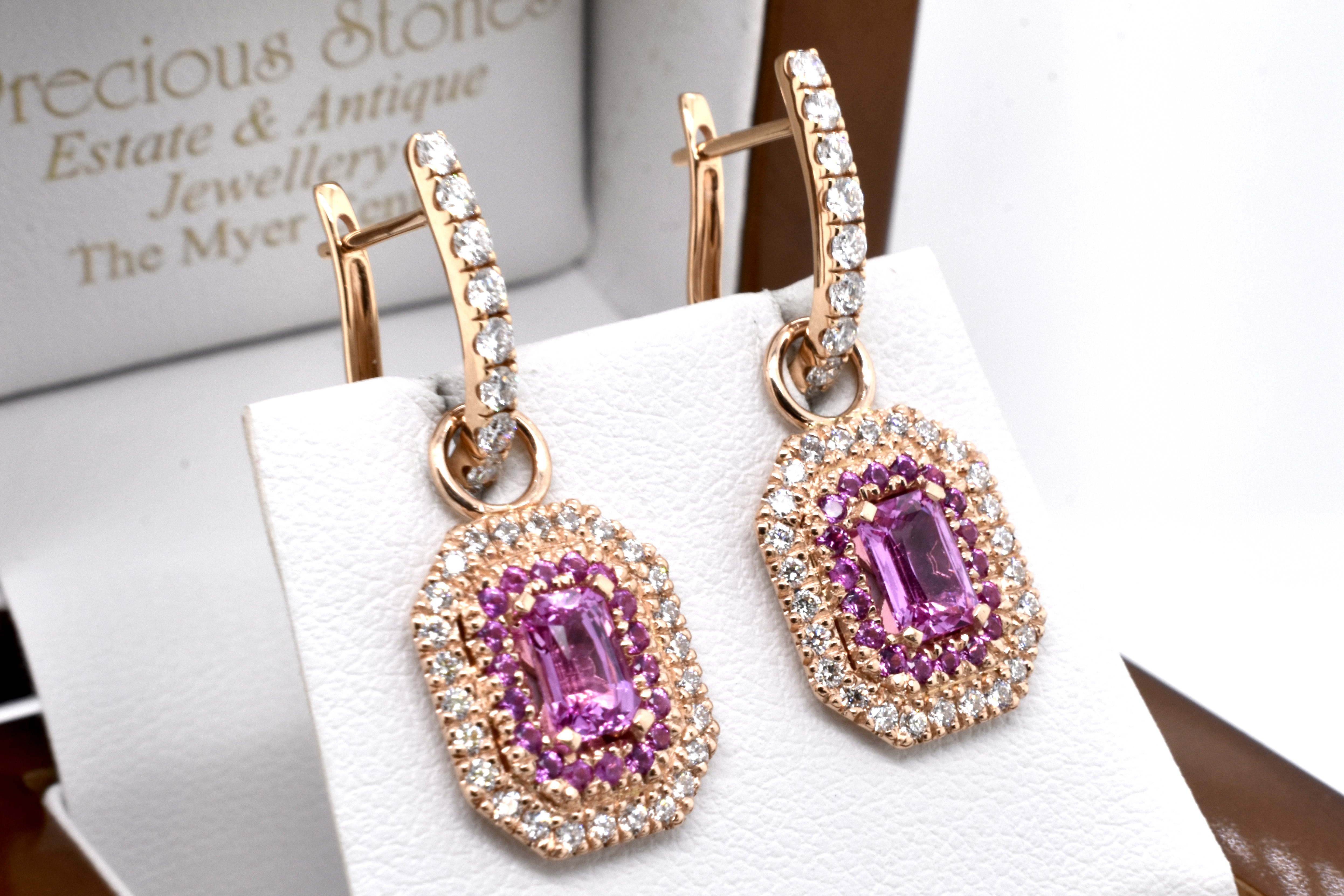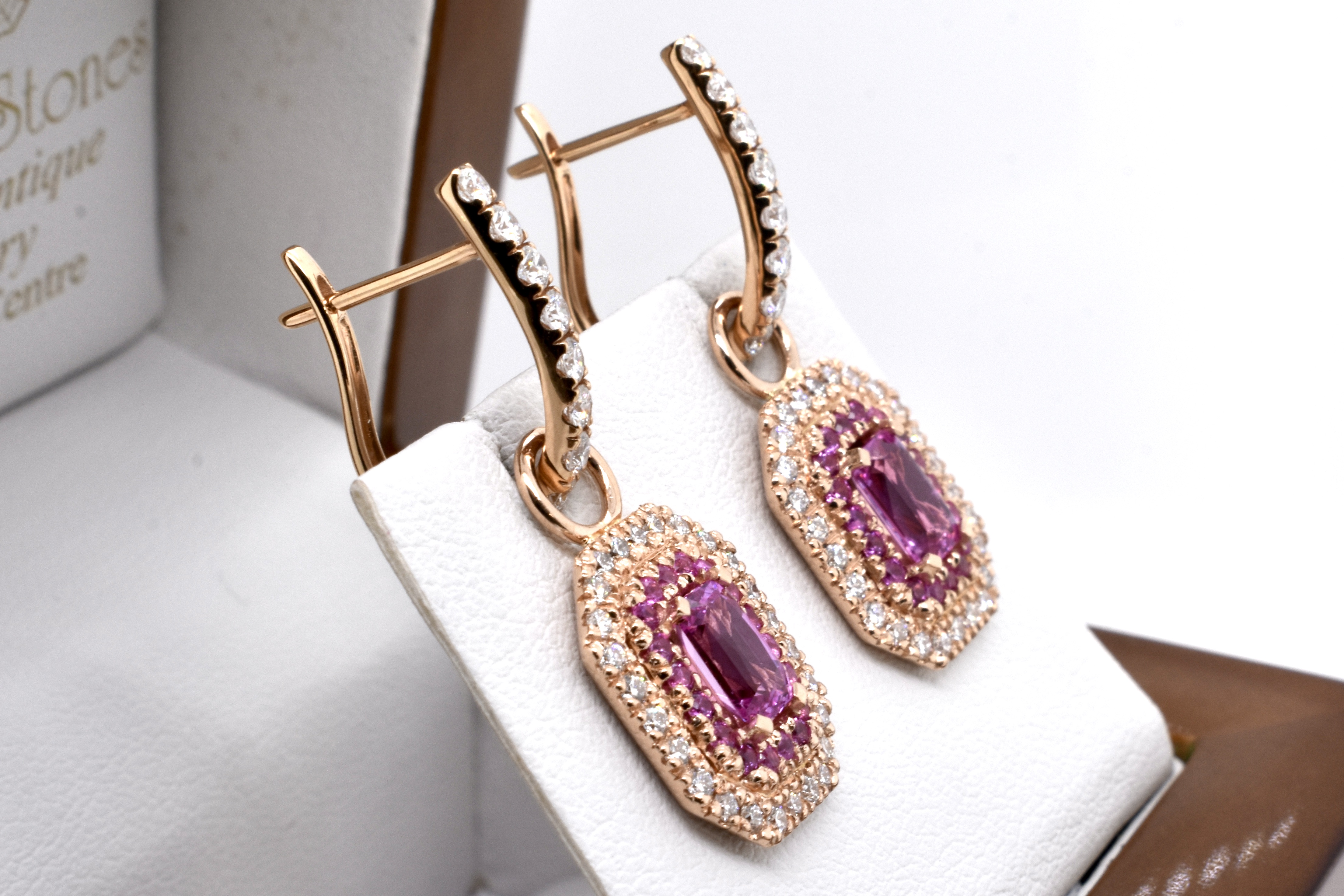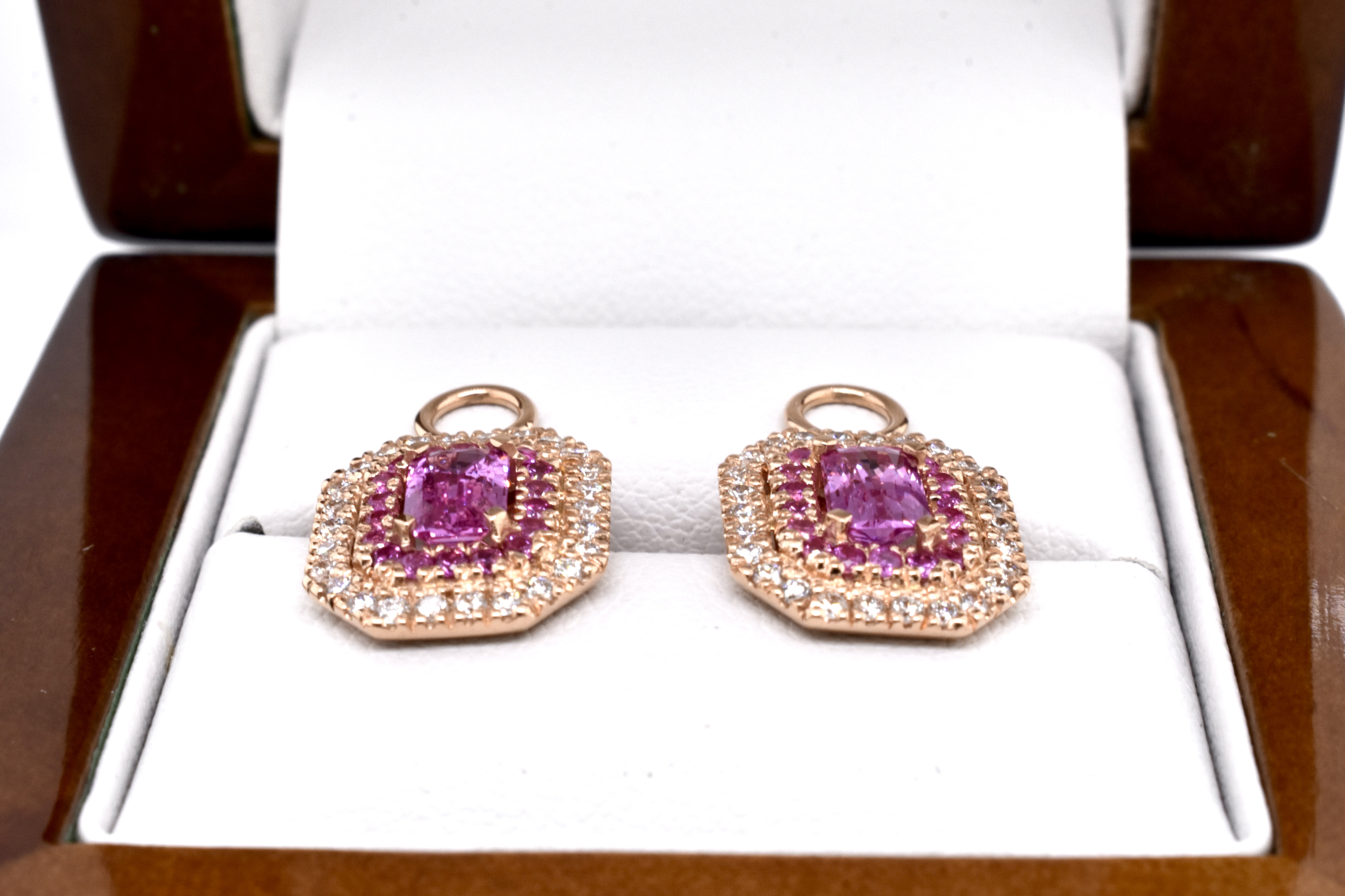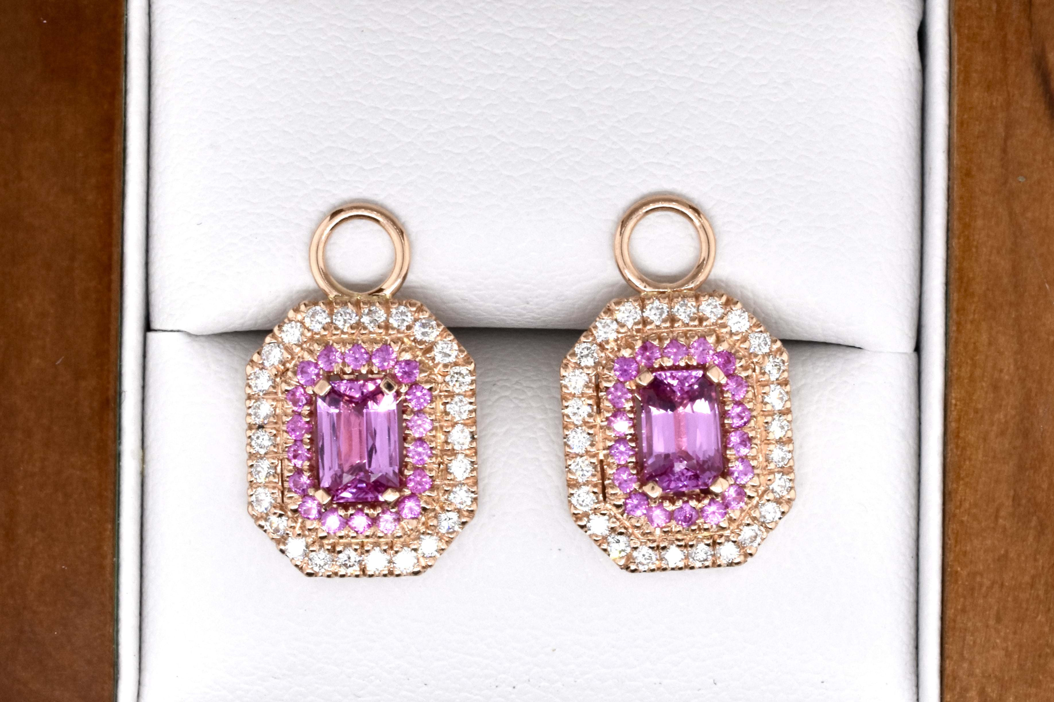 This elegant and dazzling pair of earrings can be worn in two ways - either as huggies by themselves or with the beautiful detachable drops. The 18ct rose gold huggies are U-shaped and set with 0.41ct of sparkling FG/VS RBC diamonds. The detachable drops are also crafted from 18ct rose gold, with a centre emerald cut hot pink sapphire, with an inner halo of round hot pink sapphires and a shimmering outer halo of white RBC DF/SI diamonds, all in an emerald cut shape with a solid plain loop. The two centre sapphires equal 1.40ct with an additional 0.46ct and 0.47ct total diamonds. Independent Valuation Supplied