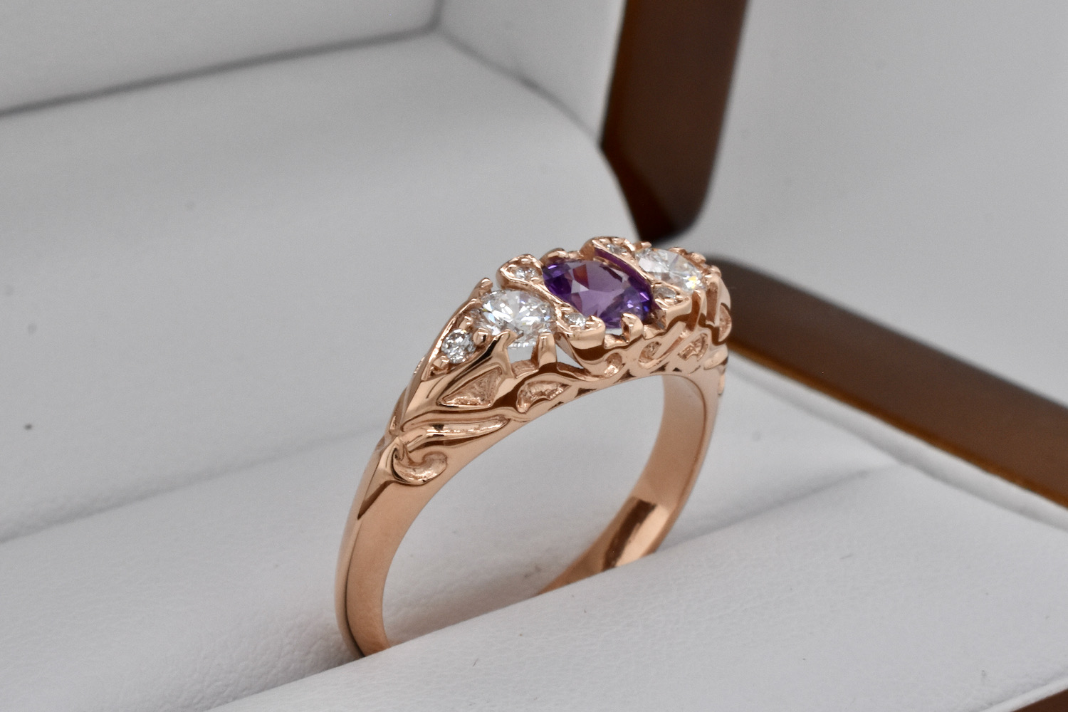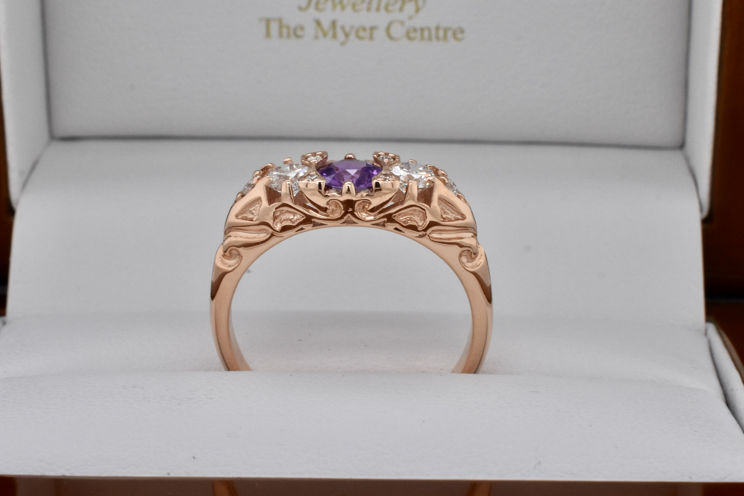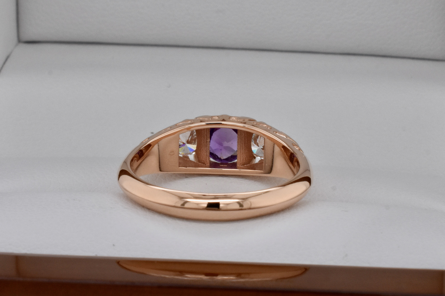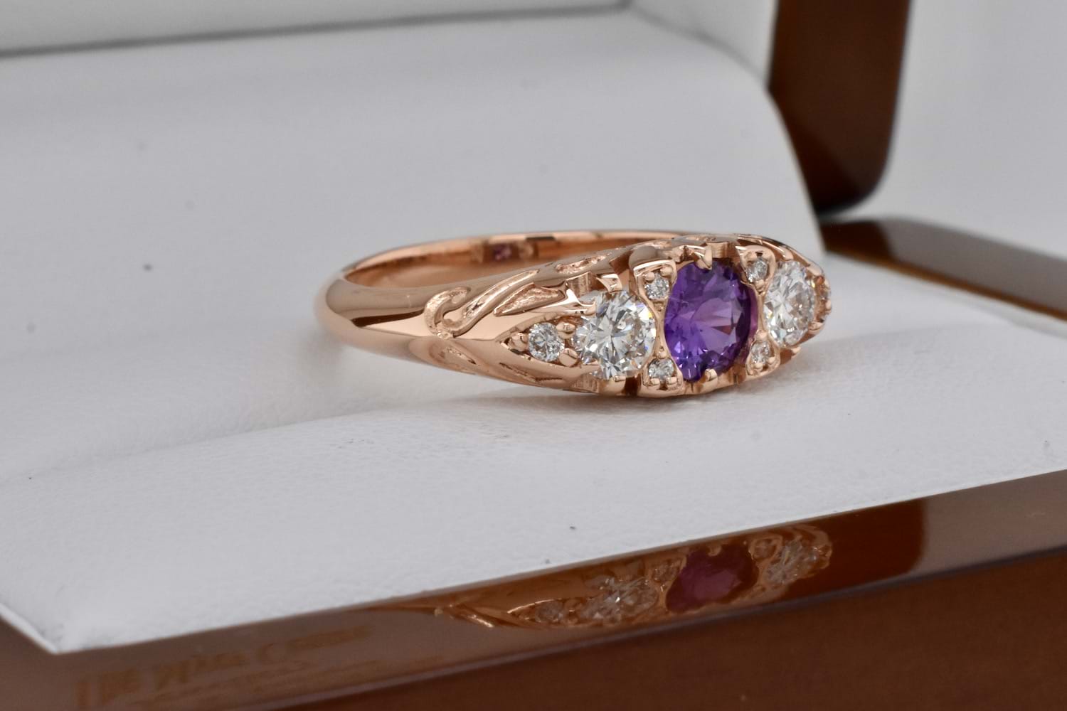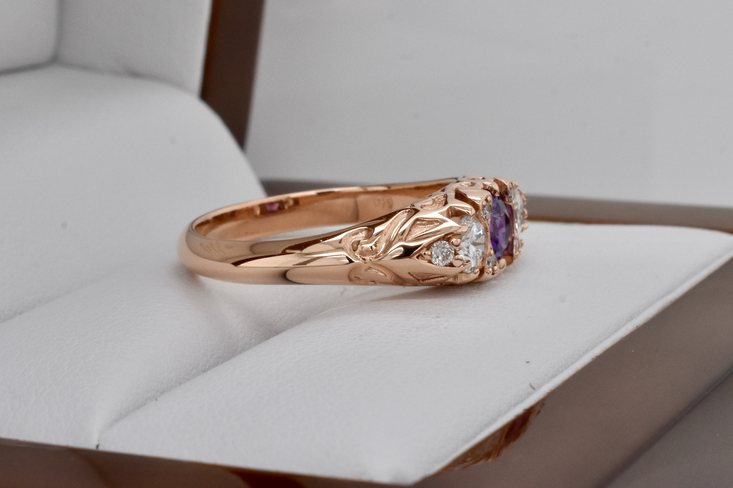 This bespoke creation puts a pretty and feminine twist on the timeless bridge ring design. Expertly crafted in our workshop in 18ct rose gold the piece has been designed as a dress ring and features a stunning 0.57ct purple sapphire chosen by our client, flanked by a shimmering round brilliant cut diamond on each side and six smaller diamonds in the gaps. Total diamond content equals 0.53cts.