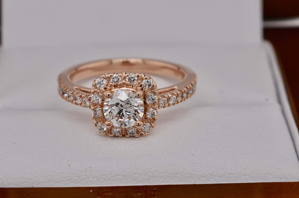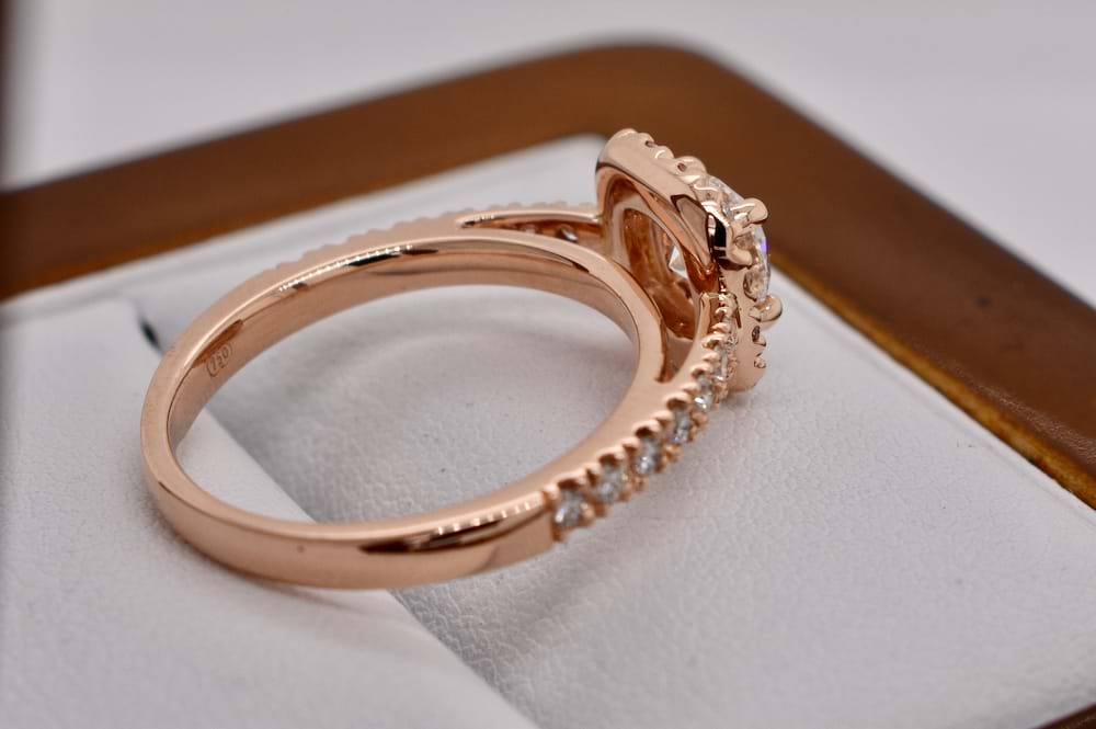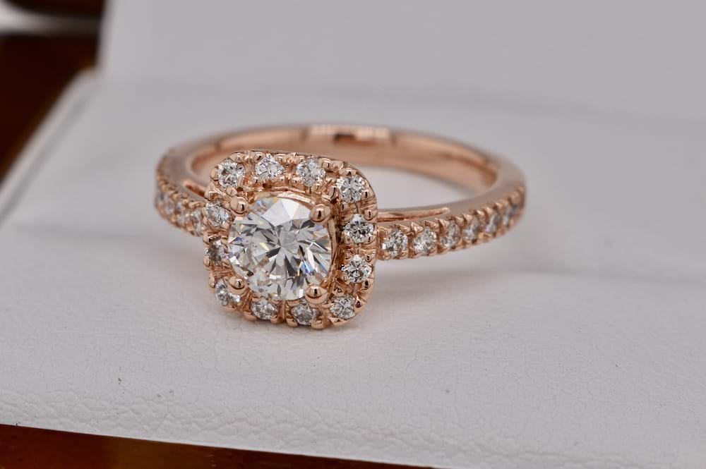 A stunning GIA certified 0.60ct (F/SI2) round brilliant cut diamond hand selected to be the feature of this gorgeous 18ct rose gold engagement ring. Beautifully crafted in our workshop the cushion shape halo contains 12 sparkling diamonds with a further seven diamonds continuing down each shoulder with a combined total of 0.56cts (D/SI1) and has been designed to sit perfectly next to diamond wedding bands. Independent Certificate & GIA Certificate Supplied. This bespoke creation is being enjoyed by its new owner, if you are inspired by this archived design contact us today to discuss how we can create something incredible for you or your loved one.