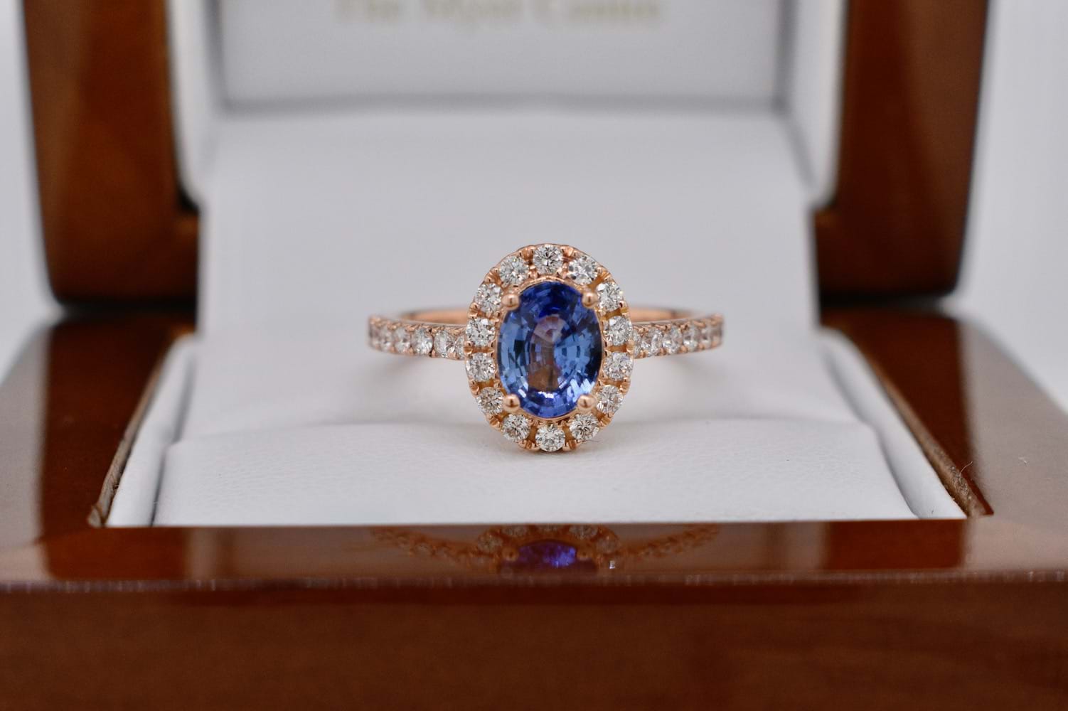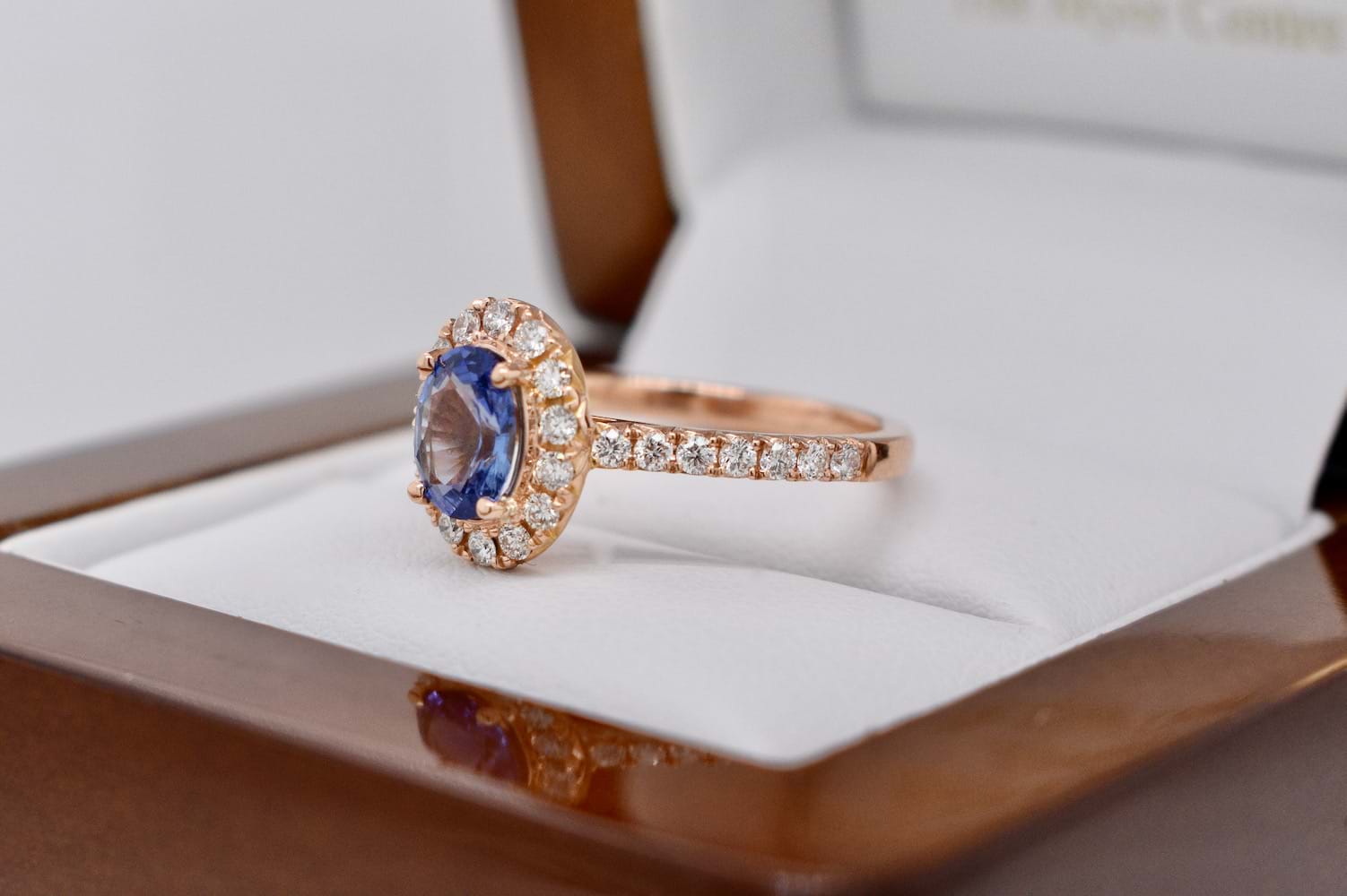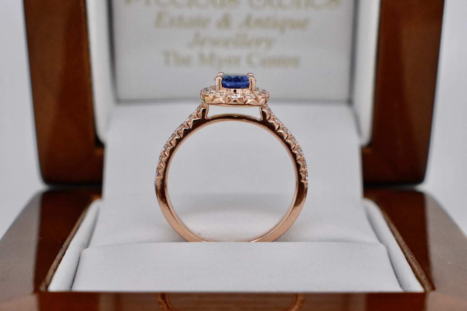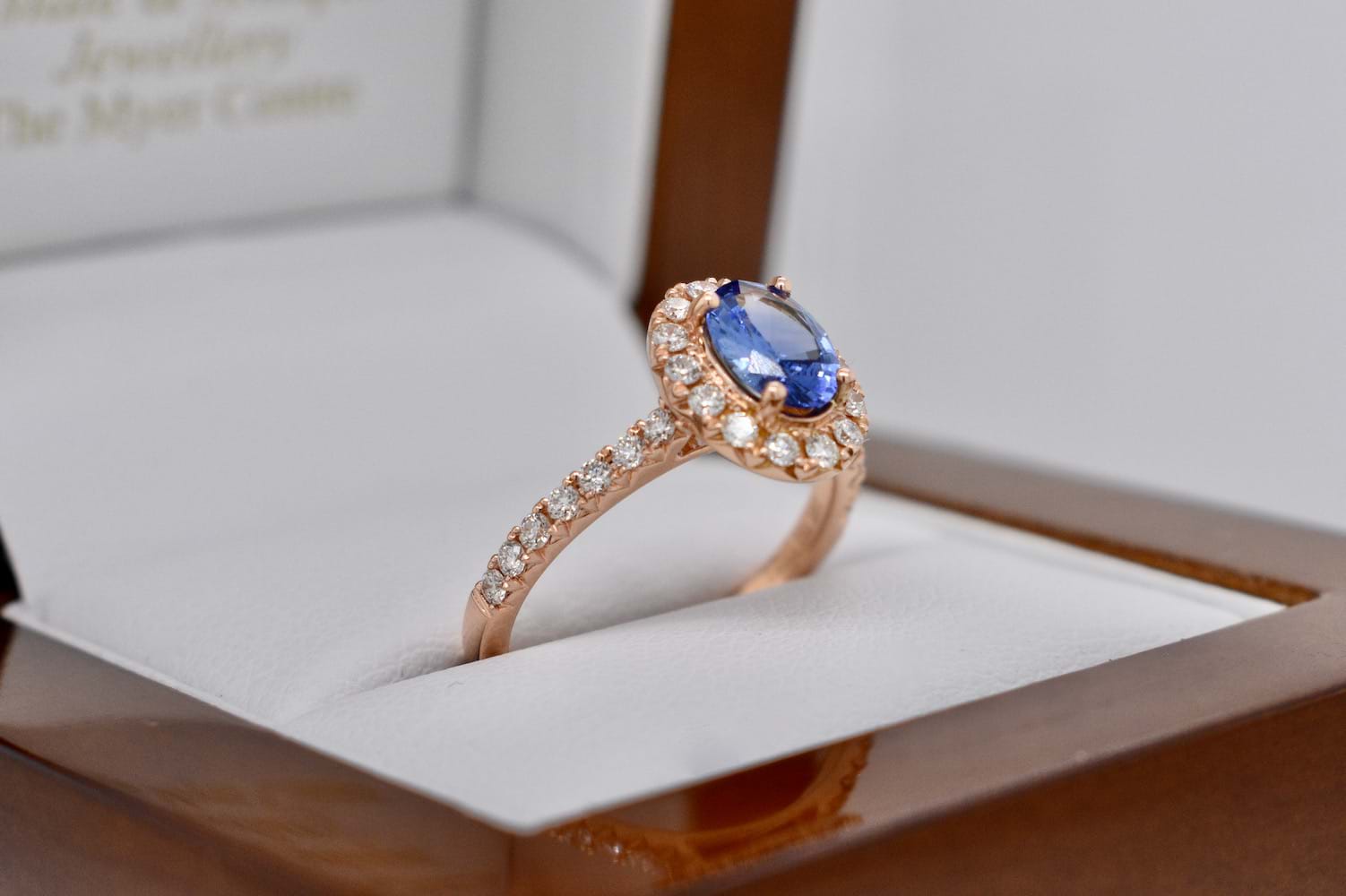 A beautiful and feminine 18ct rose gold sapphire and diamond engagement ring, designed in store alongside our clients. Seeking a Tanzanite center our design team suggested the stronger, more durable and practical alternative of sapphire, then sourcing our clients a range of Ceylon sapphires with a hue of colour reminiscent to the Tanzanite they had initially asked for. Upon seeing this beautiful 0.97ct Ceylon sapphire, the rest of the design fell into place with a single surround of shimmering diamonds and a continuation of diamonds set into the shoulders. Total diamond content equals 0.42cts. Independent Valuation Supplied.