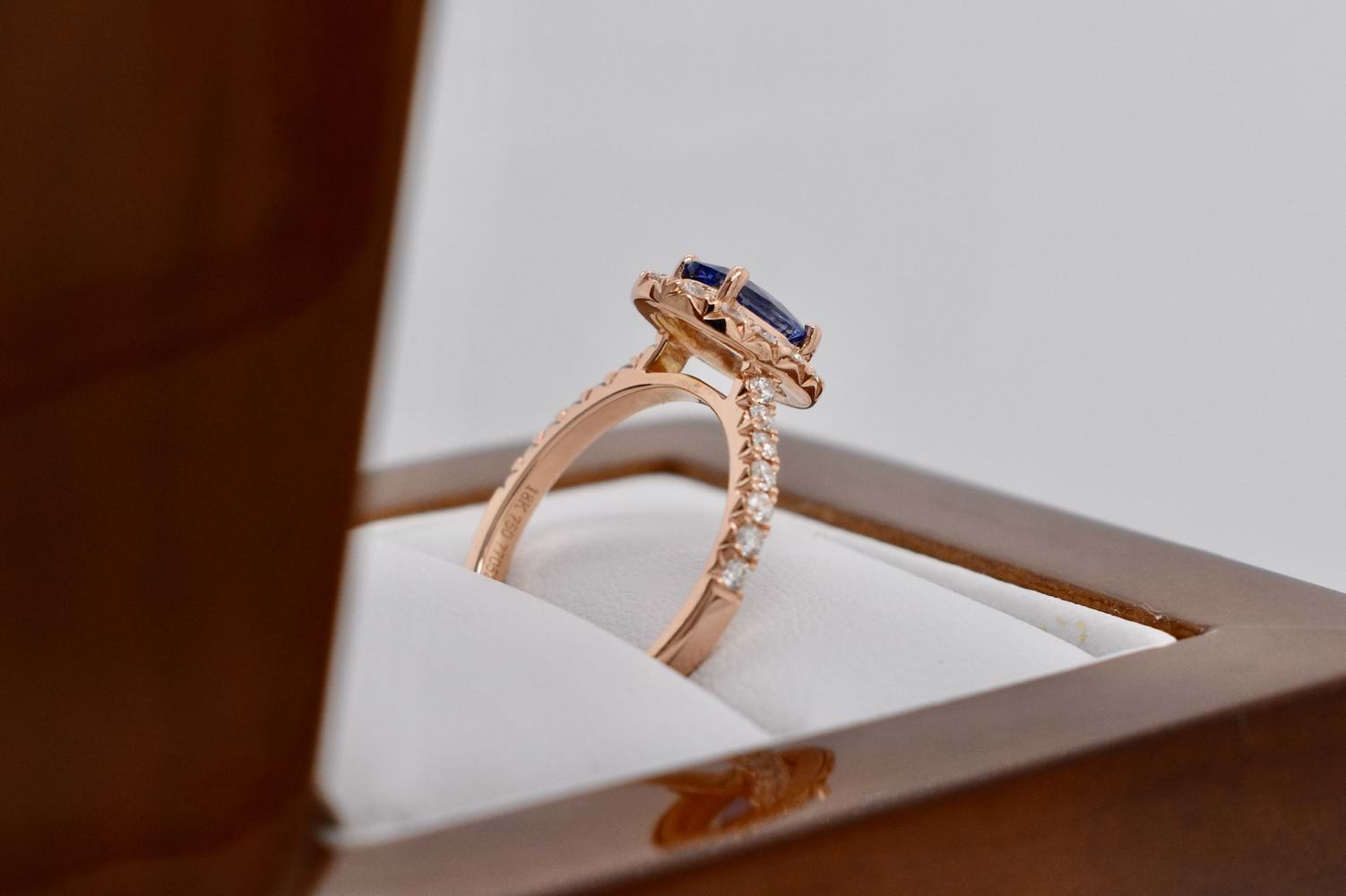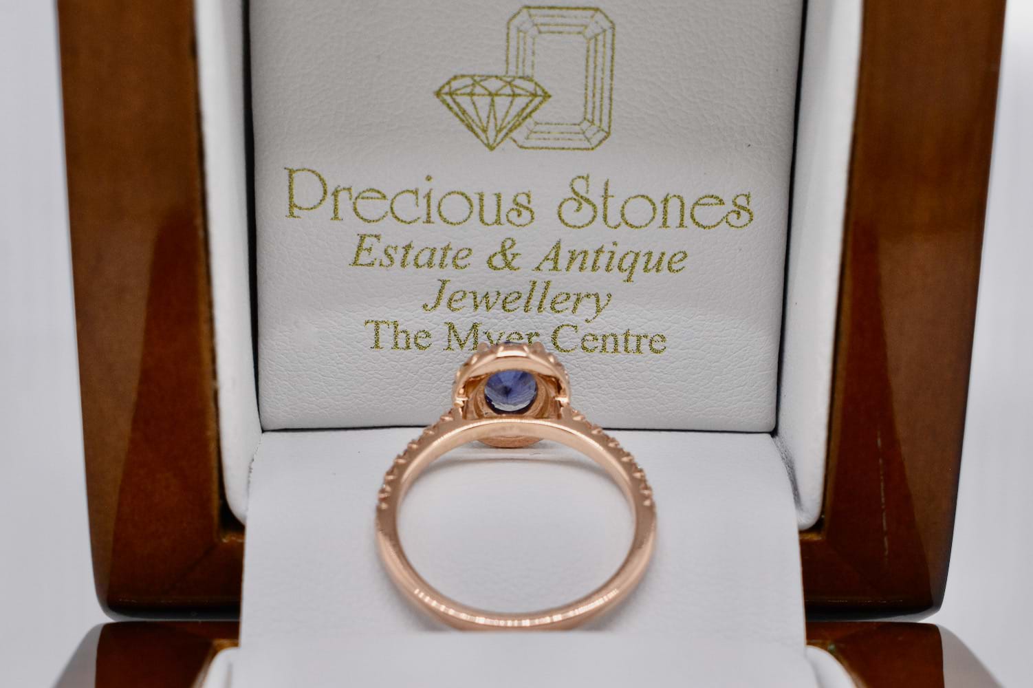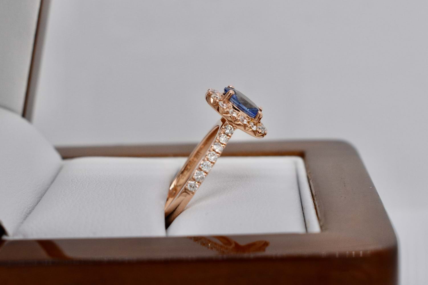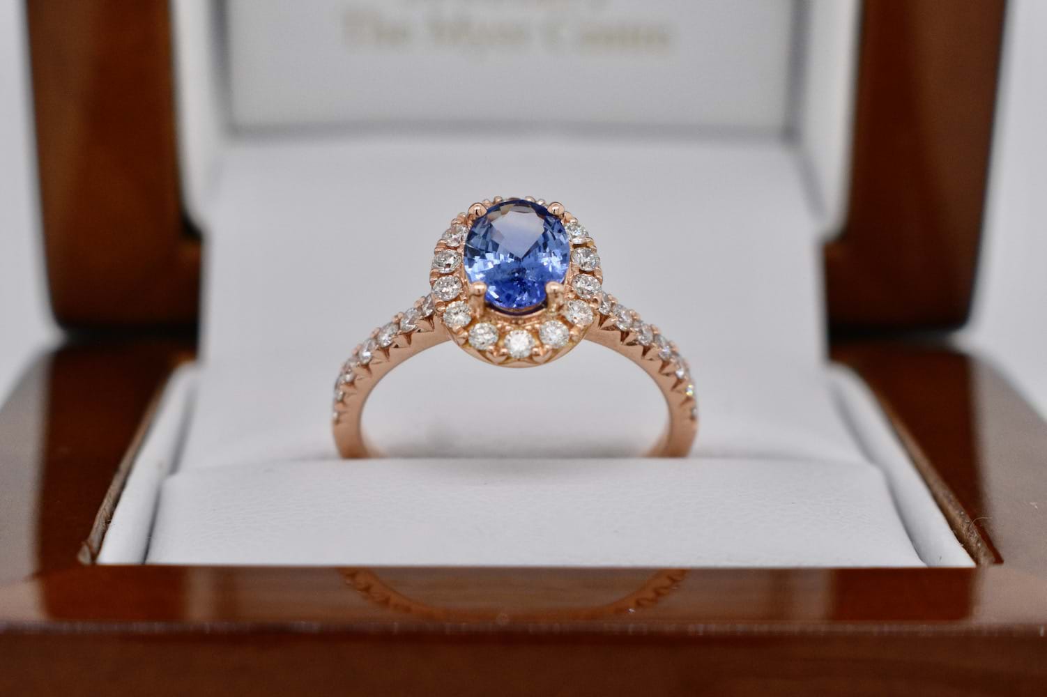 A beautiful and feminine 18ct rose gold sapphire and diamond engagement ring, designed in store alongside our clients. Seeking a Tanzanite center our design team suggested the stronger, more durable and practical alternative of sapphire, then sourcing our clients a range of Ceylon sapphires with a hue of colour reminiscent to the Tanzanite they had initially asked for. Upon seeing this beautiful 0.97ct Ceylon sapphire, the rest of the design fell into place with a single surround of shimmering diamonds and a continuation of diamonds set into the shoulders. Total diamond content equals 0.42cts. Independent Valuation Supplied.