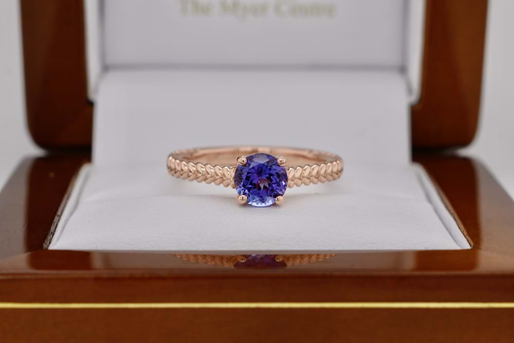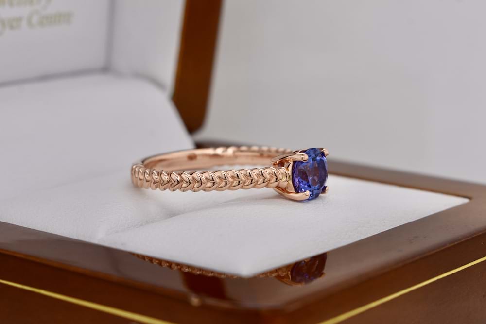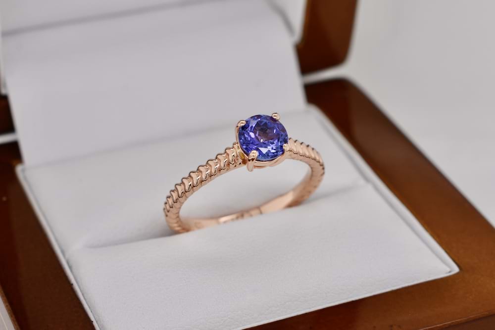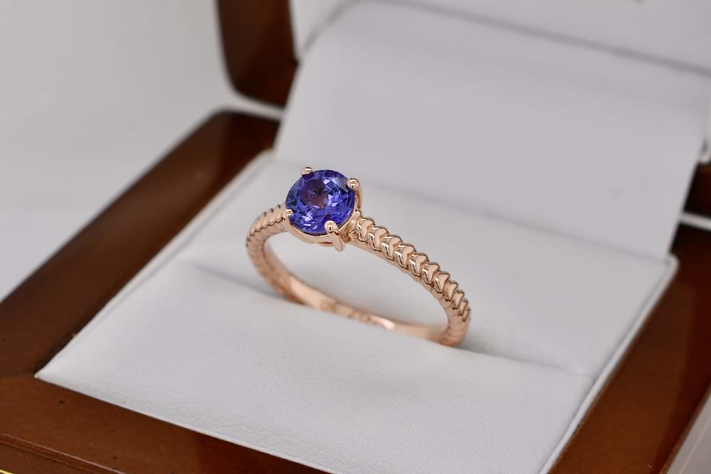 A lovely feminine dress ring crafted in 18ct rose gold with a twisted band design and a 0.98ct round tanzanite set as low as possible to allow the wearer to enjoy it more often. Independent Valuation Supplied.