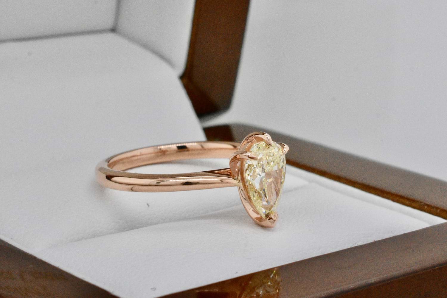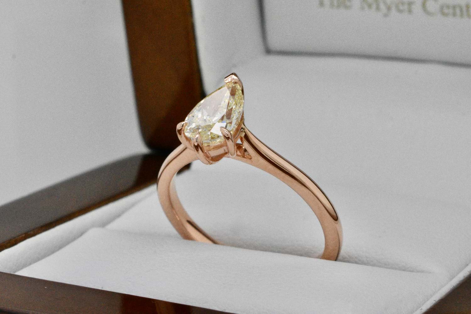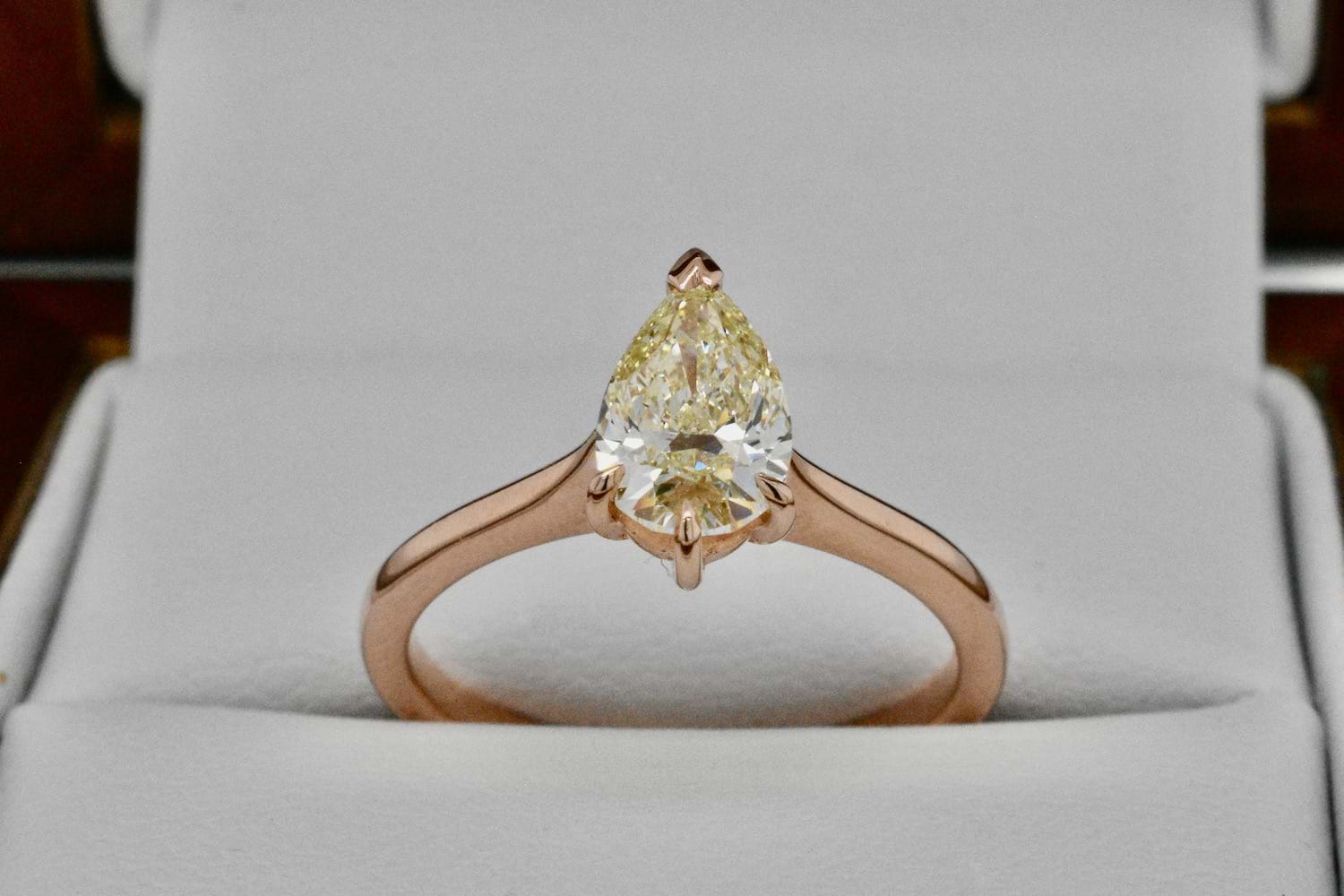 Created for one of our long time clients, this unusual and beautiful fancy light yellow pearshape diamond of 1.03cts was chosen in store as the feature of this feminine and striking engagement ring. Crafted in 18ct rose gold this delicate yet practical engagement ring showcases the pearshape diamond beautifully with three talon claws and a cap and will sit perfectly when it comes time to add wedding bands. Independent Valuation Supplied.
