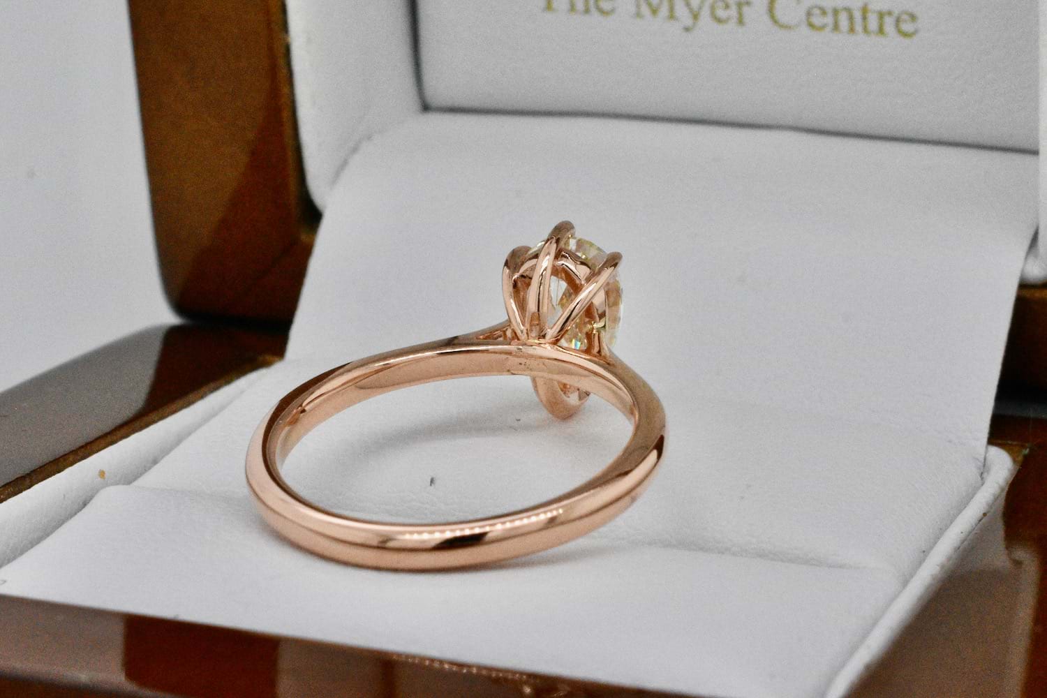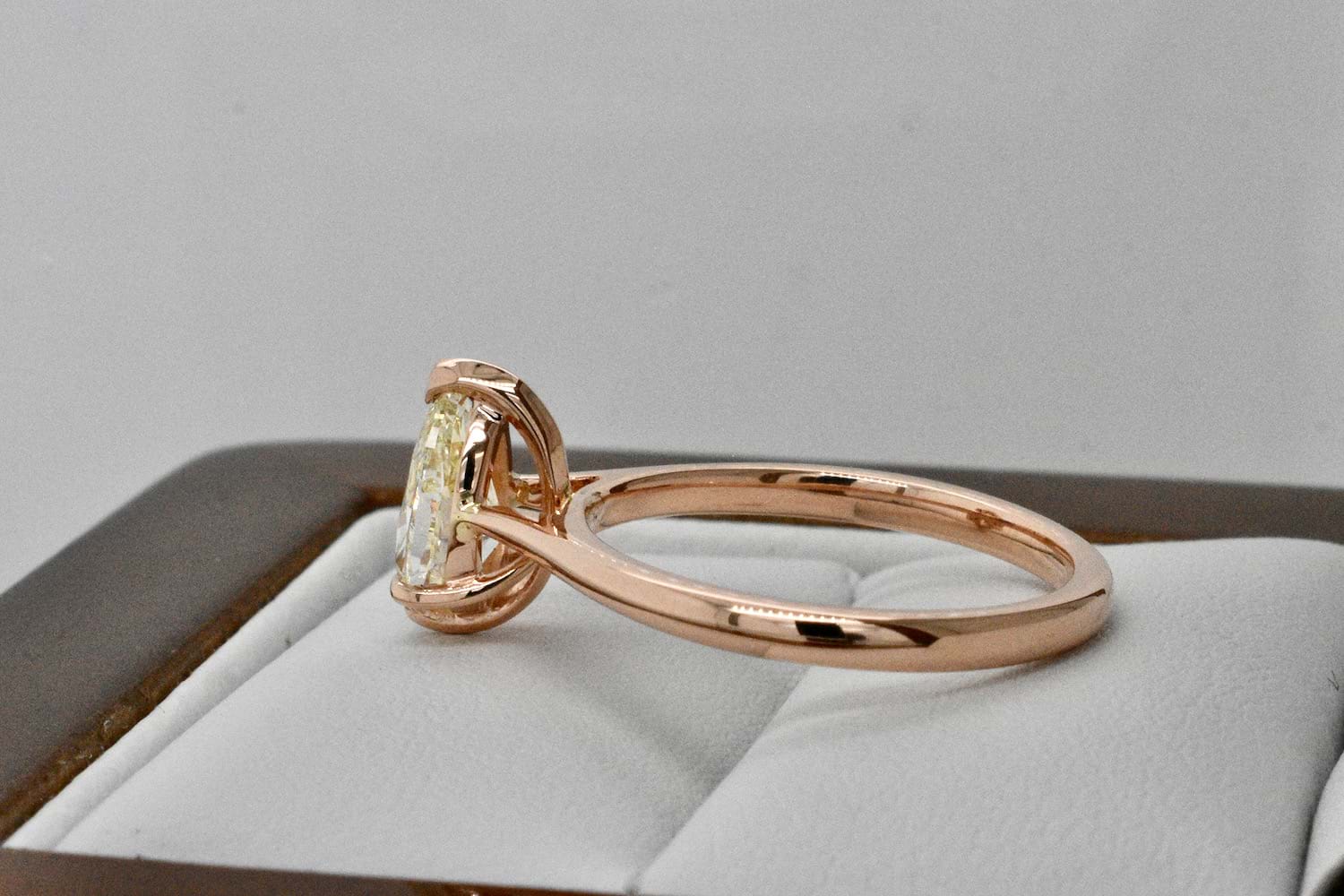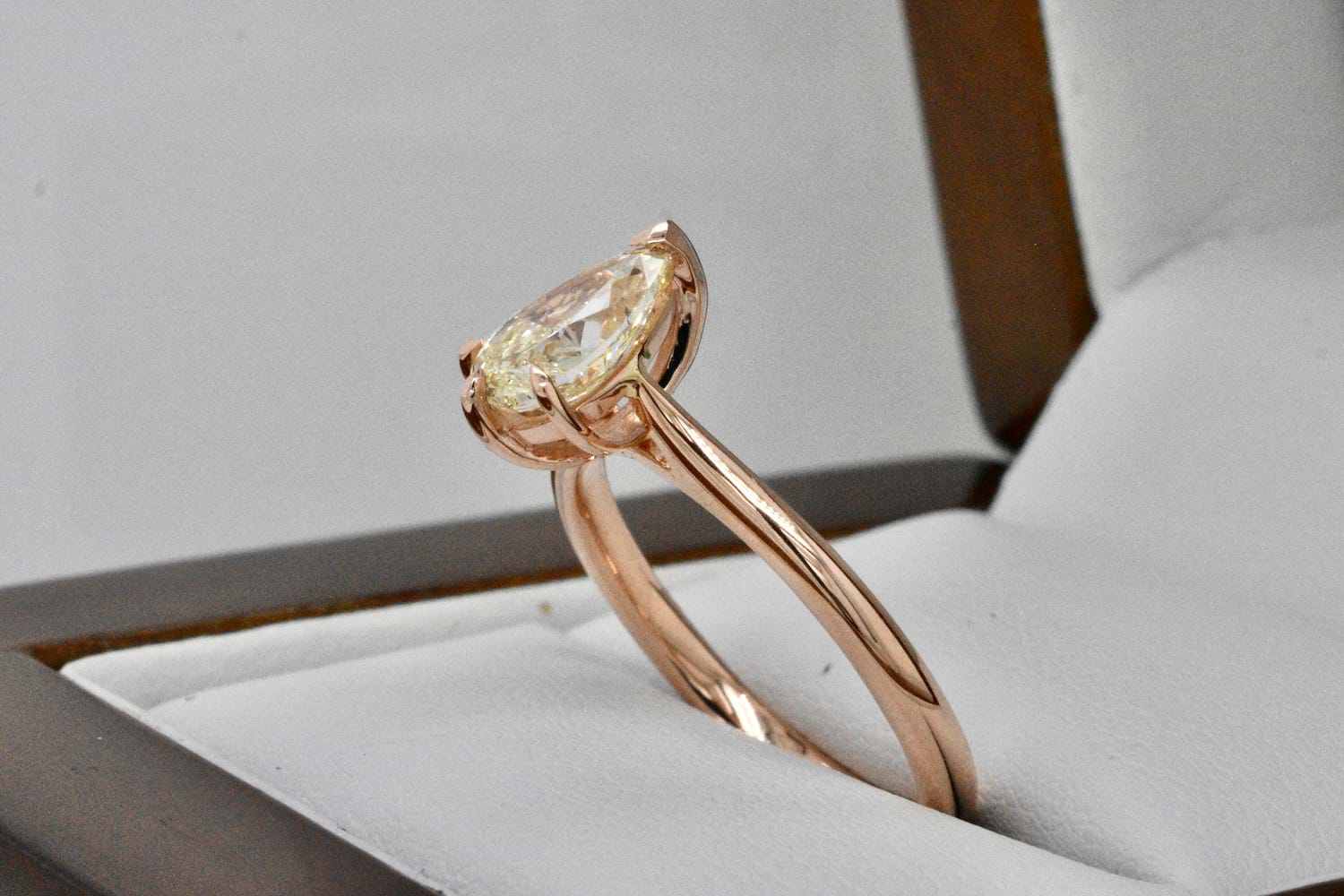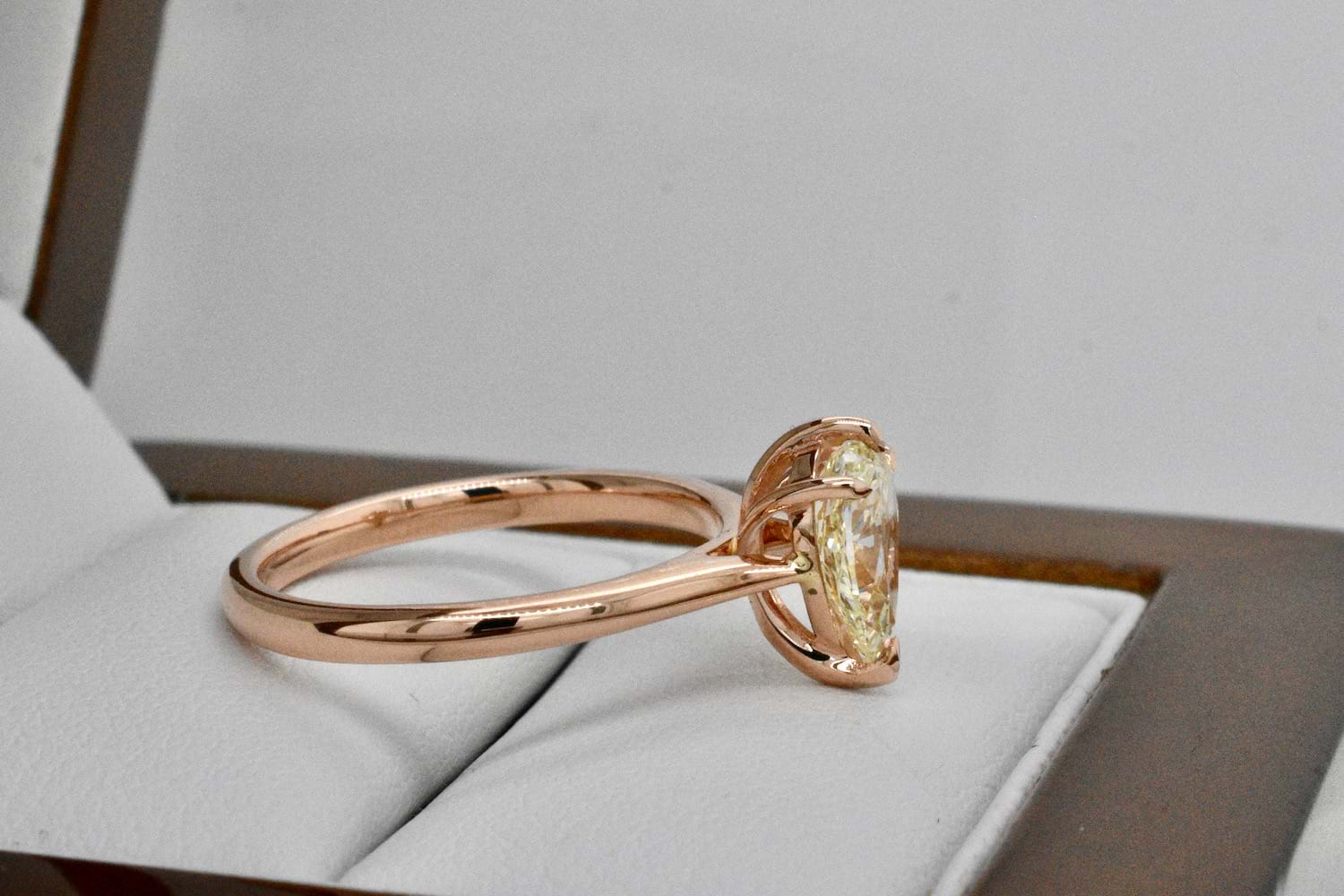 Created for one of our long time clients, this unusual and beautiful fancy light yellow pearshape diamond of 1.03cts was chosen in store as the feature of this feminine and striking engagement ring. Crafted in 18ct rose gold this delicate yet practical engagement ring showcases the pearshape diamond beautifully with three talon claws and a cap and will sit perfectly when it comes time to add wedding bands. Independent Valuation Supplied.