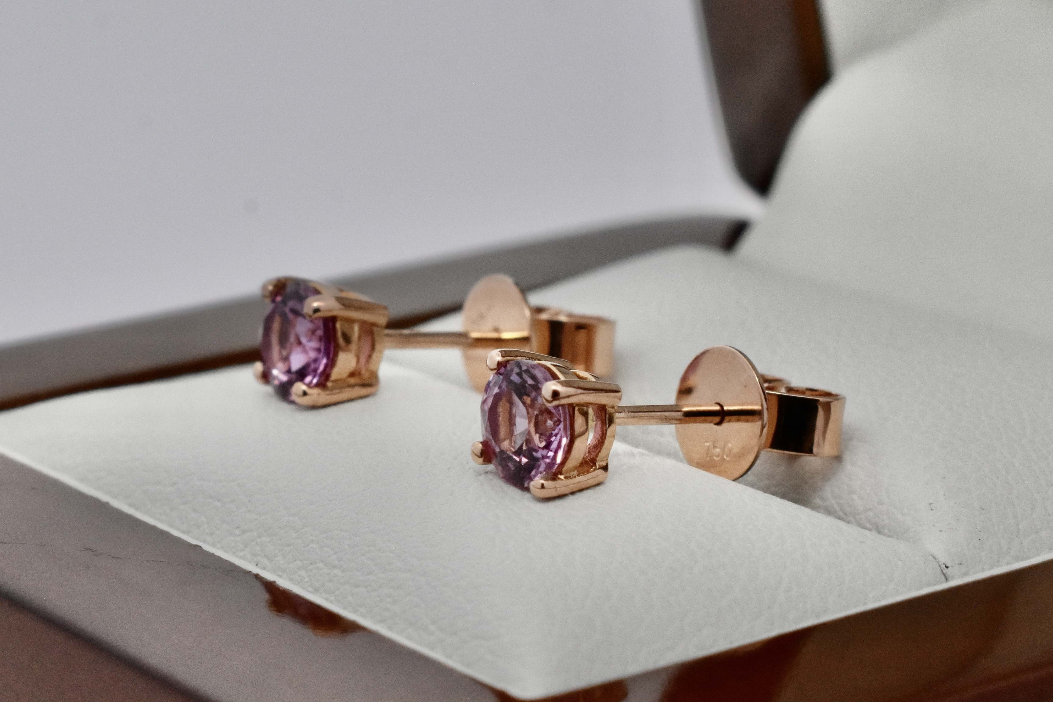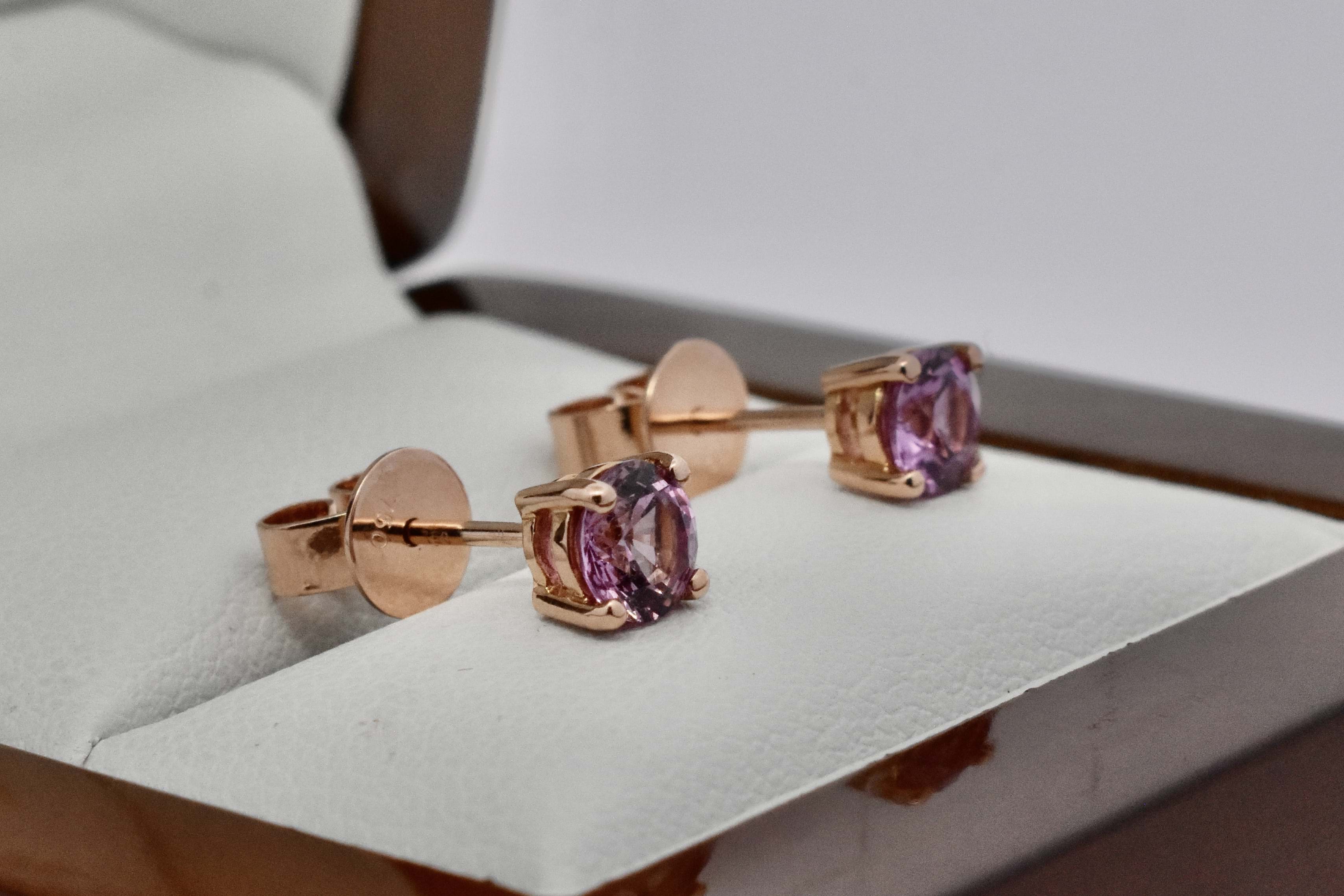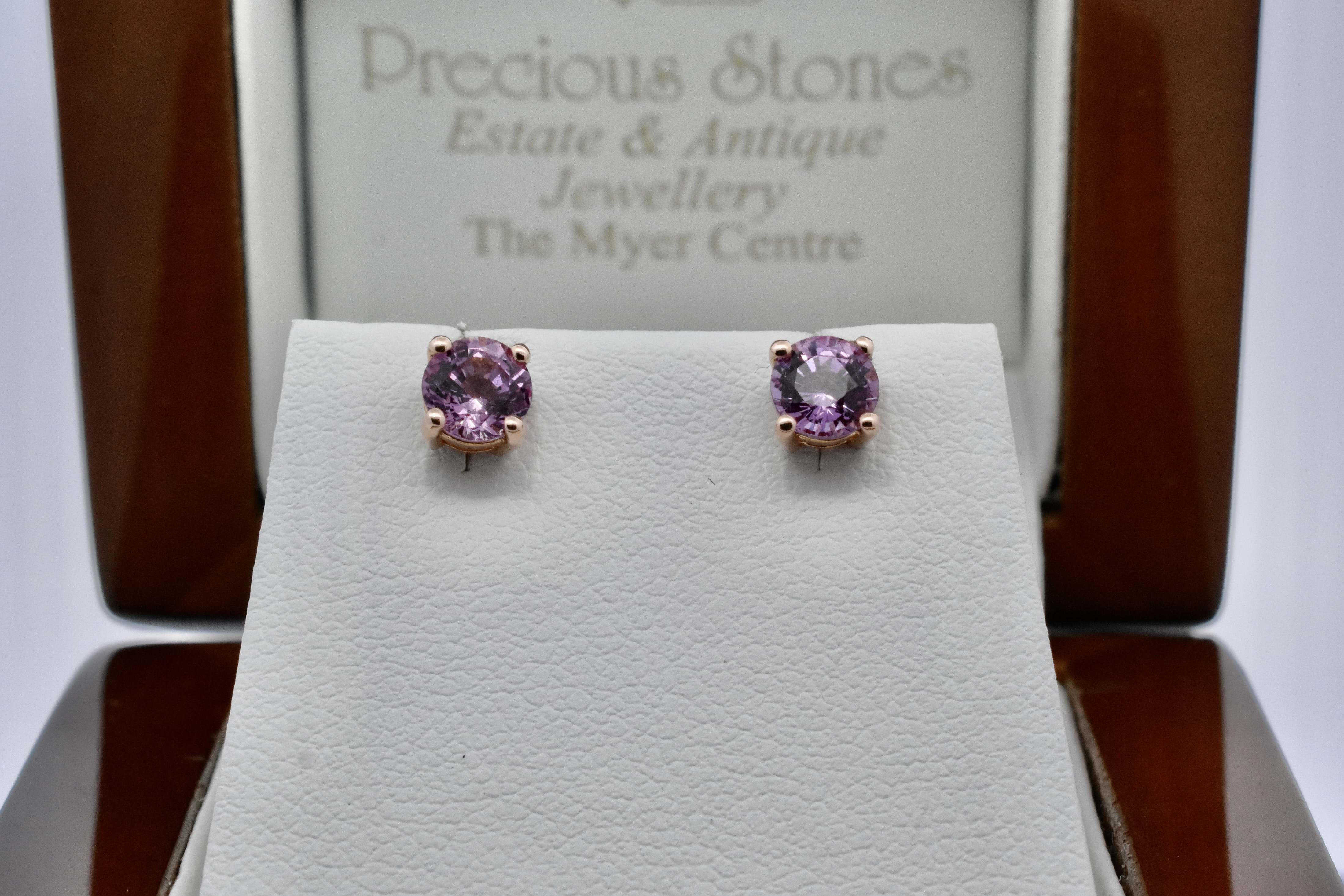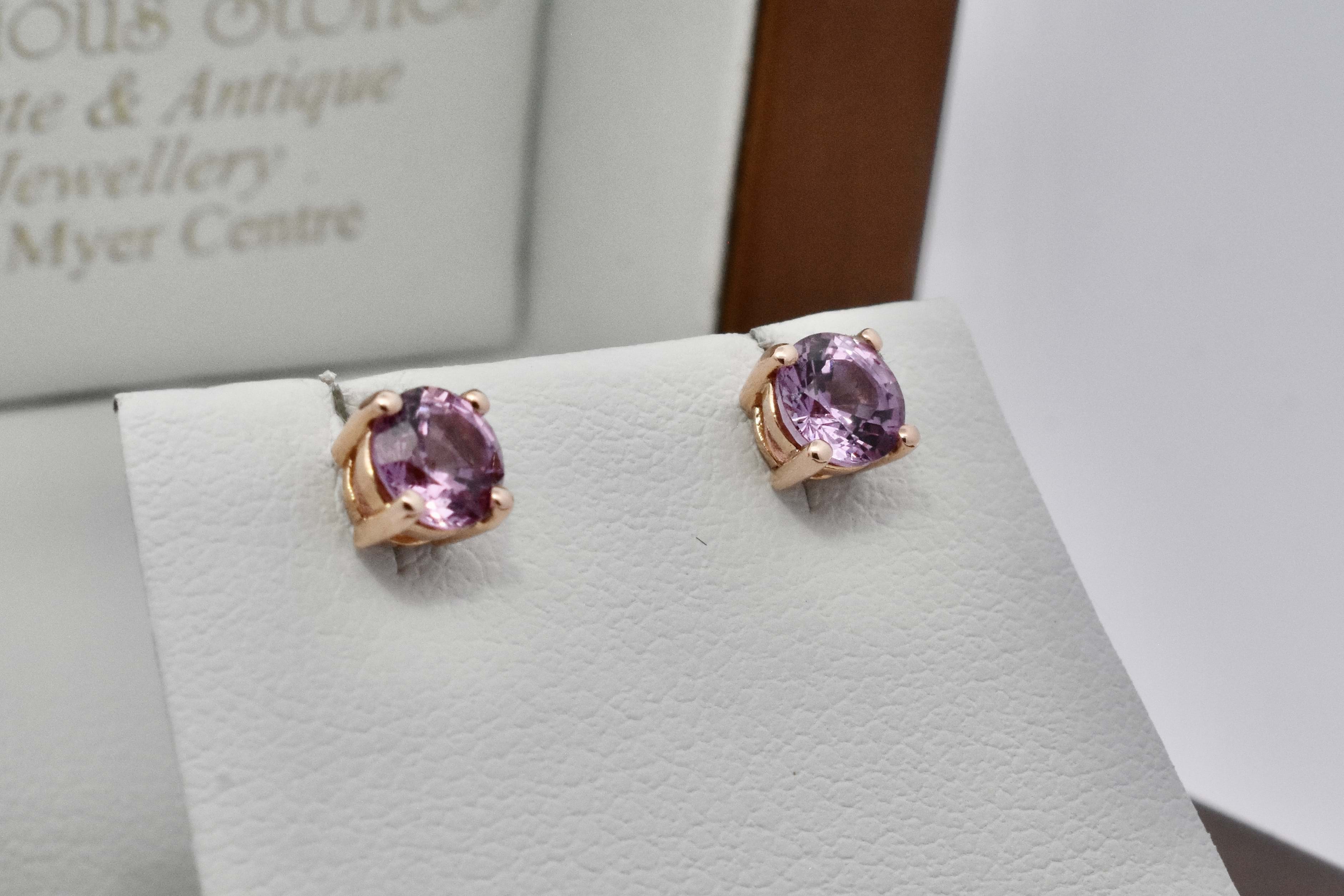 A lovely pair of light-mid pink oval sapphires sourced to fit into diamond jackets sold previously to our client. The sapphires total 1.17cts and are set into simple 18ct rose gold four claw stud settings. Independent Valuation Supplied.