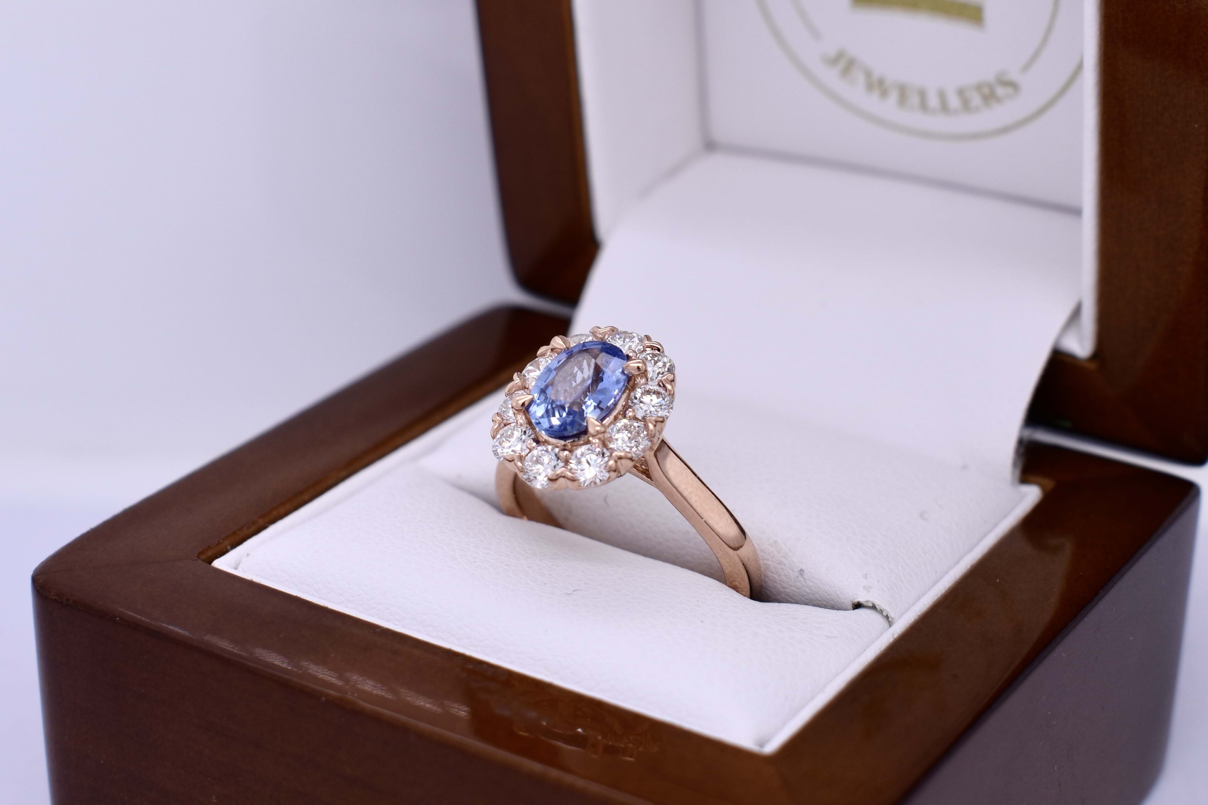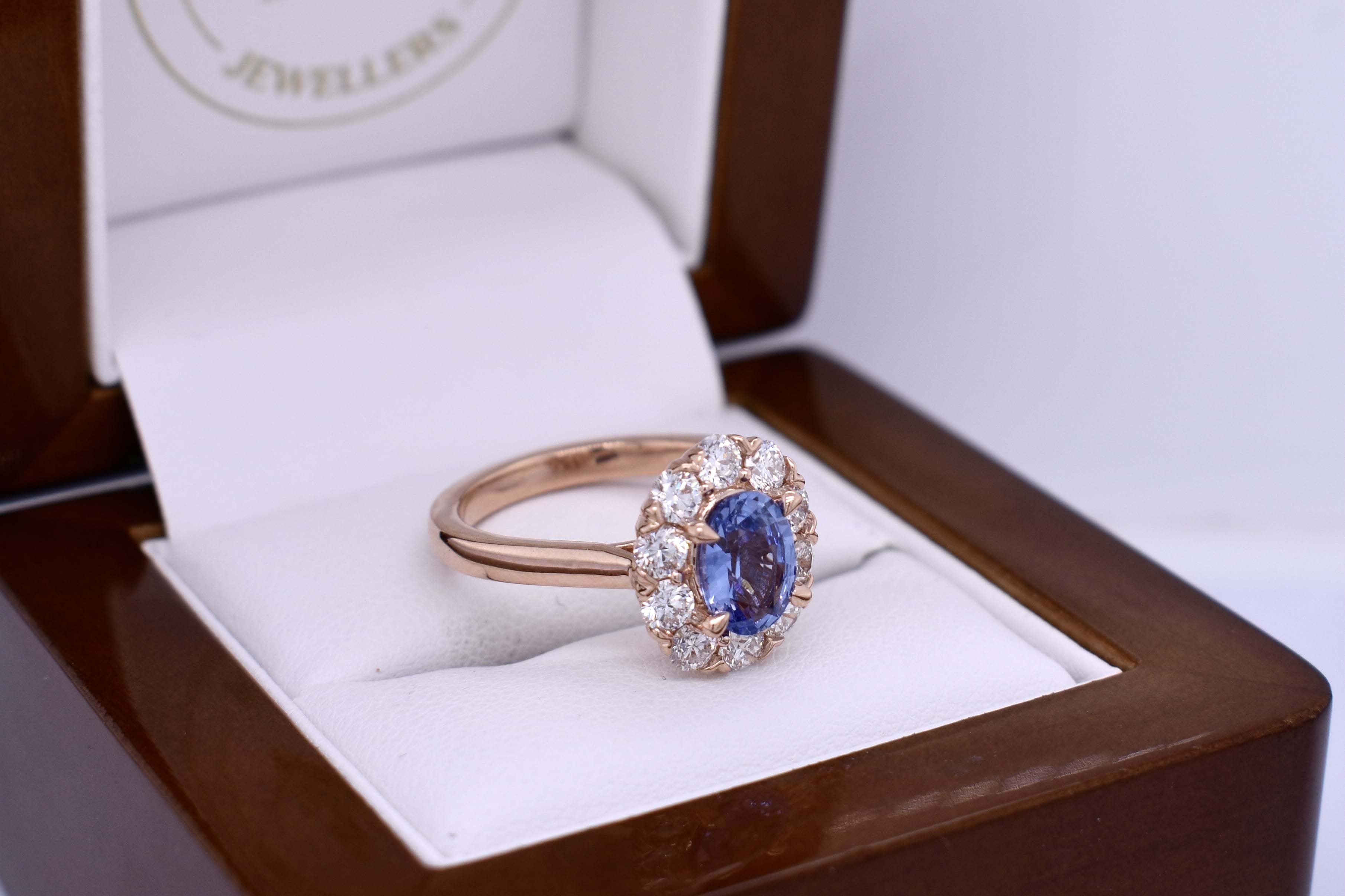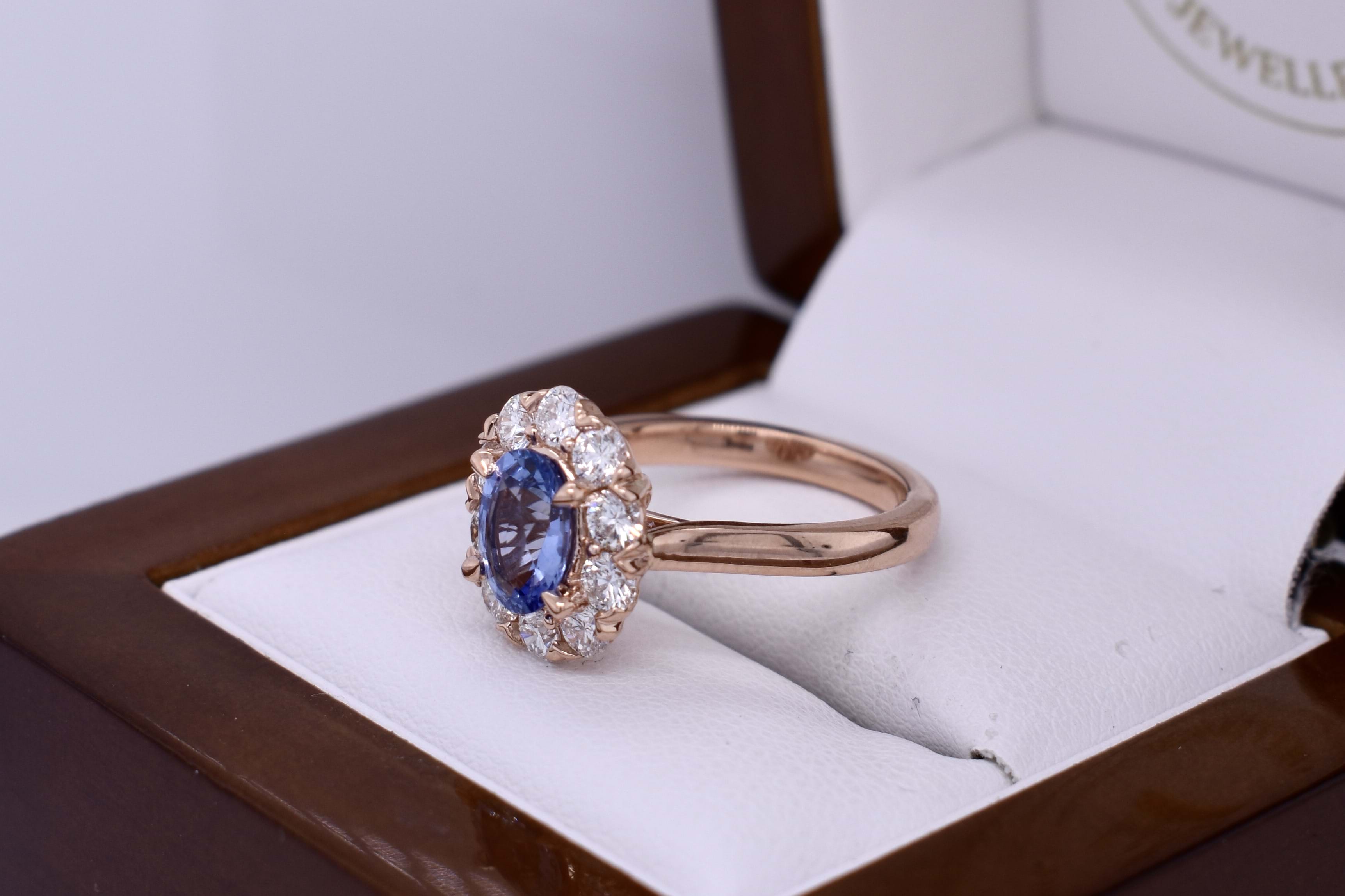 Hand selected in store from a wide range of sapphires, this beautiful 1.35ct mid blue Ceylon sapphire is the feature of this pretty 18ct rose gold cluster design engagement ring. The ring contains 10 round brilliant cut diamonds equalling 0.98cts in shared V-claw settings with a classic basket and under rail to sit with a wedding band. Independent Valuation Supplied.