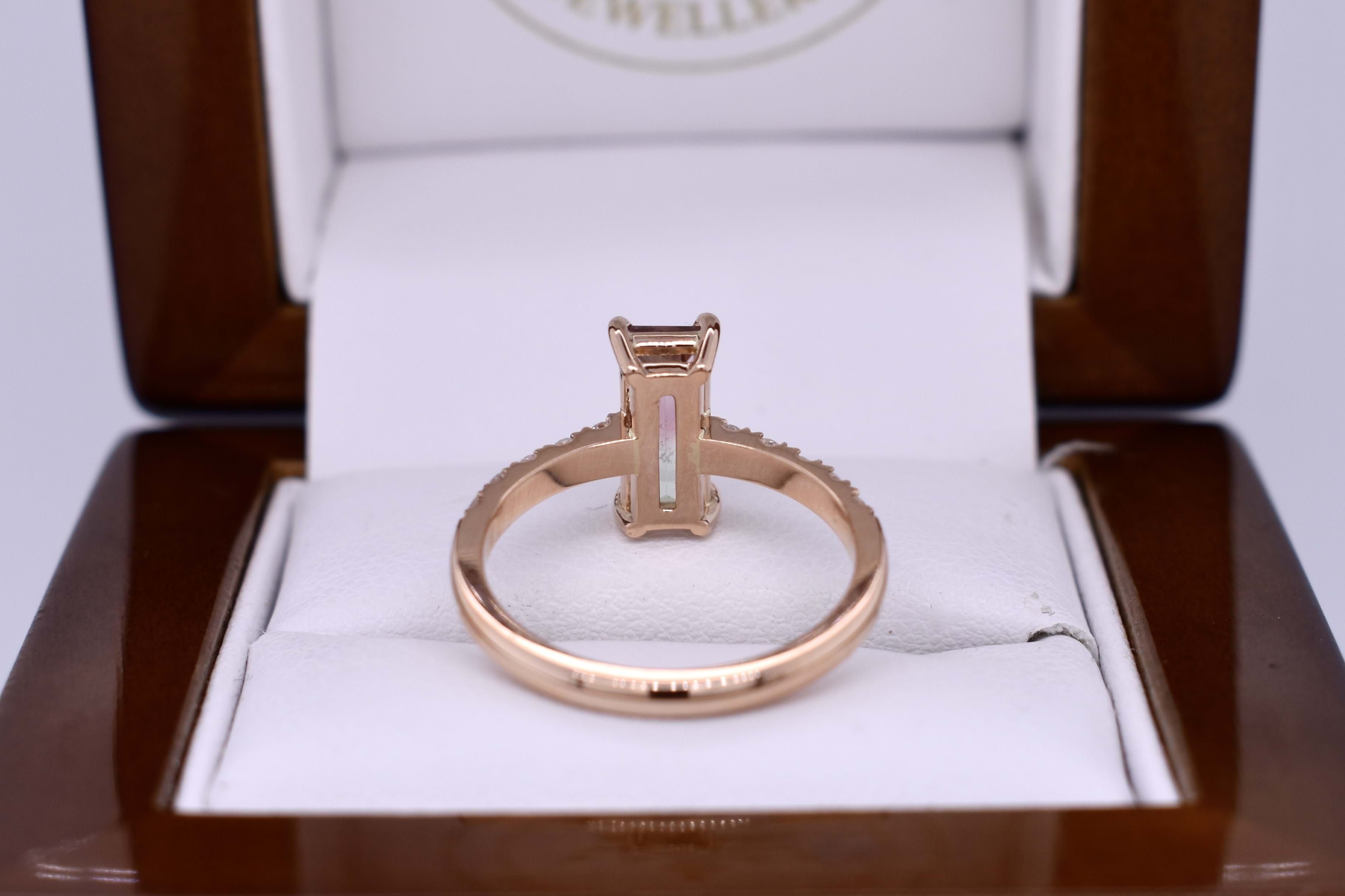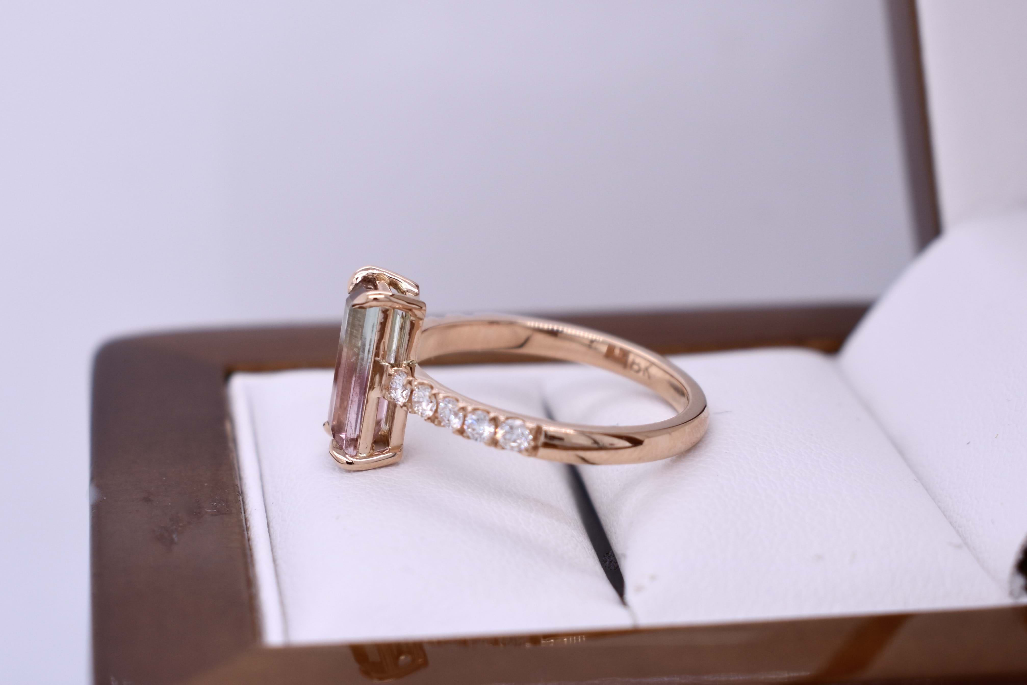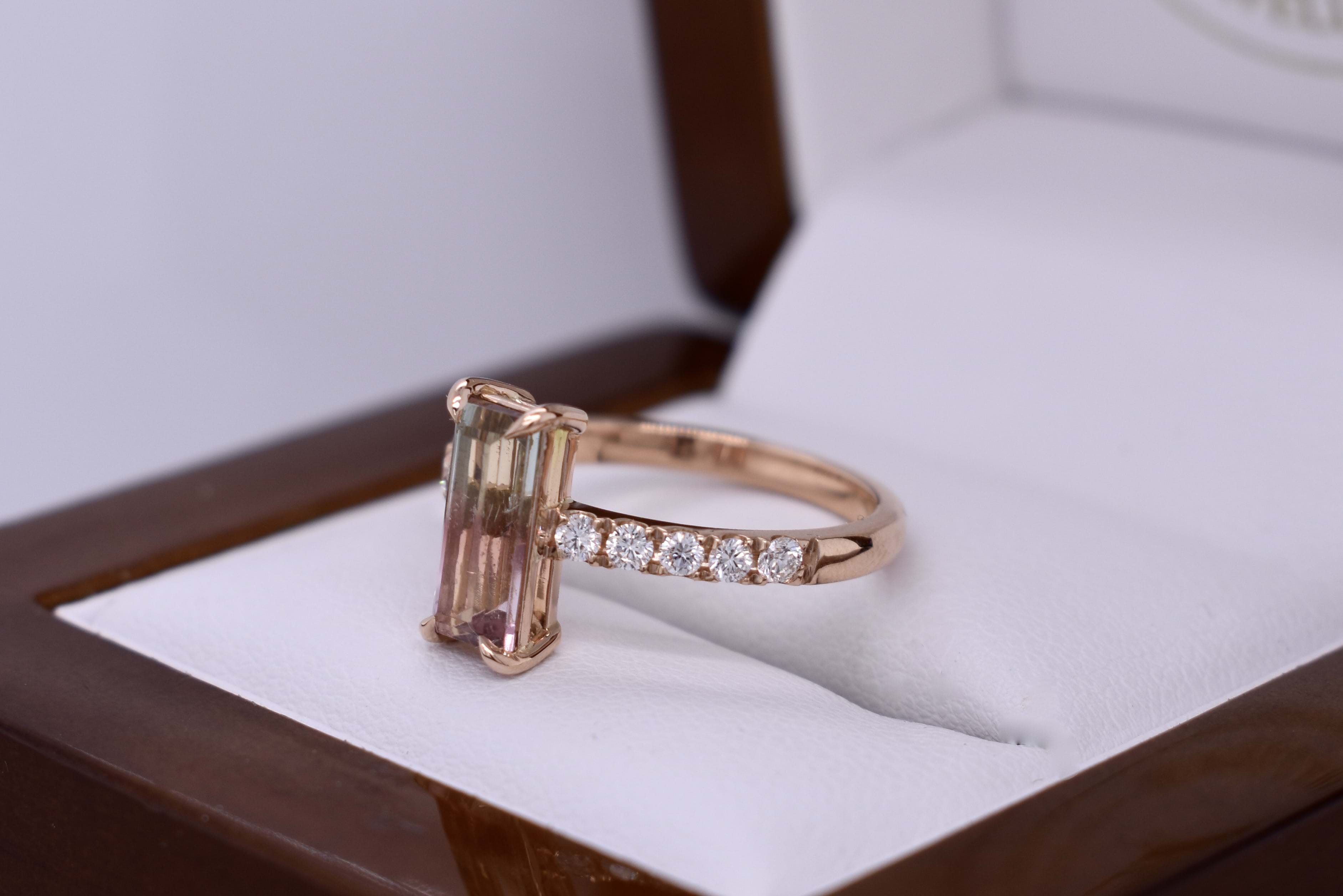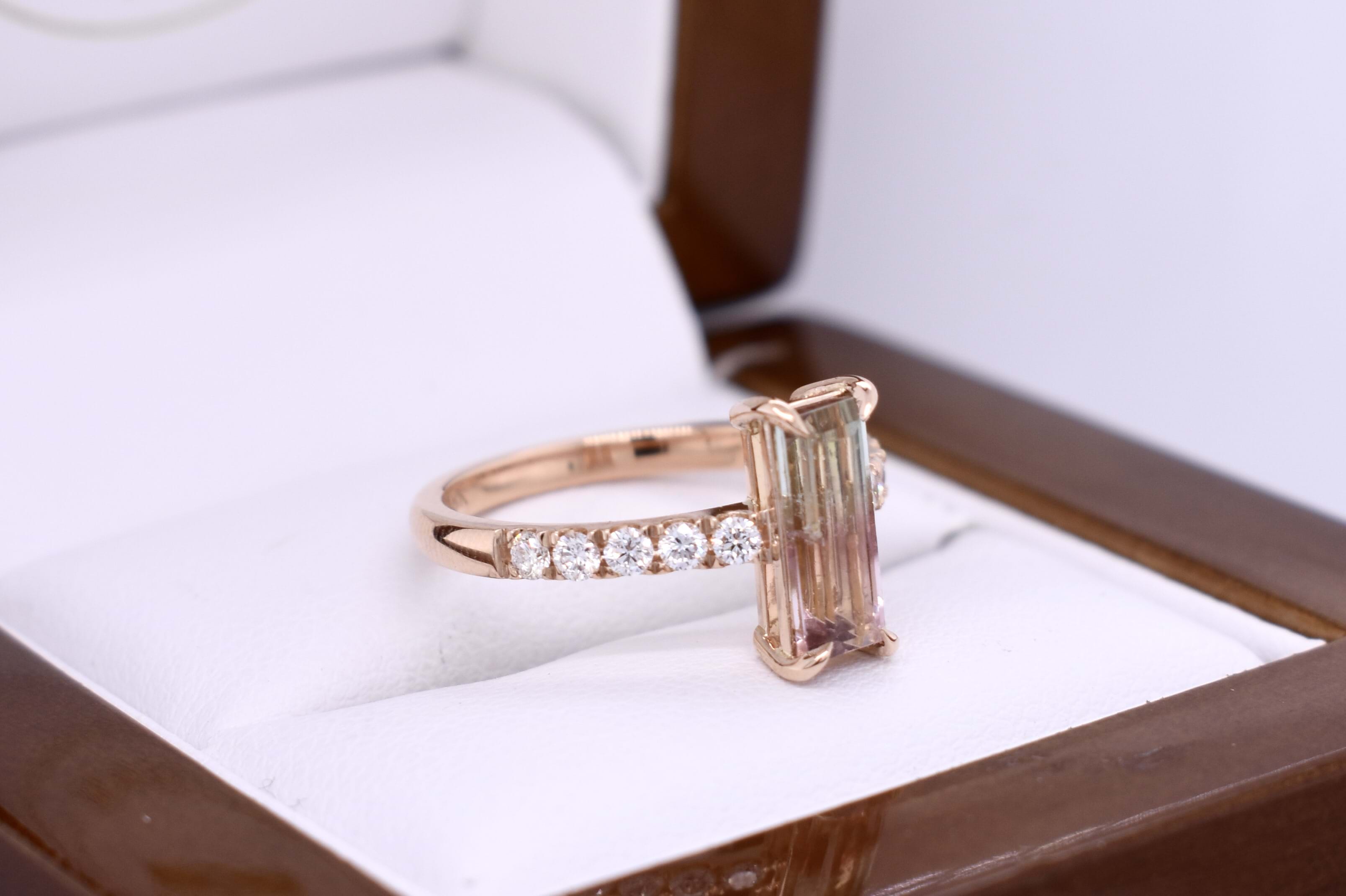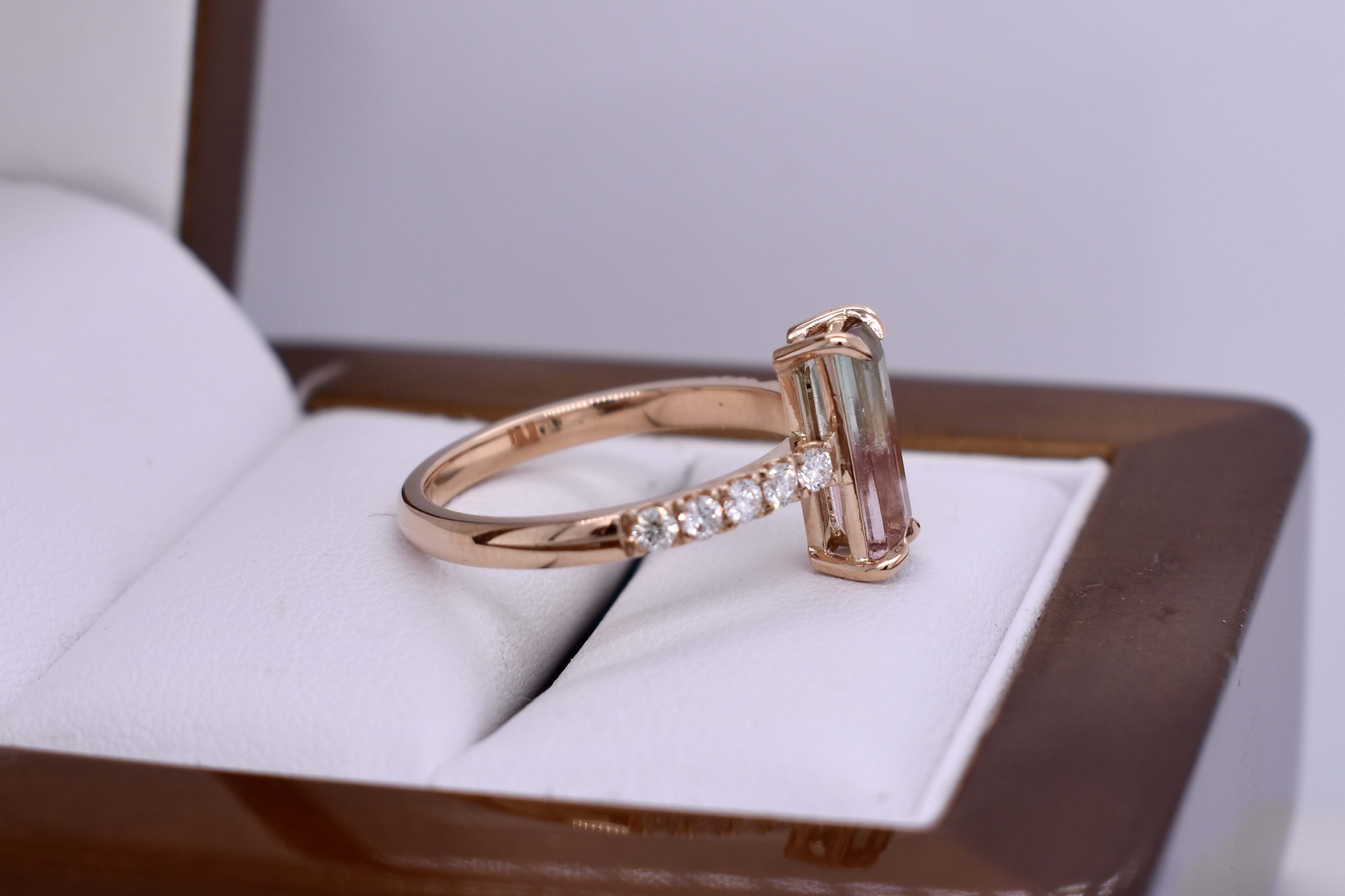 This pretty custom made dress ring was designed in store alongside our long-time client and has been crafted in 18ct rose gold and designed to sit low on the finger. The ring features a stunning elongated baguette cut watermelon tourmaline of 1.37cts and has five sparkling round brilliant cut diamonds on each side with a combined total of 0.25cts. Independent Valuation Supplied.