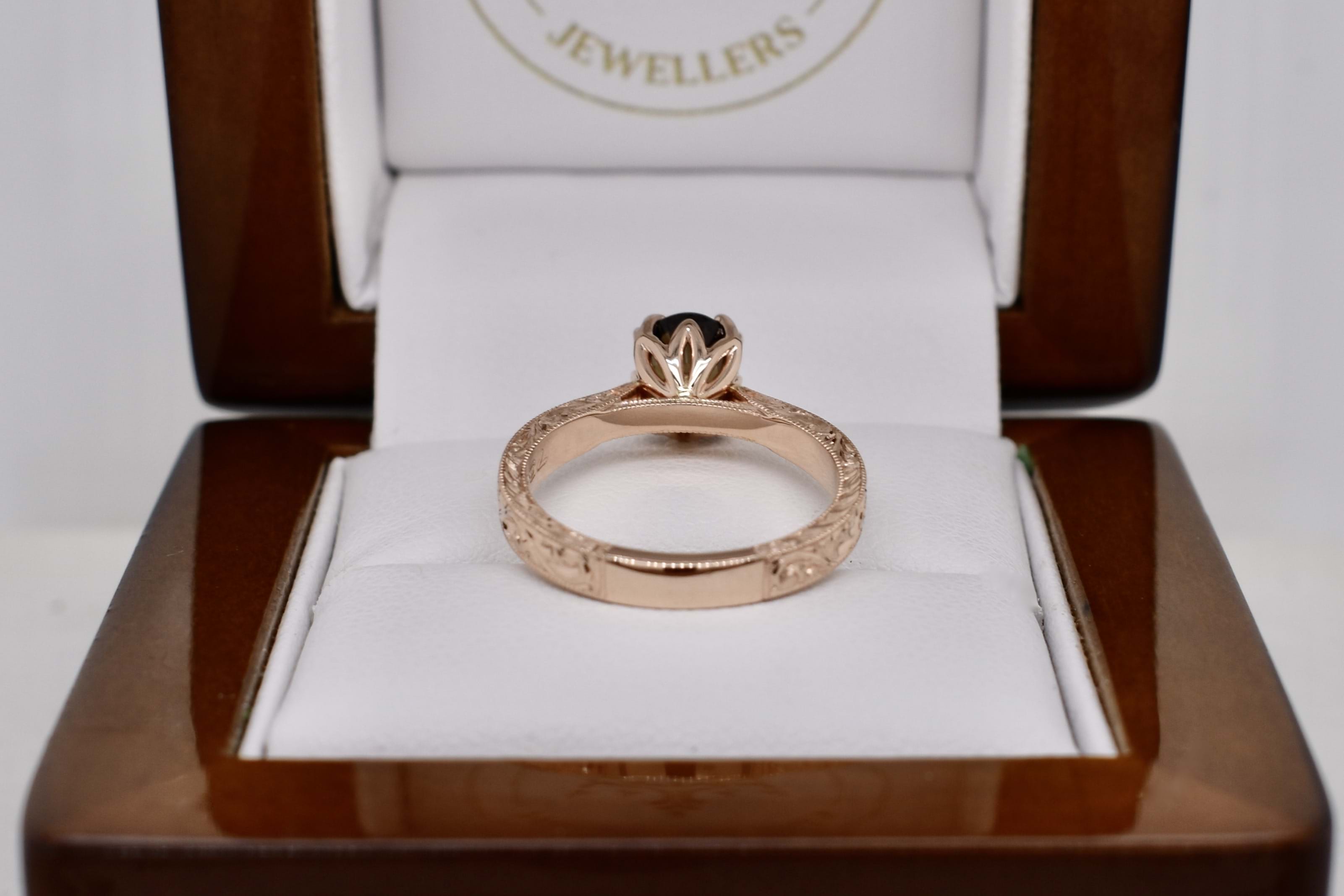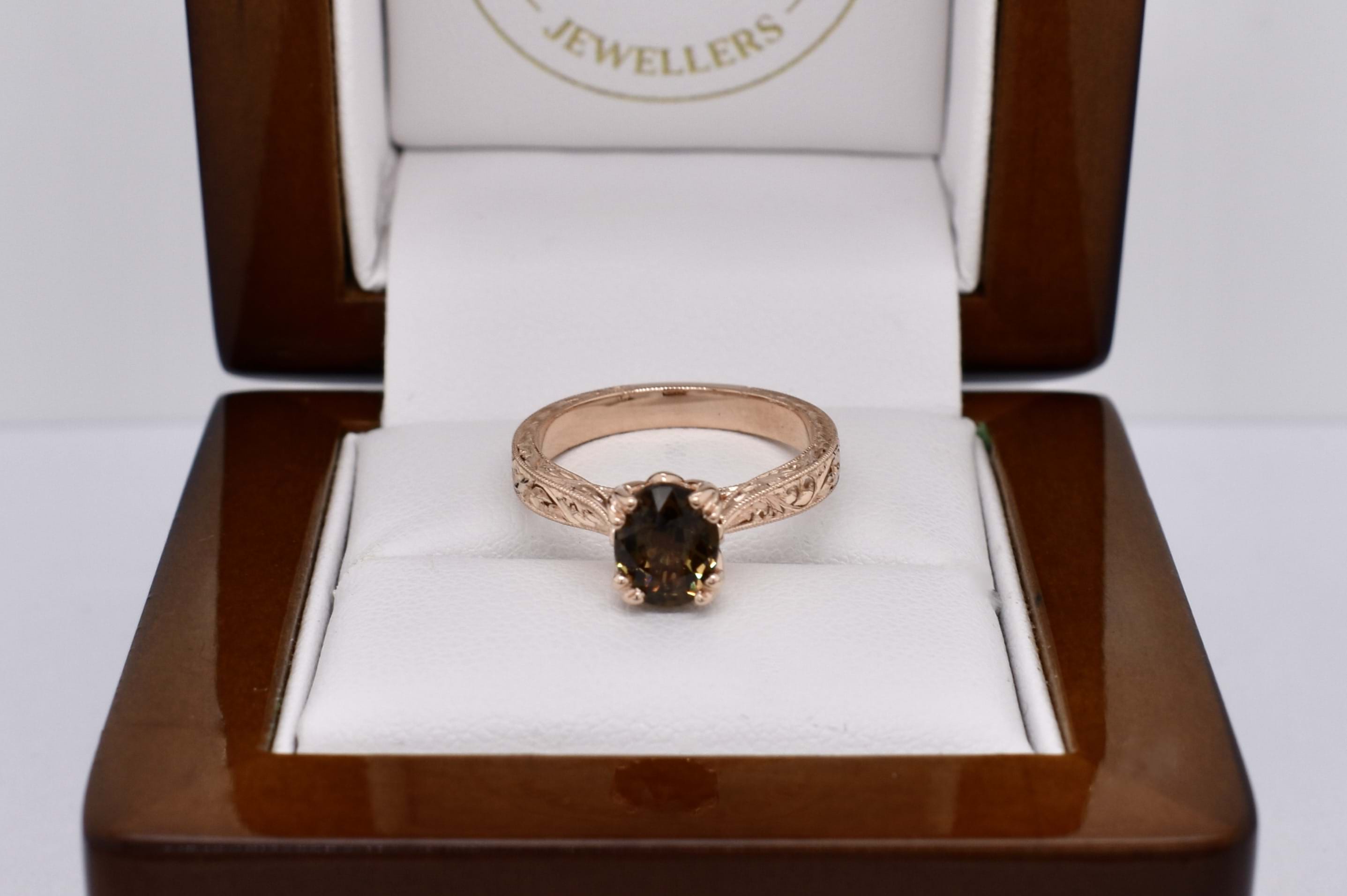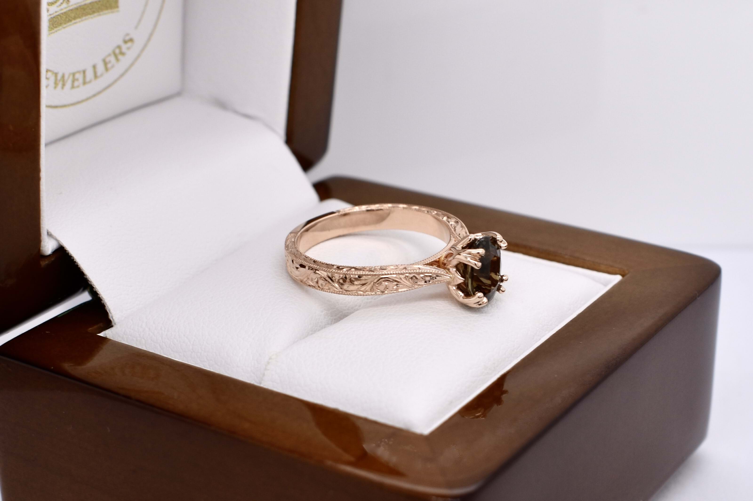 Rare and beautiful. With their hearts set on a natural Alexandrite for their engagement ring we sourced this lovely 1.38ct gemstone especially for our clients. The ring was designed in store alongside our clients and has been crafted in 18ct rose gold with the Alexandrite set into a decorative, four double talon, scalloped basket with a millgrain edge band that has been intricately hand engraved on the top and sides. Independent Valuation Supplied.