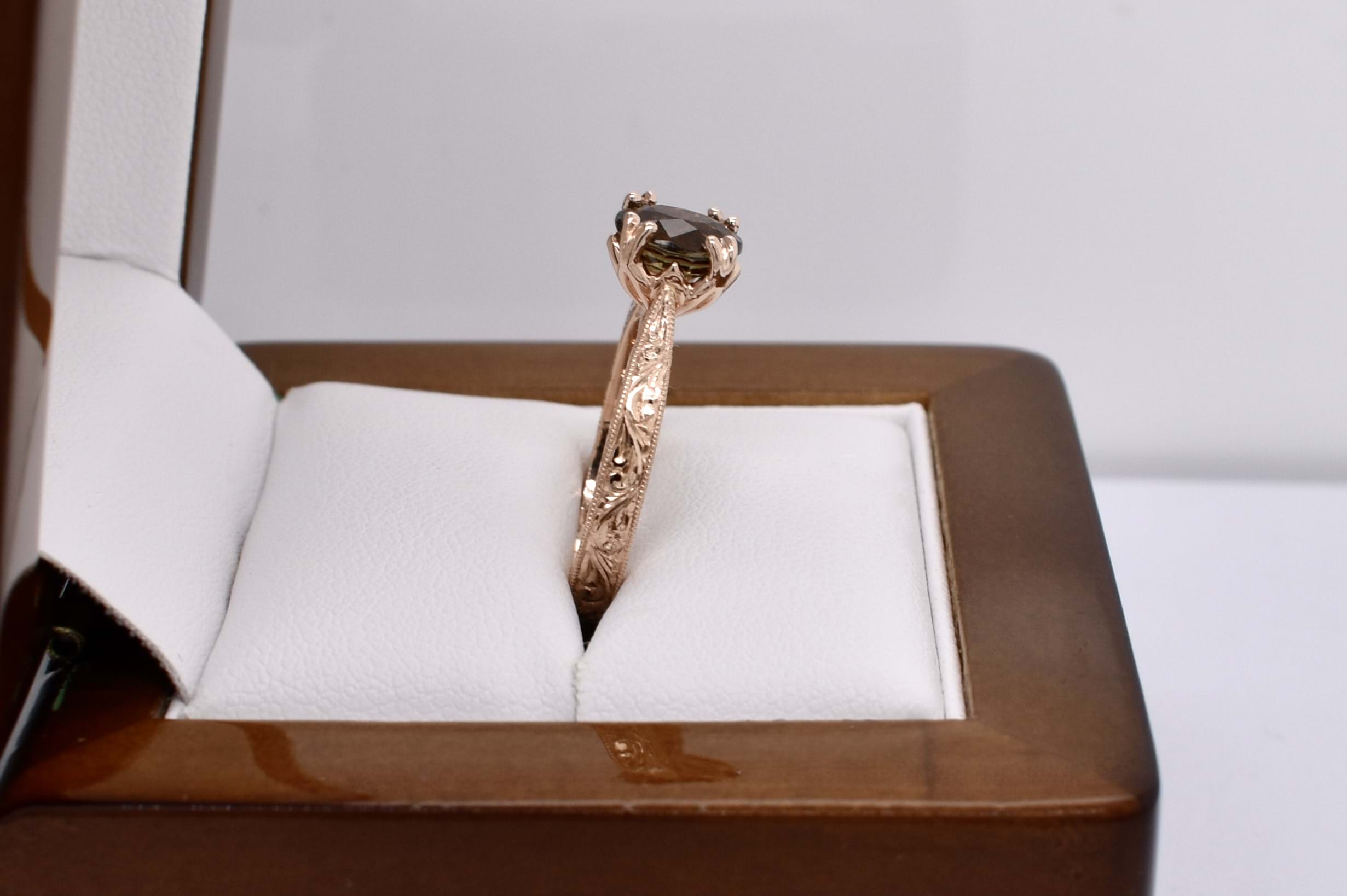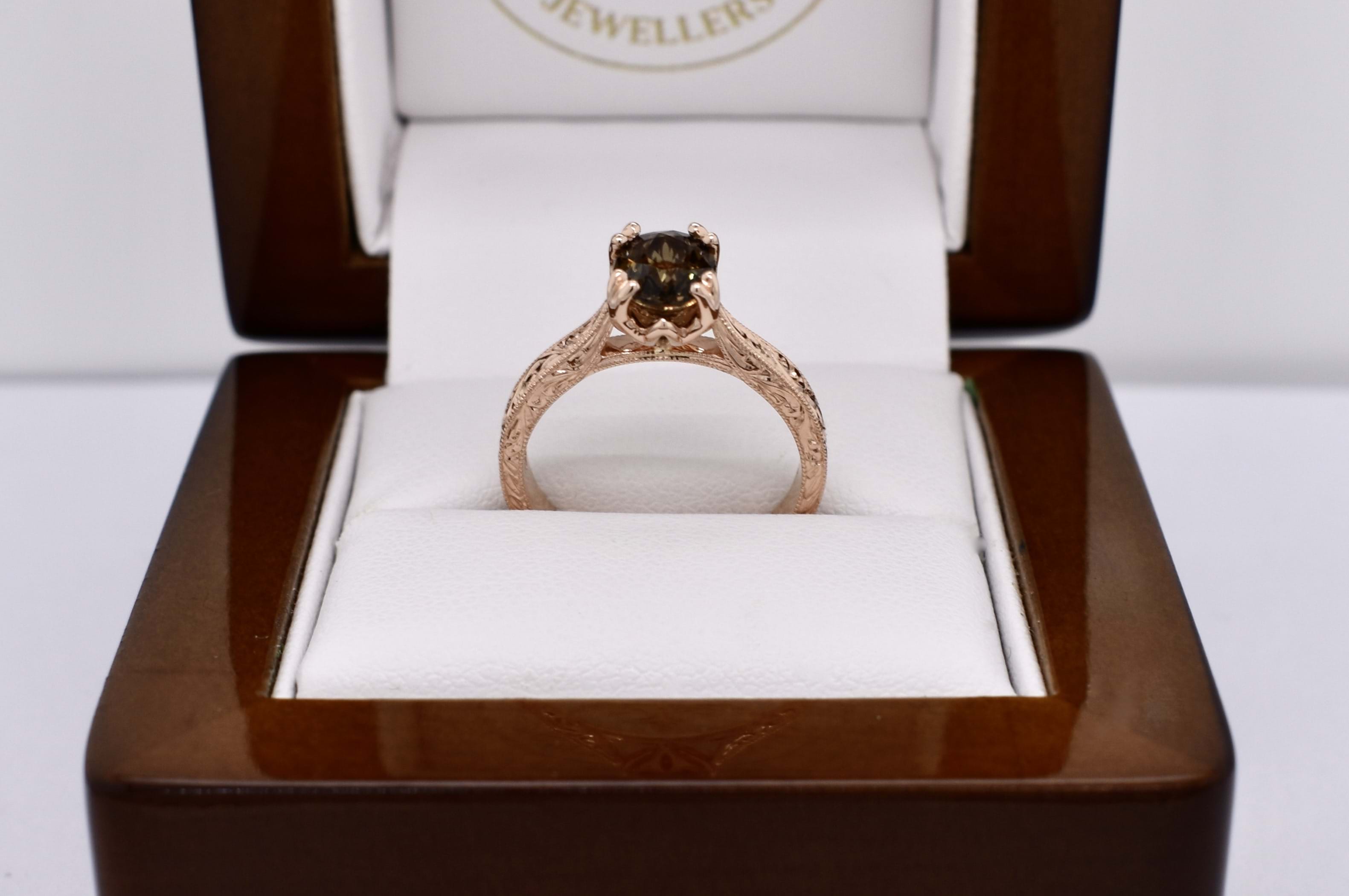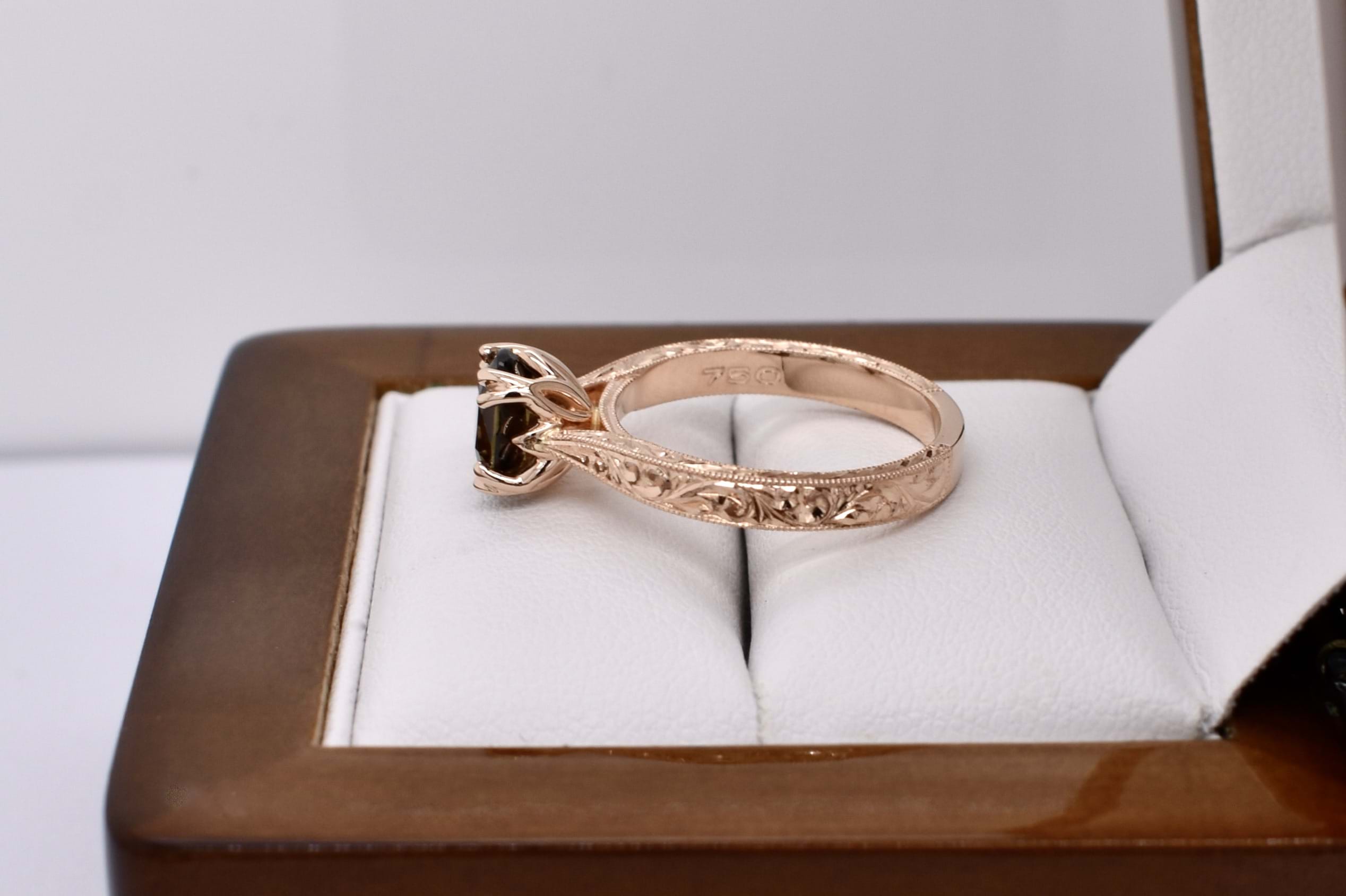 Rare and beautiful. With their hearts set on a natural Alexandrite for their engagement ring we sourced this lovely 1.38ct gemstone especially for our clients. The ring was designed in store alongside our clients and has been crafted in 18ct rose gold with the Alexandrite set into a decorative, four double talon, scalloped basket with a millgrain edge band that has been intricately hand engraved on the top and sides. Independent Valuation Supplied.