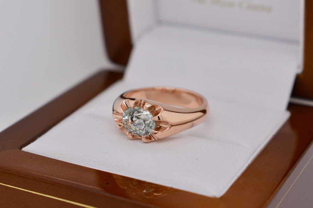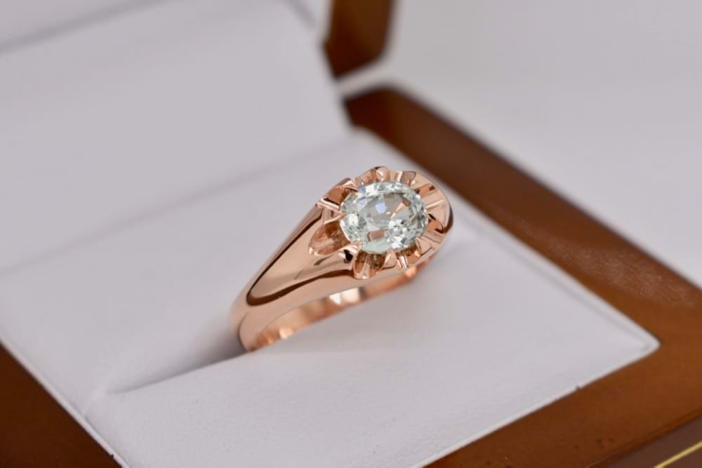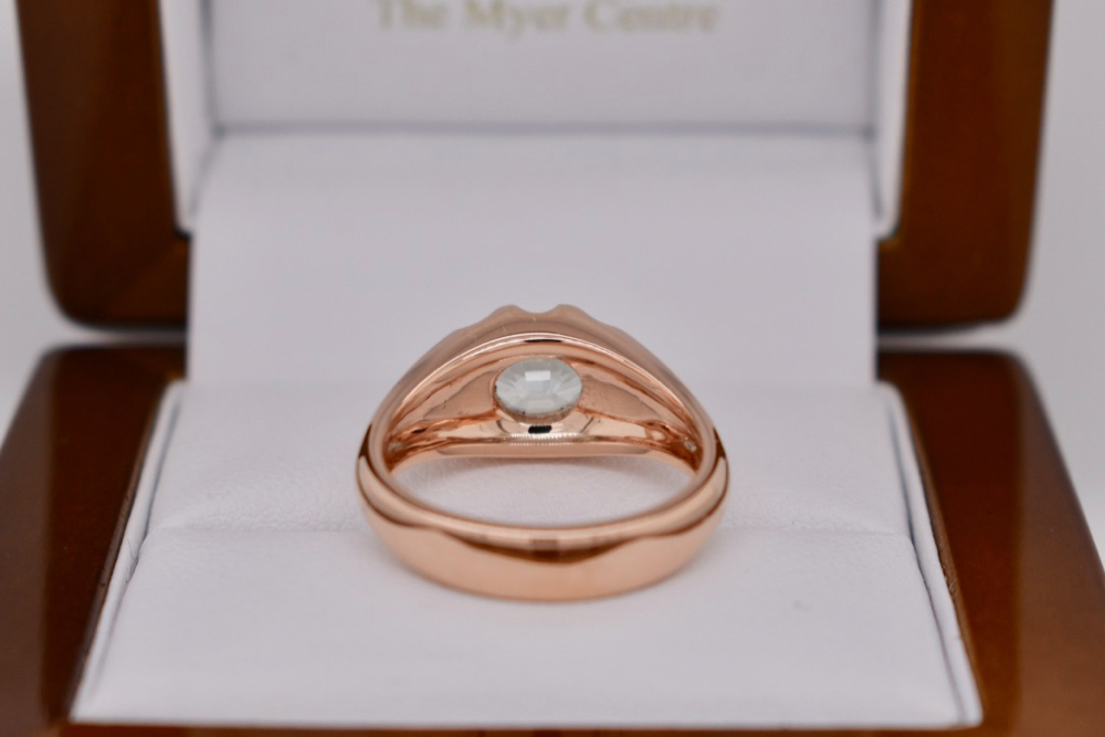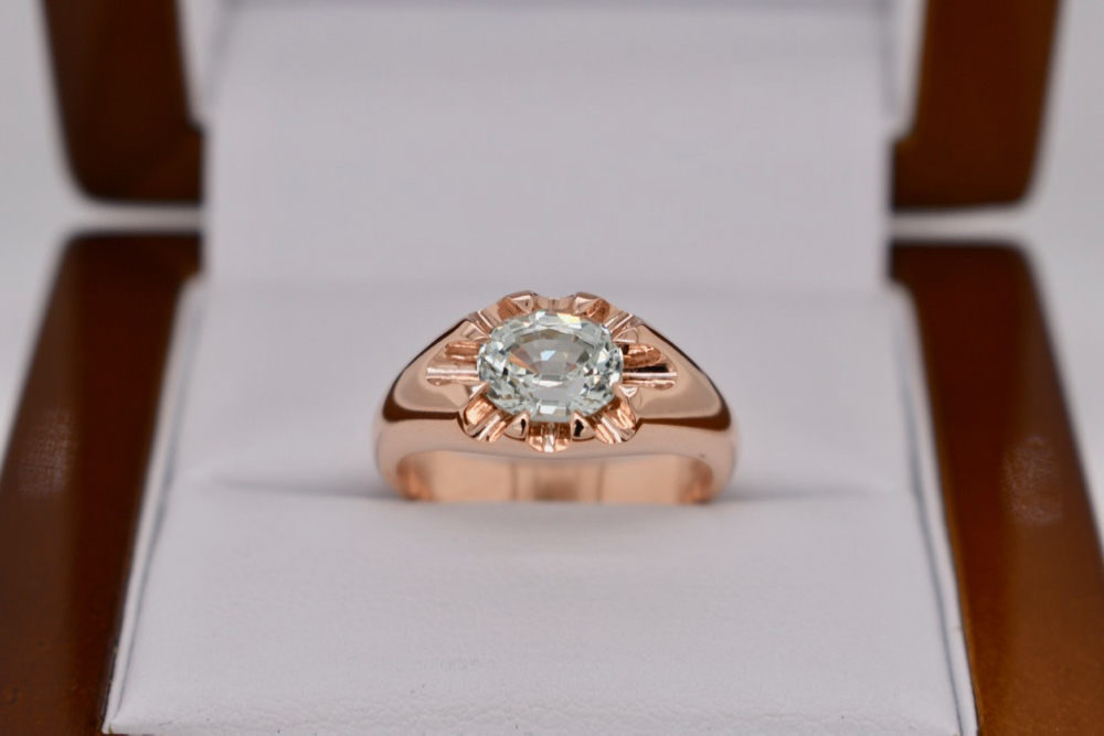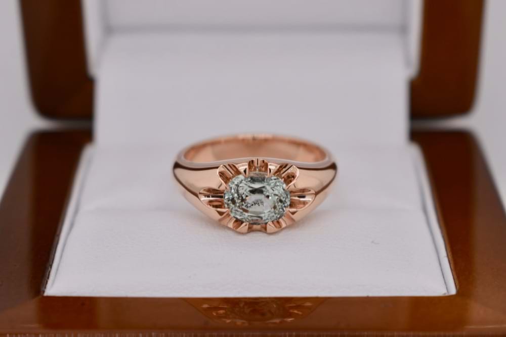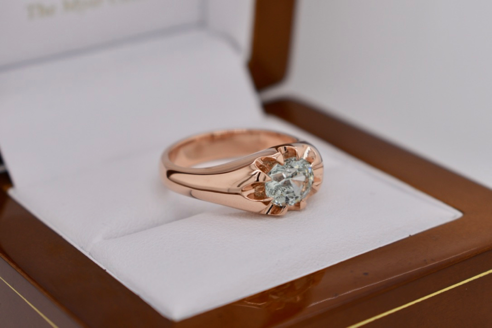 A rare and collectable gemstone acquired for an avid gem collector this Vanadium Chrysoberyl is a faceted oval of 1.69cts. Chrysoberyl is the third hardest gem family on the MOH scale and is most commonly found in yellow, yellowish-green or brown around the world, this particular gemstone, likely from Tanzania, is made special by the presence of Vanadium which is giving the stone its rare green tone. The ring was designed in store alongside one of our chief design consultants to feature the stone from every angle. Crafted in our workshop in 18ct rose gold, this gents ring makes a timeless but unusual addition to our clients collection. Independent Valuation Supplied. If you are inspired by this archived design contact us today to discuss how we can create something incredible for you or your loved one.