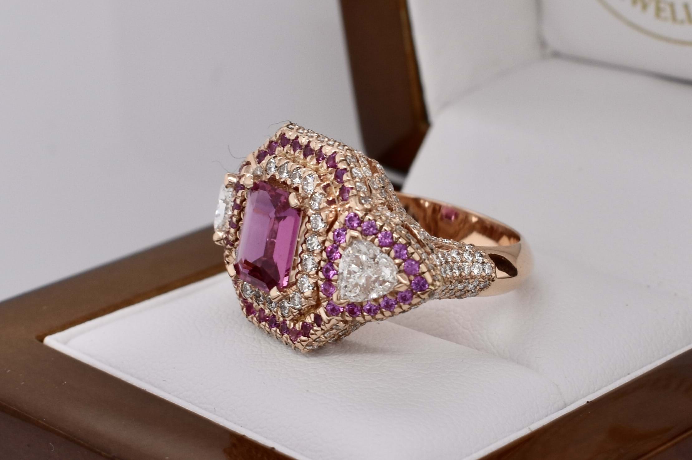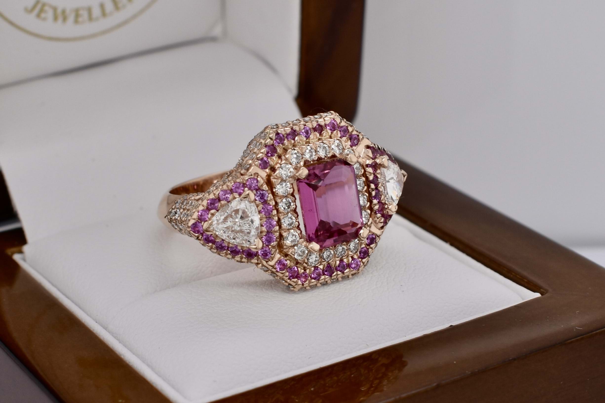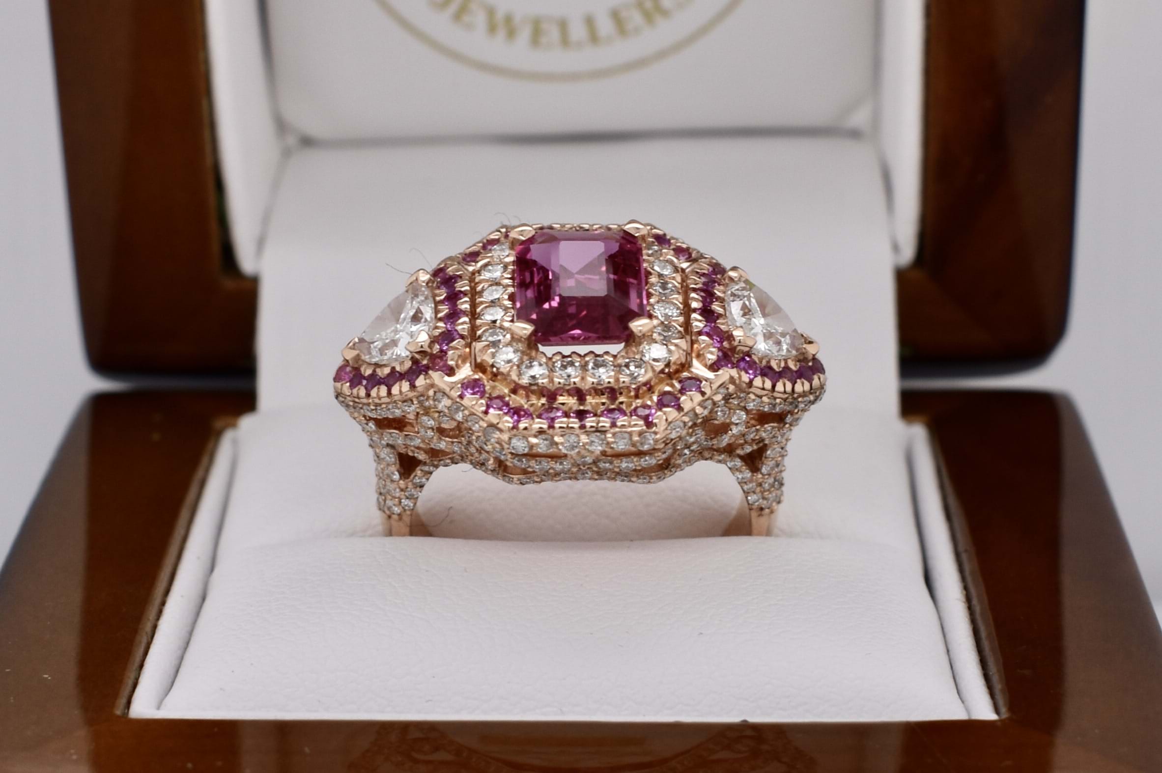 Epic and fabulously pink! This sensational bespoke creation was designed instore alongside our client with all pink sapphires and diamonds sourced and hand selected for the project. Crafted in 18ct rose gold the piece features a central 2.07ct emerald cut pink sapphire surrounded by a halo of shimmering white diamonds and vivid pink sapphires with a spectacular trilliant cut diamond on each side also surrounded with a halo of hot pink sapphires. The scroll gallery is totally encrusted is sparkling white diamonds, allowing the wearer to appreciate the beautiful ring for every single angle. The 48 small vivid pink sapphires total 0.81cts and the 282 exceptional E/F colour diamonds total 2.12cts. Independent Valuation Supplied.