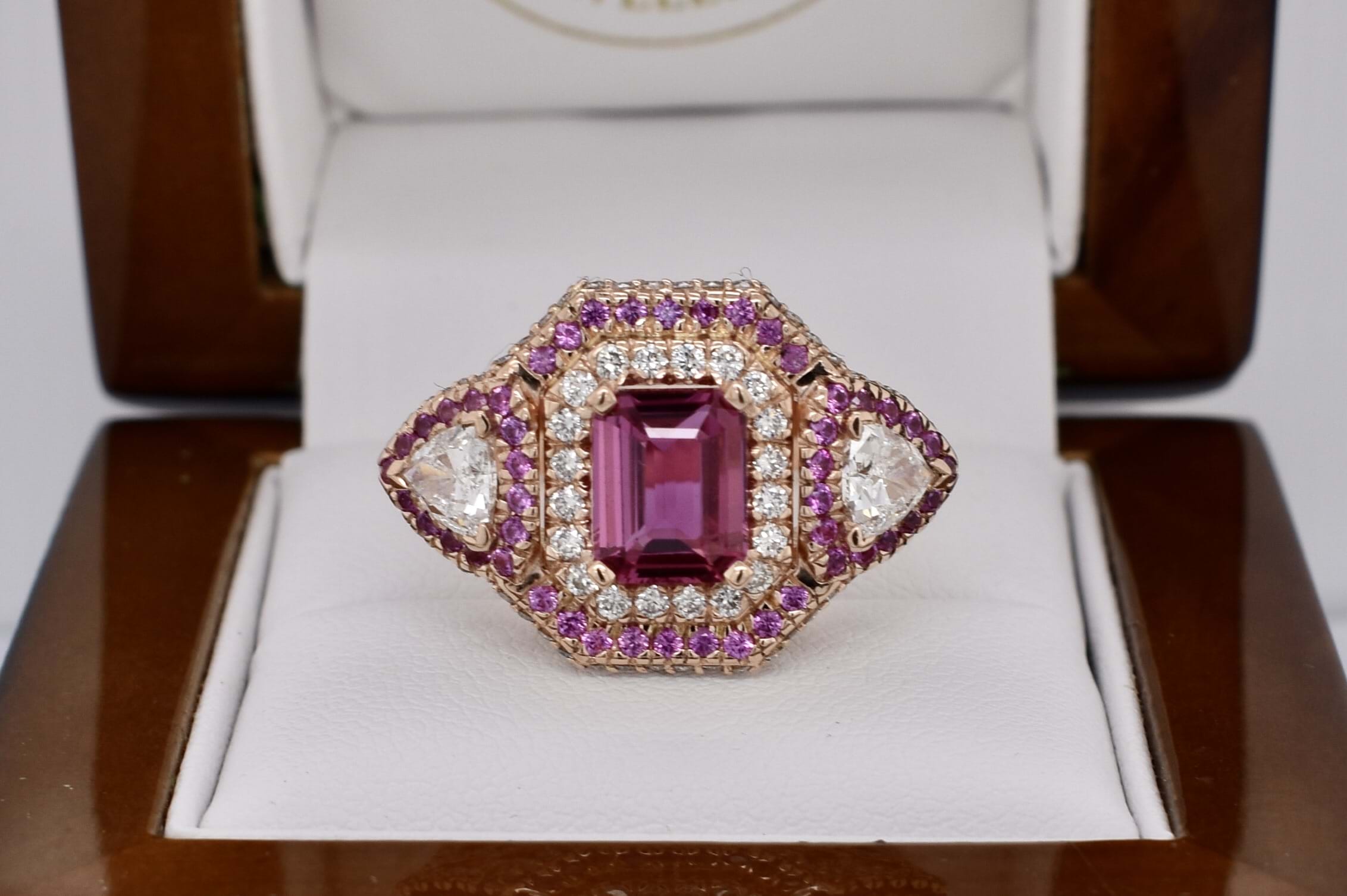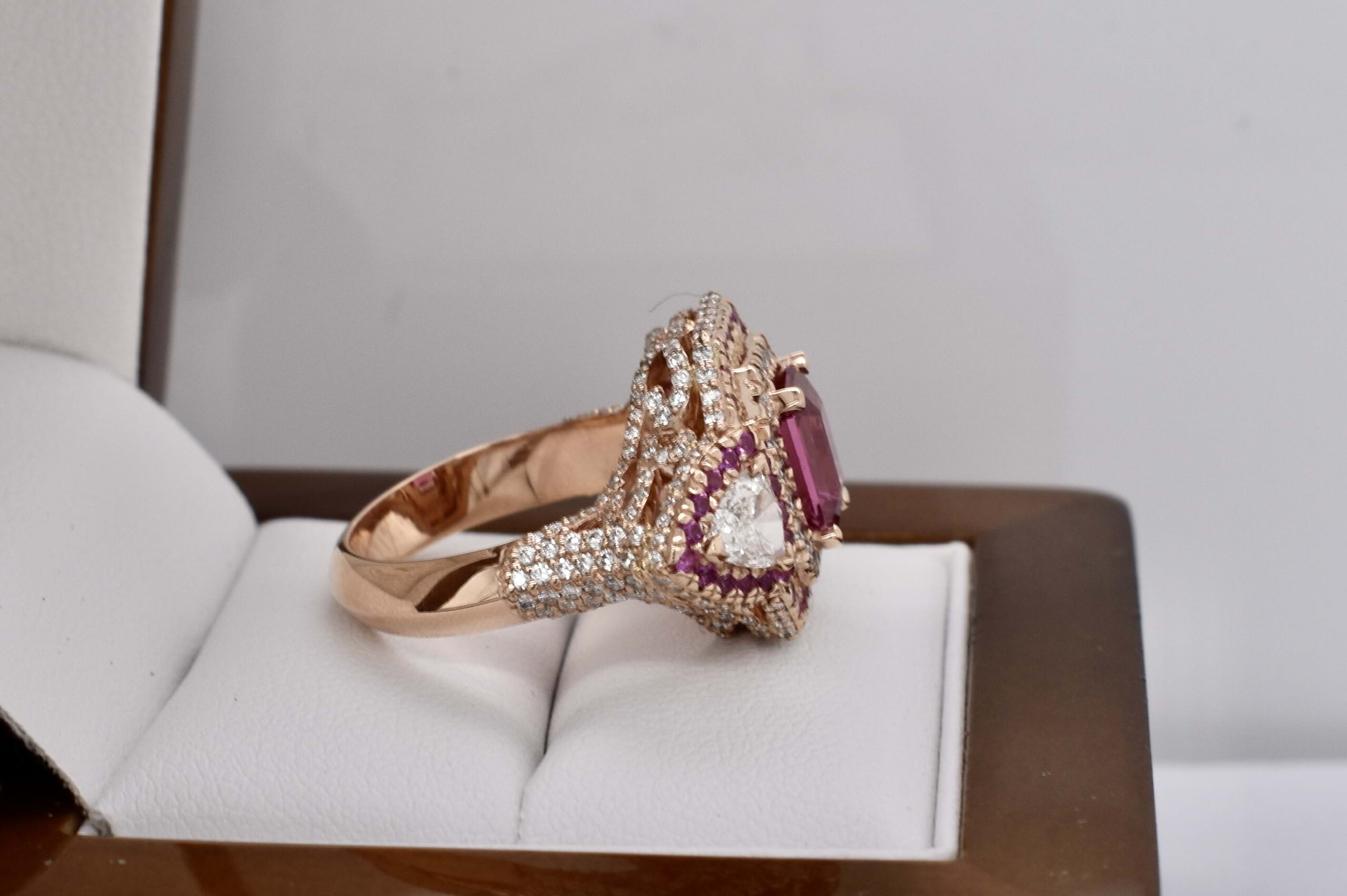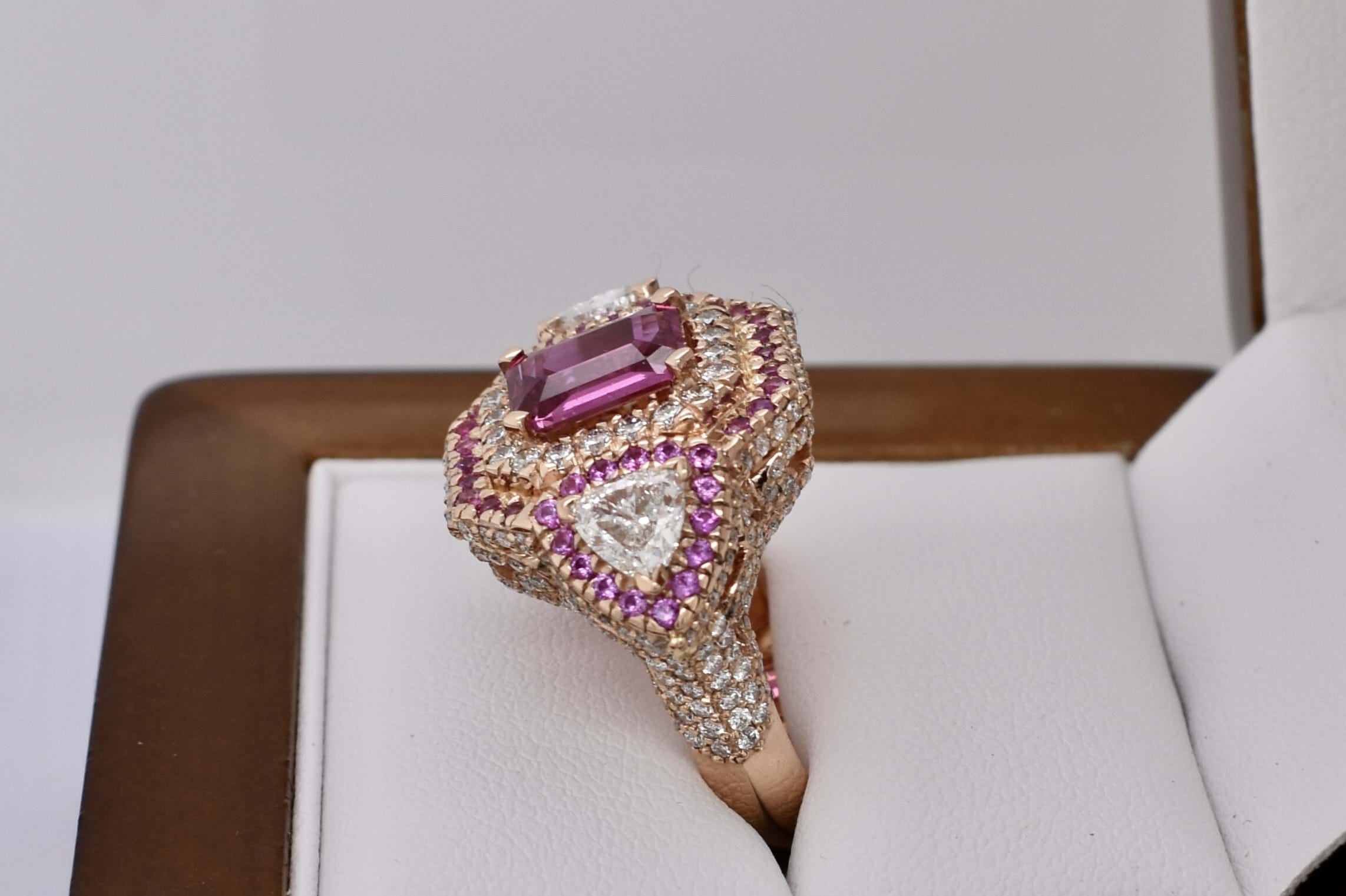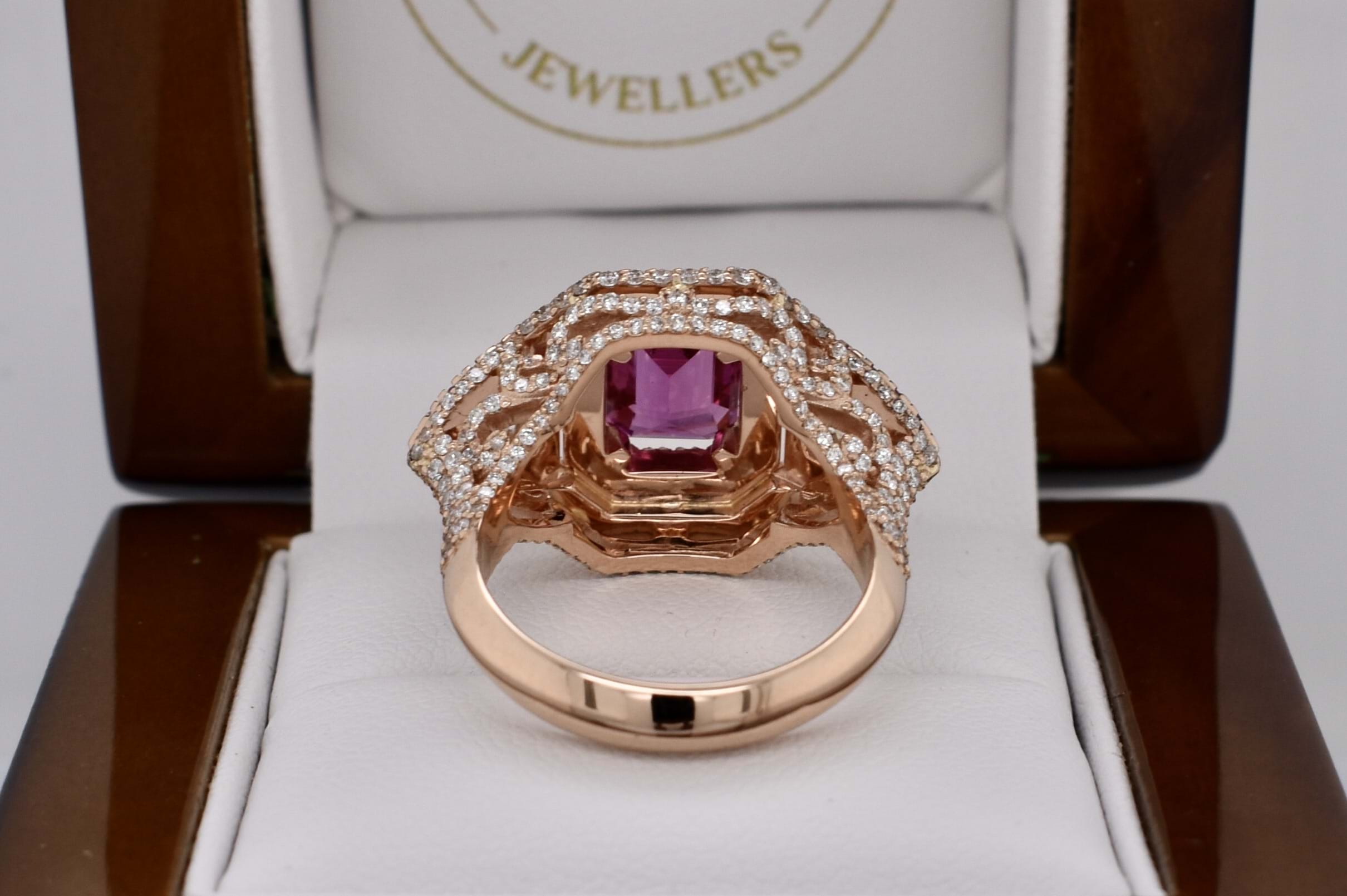 Epic and fabulously pink! This sensational bespoke creation was designed instore alongside our client with all pink sapphires and diamonds sourced and hand selected for the project. Crafted in 18ct rose gold the piece features a central 2.07ct emerald cut pink sapphire surrounded by a halo of shimmering white diamonds and vivid pink sapphires with a spectacular trilliant cut diamond on each side also surrounded with a halo of hot pink sapphires. The scroll gallery is totally encrusted is sparkling white diamonds, allowing the wearer to appreciate the beautiful ring for every single angle. The 48 small vivid pink sapphires total 0.81cts and the 282 exceptional E/F colour diamonds total 2.12cts. Independent Valuation Supplied.