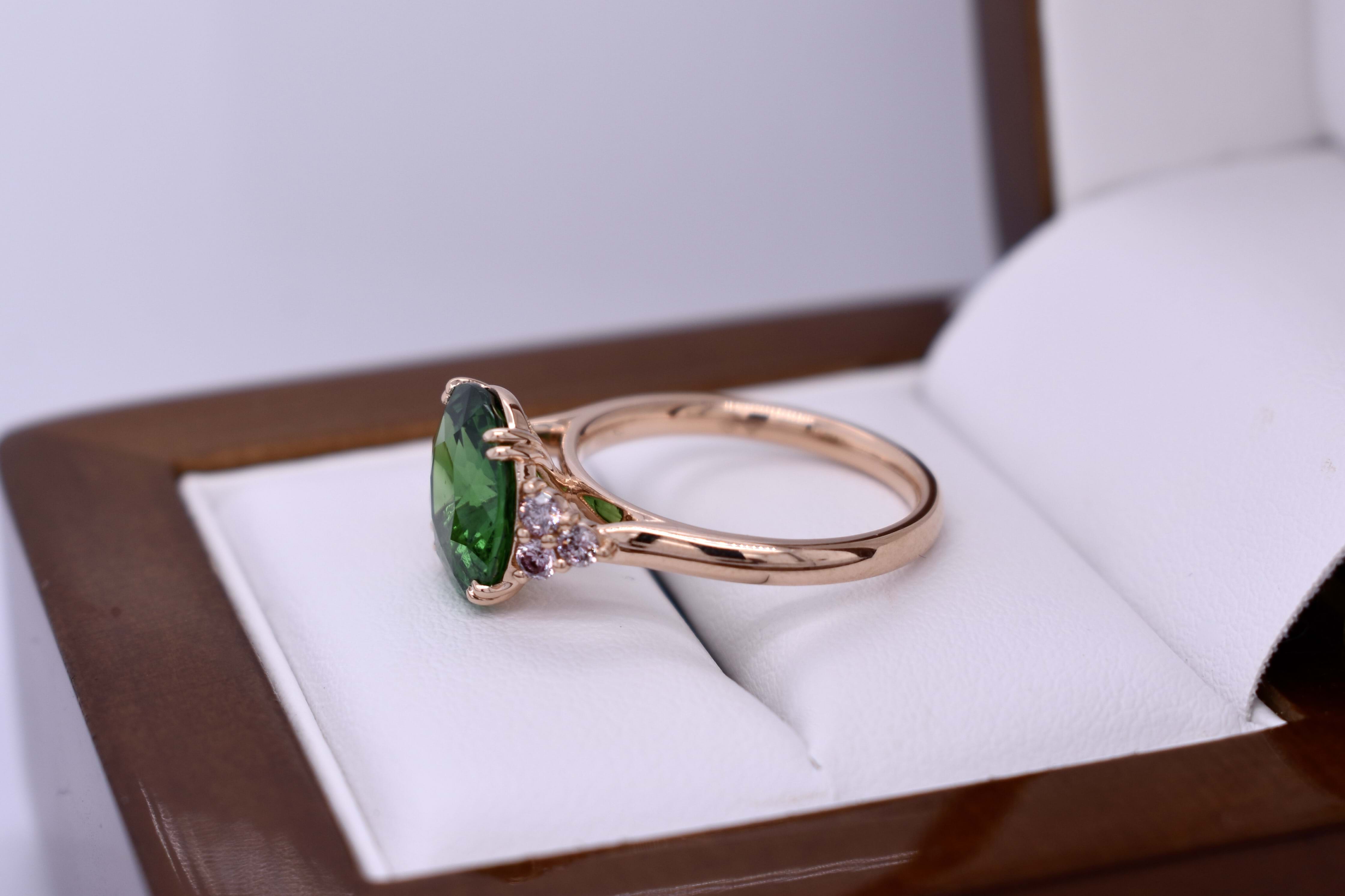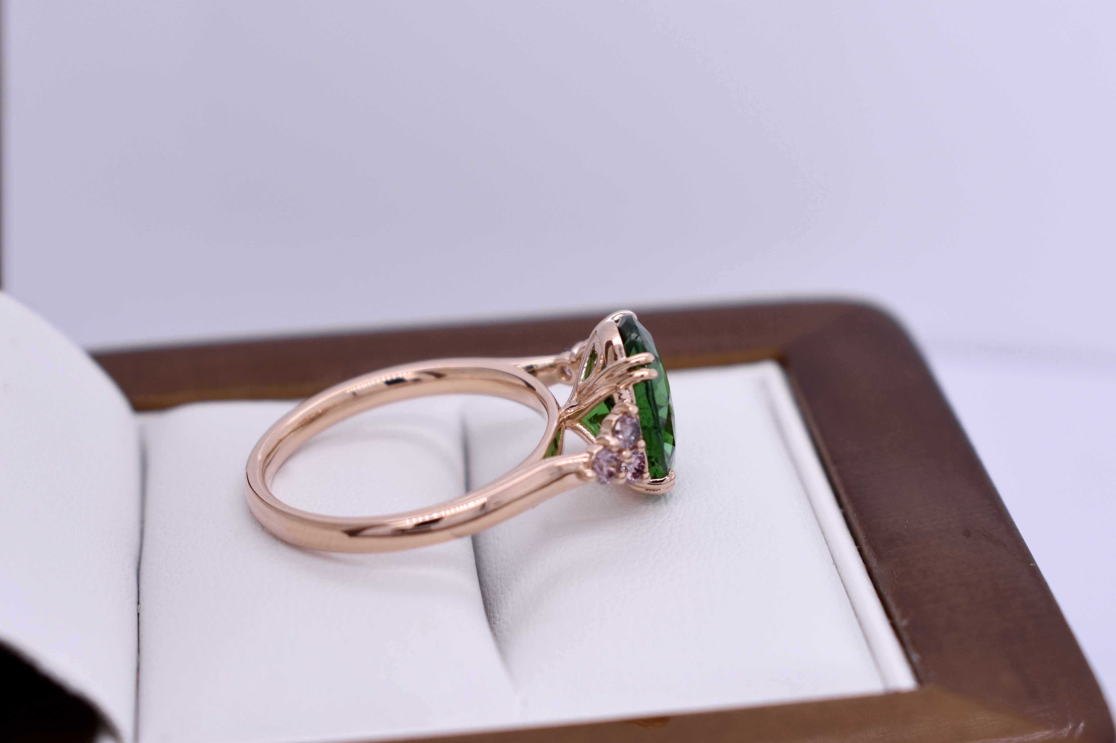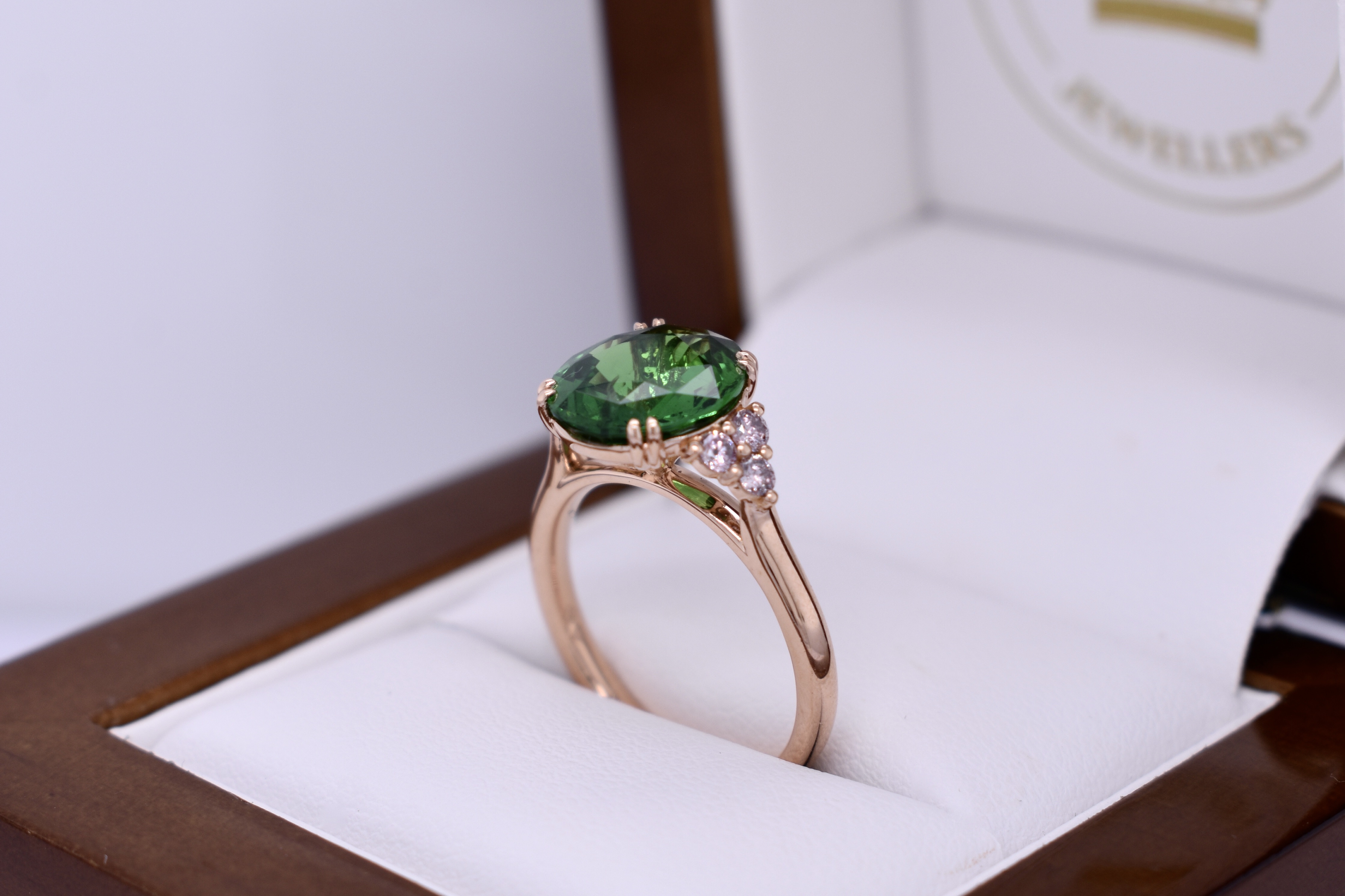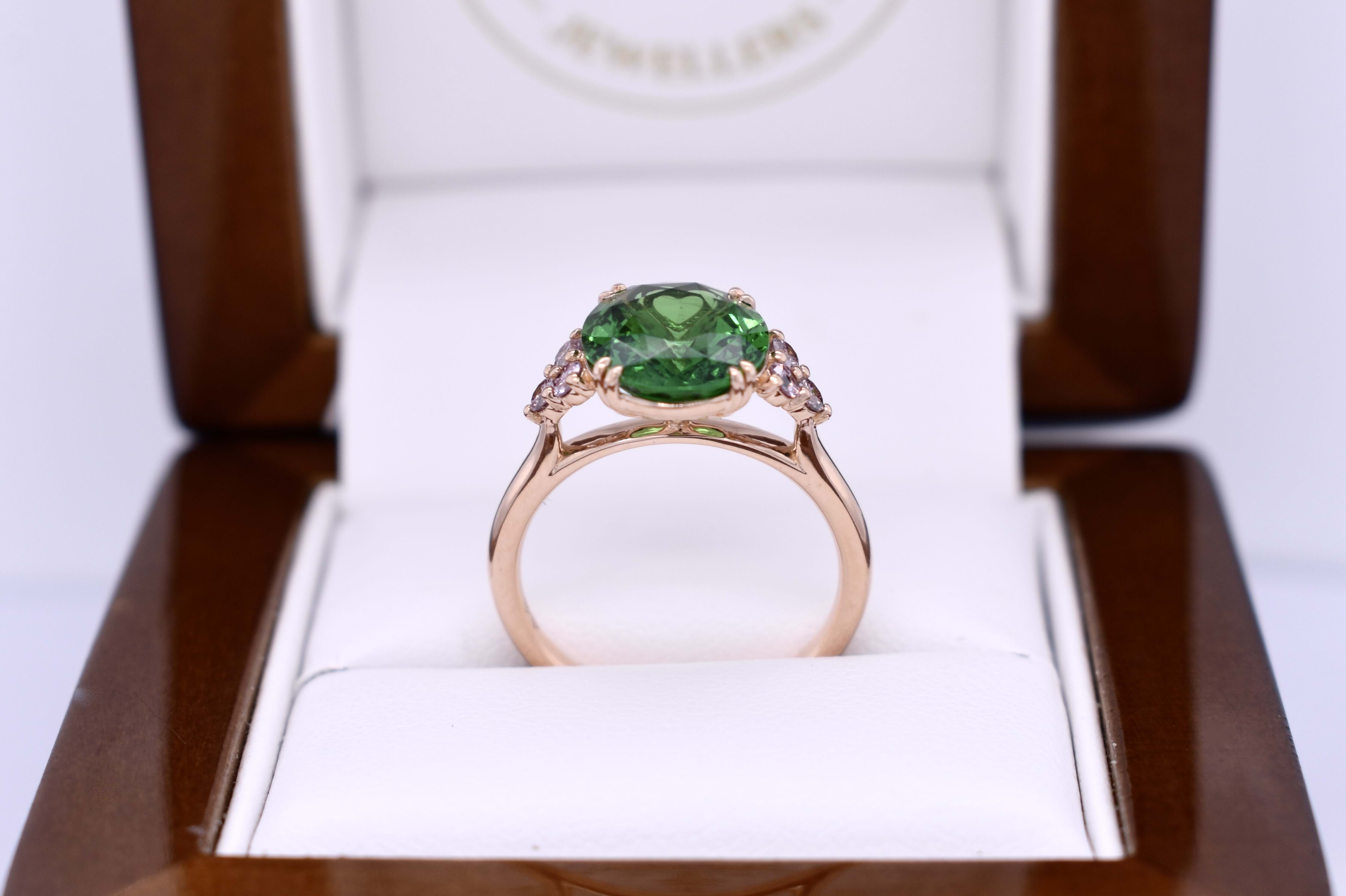 Totally sensational and custom engagement ring! This stunning custom made engagement ring was designed in store alongside our client and is a result of sourcing a selection of rare and beautiful Tsavorite garnets and pink diamonds. The centre stone is a 3.52ct bright, mid green, Tsavorite garnet, four double talon claw set and flanked on each side by three shimmering pink diamonds on a rolled comfort profile band. The pink diamonds total 0.22ct and are fancy light purplish pink in grading, the ring has been crafted in 18ct rose gold and is designed to sit perfectly with wedding bands.