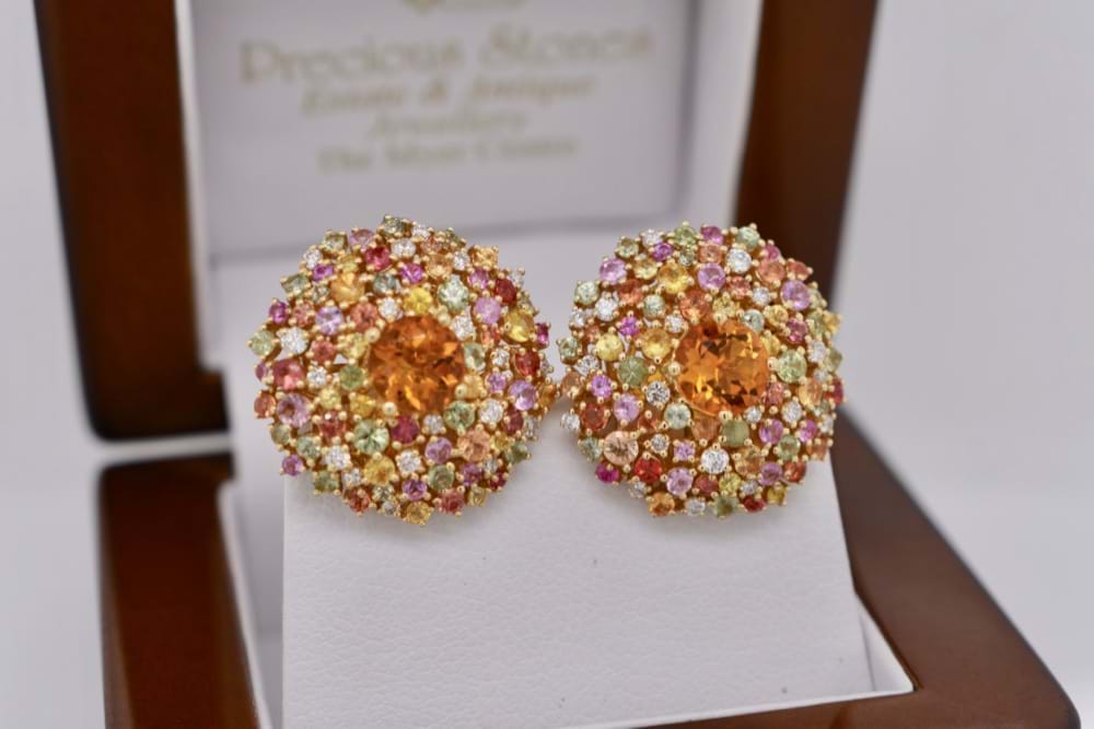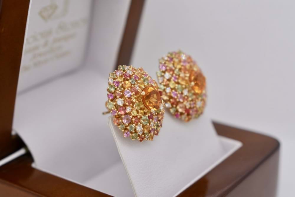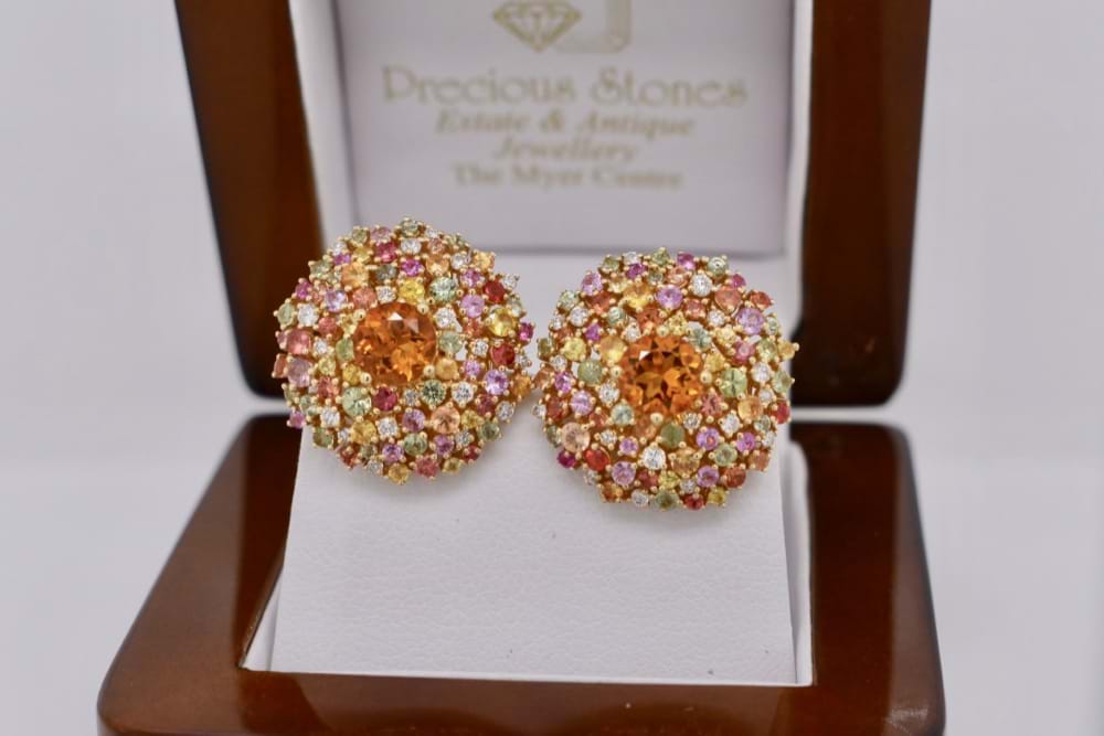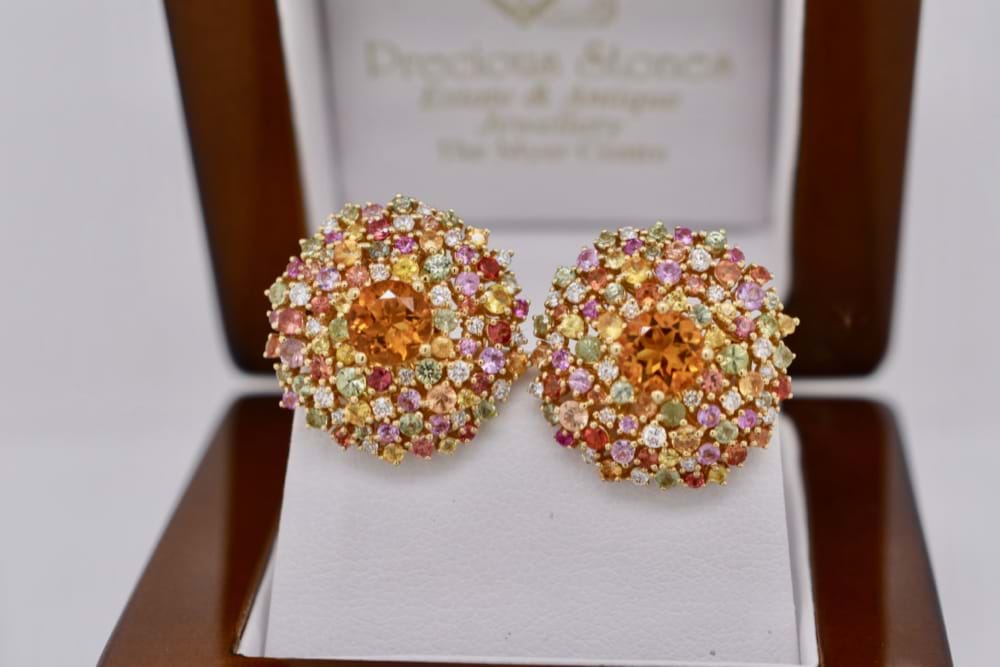 A magical mix of natural sapphires in rainbow Autumn colours set into fantastic large domed 18ct rose gold stud earrings with round citrine centres. Independent Valuation Supplied. If you are inspired by this archived design contact us today to discuss how we can create something incredible for you or your loved one.