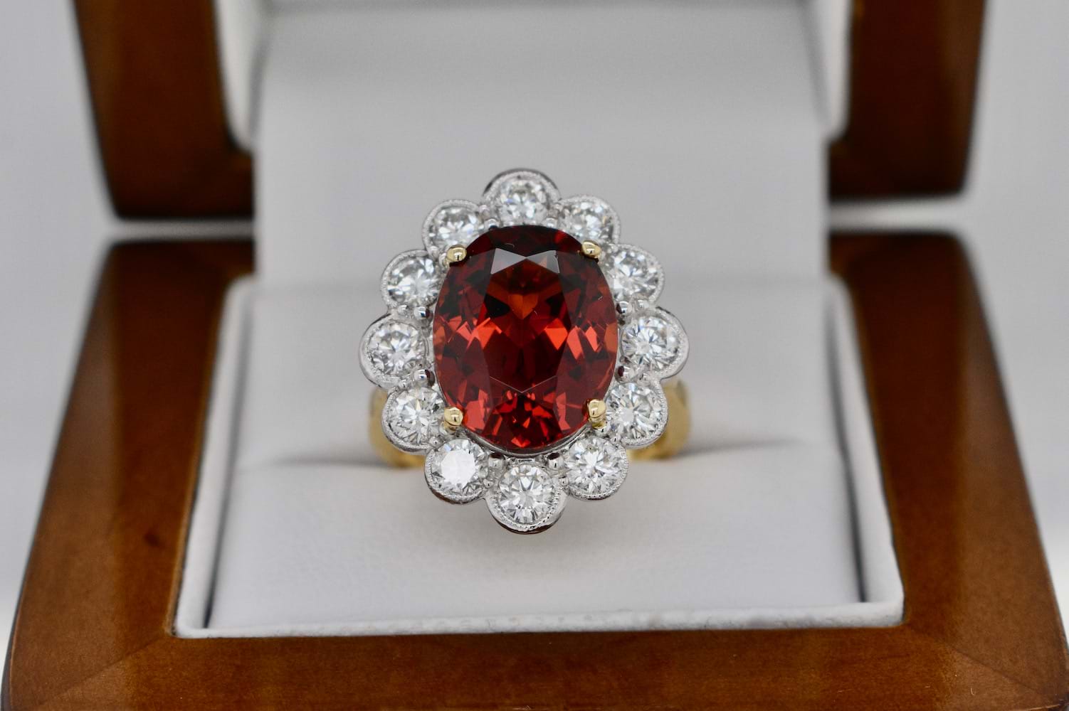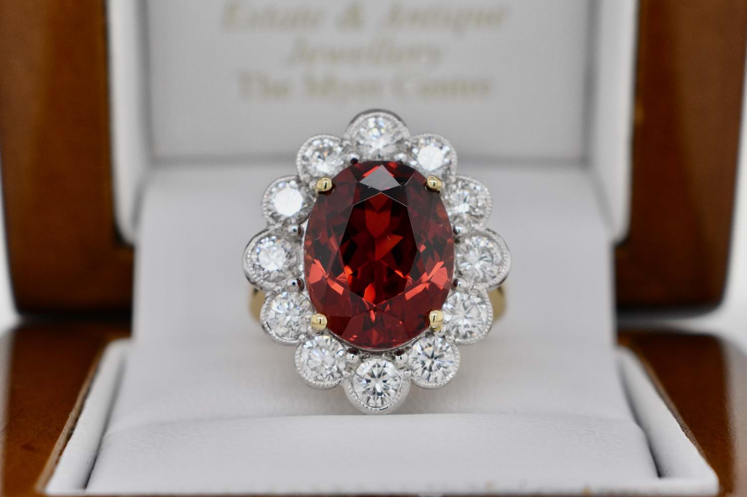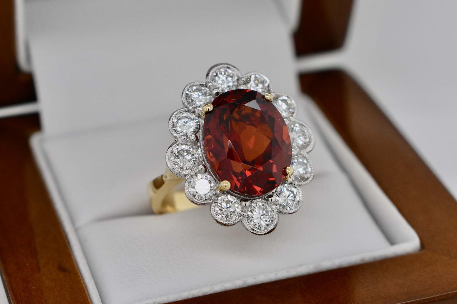 A stunning deep orange Spessartite garnet from Nigeria of 8.97cts set into four 18ct yellow gold claws and surrounded by 12 scintillating round brilliant cut diamonds in an 18ct white gold mill grain scalloped halo. The total diamond content in this beauty totals 1.82cts (GH/VS-SI) and has a beautiful wire under basket and a solid 18ct yellow gold band. Independent Valuation Supplied.