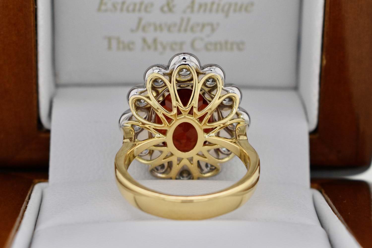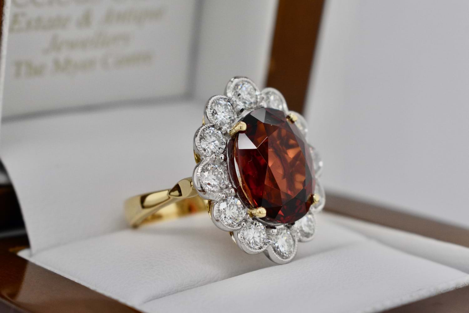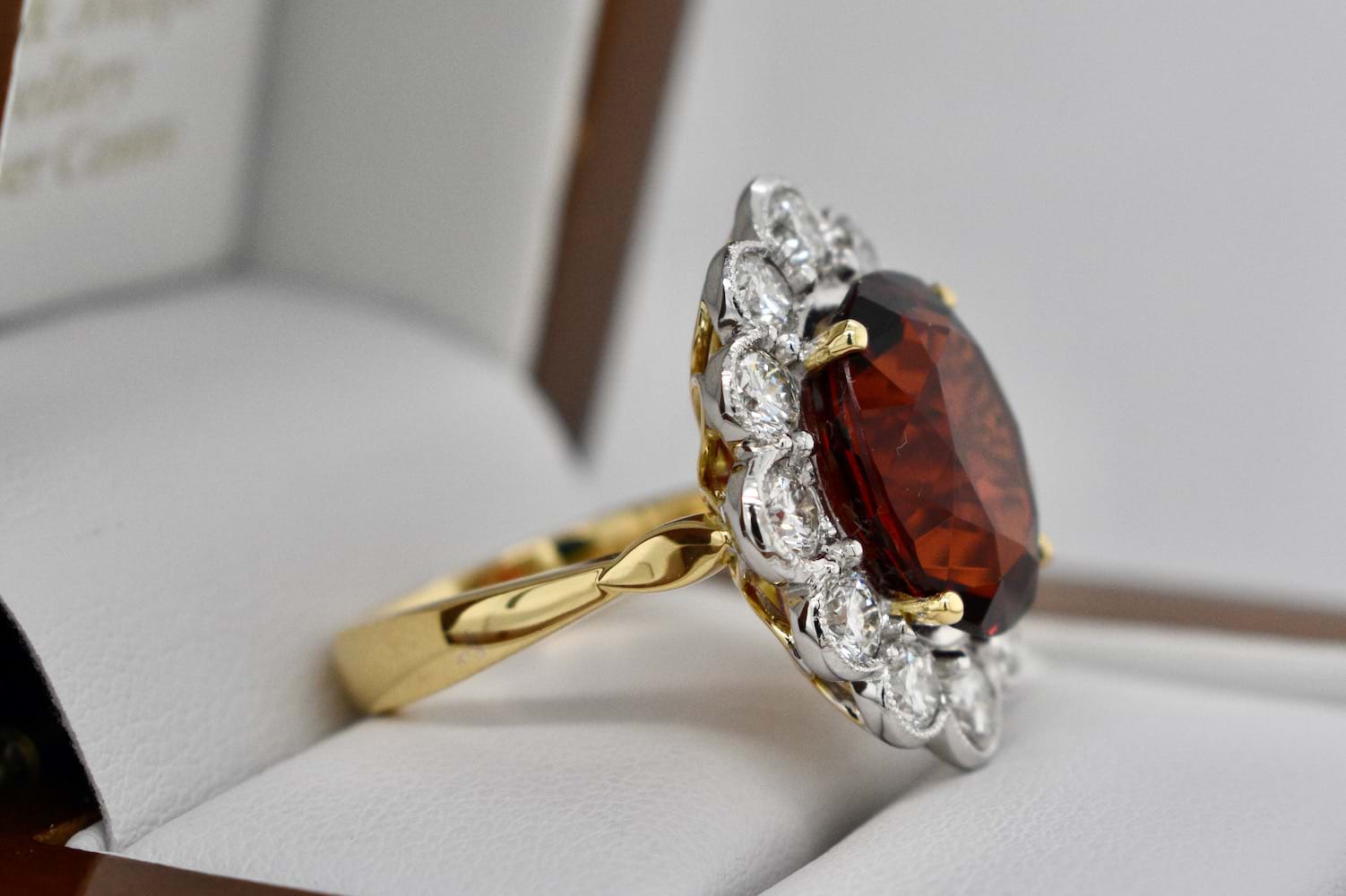 A stunning deep orange Spessartite garnet from Nigeria of 8.97cts set into four 18ct yellow gold claws and surrounded by 12 scintillating round brilliant cut diamonds in an 18ct white gold mill grain scalloped halo. The total diamond content in this beauty totals 1.82cts (GH/VS-SI) and has a beautiful wire under basket and a solid 18ct yellow gold band. Independent Valuation Supplied.