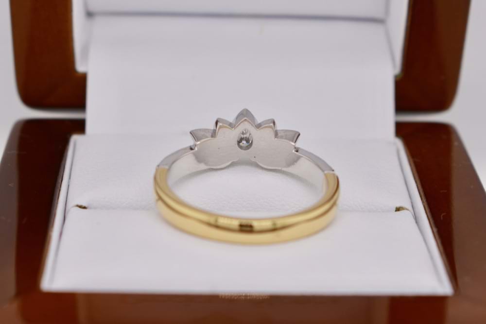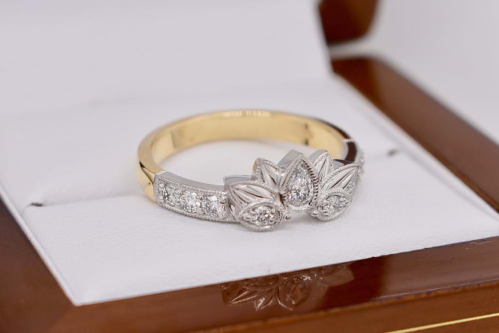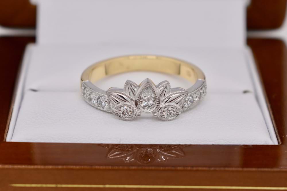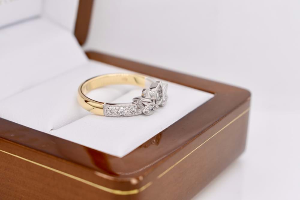 Designed to perfectly suit the clients existing engagement ring this gorgeous diamond band has an 18ct white gold top with diamonds grain set into mill-grain bezels and a heavy yellow gold shank. Total diamond content equals 0.50cts. Independent Valuation Supplied. If you are inspired by this archived design contact us today to discuss how we can create something incredible for you or your loved one.