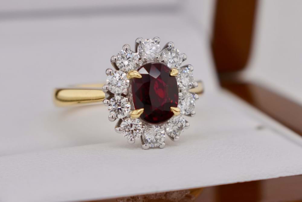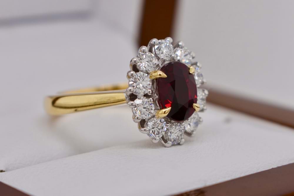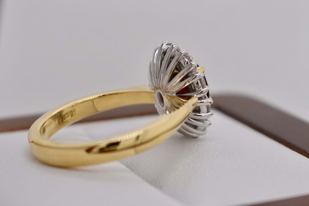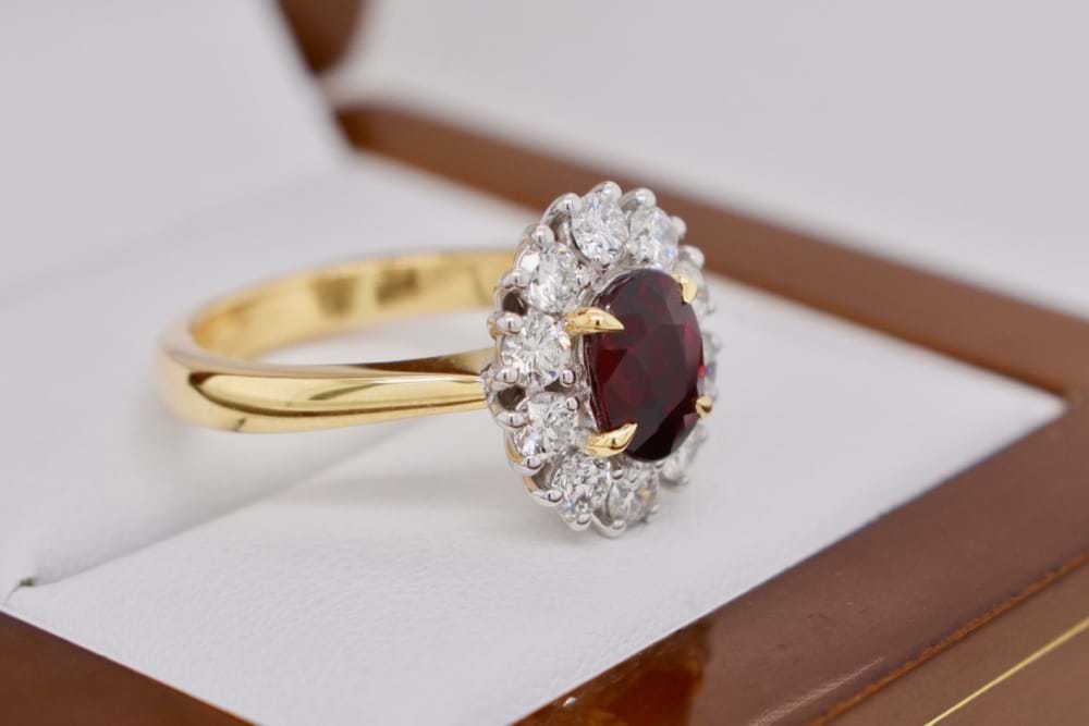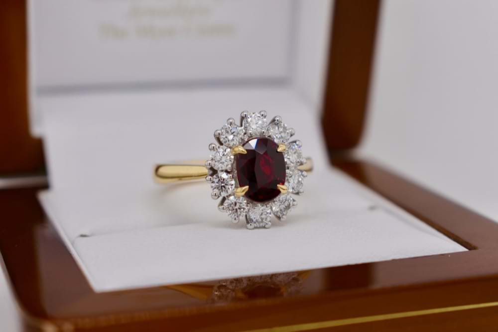 With the desire for a rare unheated natural ruby we were able to source and showcase to our client a selection of choices from which this stunning 1.51ct unheated 1.51ct Mozambique ruby was selected. Designed into a classic and timeless 18ct yellow and white gold cluster ring with 10 round brilliant cut diamonds totalling 0.97cts (FG/SI) it will no doubt be a treasured and valuable ring for generations to come. Independent Valuation Supplied. If you are inspired by this archived design contact us today to discuss how we can create something incredible for you or your loved one.