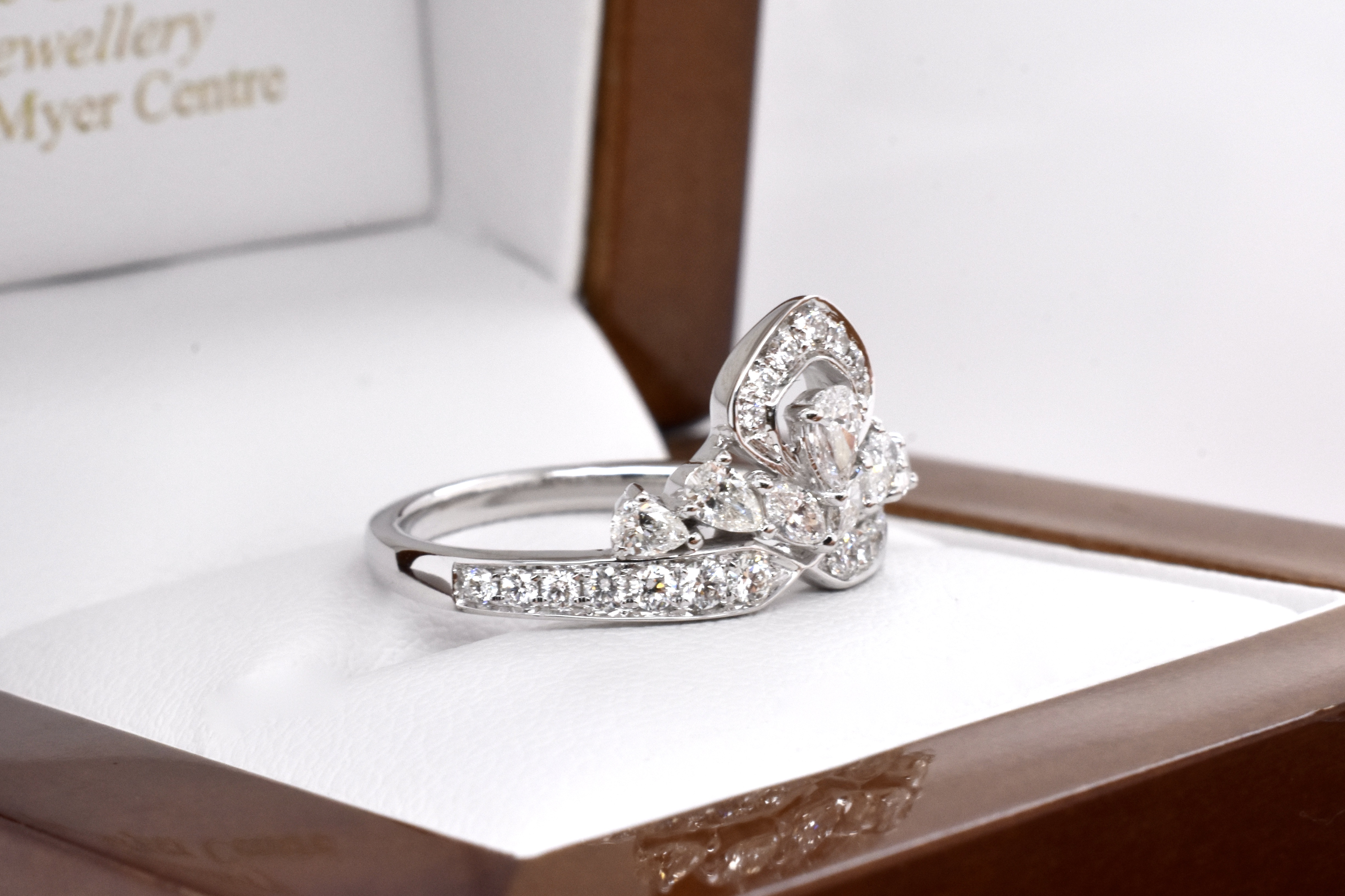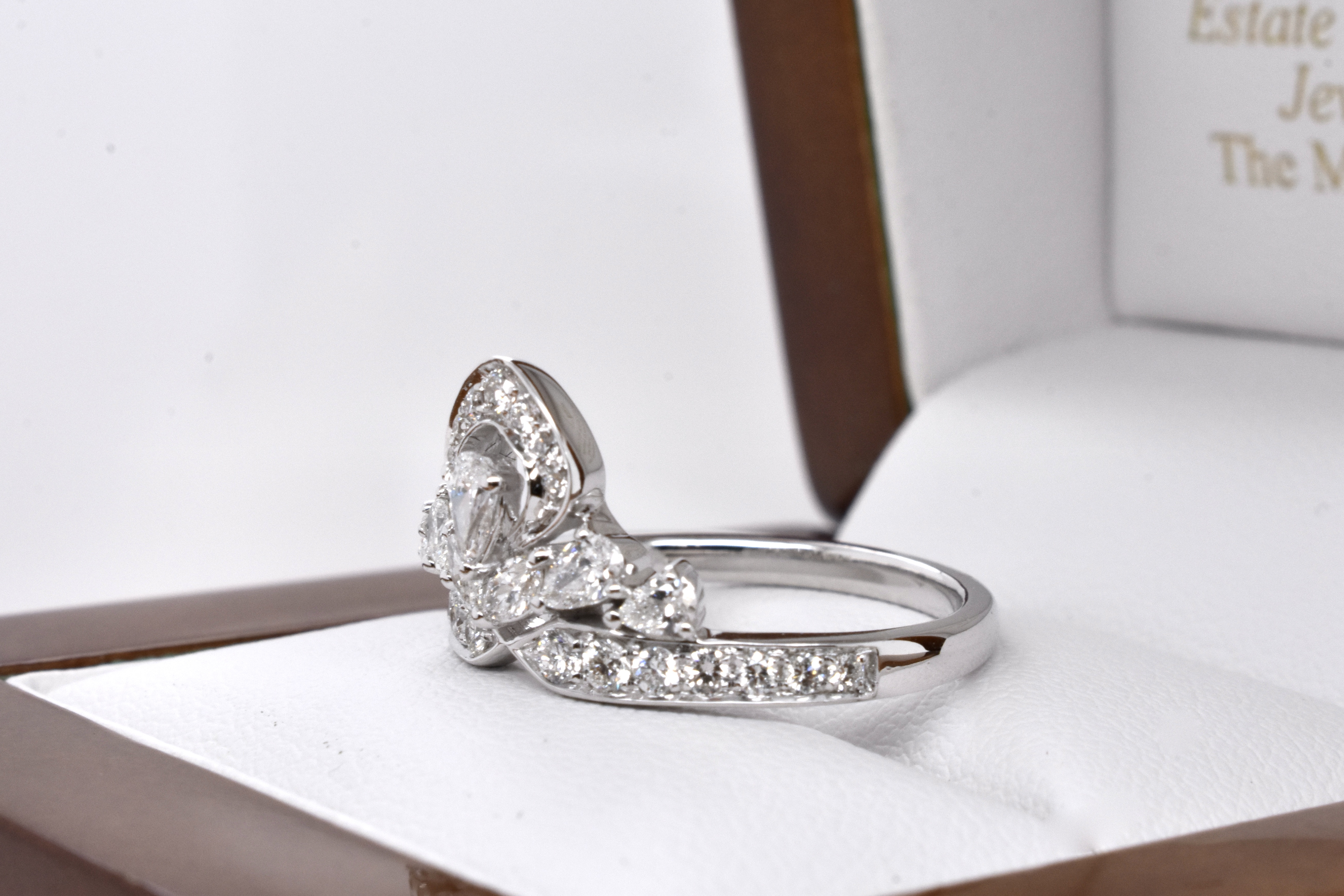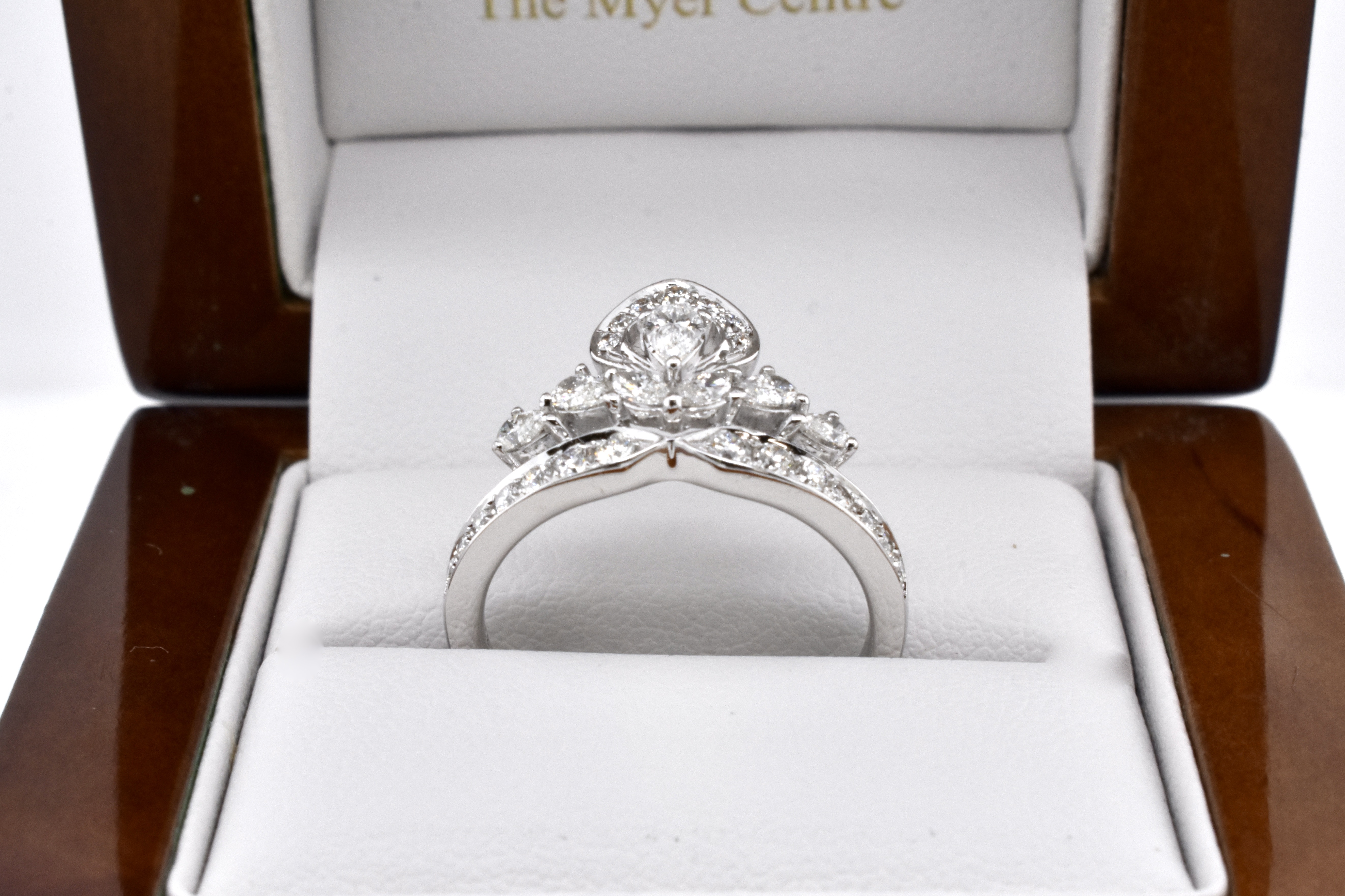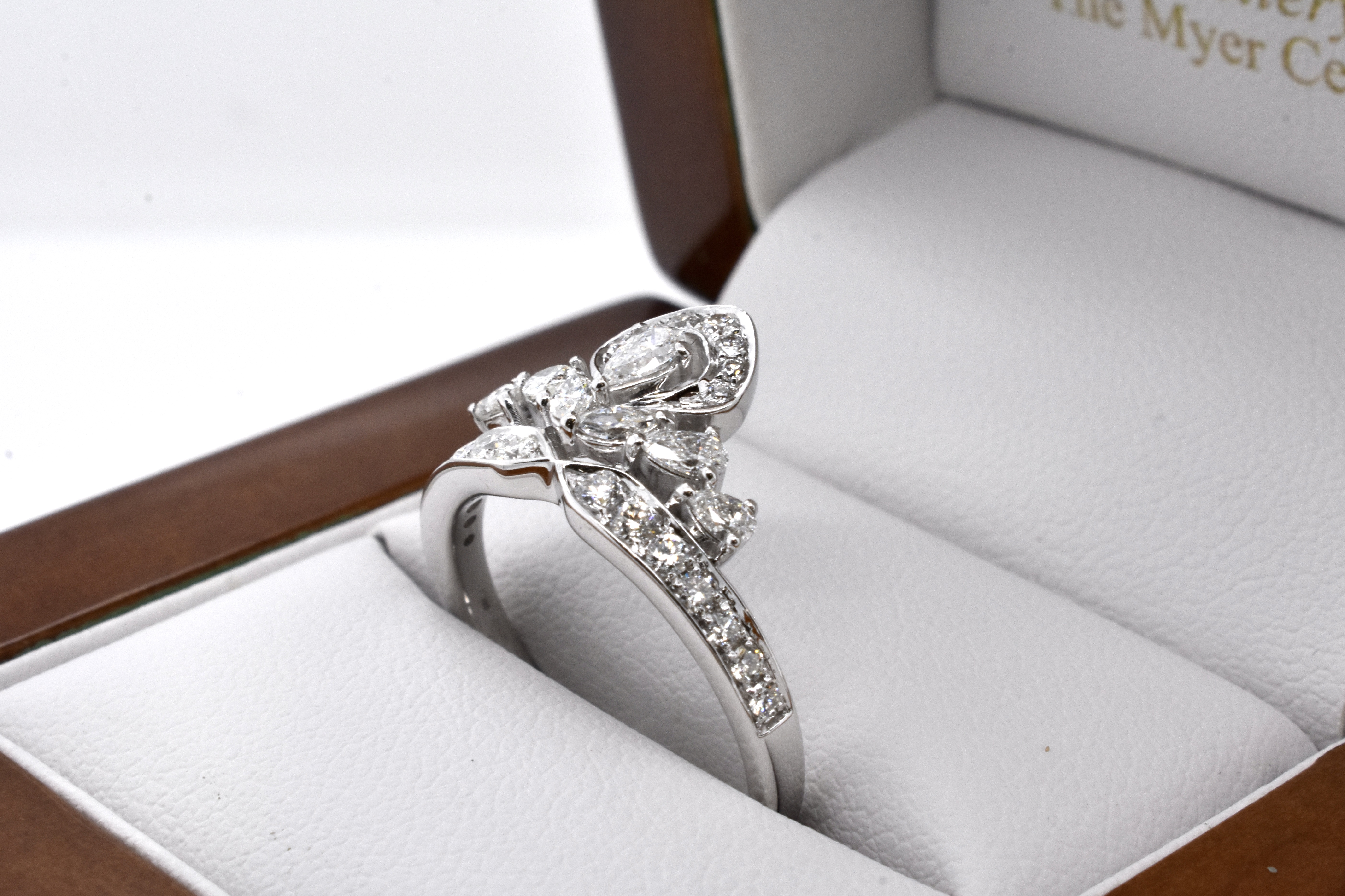 A piece of graceful and regal design, this glittering 18ct white gold ring is shaped like a tiara and set with a combination of sparkling pear shape, marquise and RBC diamonds for a total of twenty eight equalling 0.74ct FG/VS-SI, grain set with the diamonds continuing elegantly down the shoulders and finished with a solid, plain band. Indepdent Valuation Supplied