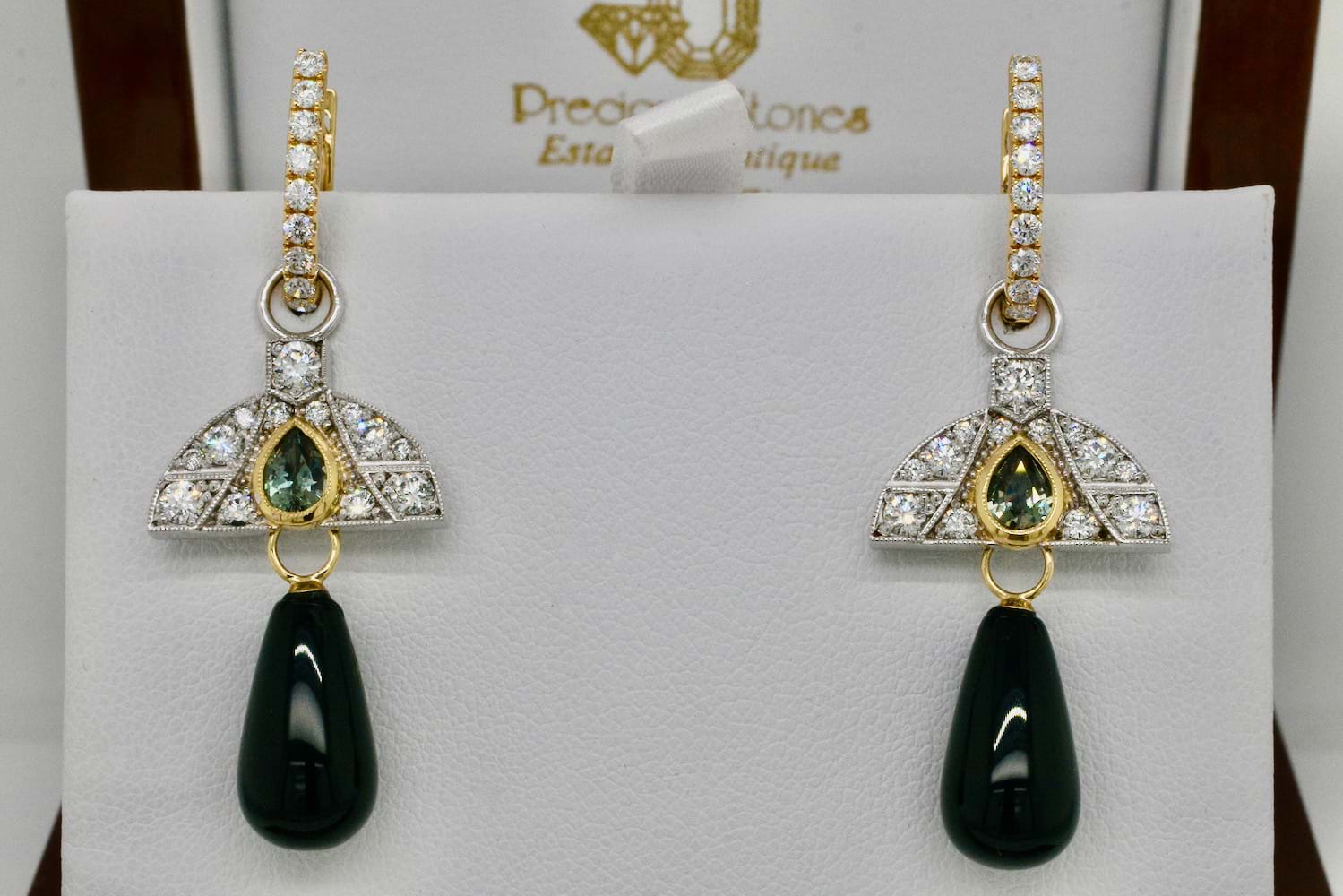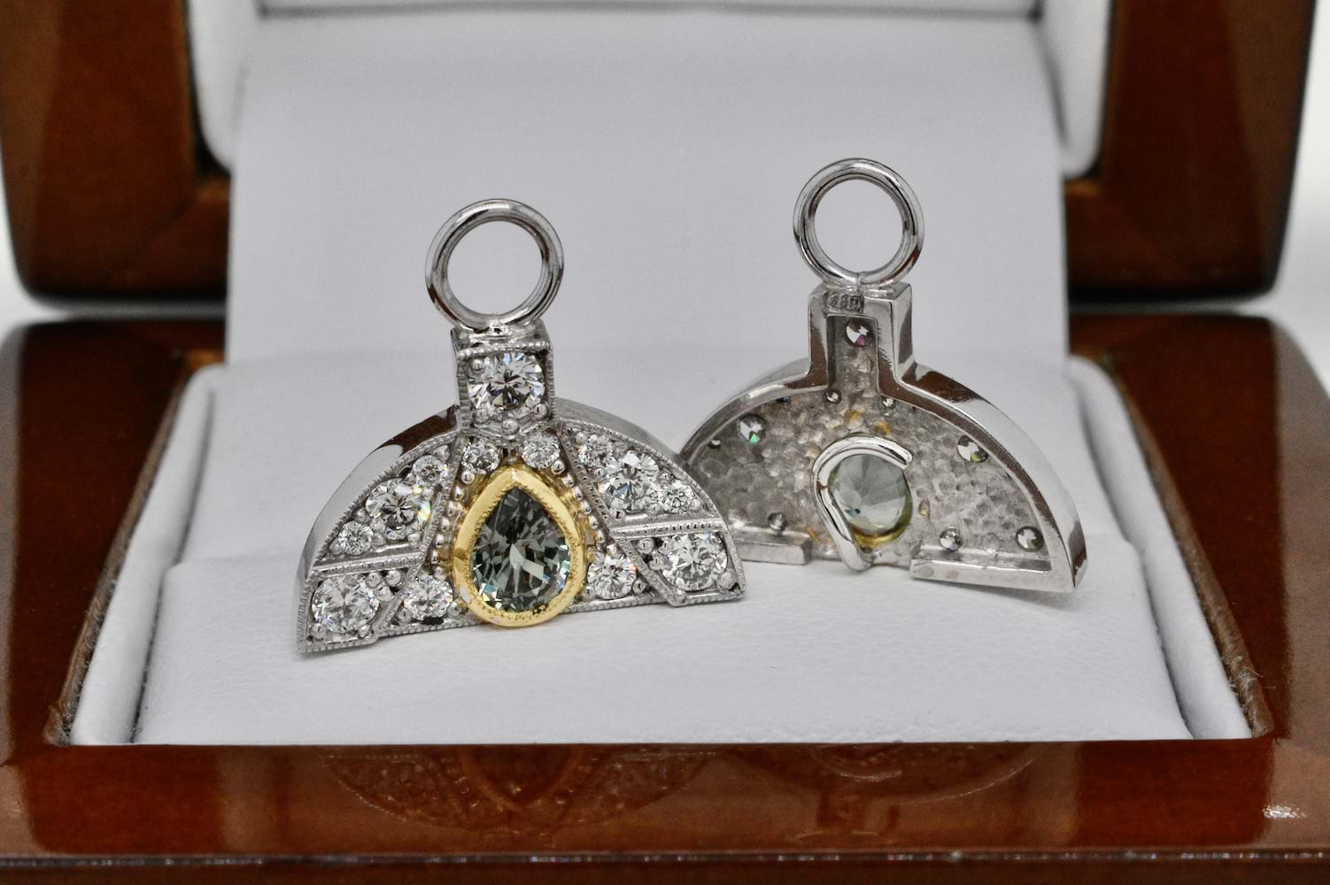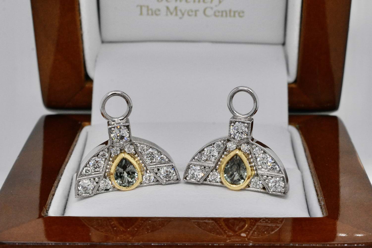 Rare and gorgeous matching pair of pearshape natural Alexandrite's equalling 0.75cts for which these bespoke earring enhancers were designed around. Designed alongside our client these Egyptian revival meets Art Deco inspired enhancers have been crafted in 18ct white and yellow gold and feature grain set, sparkling white, round brilliant cut diamonds and mill grain borders. Total diamond content is 0.92cts (DG/SI). These earring enhancers are designed to suspend from diamond hoops and also have a cats tail on the reverse to allow the wearer to drop an additional enhancer. Independent Valuation Supplied.