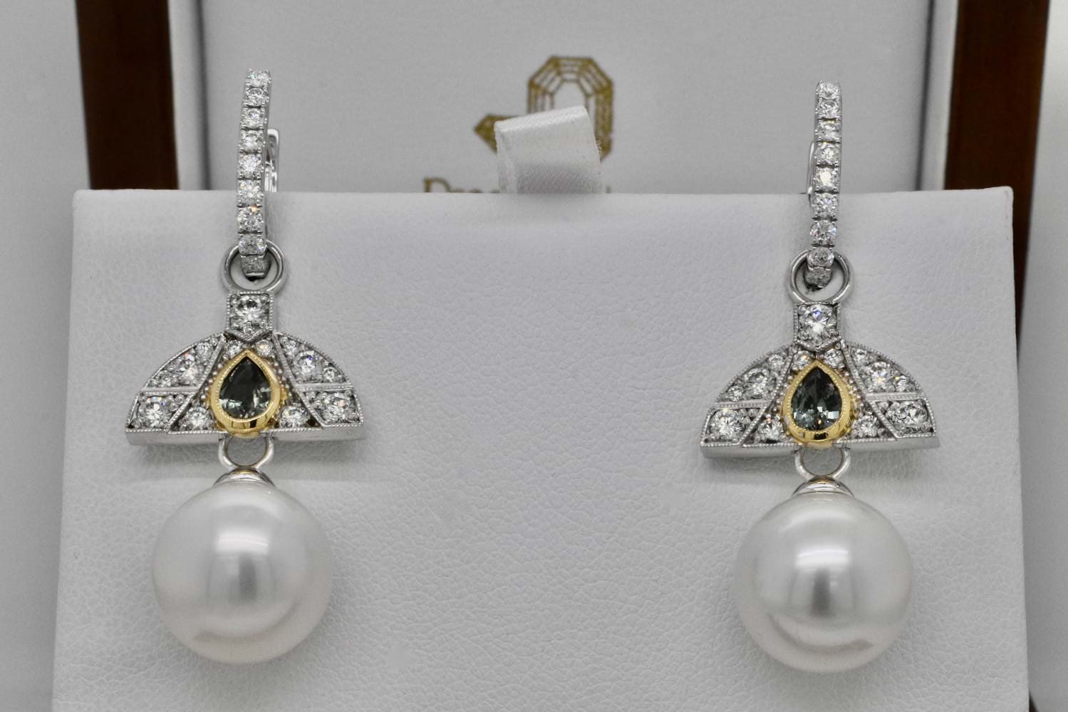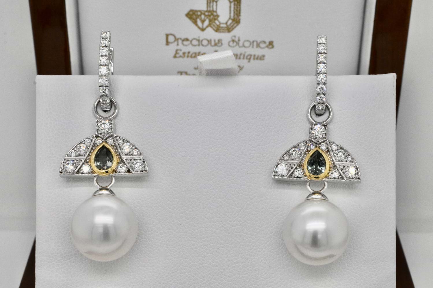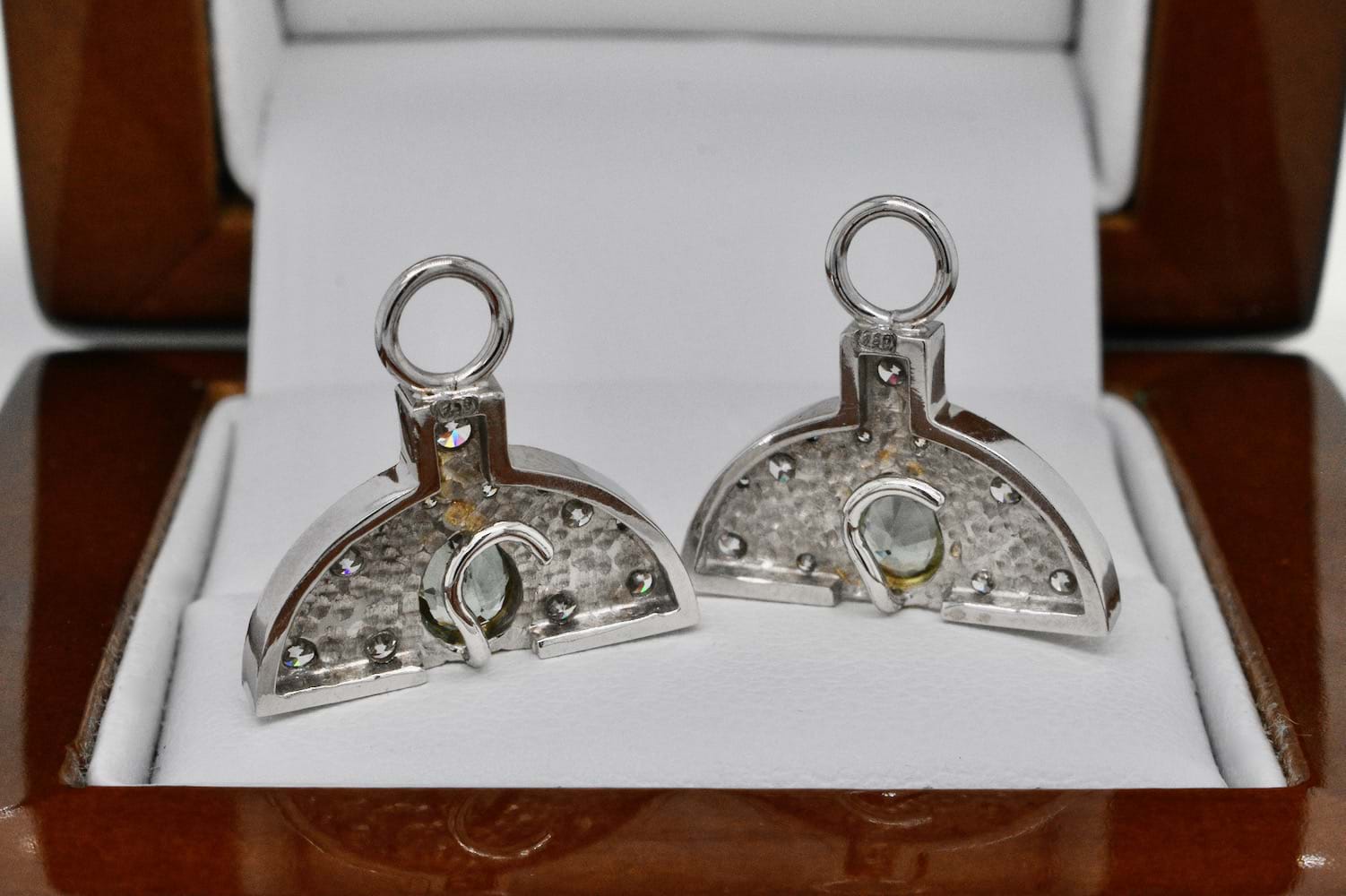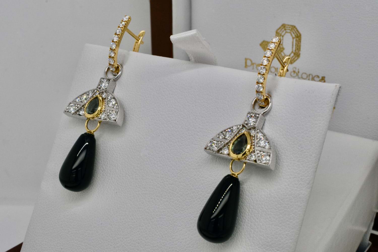 Rare and gorgeous matching pair of pearshape natural Alexandrite's equalling 0.75cts for which these bespoke earring enhancers were designed around. Designed alongside our client these Egyptian revival meets Art Deco inspired enhancers have been crafted in 18ct white and yellow gold and feature grain set, sparkling white, round brilliant cut diamonds and mill grain borders. Total diamond content is 0.92cts (DG/SI). These earring enhancers are designed to suspend from diamond hoops and also have a cats tail on the reverse to allow the wearer to drop an additional enhancer. Independent Valuation Supplied.