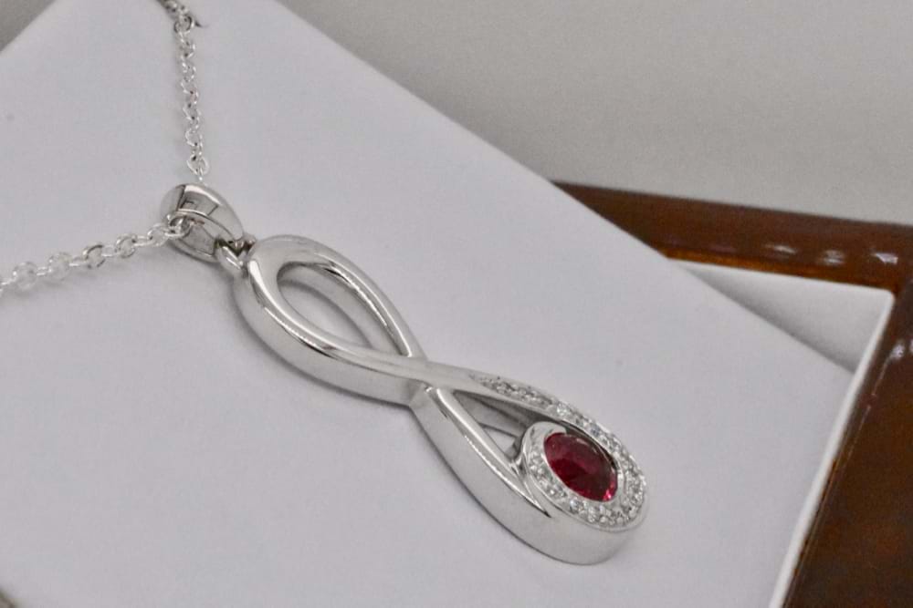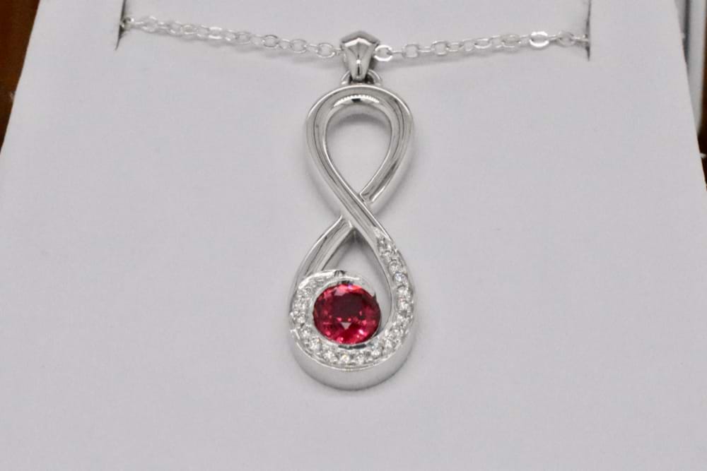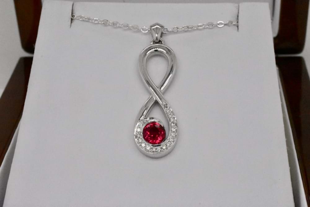 Chosen for its stunning colour and brightness this natural 0.91ct Mozambique ruby was designed by our clients to be the centre piece of an infinity shaped pendant in 18ct white gold. With only the best white diamonds chosen to contrast the colour, the piece contains 0.16cts of diamonds. Independent Valuation Supplied.